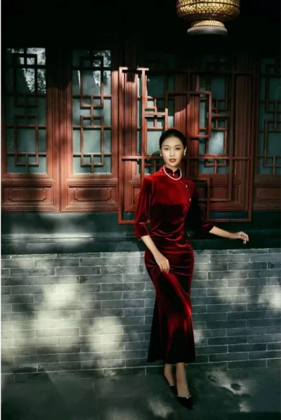 黑色金丝绒七分袖秋冬旗袍修身显瘦高端改良新中式晚礼服