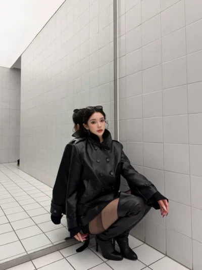 CYNR原创设计酷飒风立领双排扣挺括皮衣系带收腰中长款夹克外套女