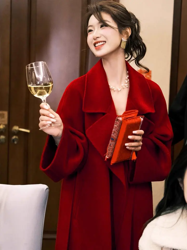 MuMu沐沐高端定制,以红色双面羊毛大衣致敬新娘的高光时刻。绵羊毛材质软糯奢暖,双面呢工艺轻盈挺括,中长款剪裁利落大方,敬酒行走间尽显从容姿态。红色基调喜庆显白,既是婚礼上的敬酒服,亦是新年里的战袍。搭配长靴利落时髦,配高跟鞋优雅迷人,让新娘在人生重要时刻,美得温暖而耀眼。