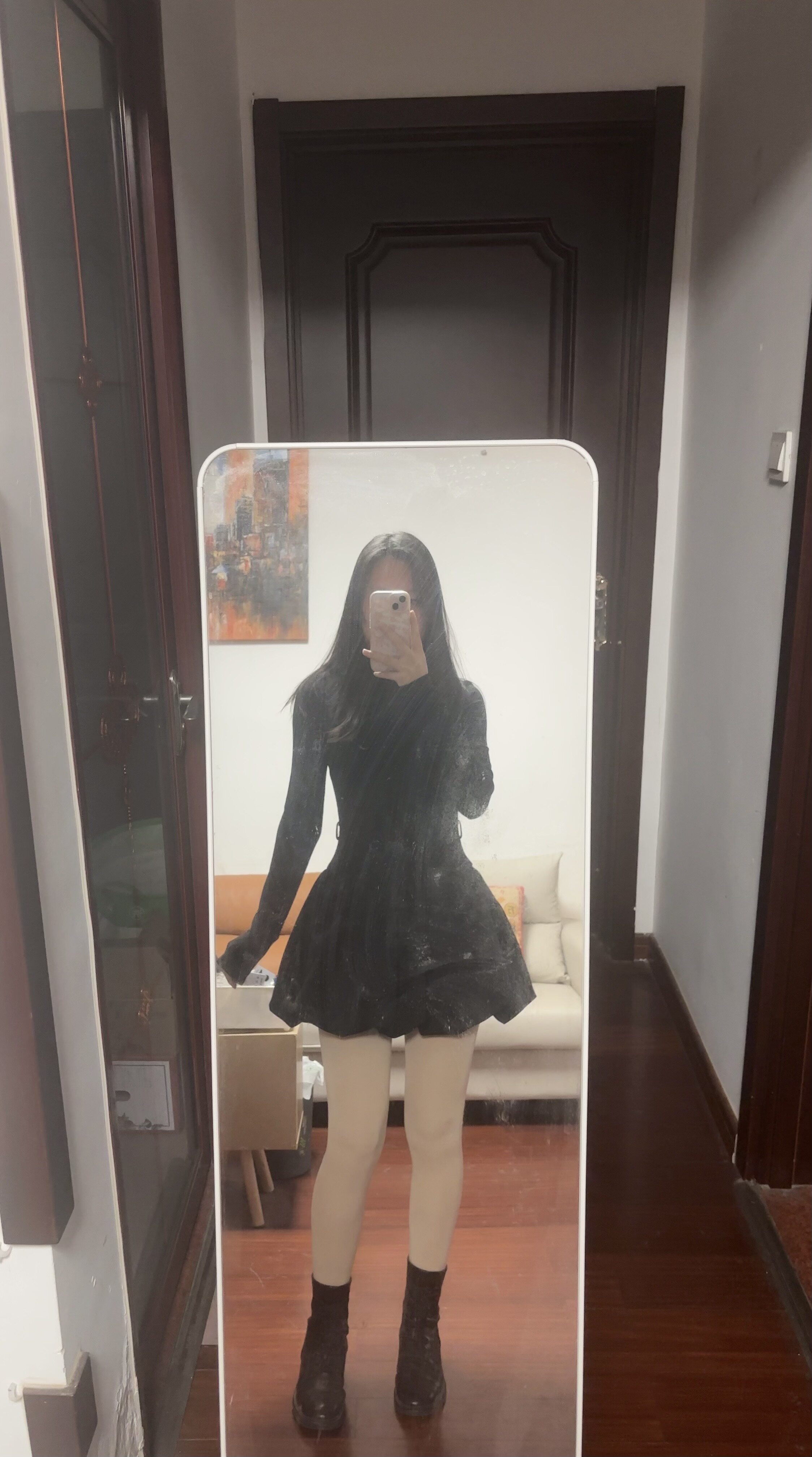 太爱这件小黑裙了🤩版型超藏肉,收腰设计把腰线掐得刚刚好,裙摆蓬蓬的特别遮胯📸拍照很出片~微胖姐妹闭眼入。面料软软的很亲肤,贴身穿也不扎还很保暖,冬天当内搭很合适!✨