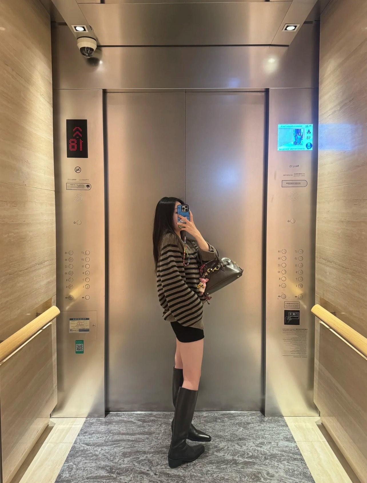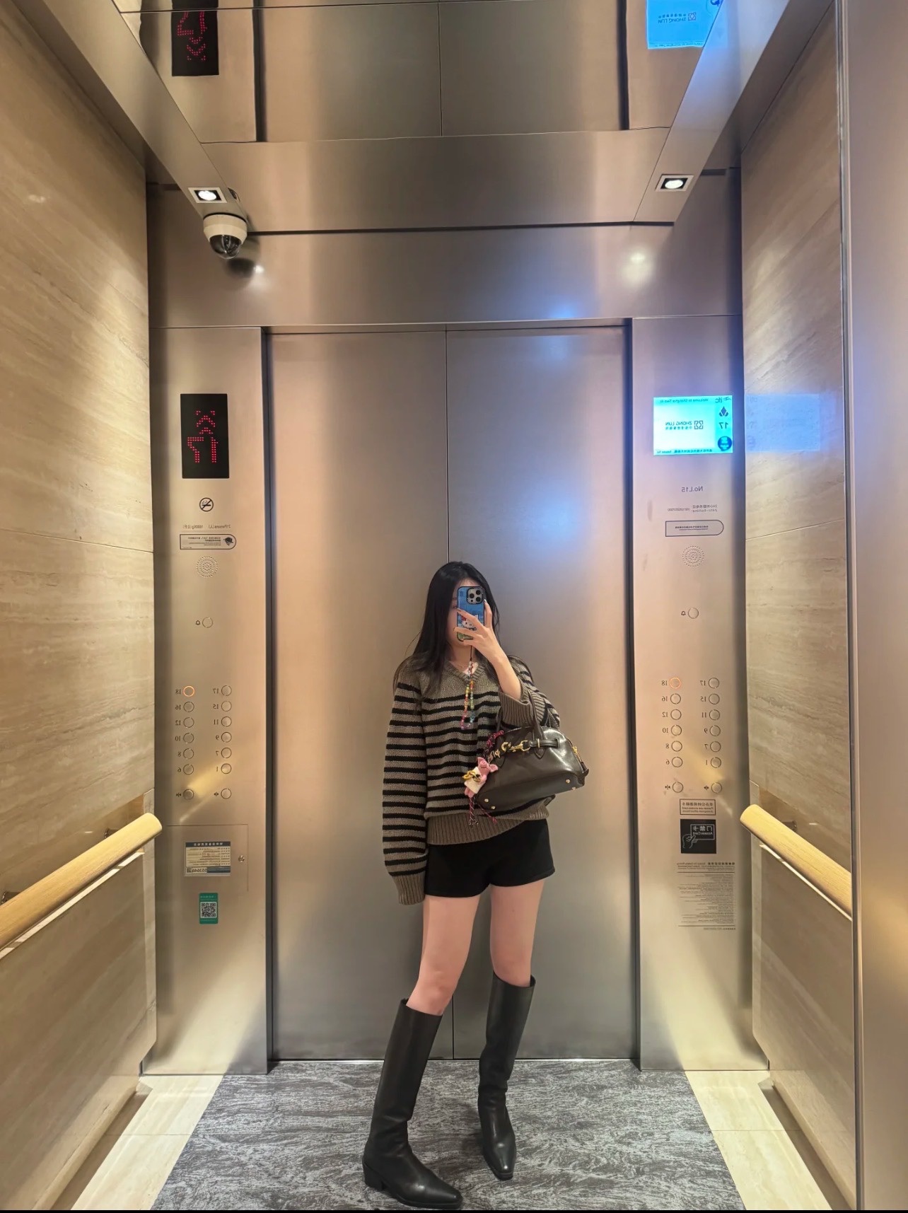 很显腿长,不过膝的高度显得身材比例也很好,材料很扎实的感觉,摸上去都是很亲肤细腻的皮质,平时穿36.37 这双选的36也挺合适的。