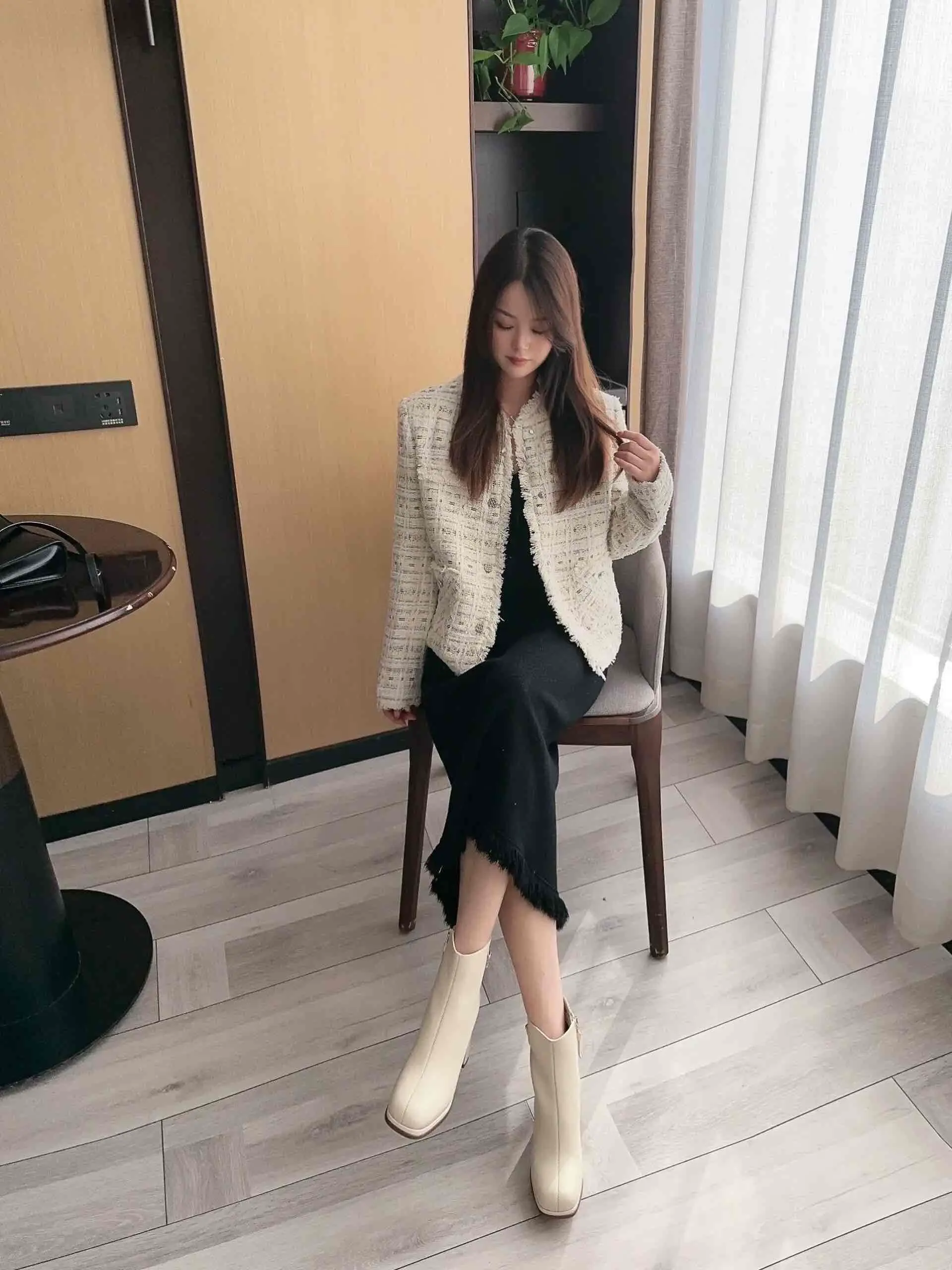 - 露肤留白:搭配短裙或短裤时,在靴筒与下装之间留出一截大腿肌肤,既能显腿长,又能增加层次感。