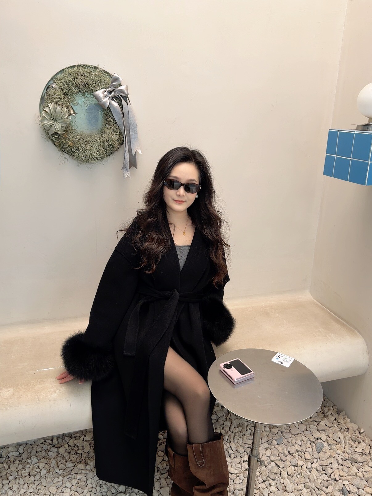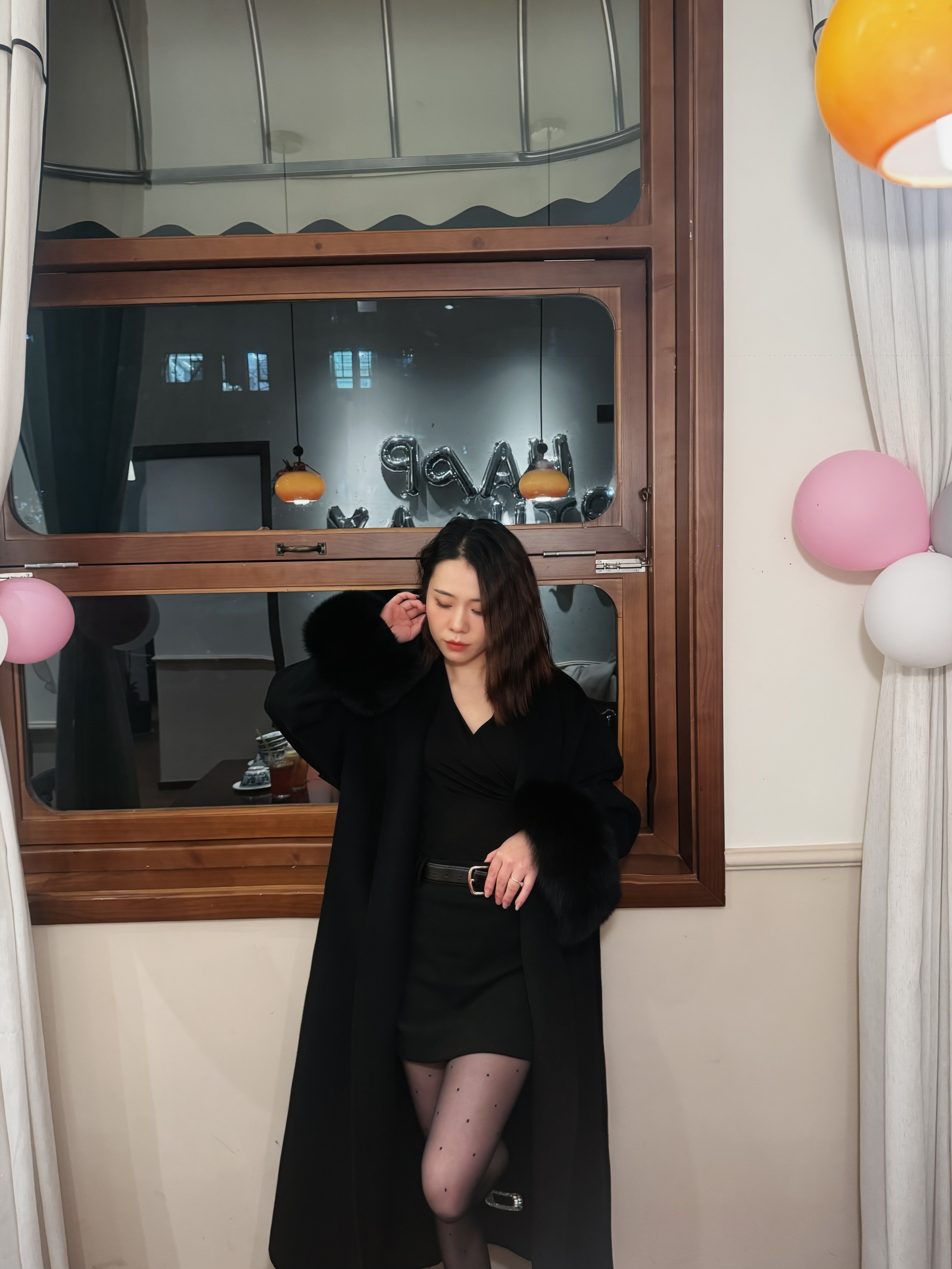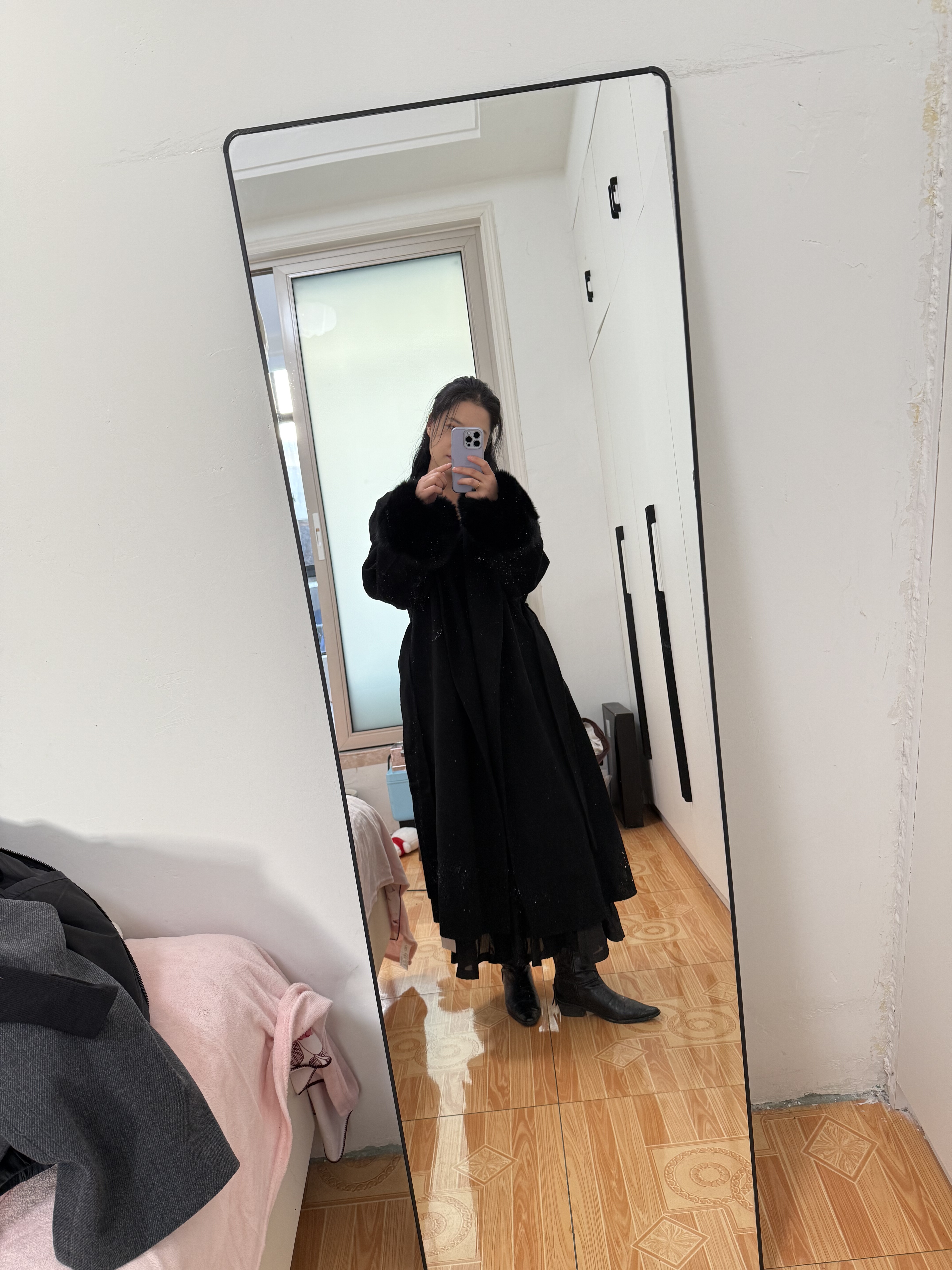 - 搭配连衣裙+长靴:内搭一条针织连衣裙,脚踩过膝长靴,在裙摆与靴筒之间露出一截小腿。外面套上这件黑色大衣,毛领的贵气感与裙装的温柔相得益彰。适合约会或派对。