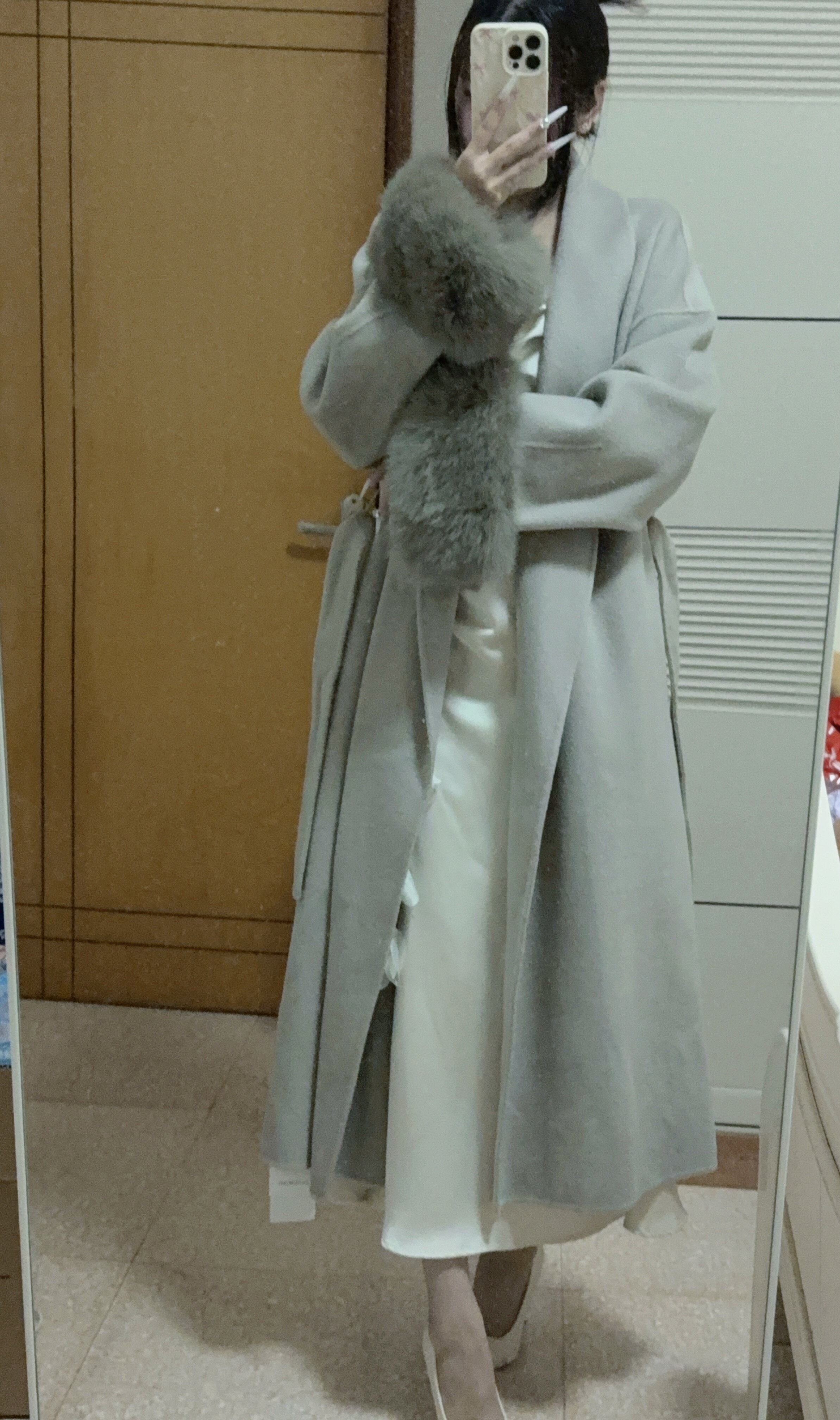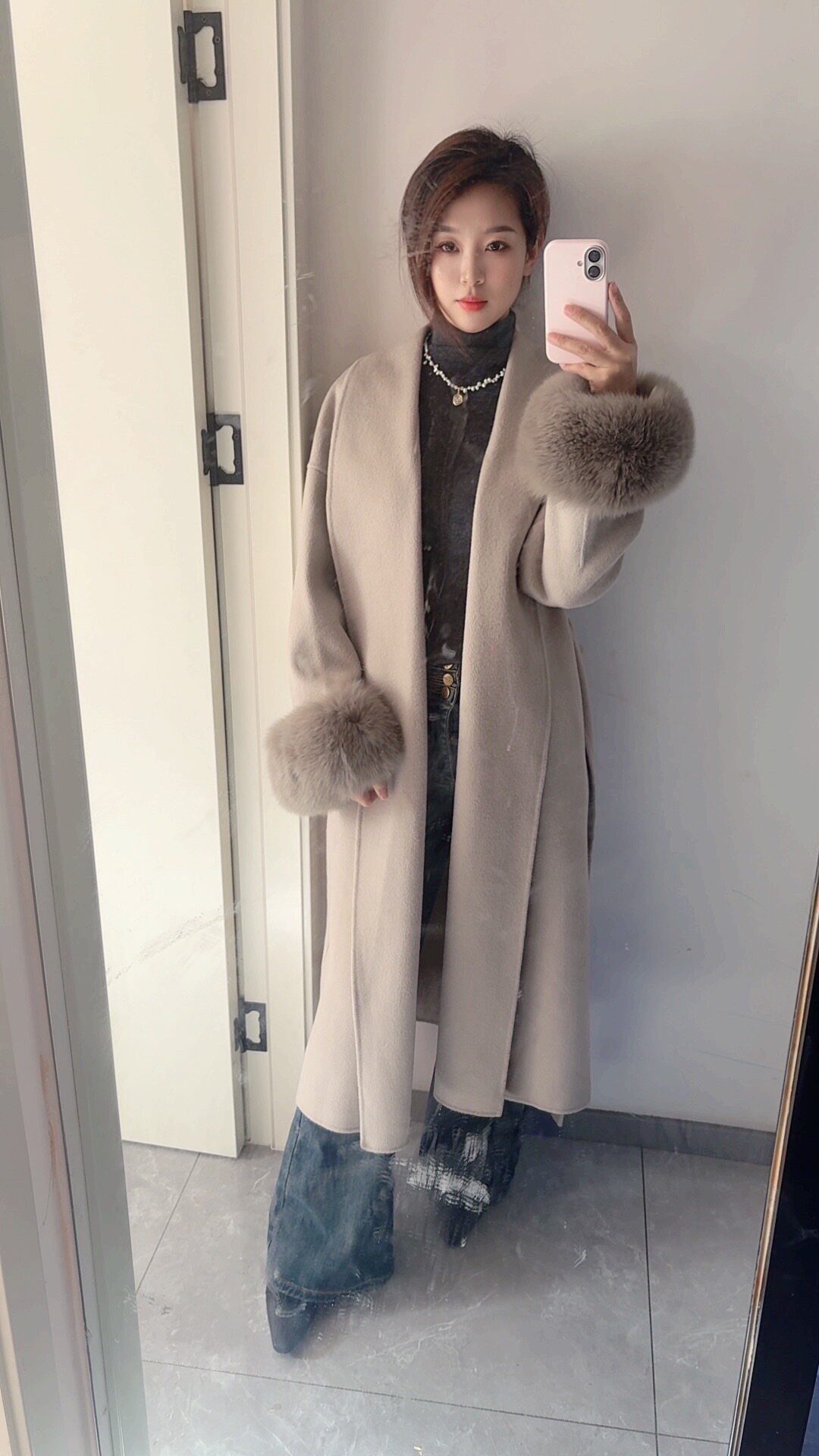 长款廓形是这款大衣对各类身材的温柔包容,也是它显瘦效果的核心保障。