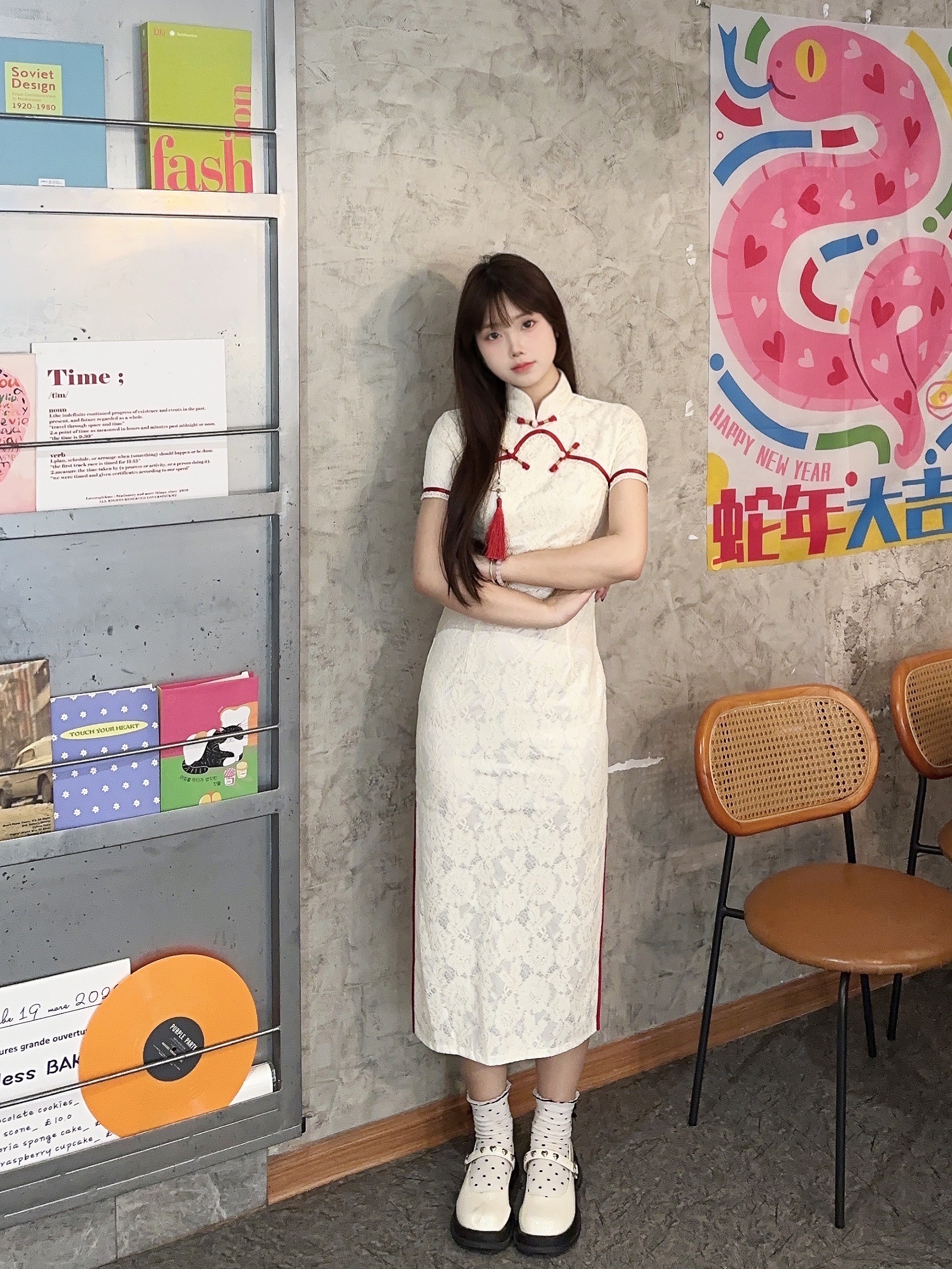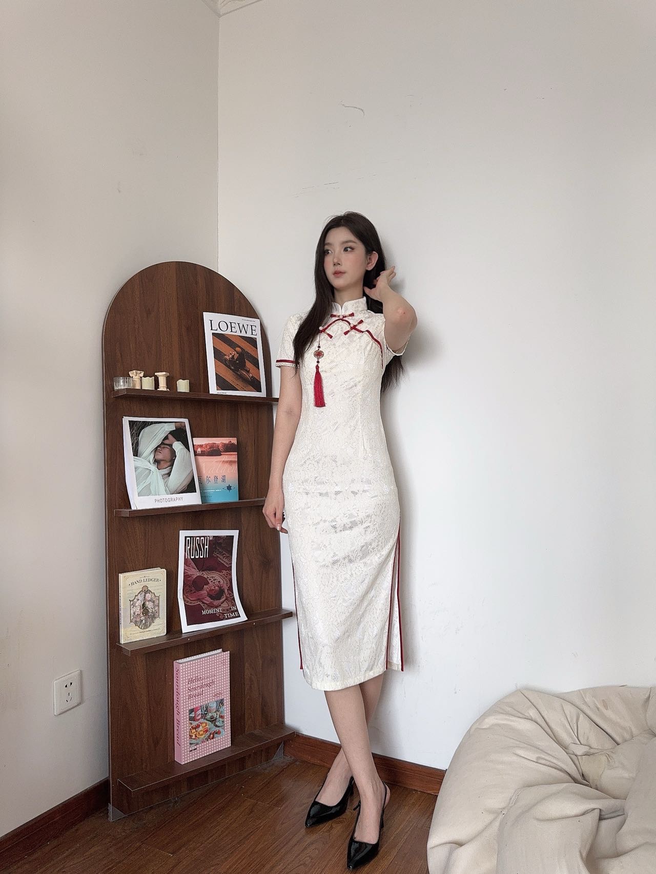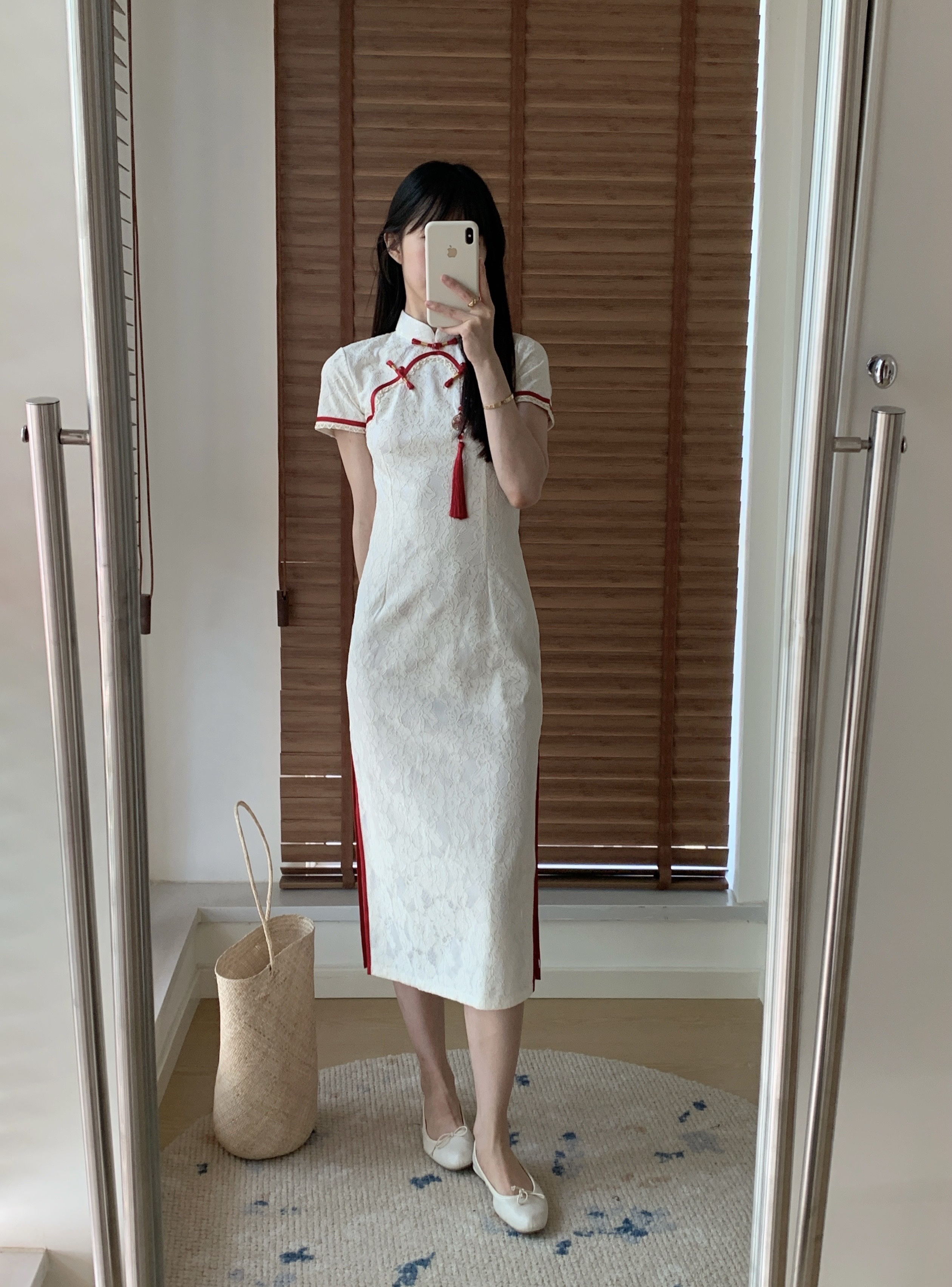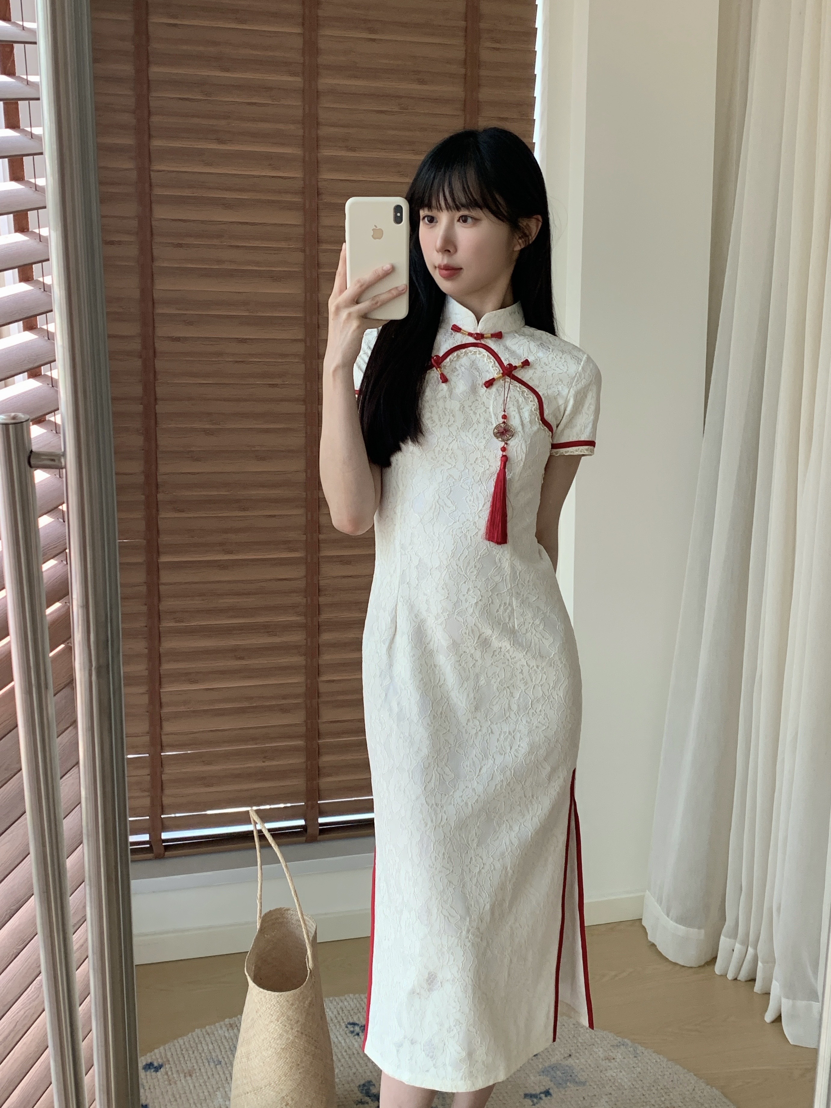 温柔俏皮的改良式旗袍,版型很修身显瘦。日常通勤都可以穿,红色线条显白又高级