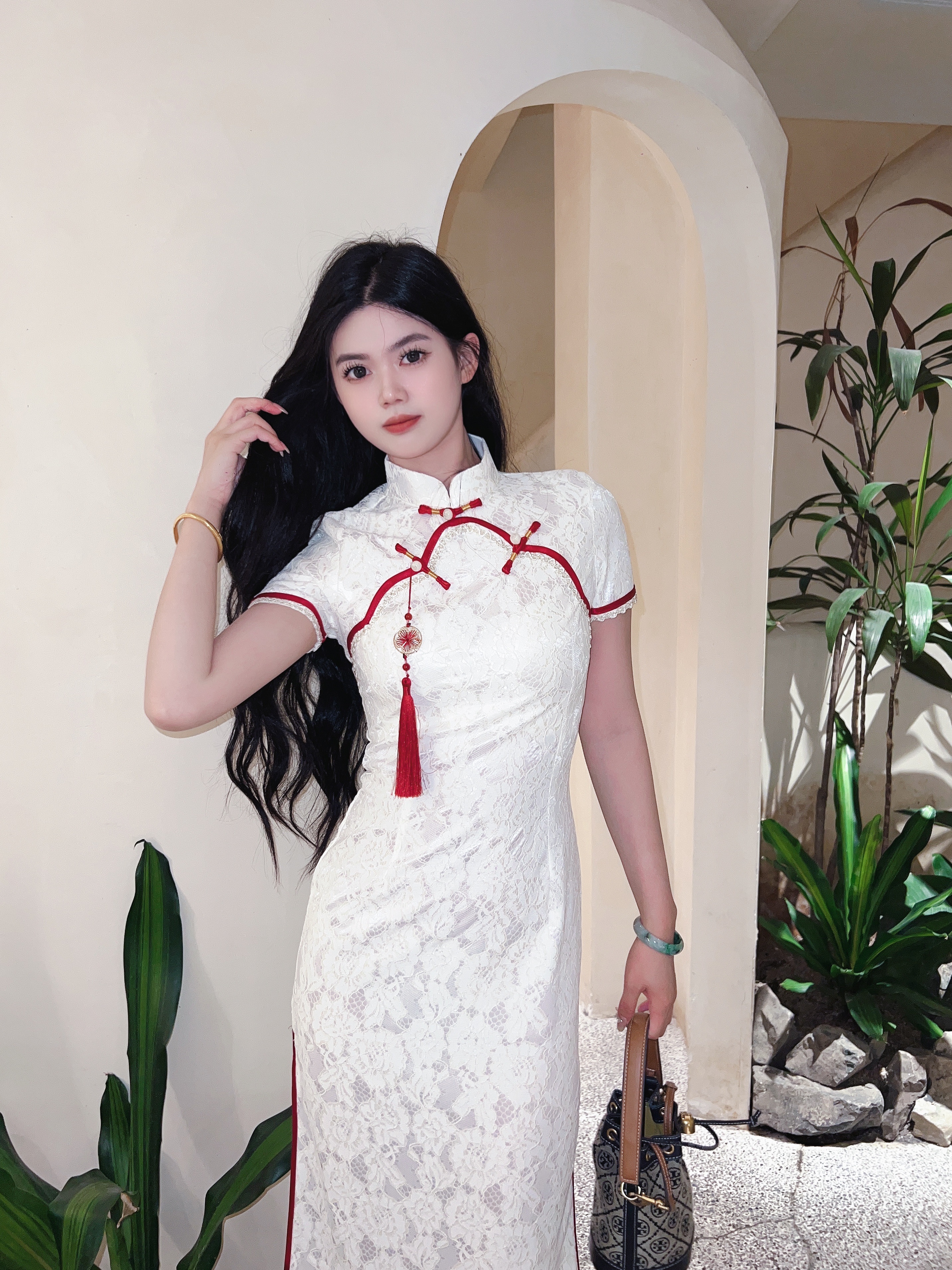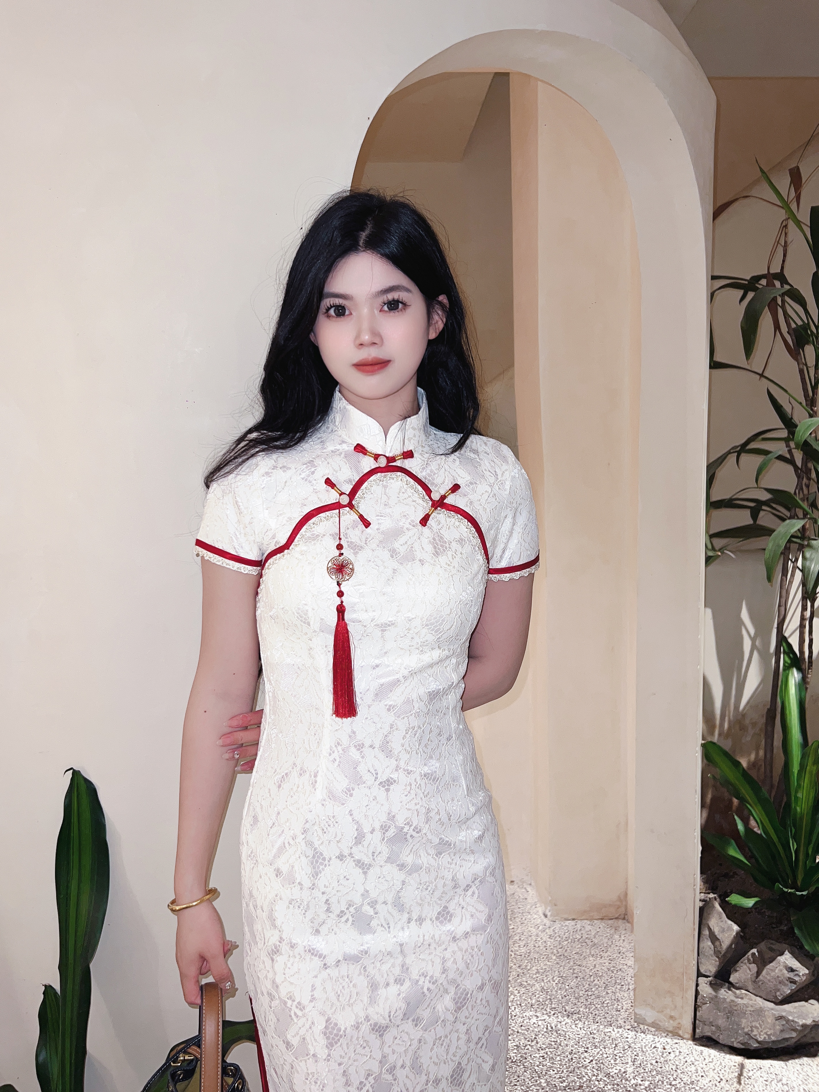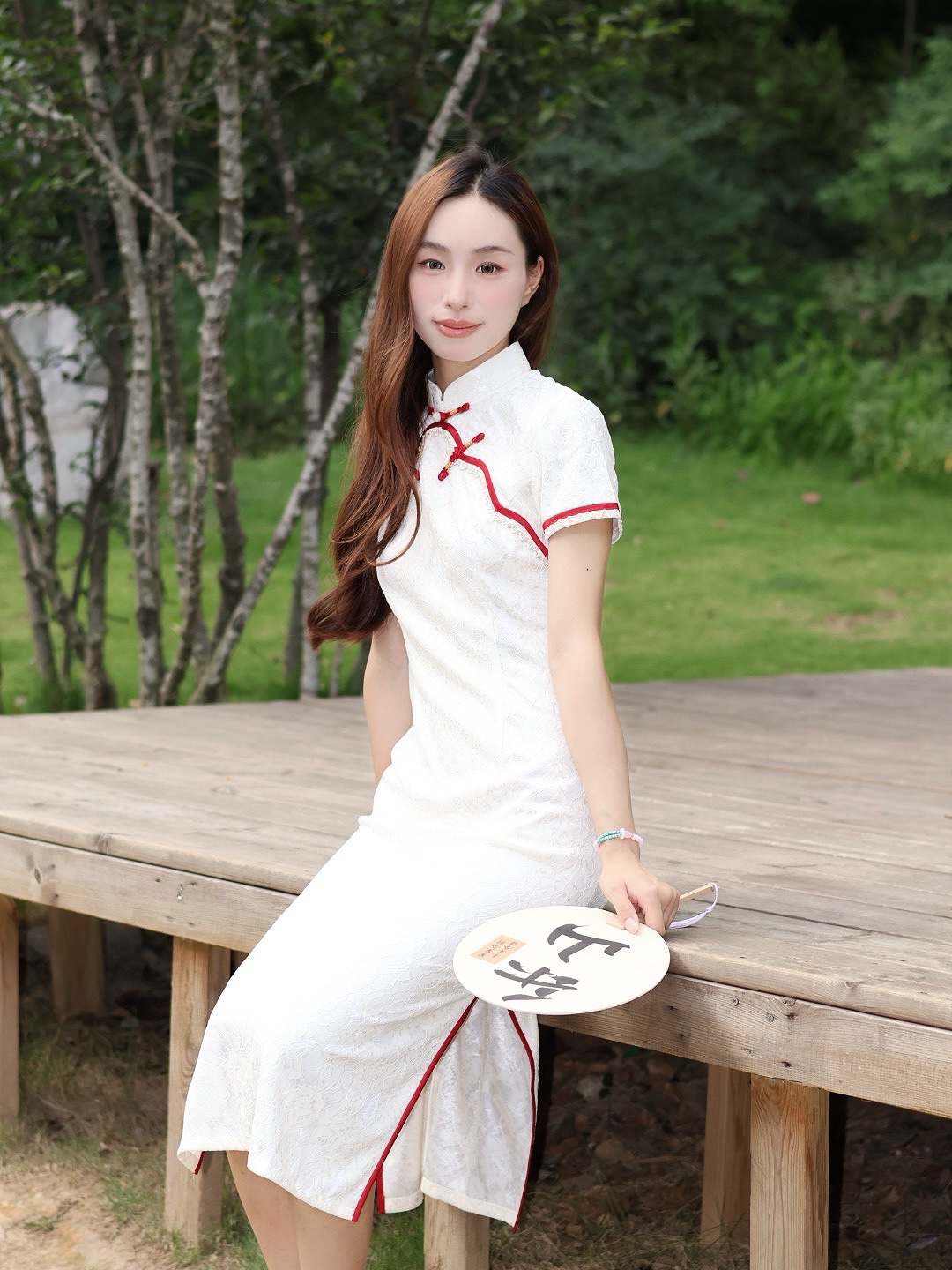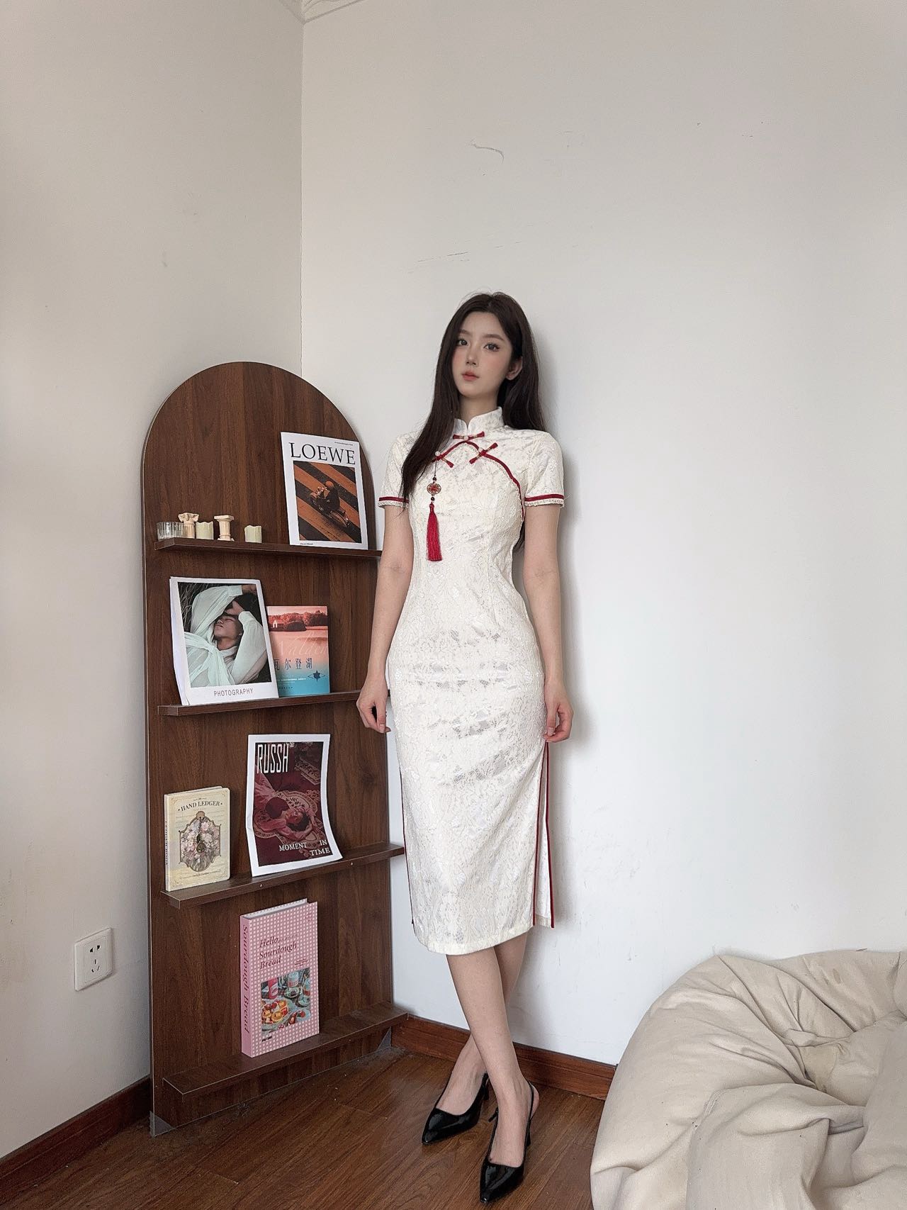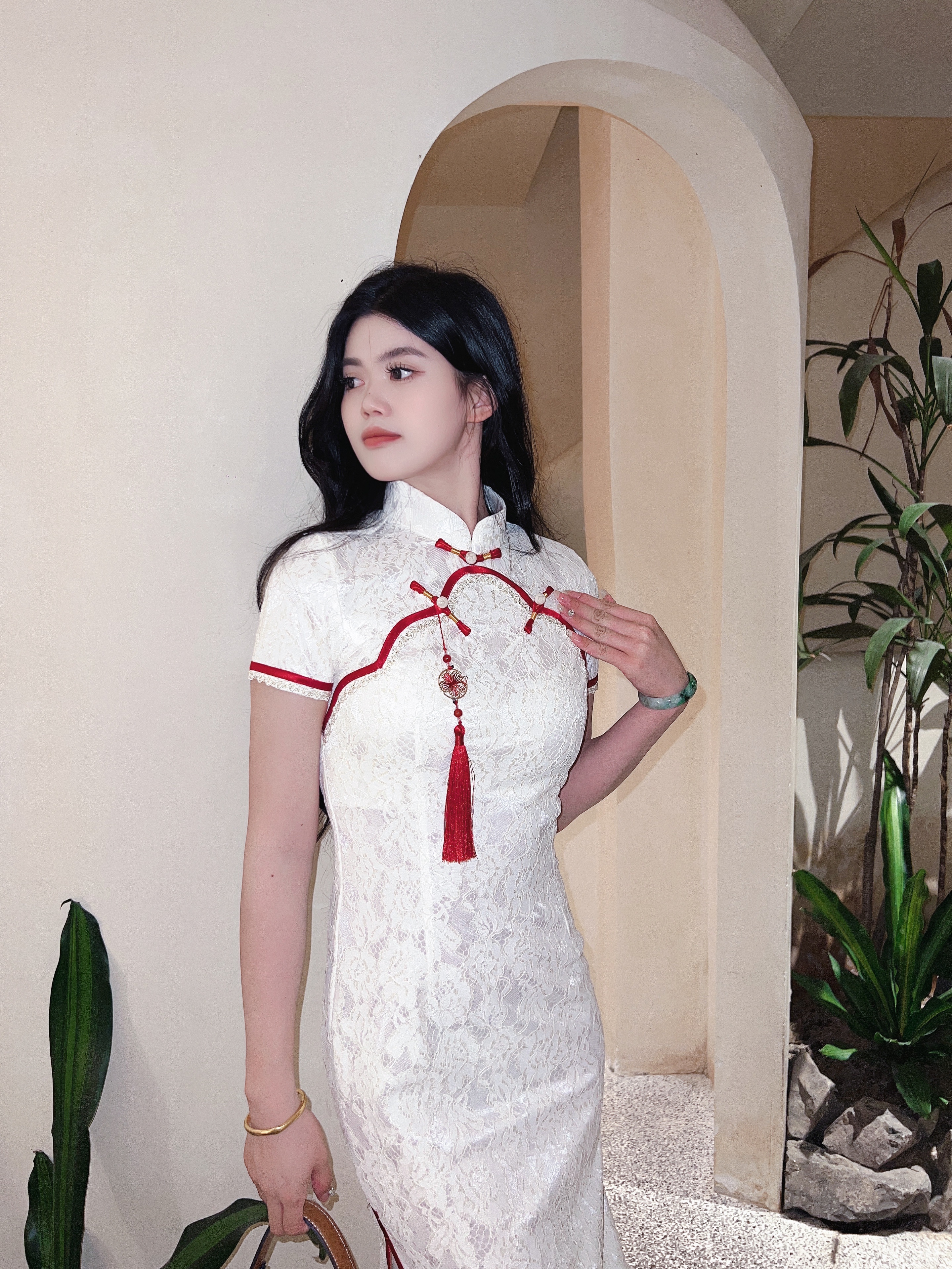 温柔俏皮的改良式旗袍,版型很修身显瘦。日常通勤都可以穿,红色线条显白又高级
