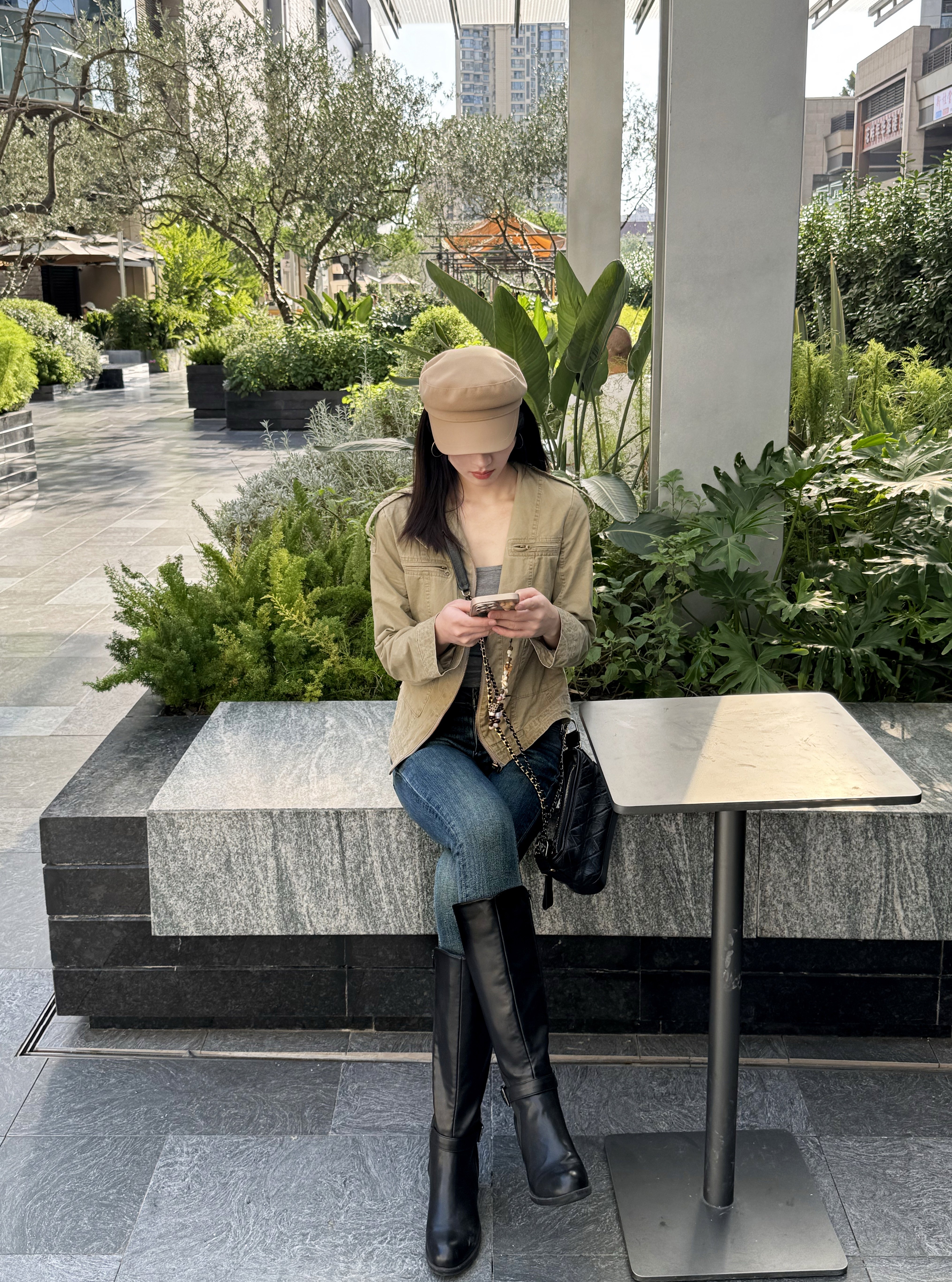搭配及膝靴时:裤脚与靴口自然衔接,既不会露出尴尬的袜子,也不会因为裤腿过长而显得拖沓。整体造型干净利落,干练又不失时髦。