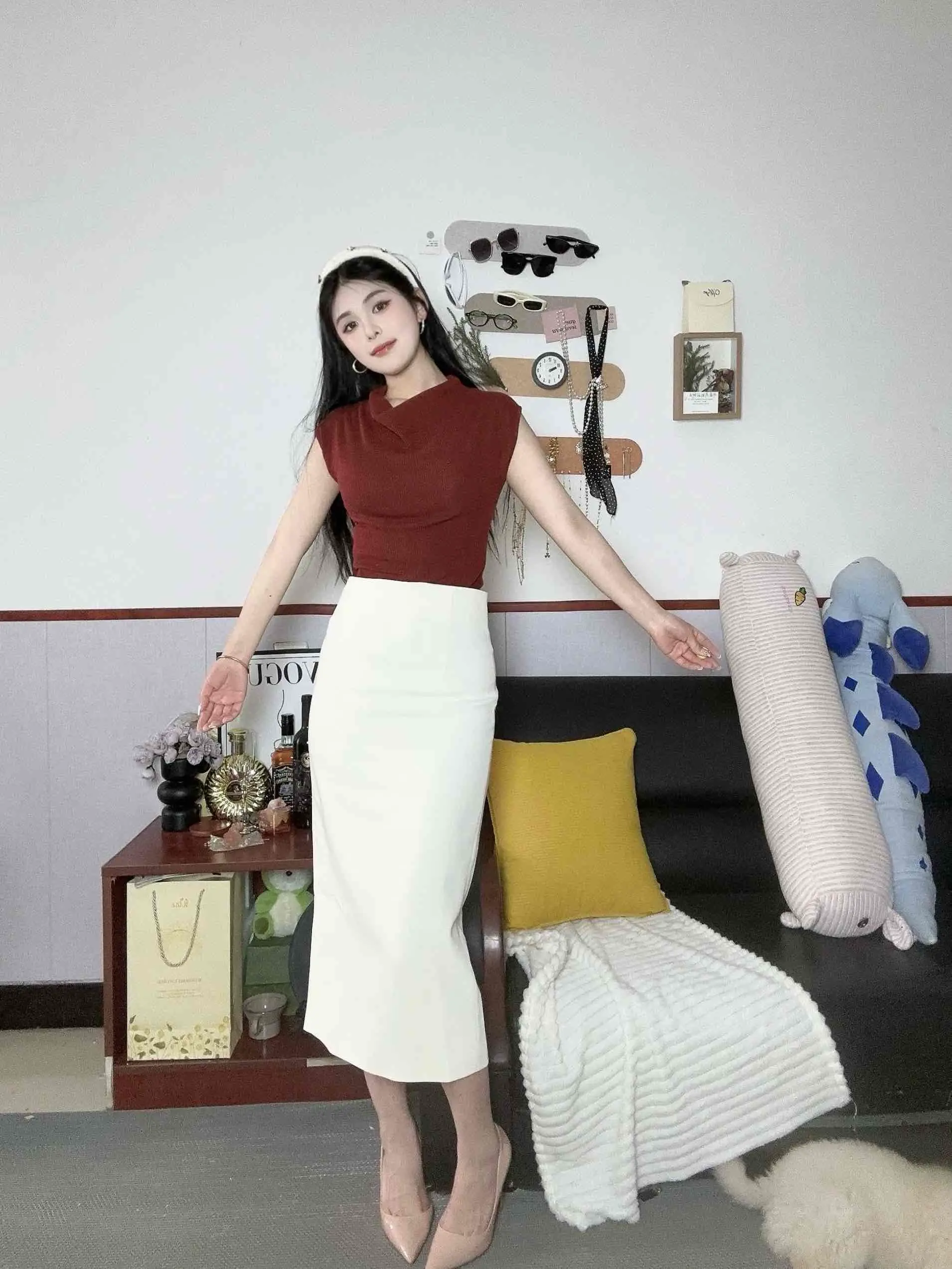搭配过膝靴时:九分长度刚好在靴口上方,裤脚不会在靴筒内堆叠,让腿部线条在视觉上无限延伸。过膝靴包裹小腿,与小脚裤型形成双层收紧,显瘦效果加倍。