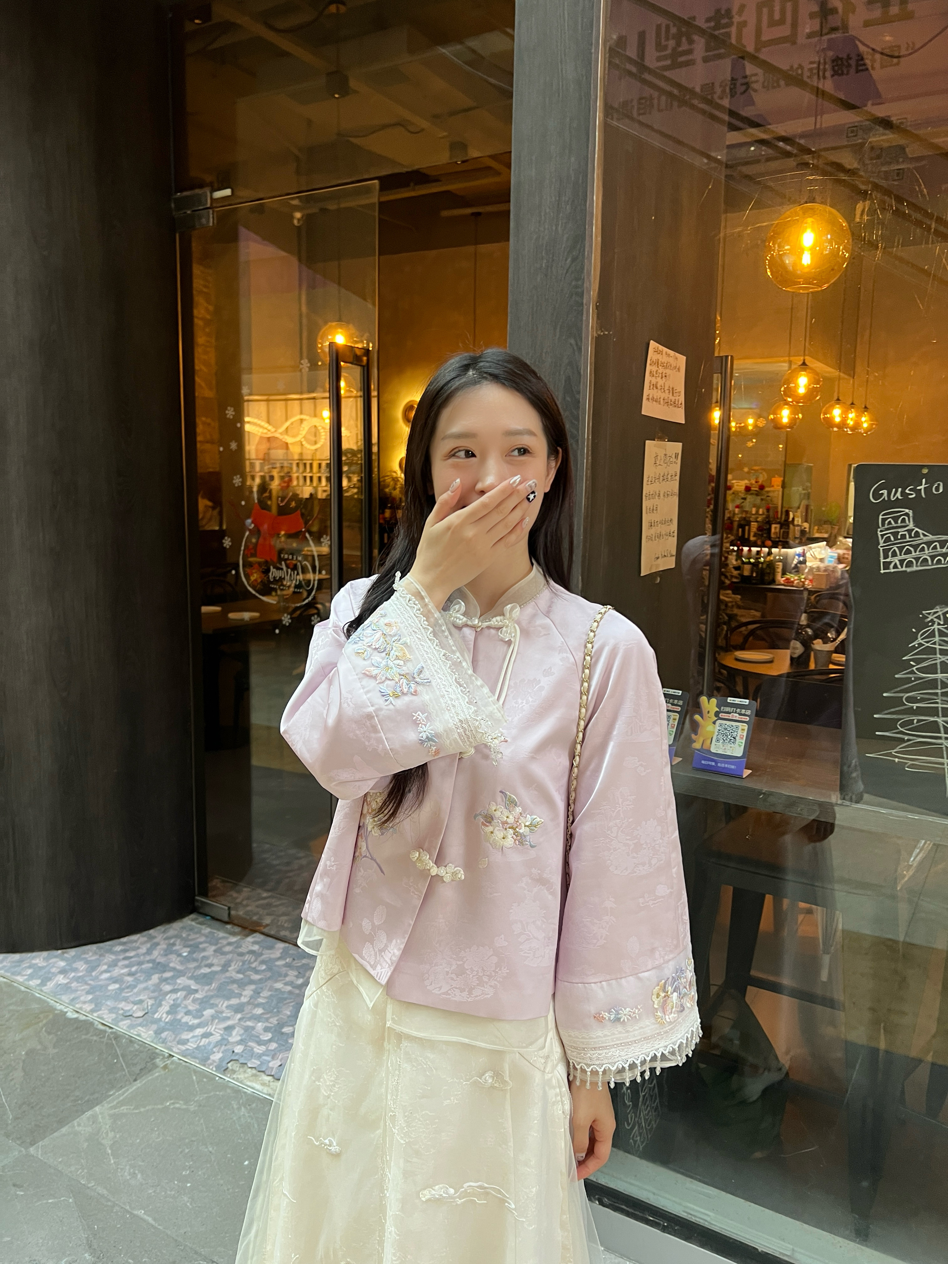 - 利落不压身高:短款的设计长度通常在腰线附近,不会像长款那样容易压个子。对于小个子女生来说,这种长度简直是福音——它既能保留新中式的韵味,又不会拖累身高。穿上它,视觉重心自然上移,整个人显得更加挺拔。