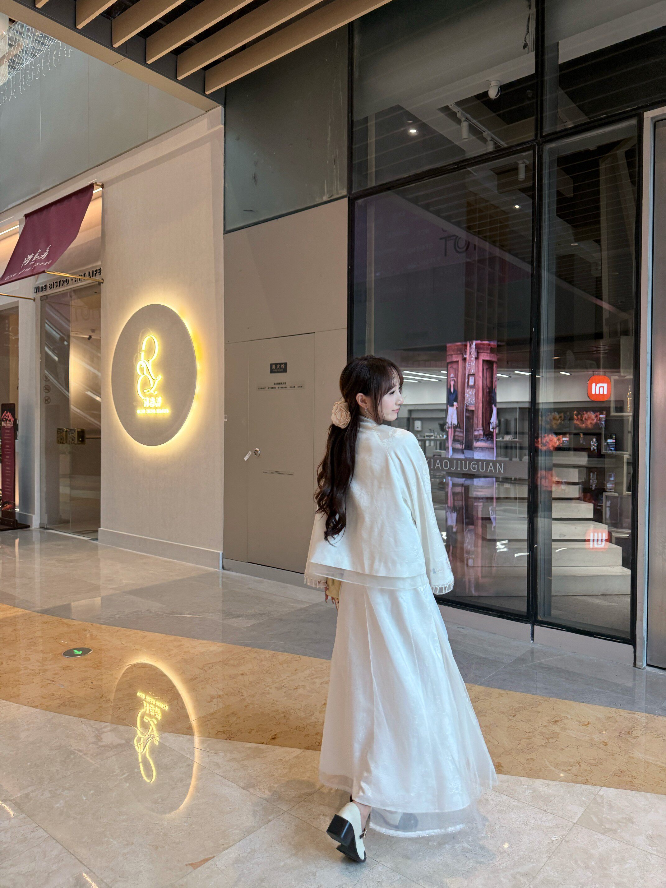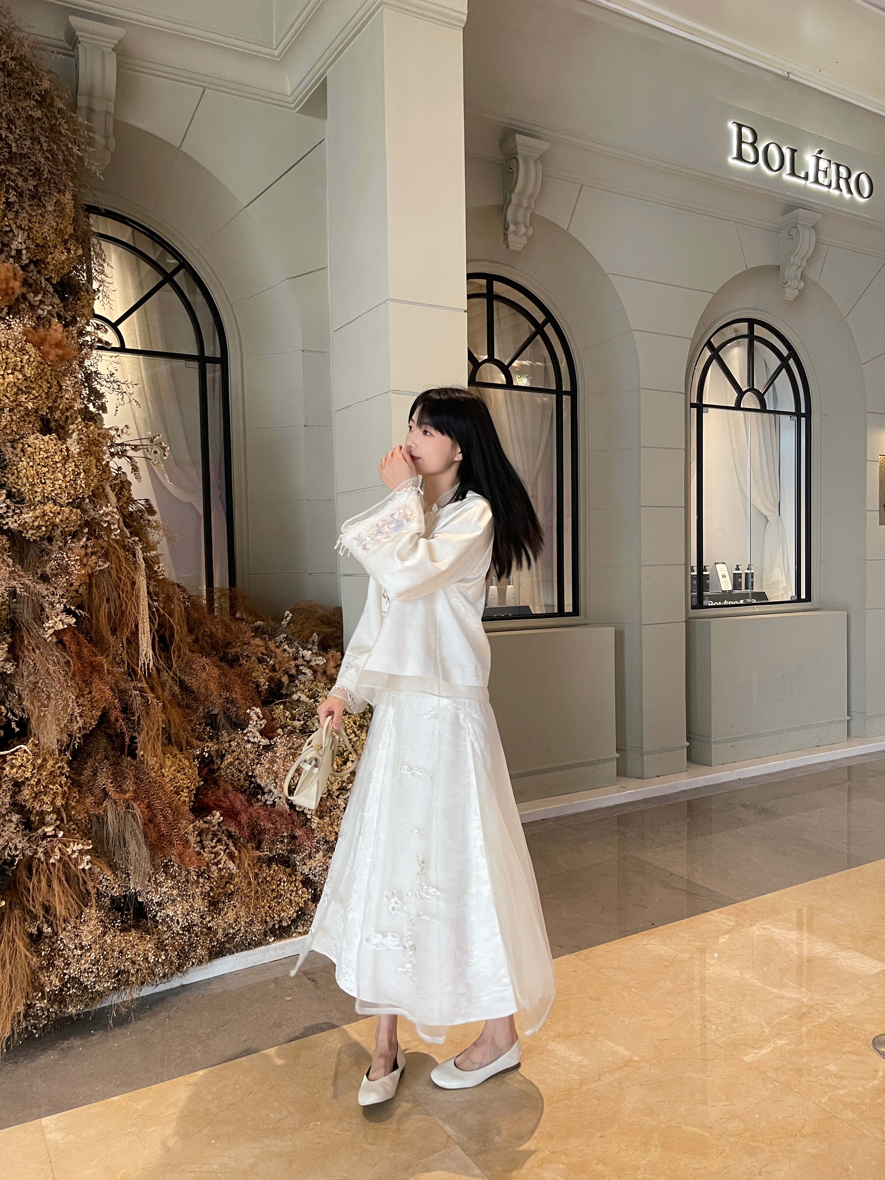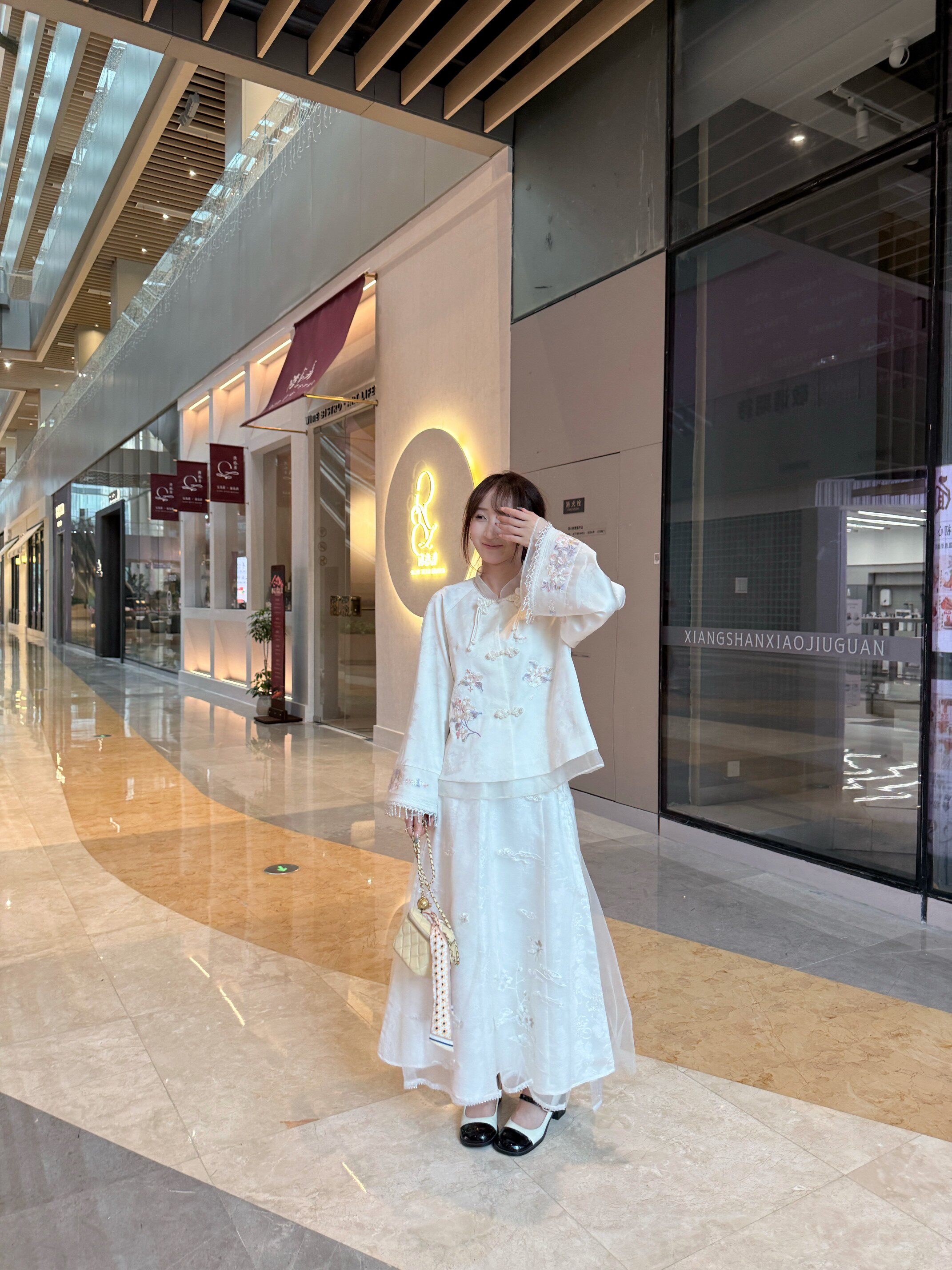 - 搭配牛仔裤:将新中式外套搭配浅蓝色直筒牛仔裤,内搭简约白T恤。传统与现代的碰撞,既有国风的韵味,又不失日常的休闲感。脚踩一双小白鞋或乐福鞋,轻松出街。