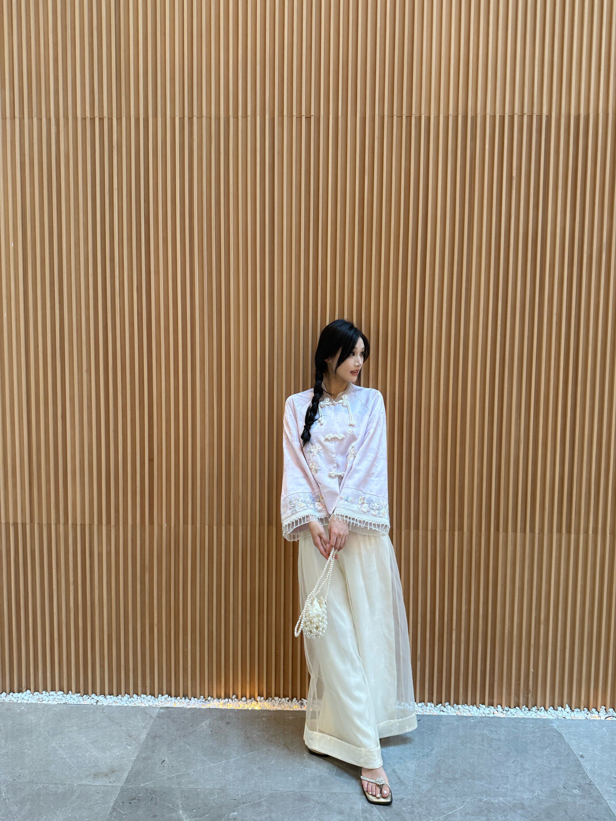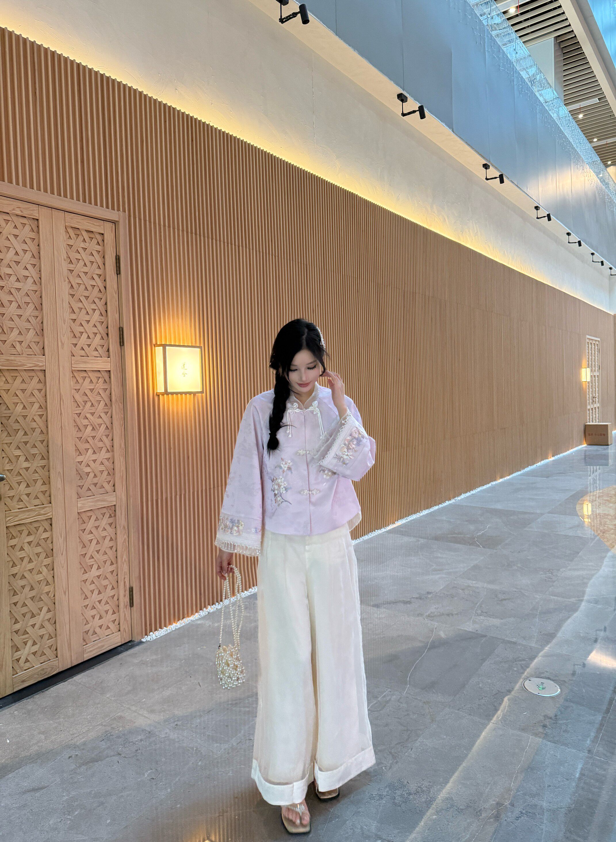 上衣的刺绣精致又细腻,盘扣和蕾丝花边韵味十足,搭配垂坠感满分的米白阔腿裤,慵懒又显气质。面料舒适,上身超有氛围感
