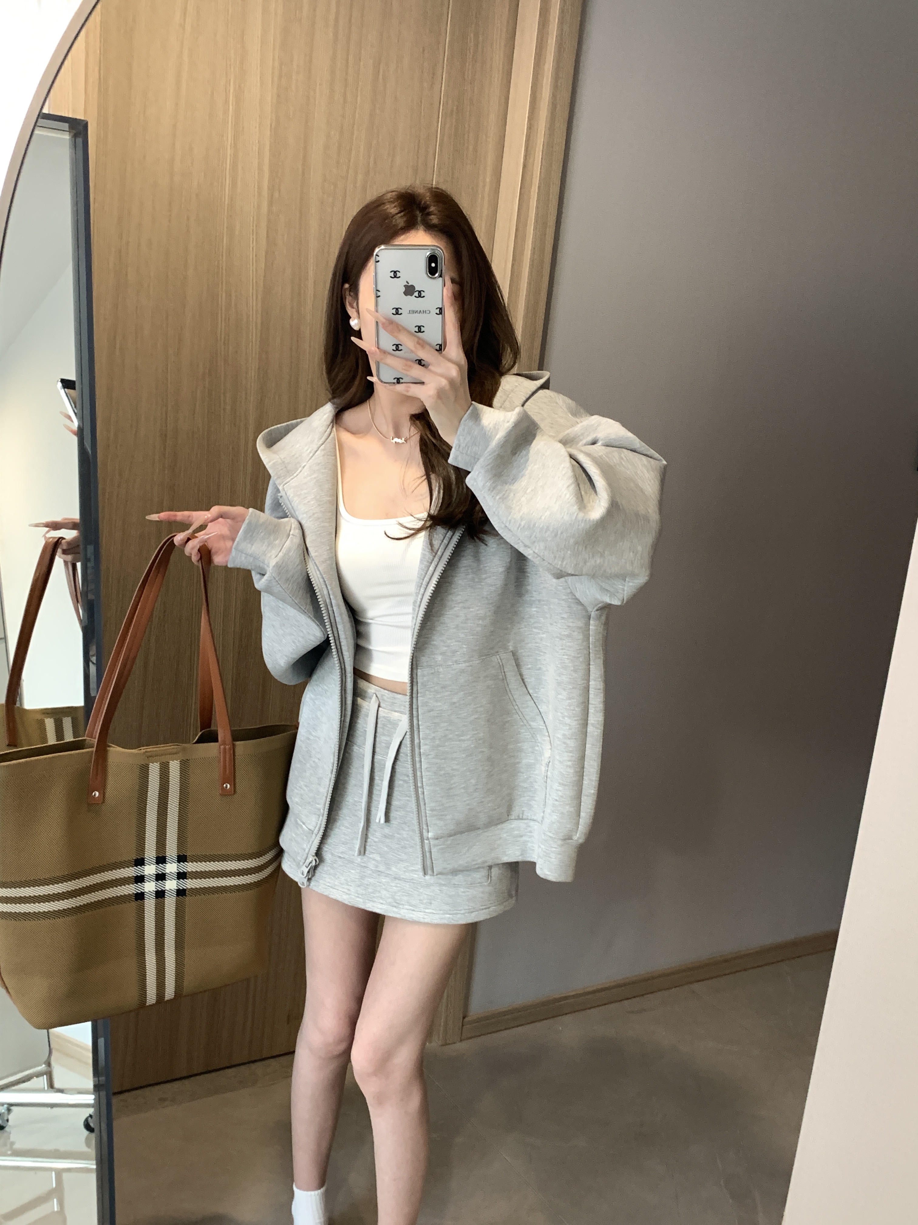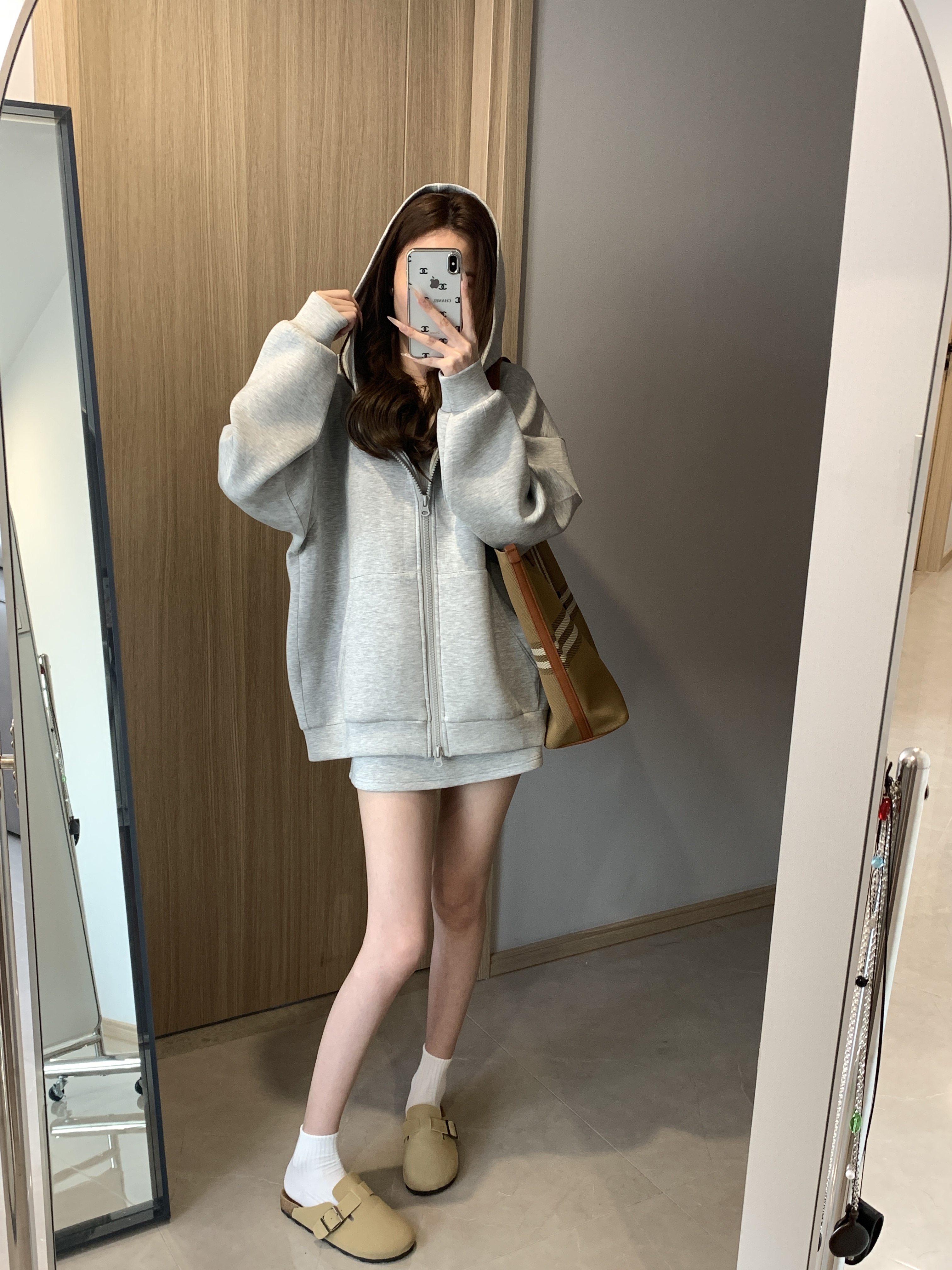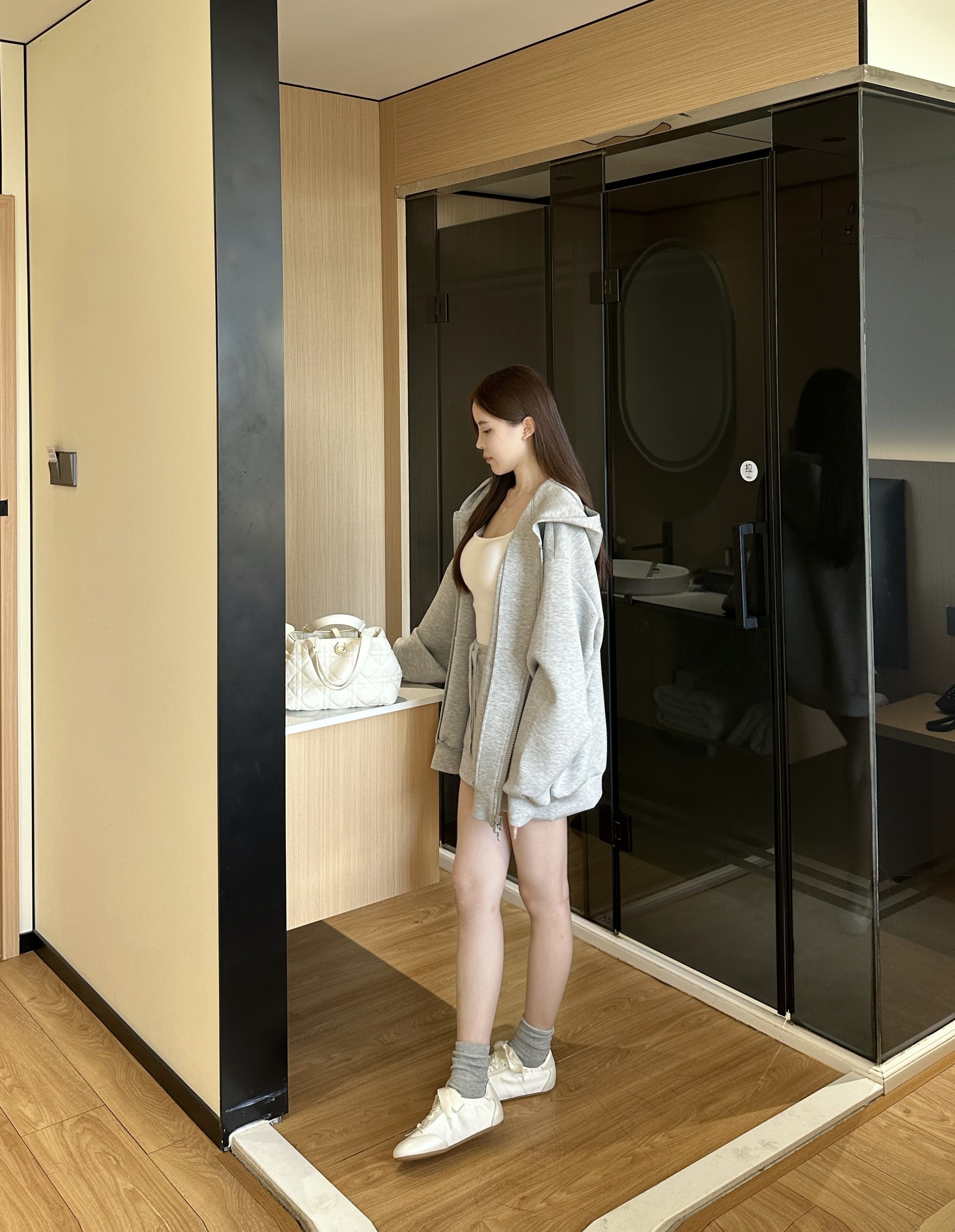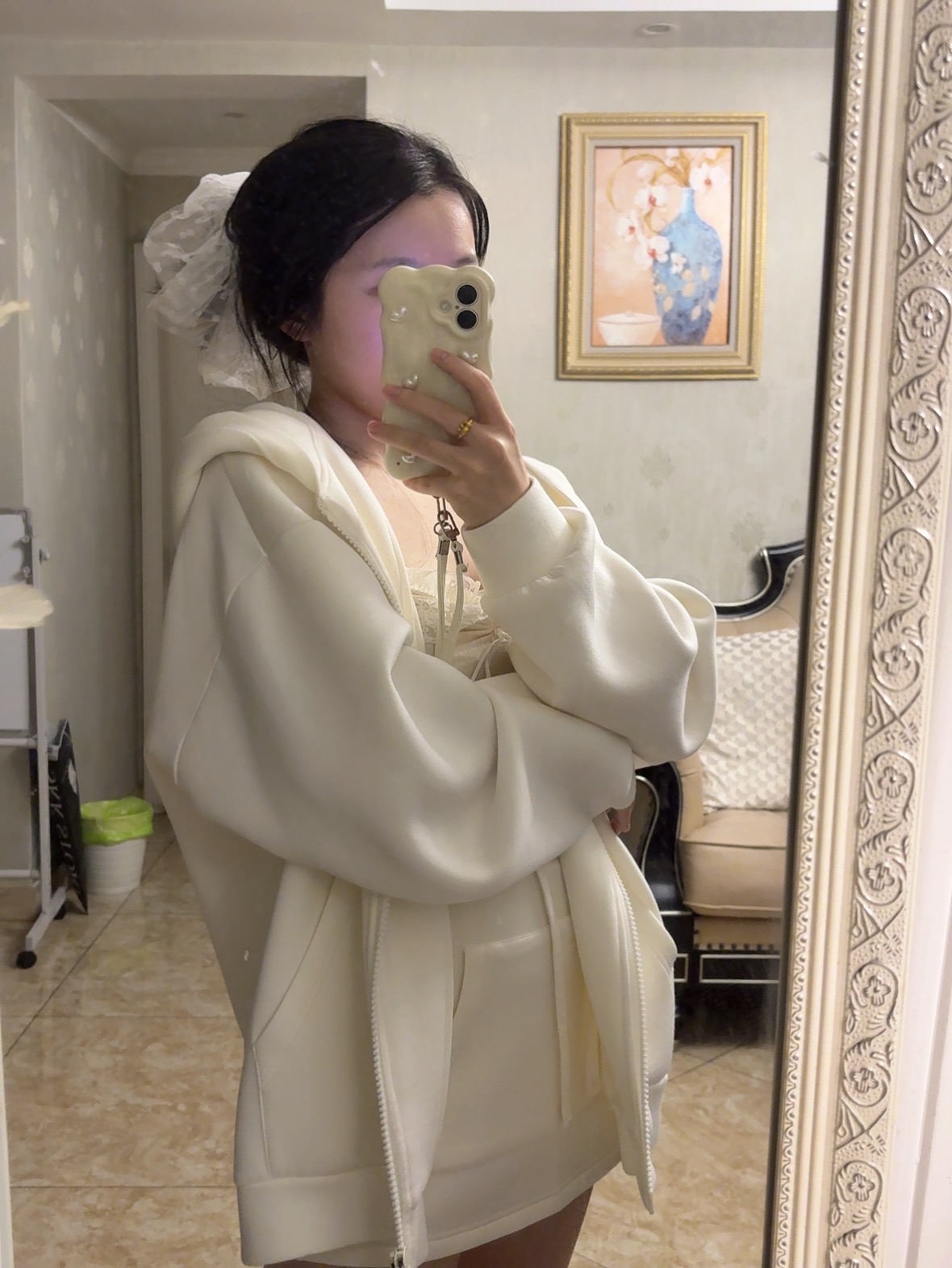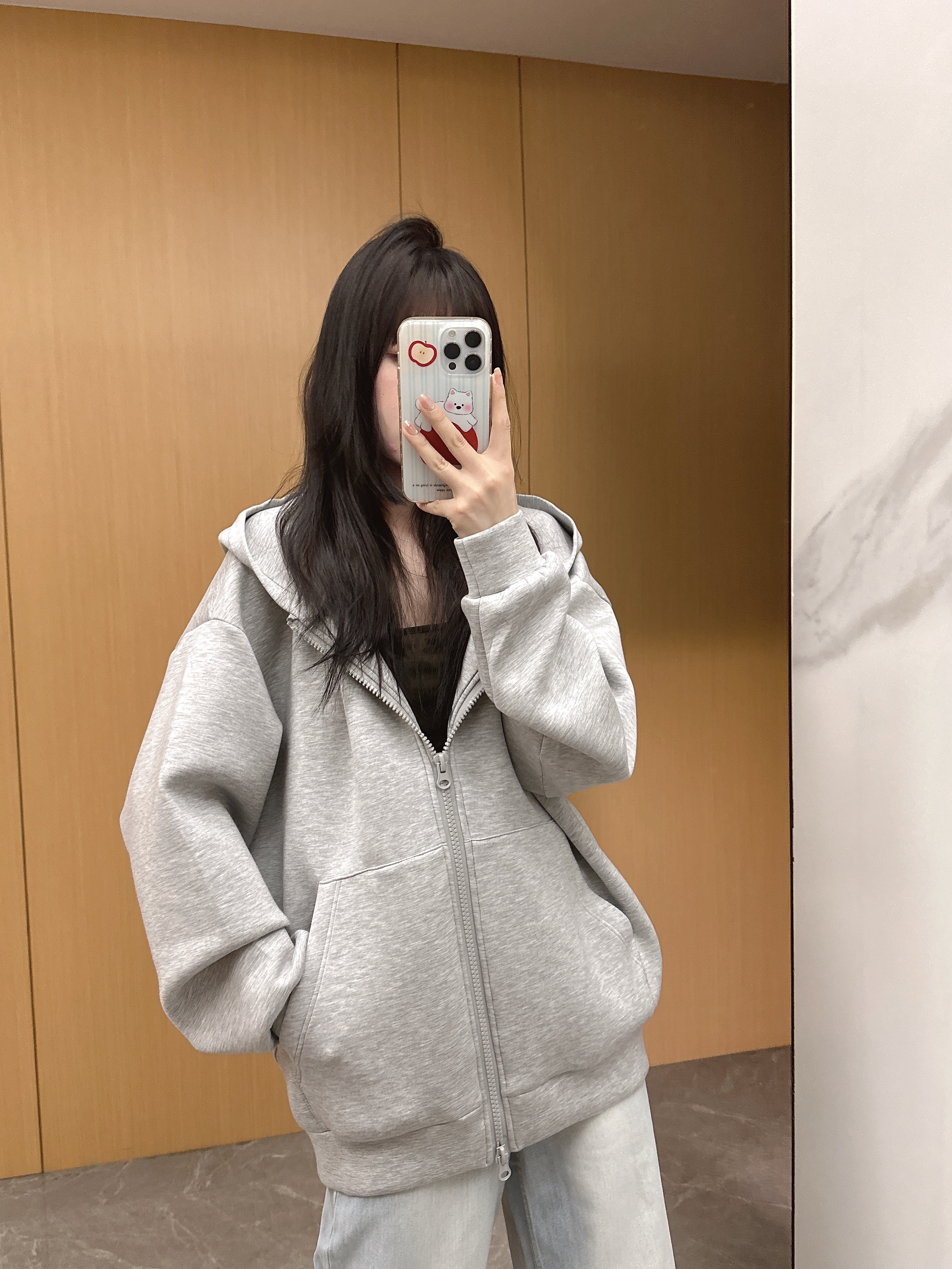 这件灰色卫衣外套真的是衣橱百搭王!面料摸起来软乎乎的,贴身穿不扎人