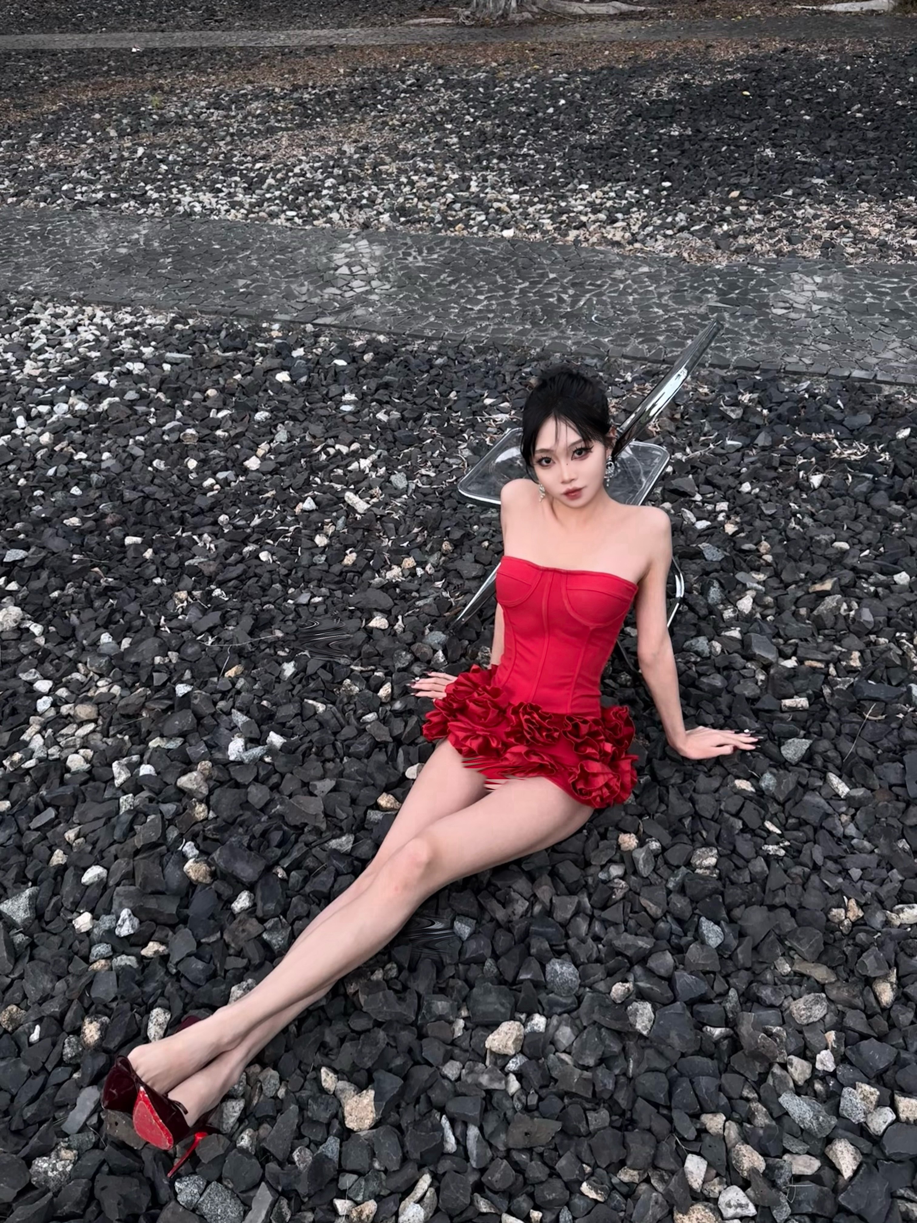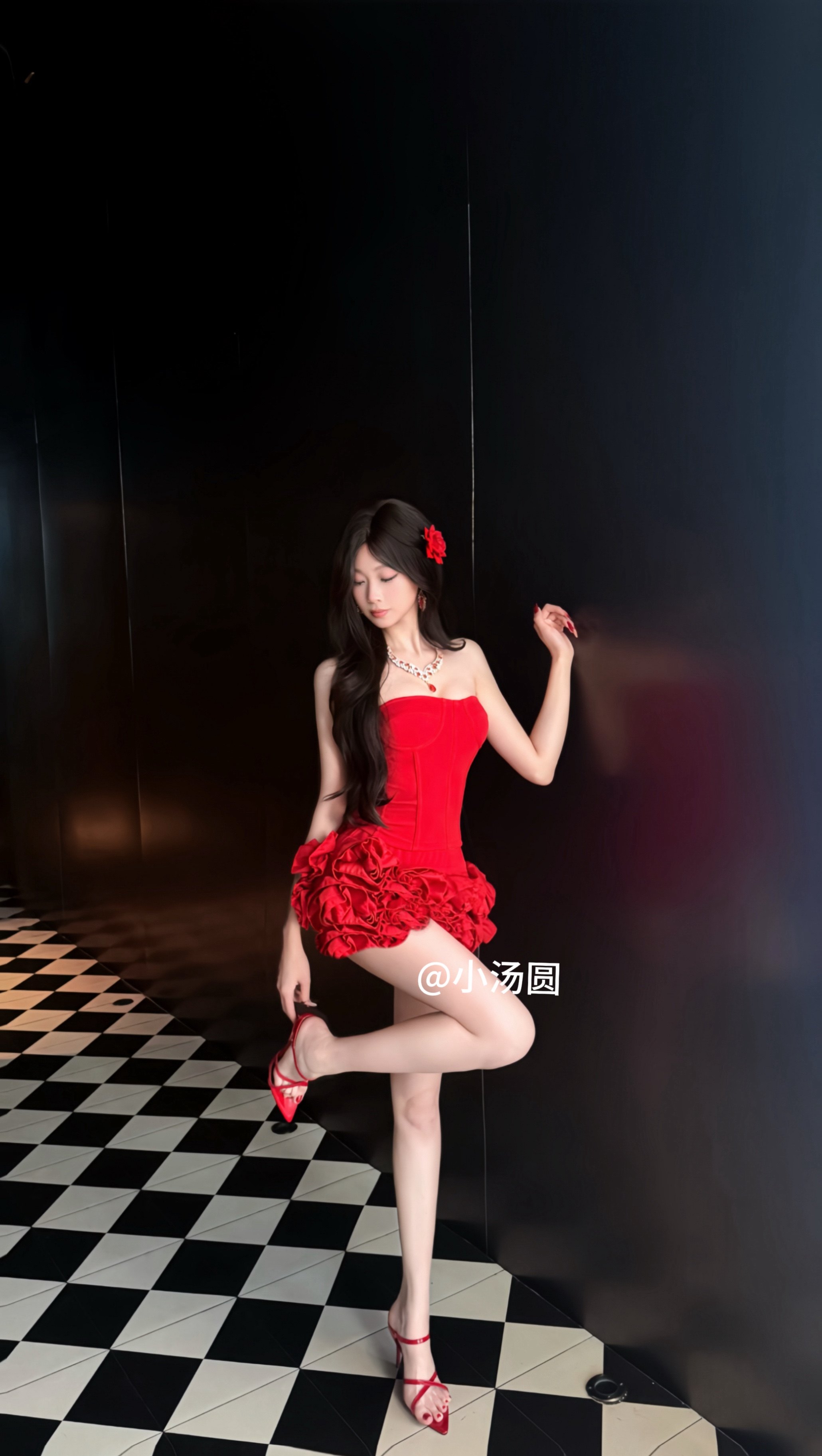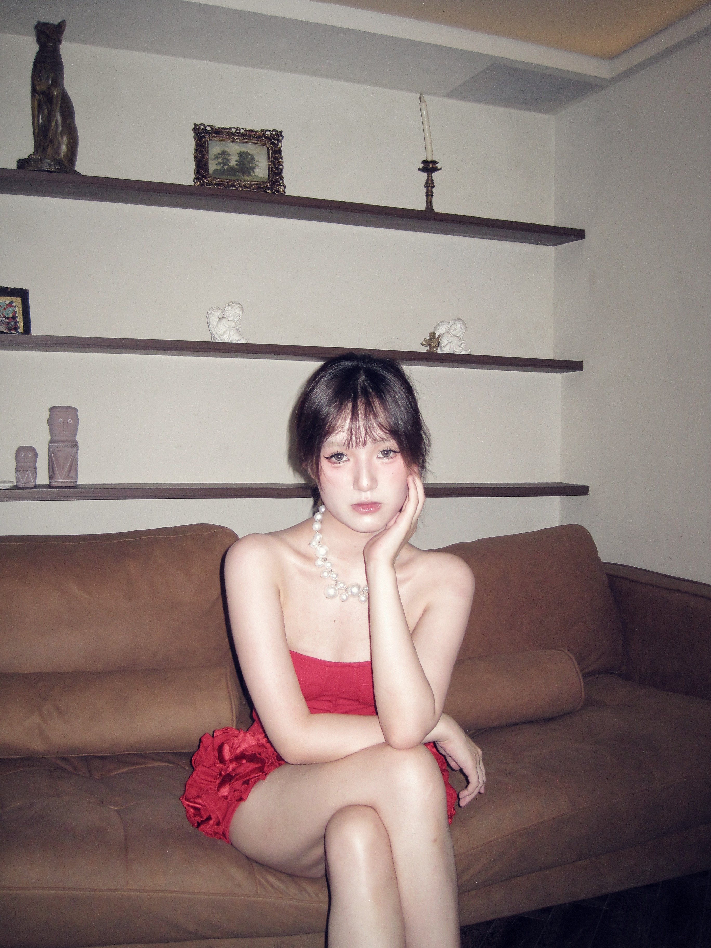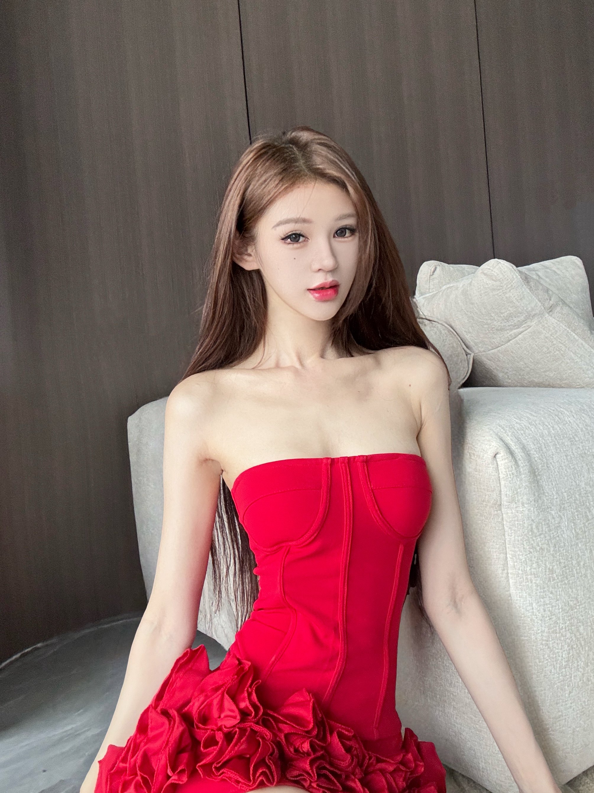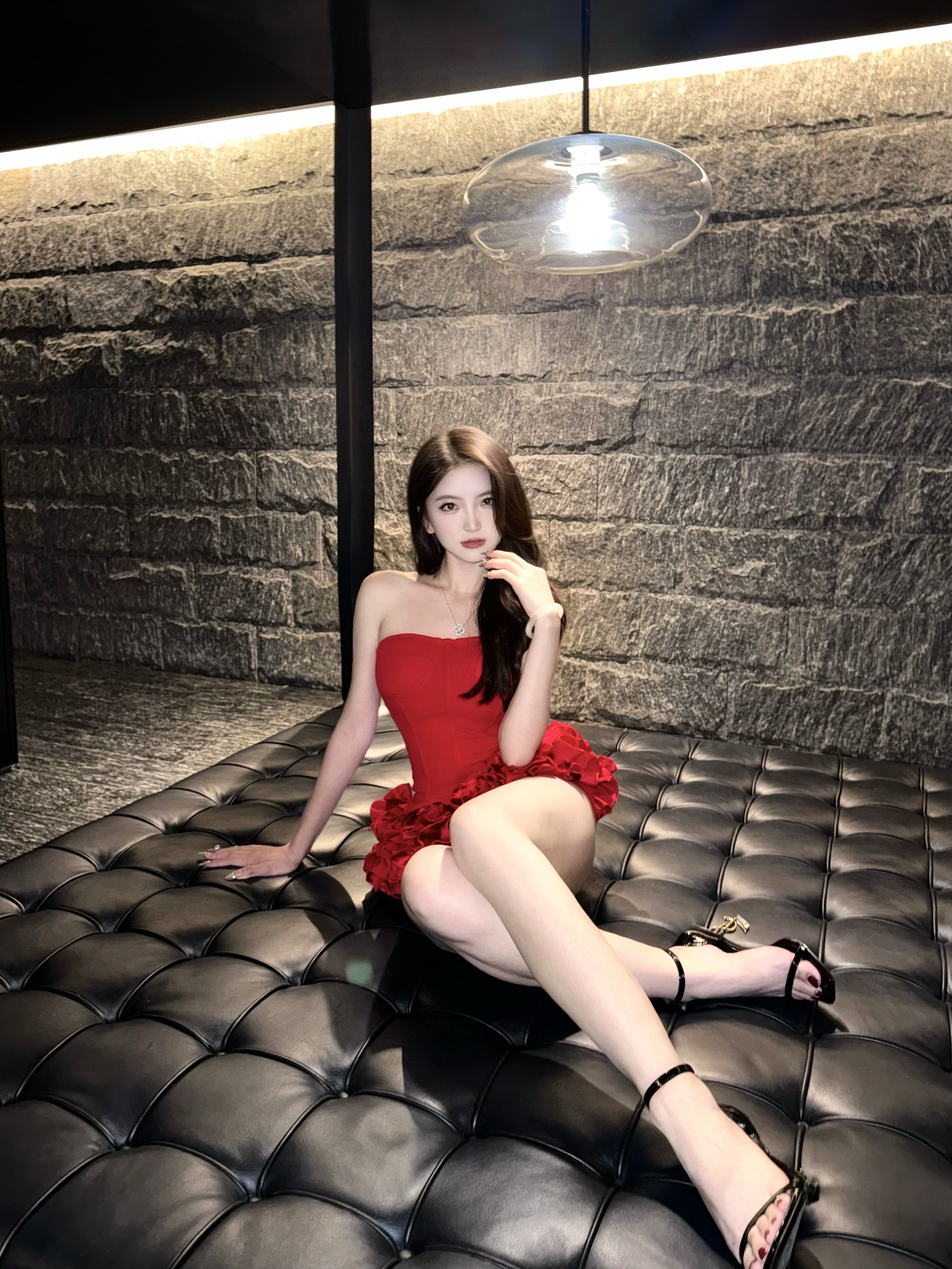 红色太惊艳了!款式很大胆又吸睛,抹胸设计凸显迷人锁骨和肩线,裙摆的花朵装饰精致又独特。质量没话说,面料质感高级,做工也很精细。版型超级显瘦,把身材比例修饰得特别好。坐在造型别致的红色大沙发上,和裙子颜色很好看,整个画面时尚感爆棚,穿上就是人群中最亮眼的存在!