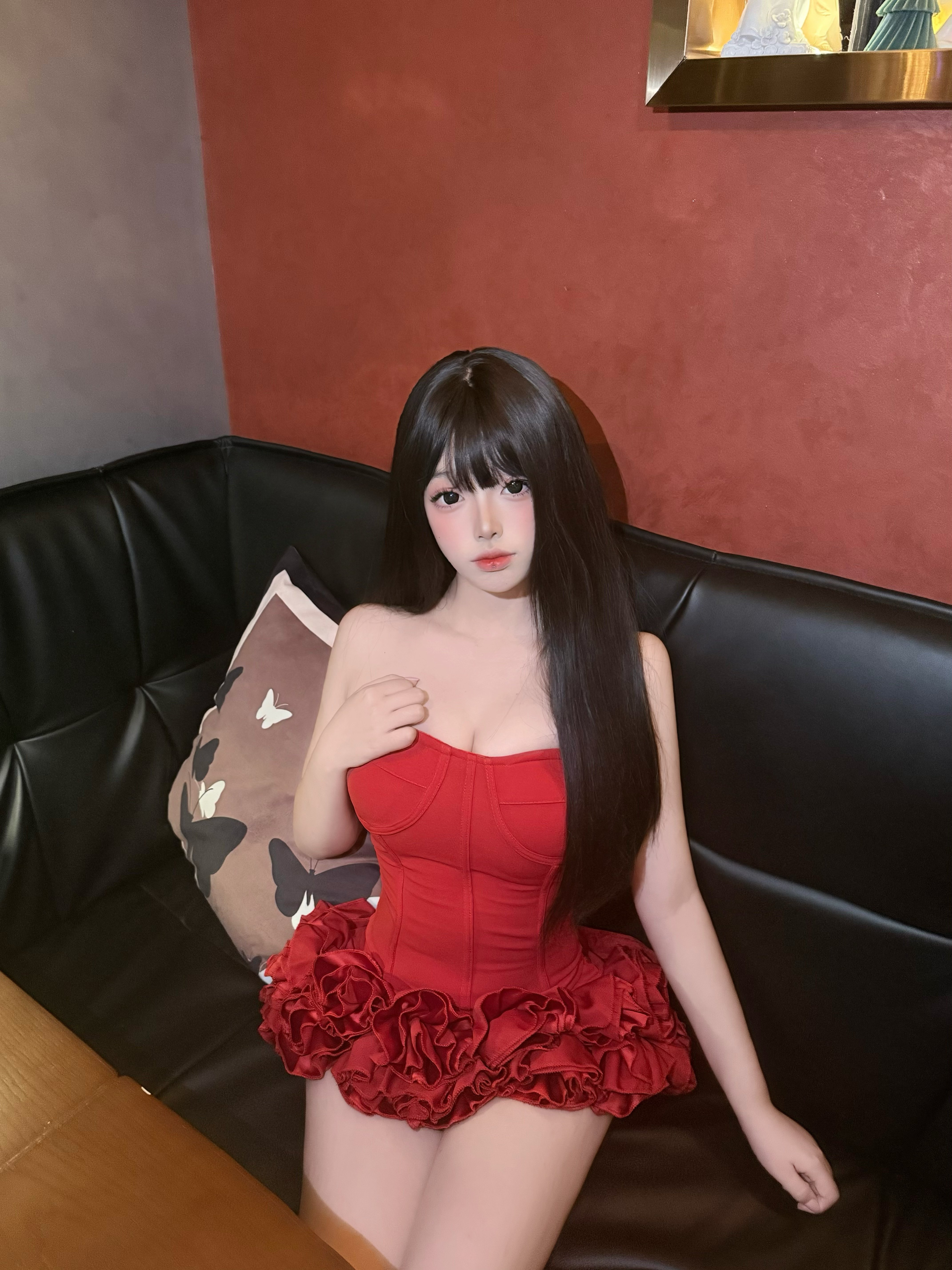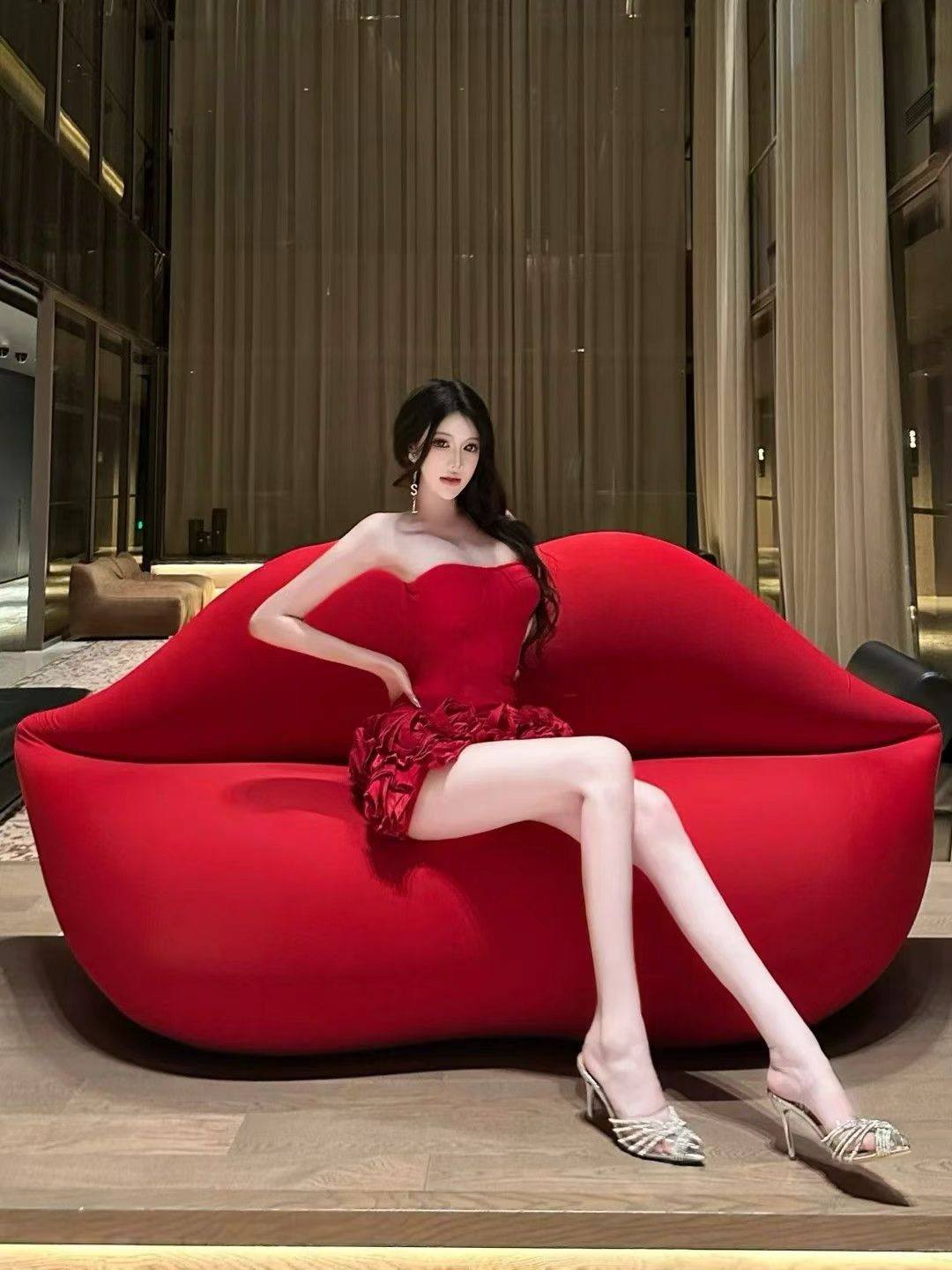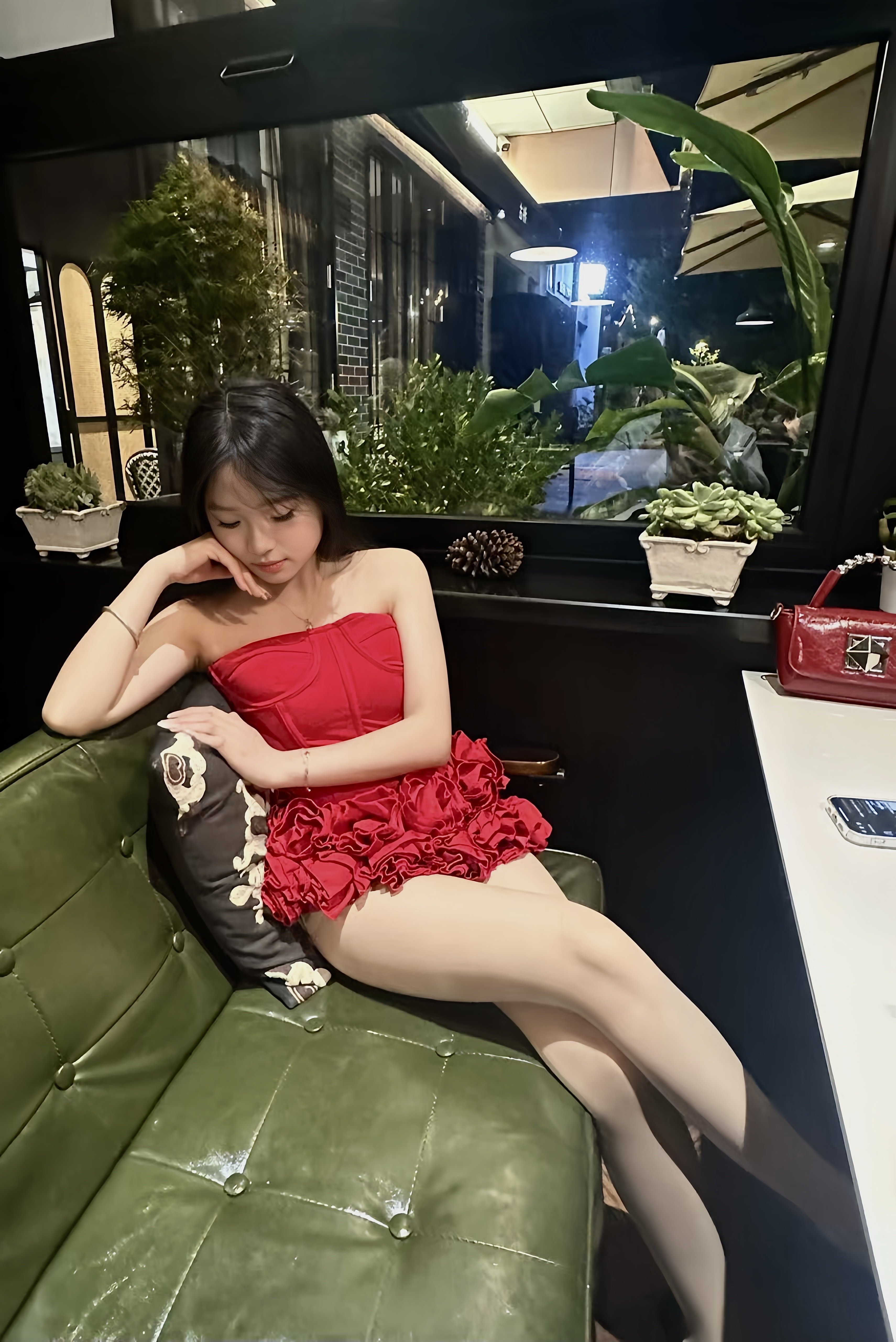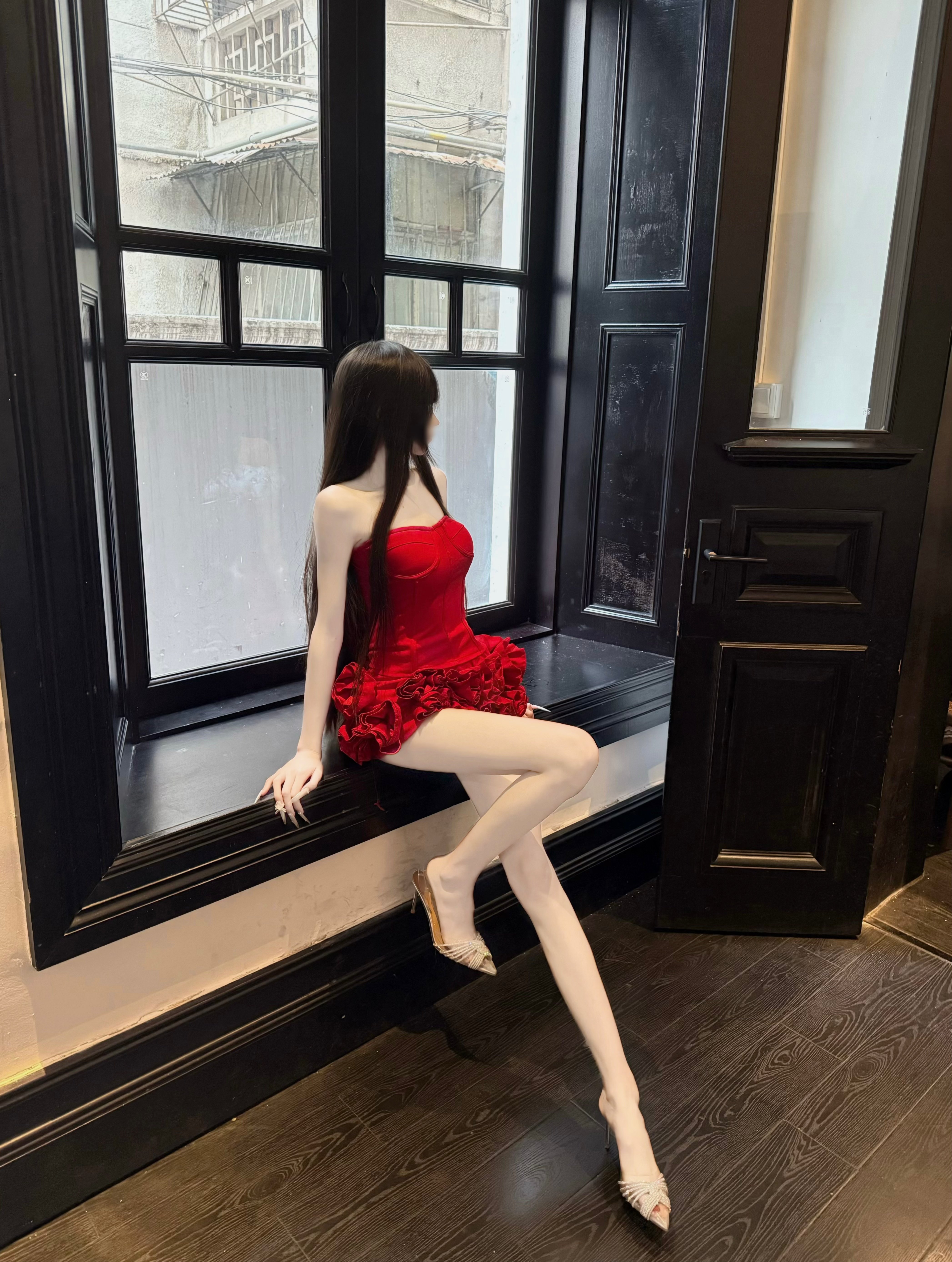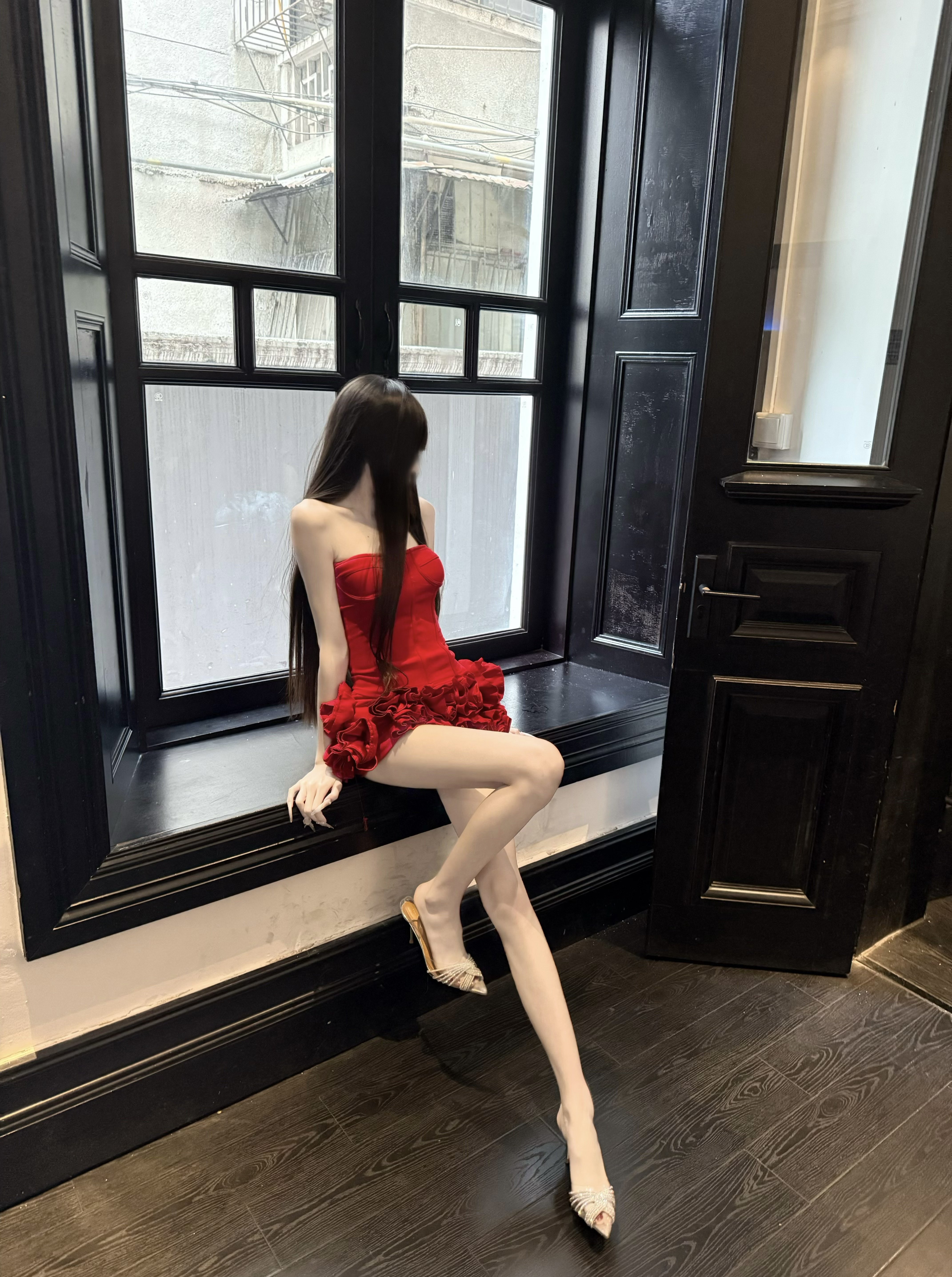 红色太惊艳了!款式很大胆又吸睛,抹胸设计凸显迷人锁骨和肩线,裙摆的花朵装饰精致又独特。质量没话说,面料质感高级,做工也很精细。版型超级显瘦,把身材比例修饰得特别好。坐在造型别致的红色大沙发上,和裙子颜色很好看,整个画面时尚感爆棚,穿上就是人群中最亮眼的存在!
