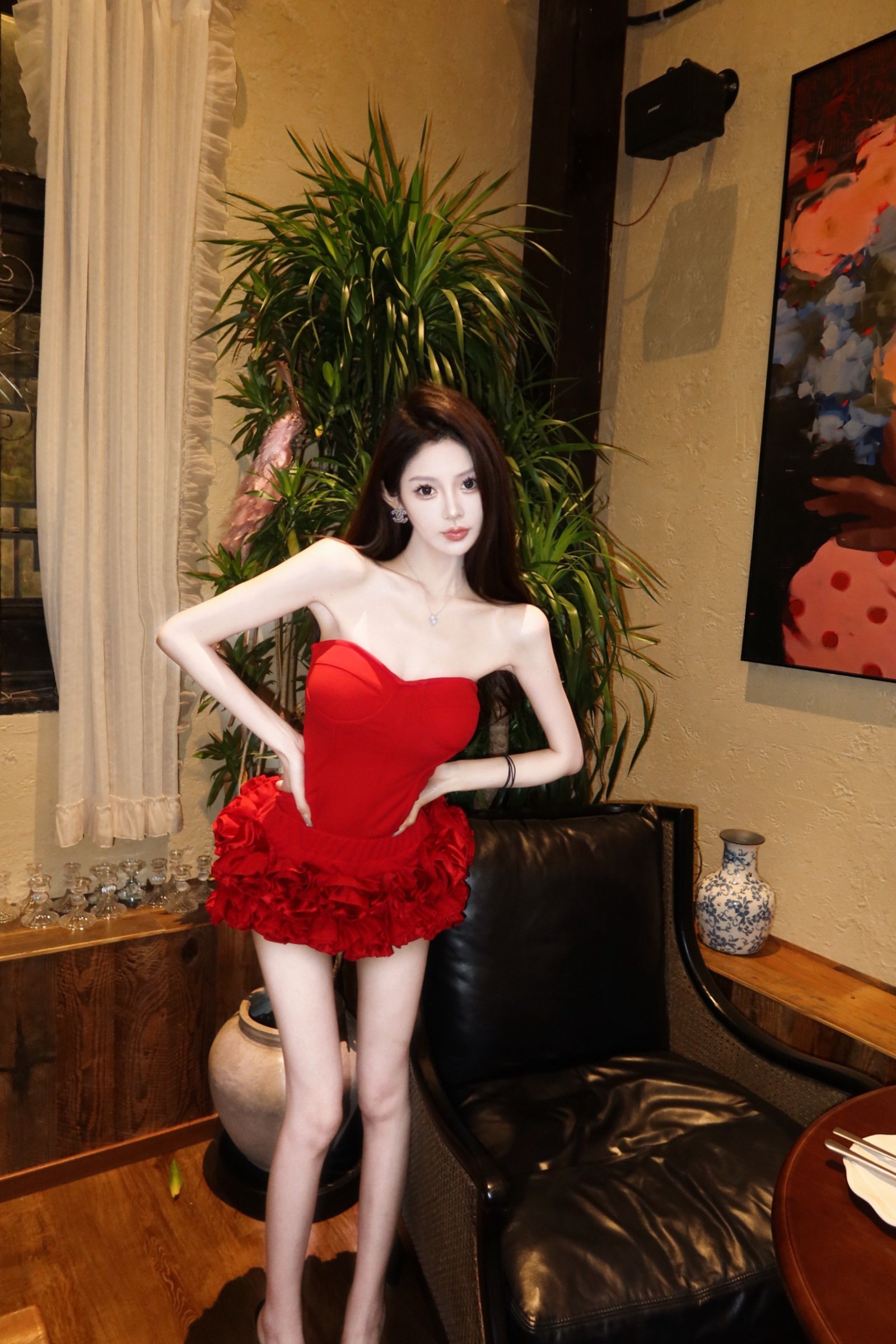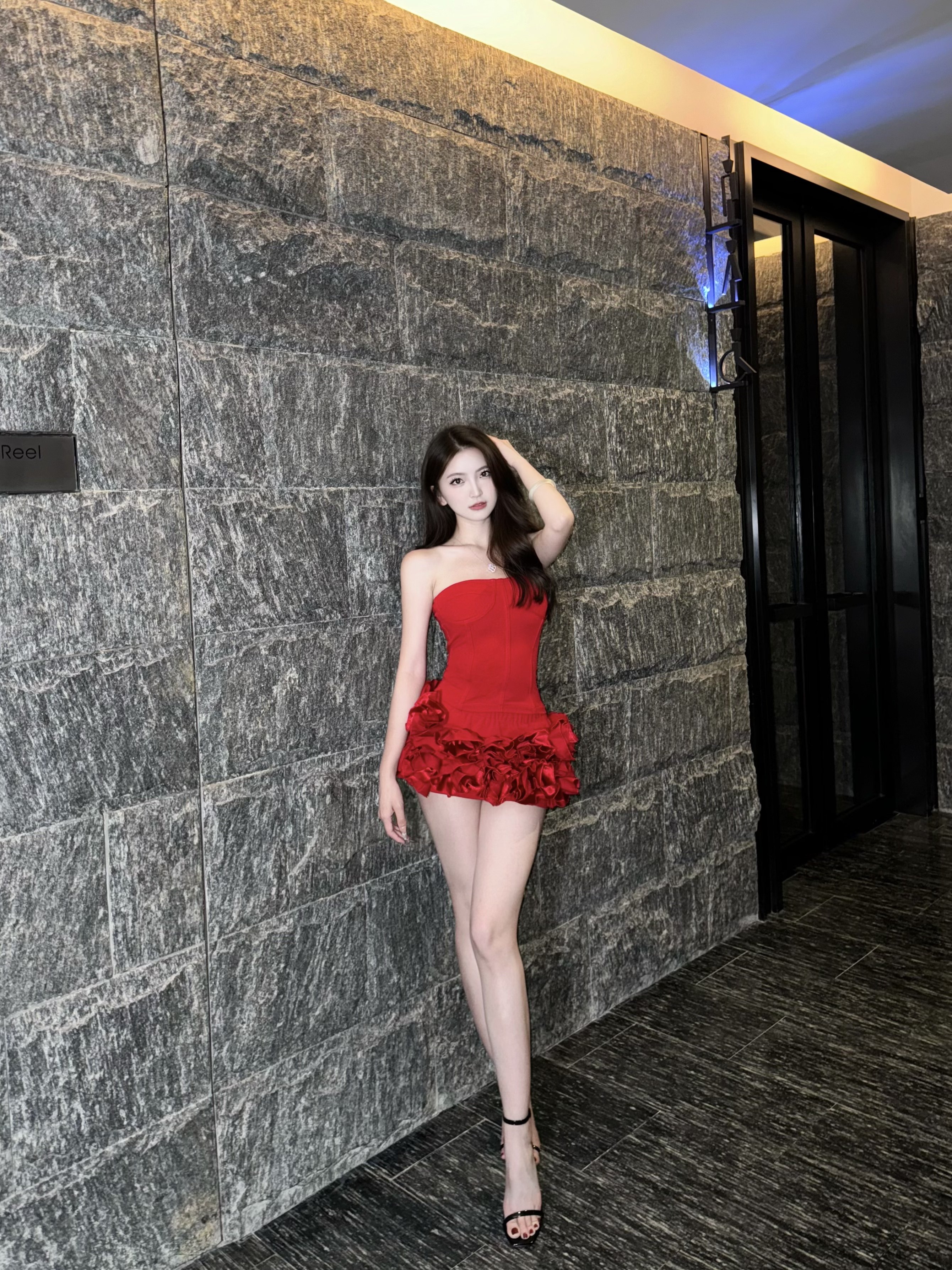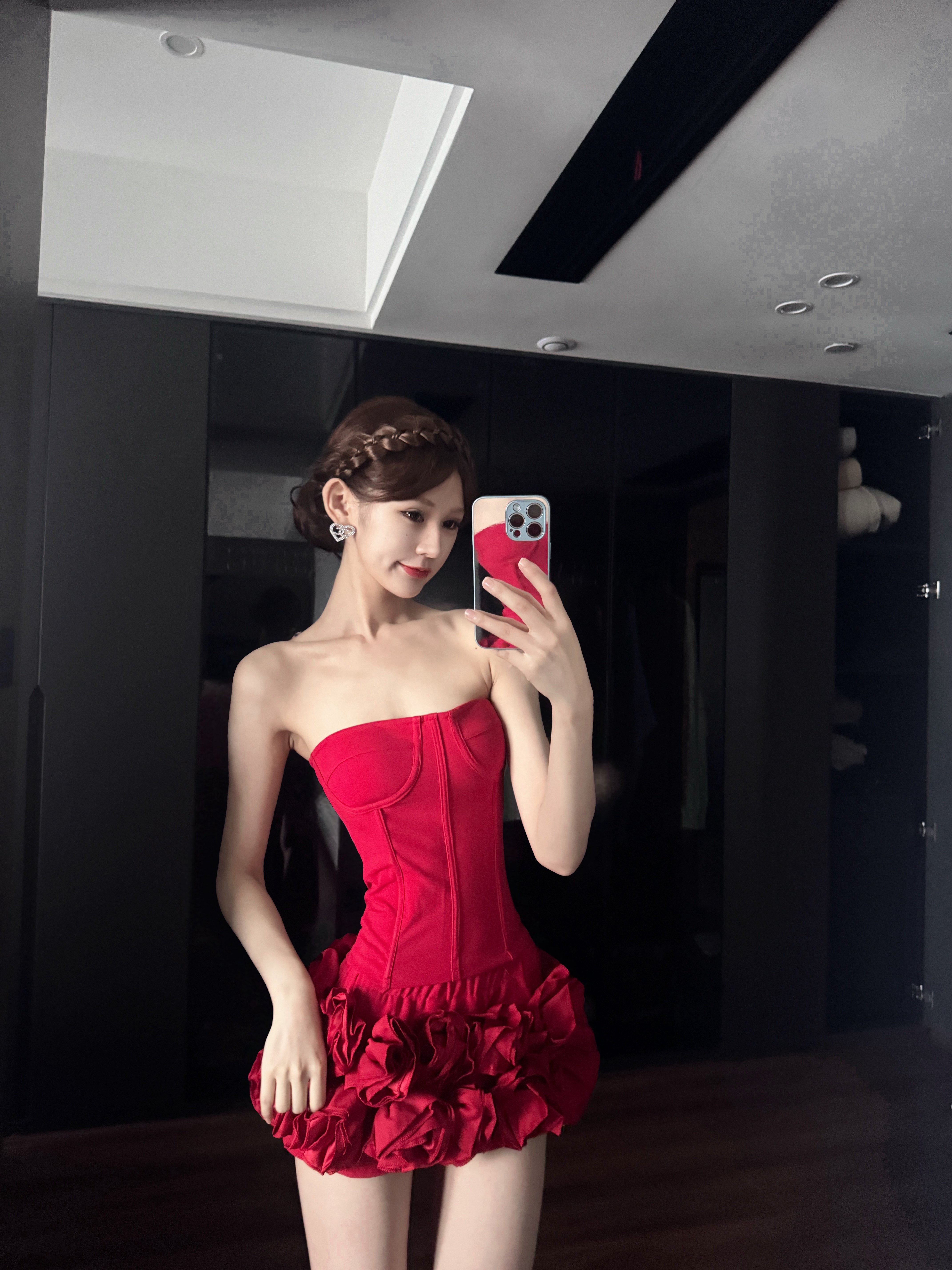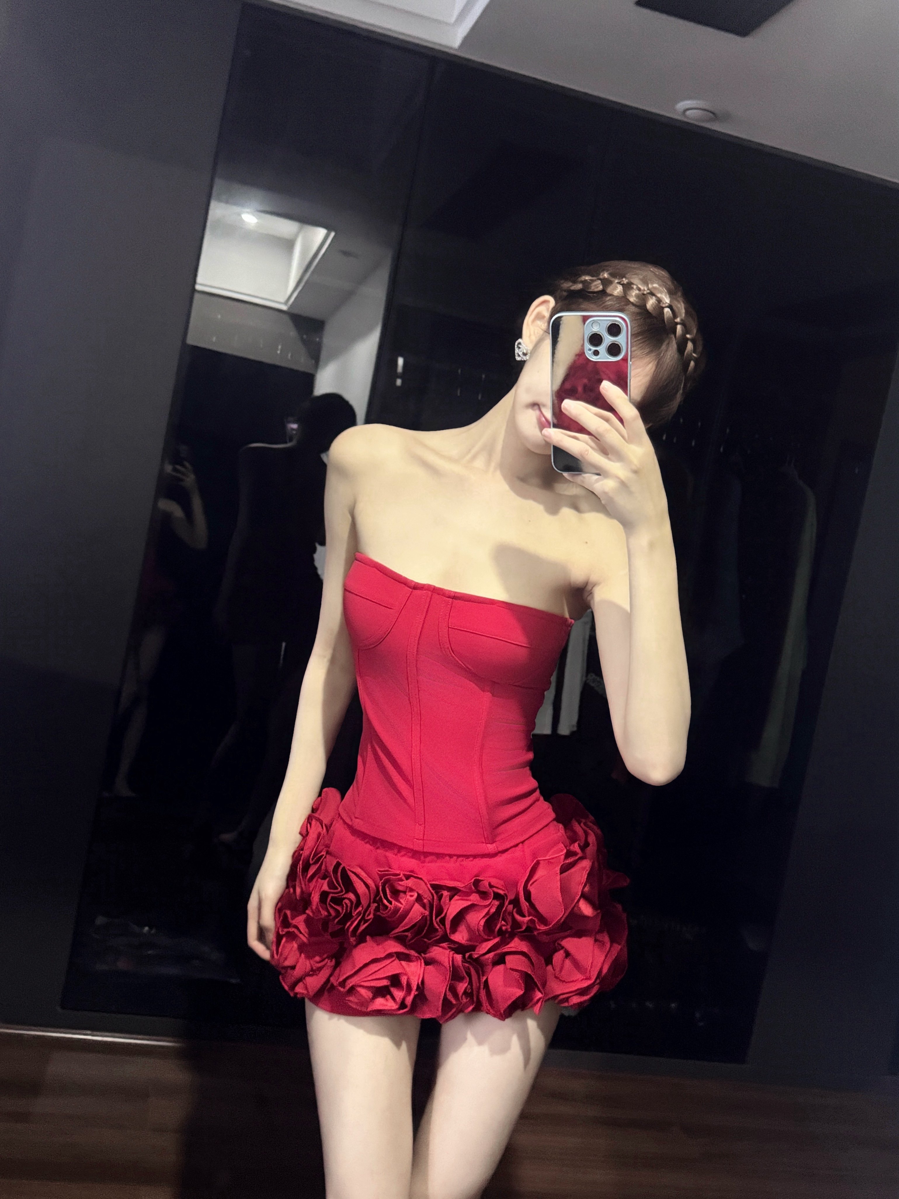 真的无敌好好好看啊啊啊啊啊!抹胸的设计把上半身的魅力完全展现出来,,下半身的存在感就被削弱啦。裙摆的立体花朵设计超级精致,而且是蓬松的款式,把臀部和大腿的肉肉都遮得严严实实,只露出纤细的小腿。红色特别显白,也很有气场,拍照感觉自己就是全场的焦点,梨形身材什么的,完全不存在,自信直接拉满!