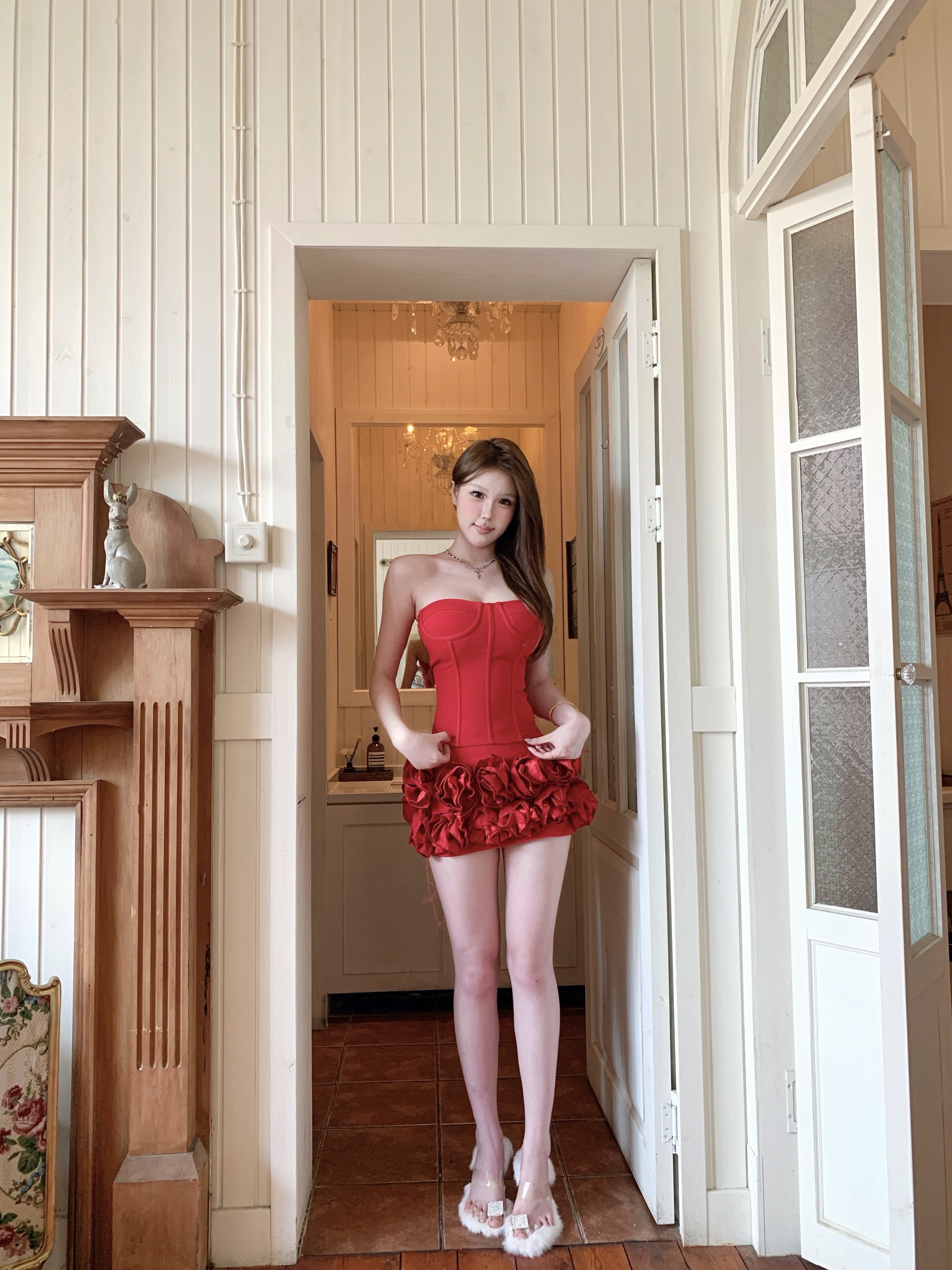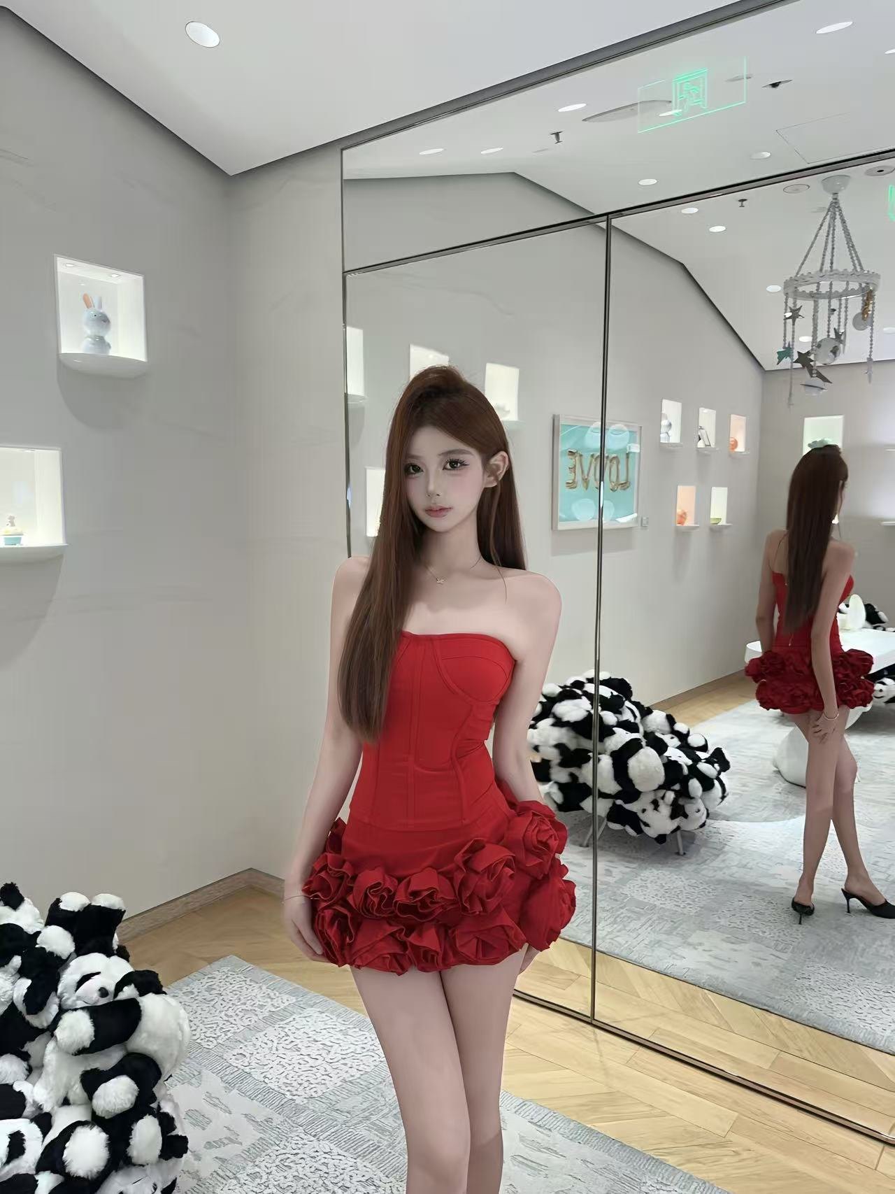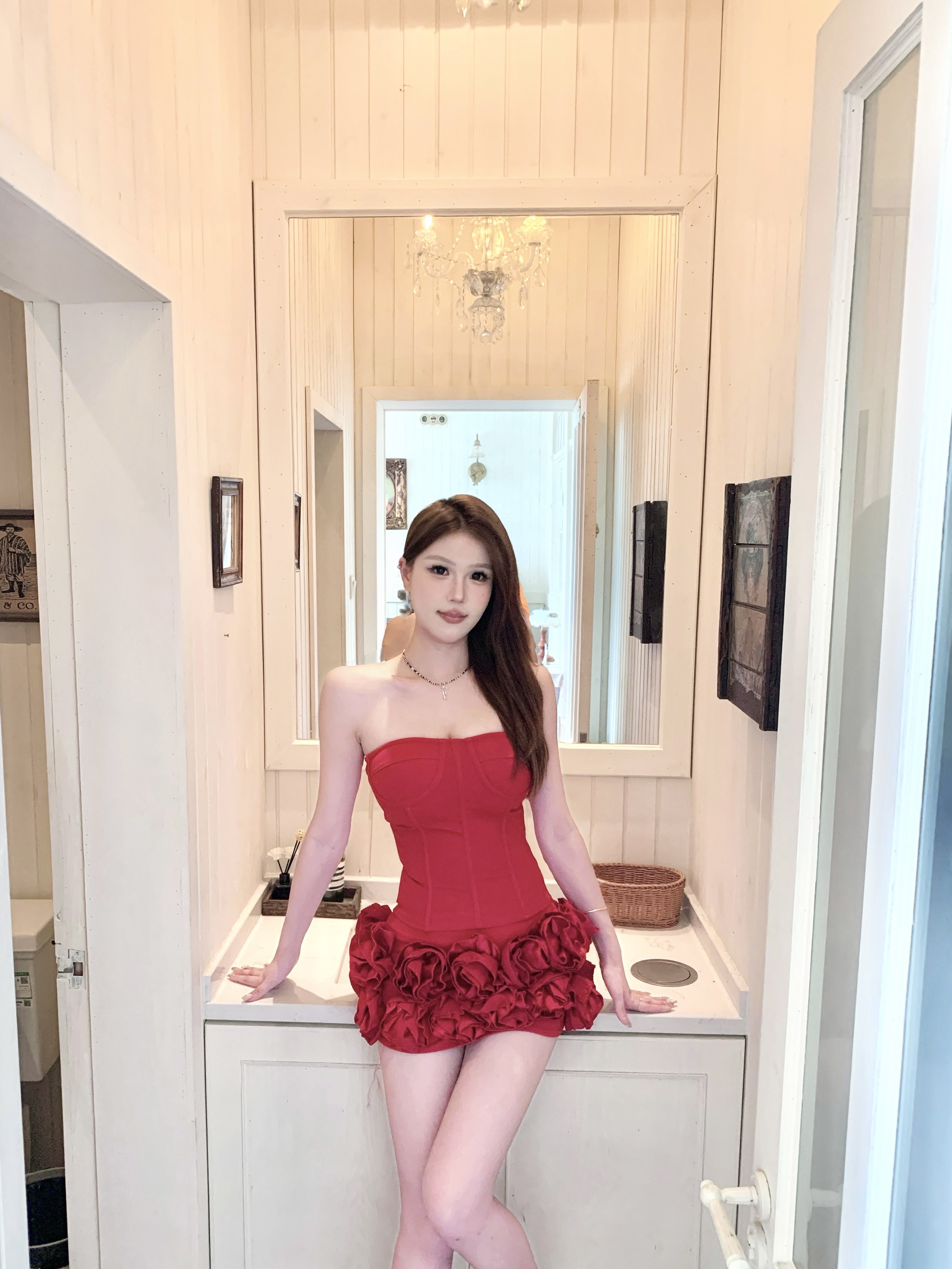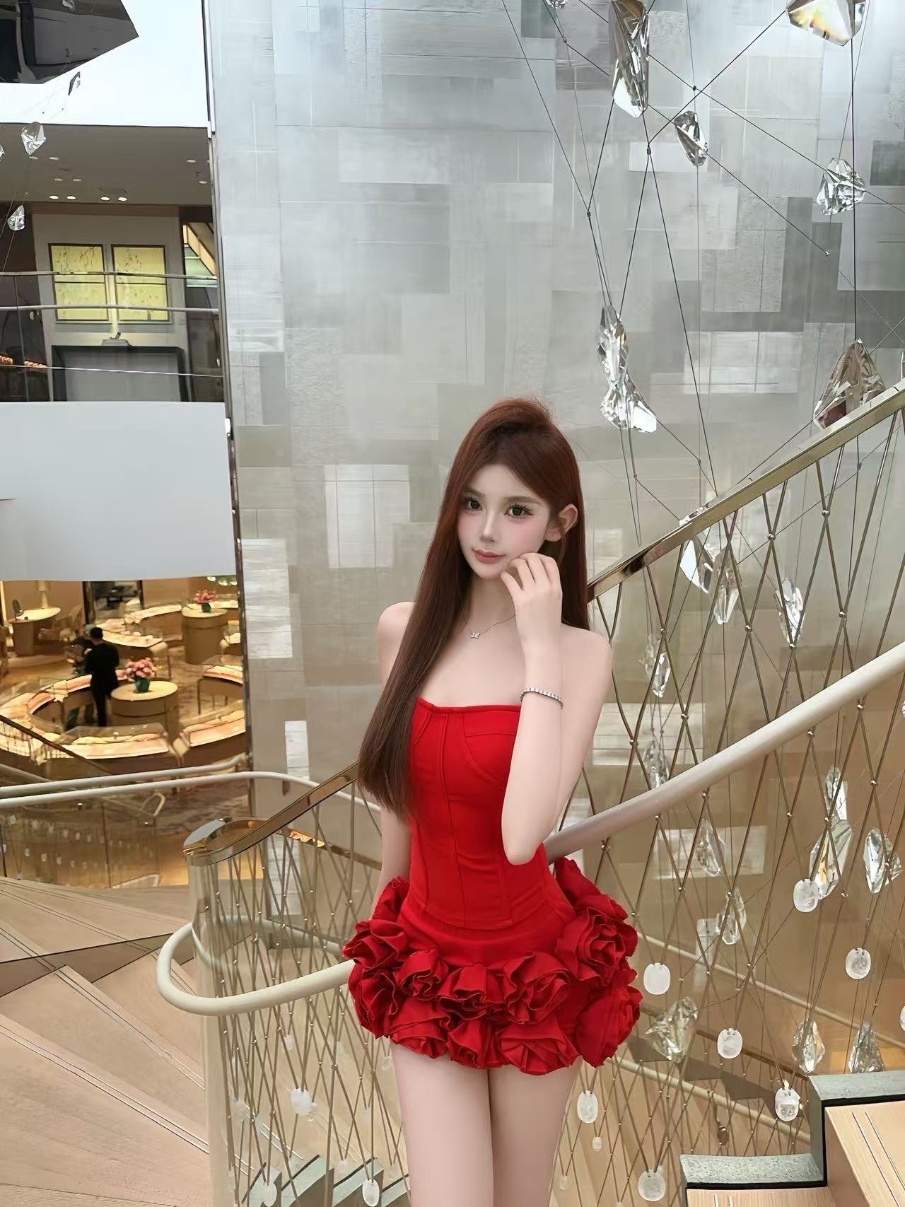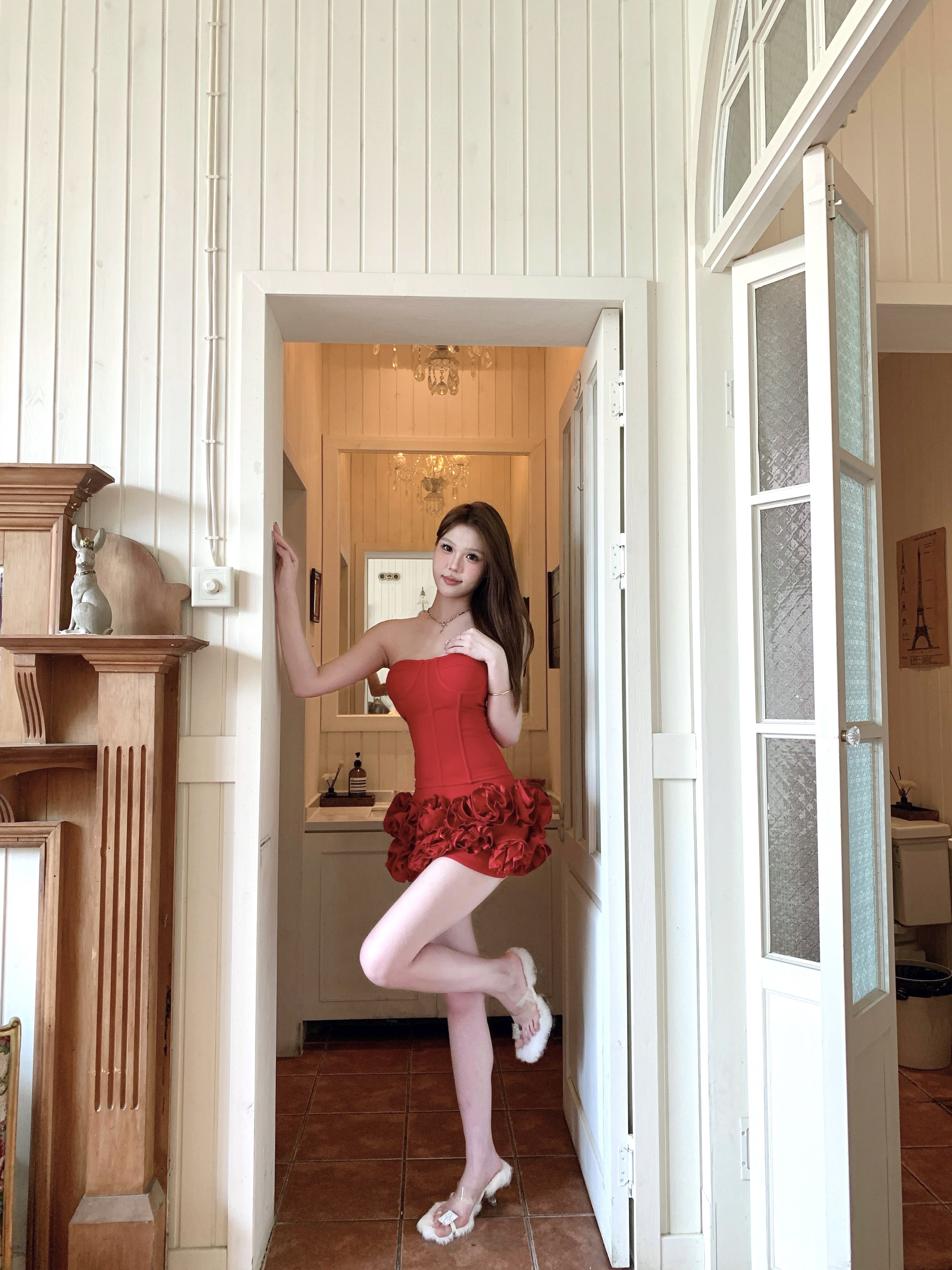 真的无敌好好好看啊啊啊啊啊!抹胸的设计把上半身的魅力完全展现出来,,下半身的存在感就被削弱啦。裙摆的立体花朵设计超级精致,而且是蓬松的款式,把臀部和大腿的肉肉都遮得严严实实,只露出纤细的小腿。红色特别显白,也很有气场,拍照感觉自己就是全场的焦点,梨形身材什么的,完全不存在,自信直接拉满!