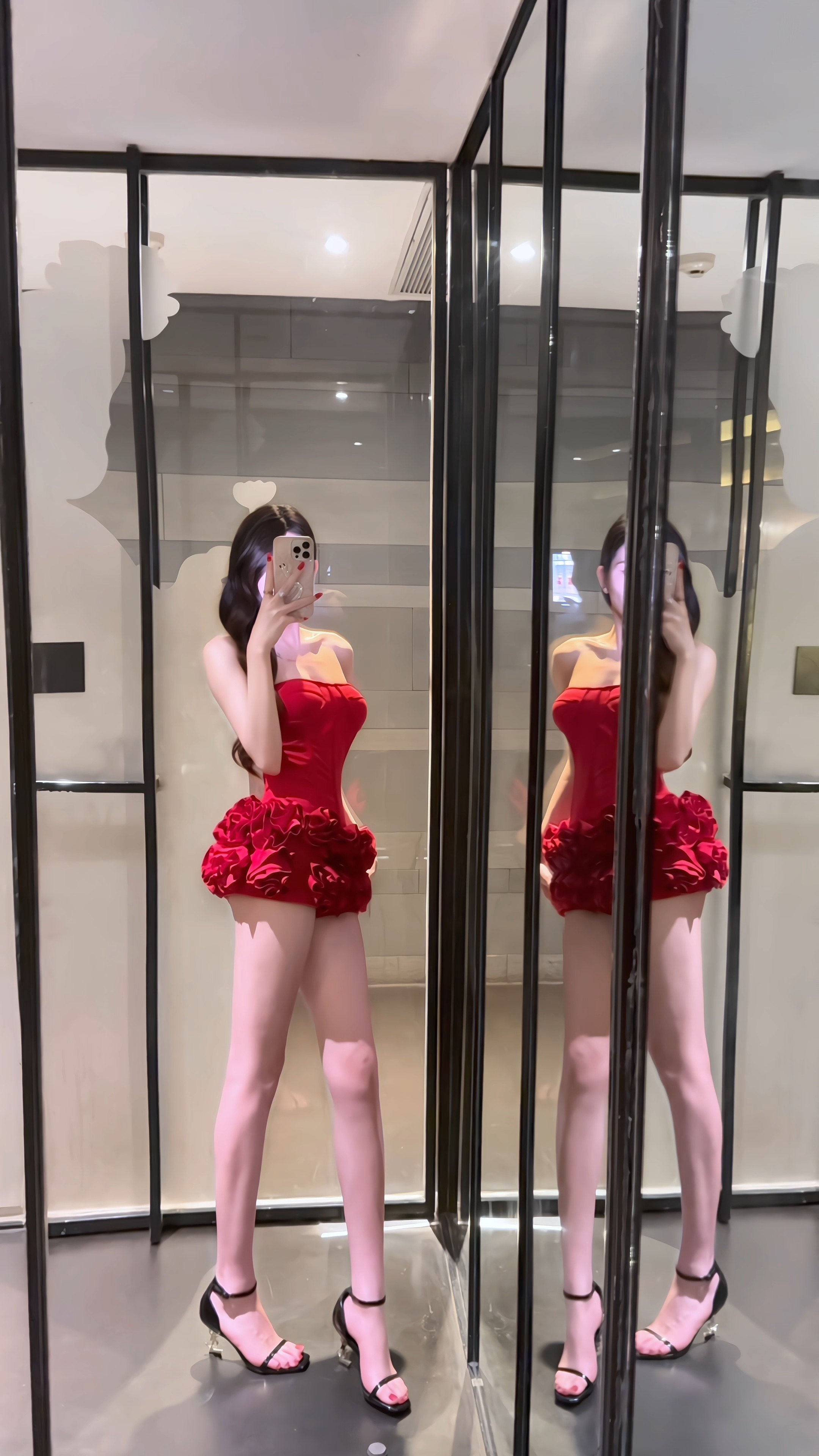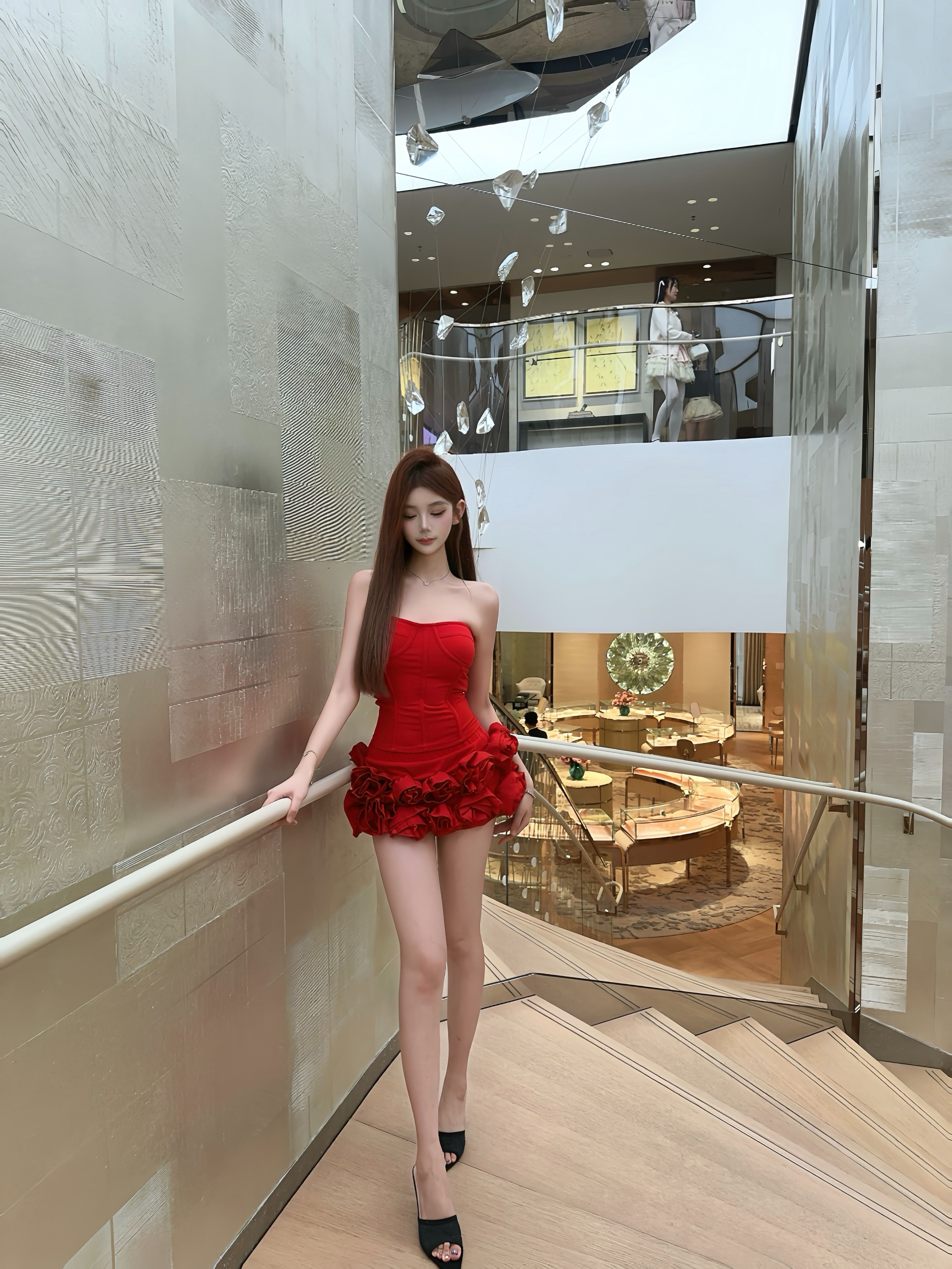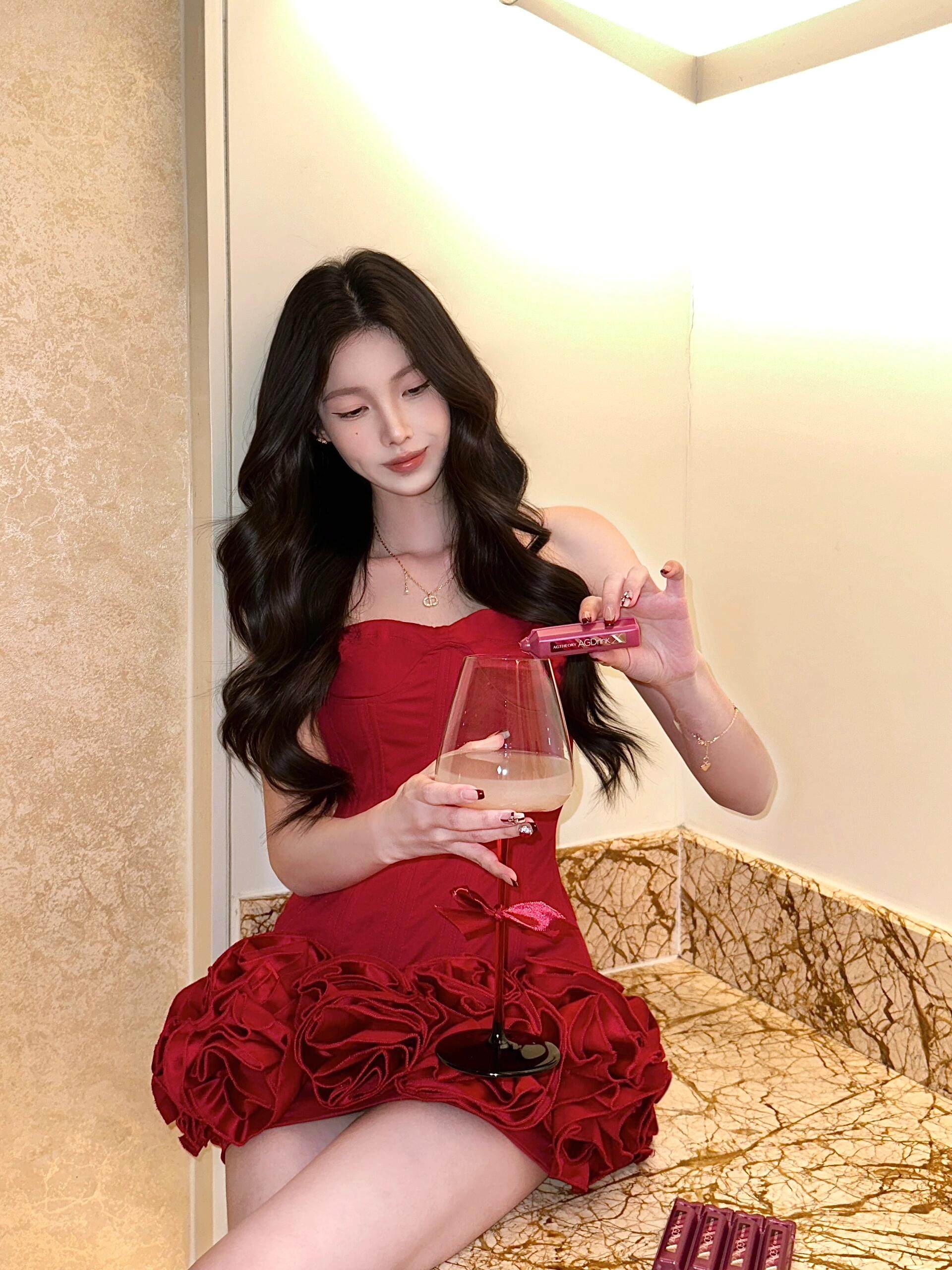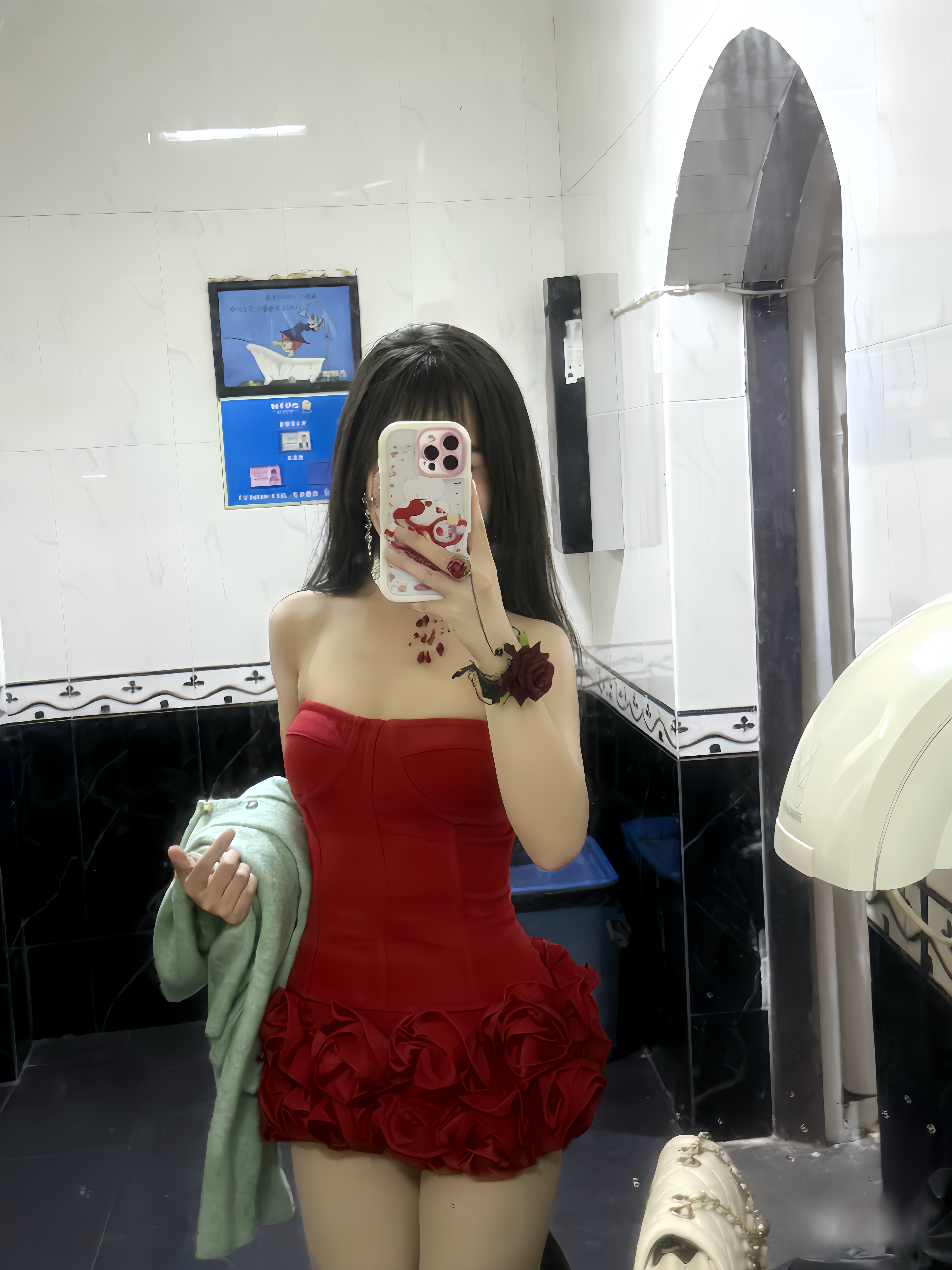 真的无敌好好好看啊啊啊啊啊!抹胸的设计把上半身的魅力完全展现出来,,下半身的存在感就被削弱啦。裙摆的立体花朵设计超级精致,而且是蓬松的款式,把臀部和大腿的肉肉都遮得严严实实,只露出纤细的小腿。红色特别显白,也很有气场,拍照感觉自己就是全场的焦点,梨形身材什么的,完全不存在,自信直接拉满!