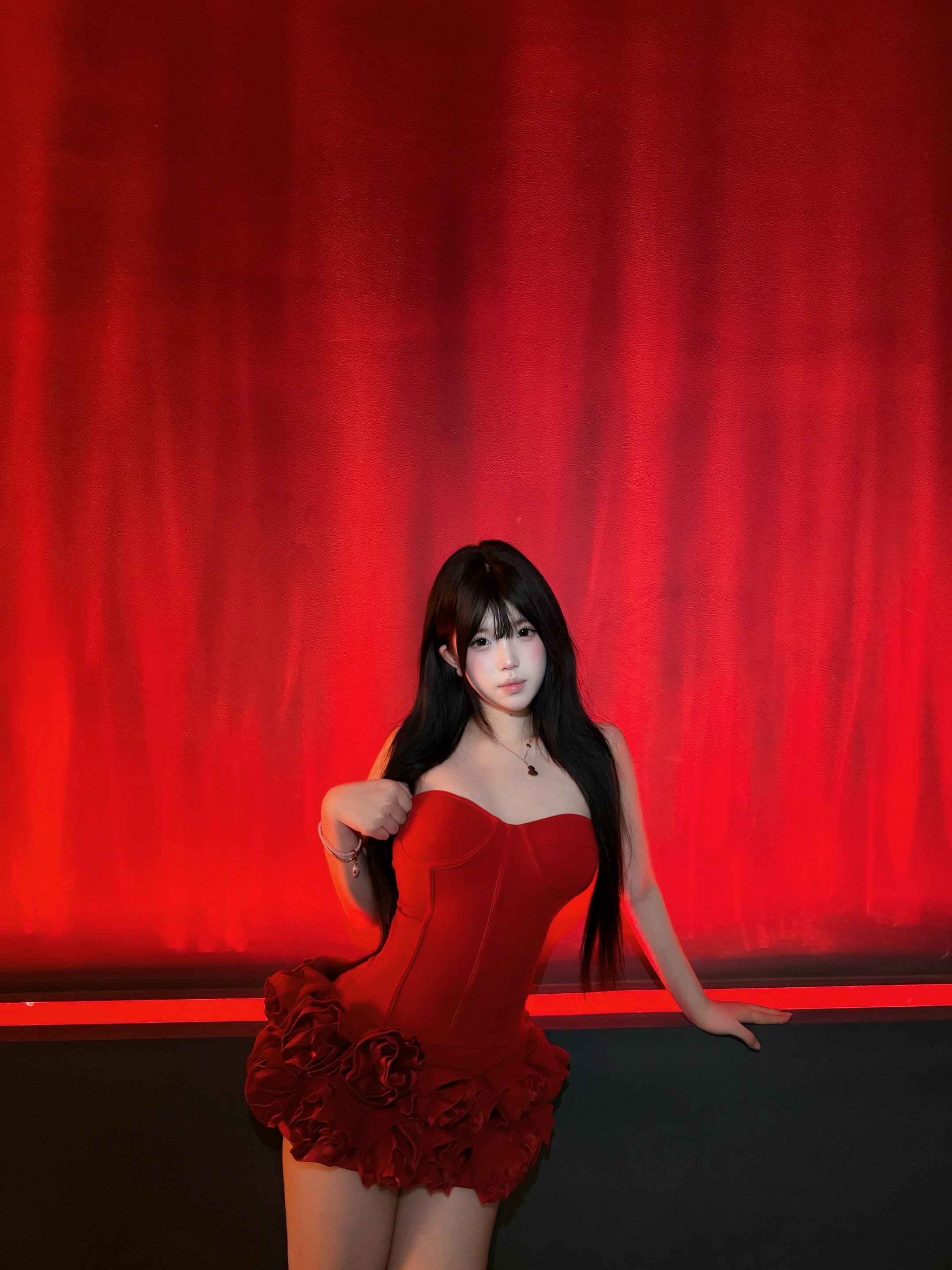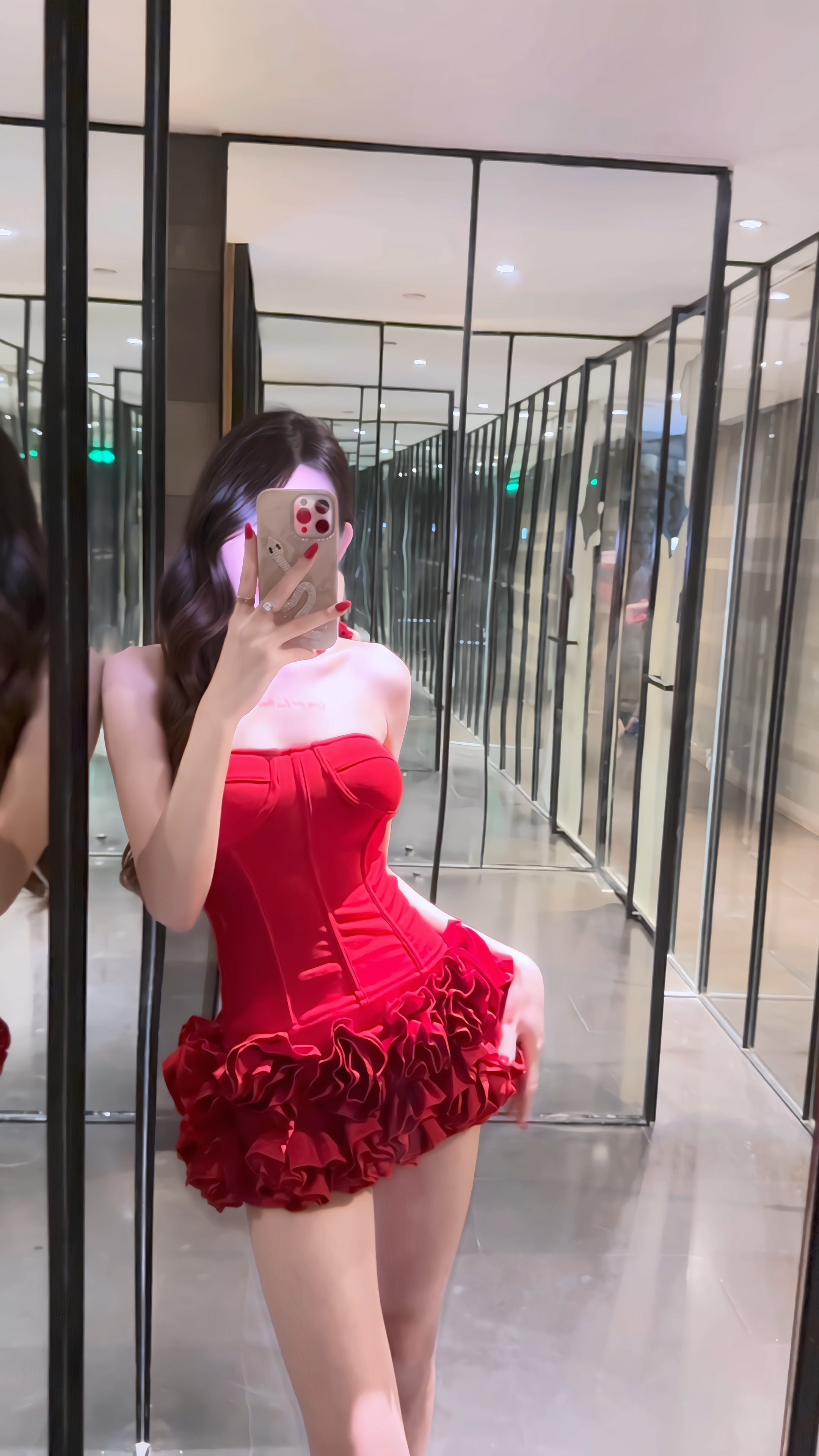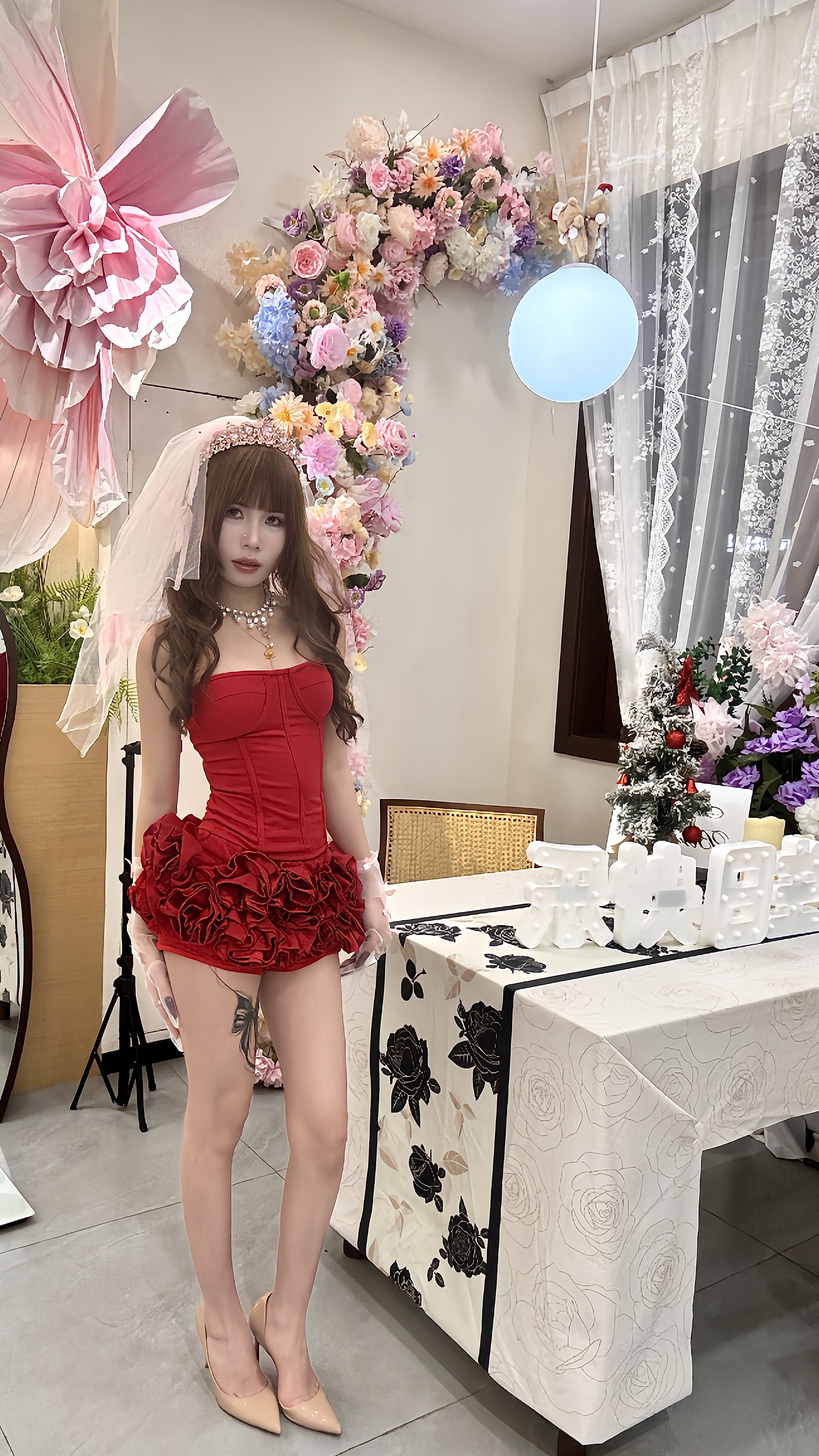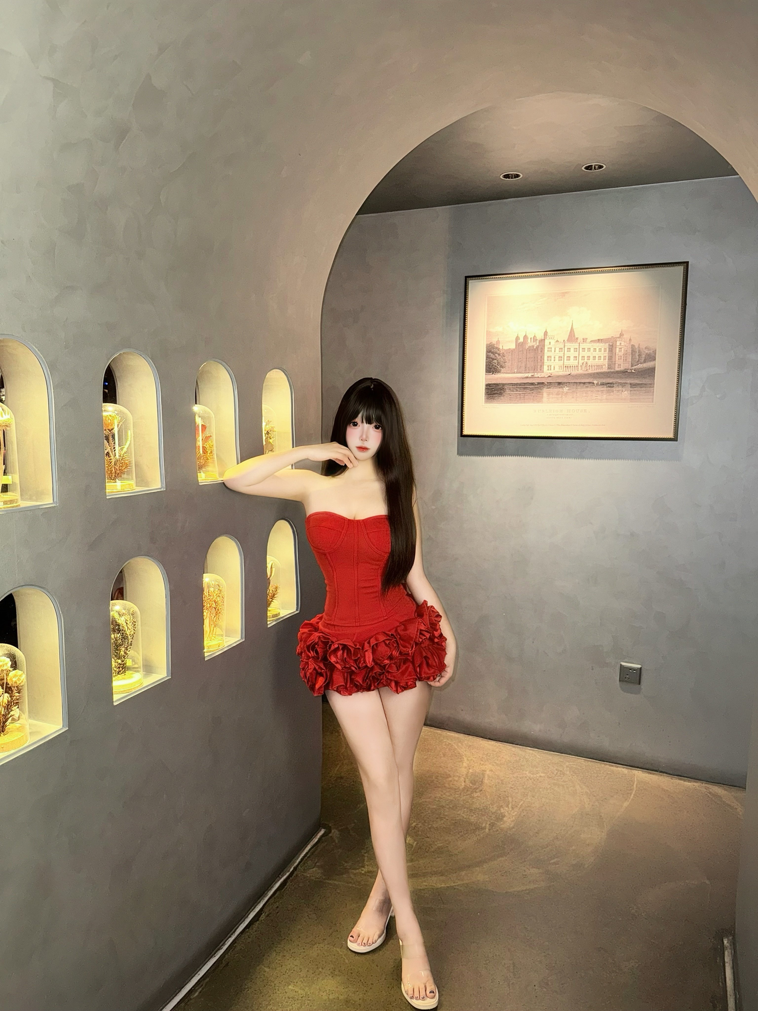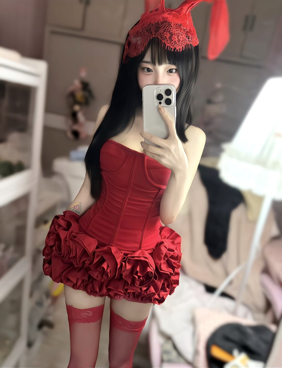 很漂亮哦 这家真的比很多网红店质量都好 很正的红色 花朵是固定好的,抹胸有做鱼骨 穿起来显胸型,小胸穿也不会空杯,生日穿迷鼠人了 美女都该有一件 没失望好好看哟