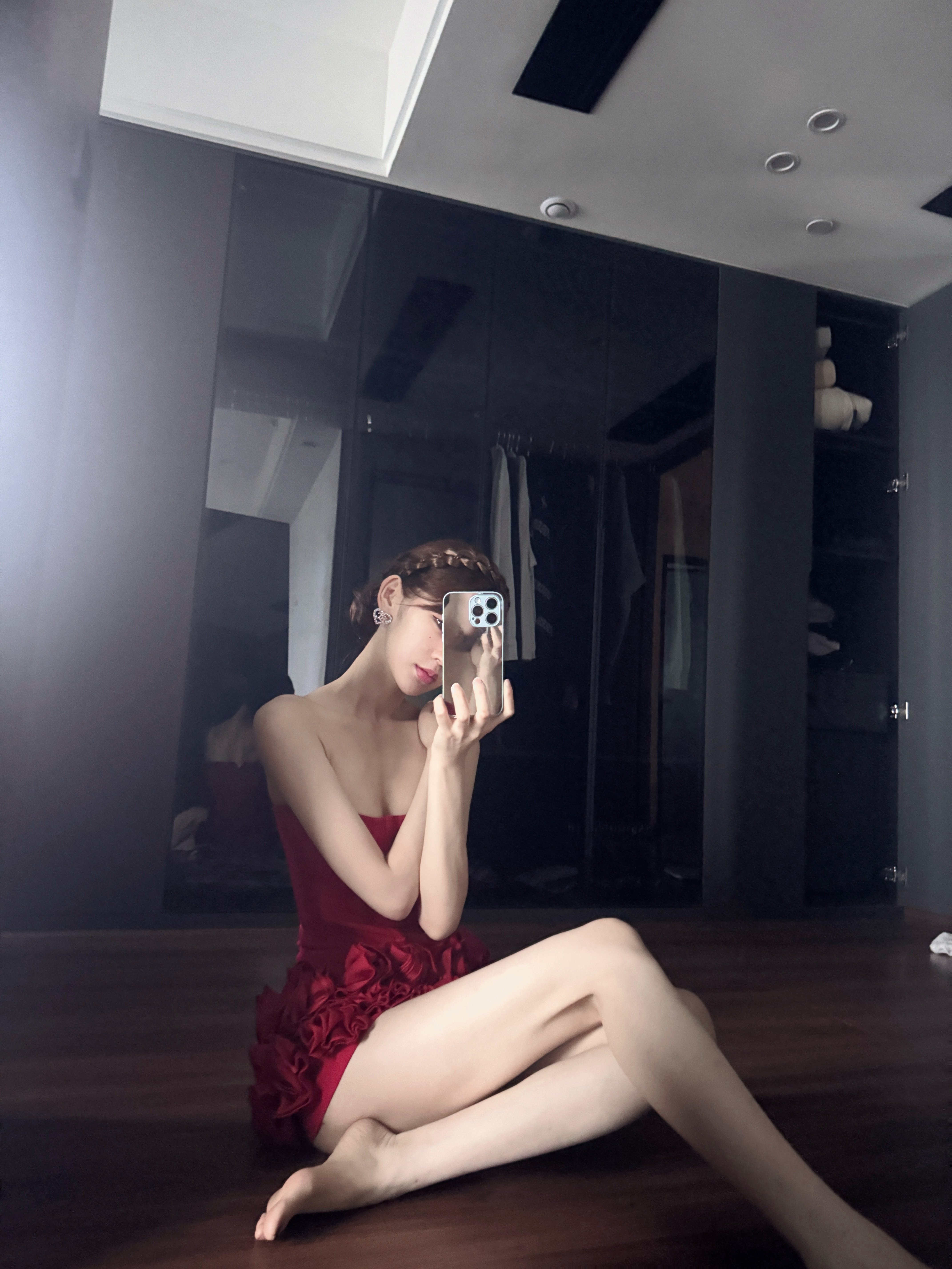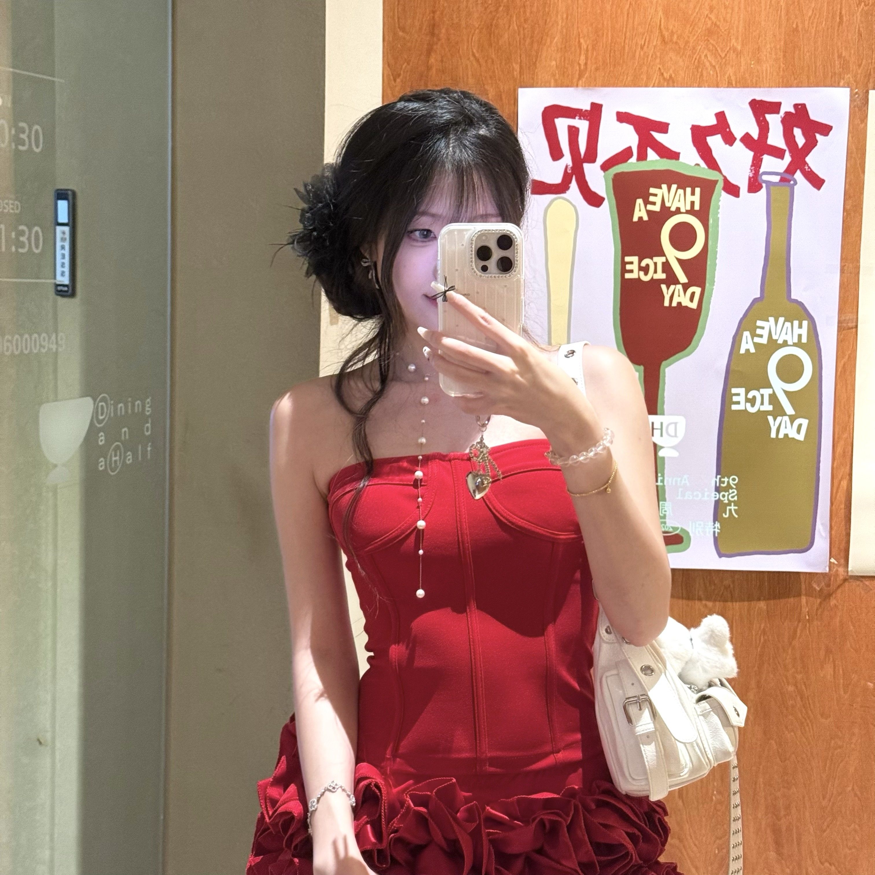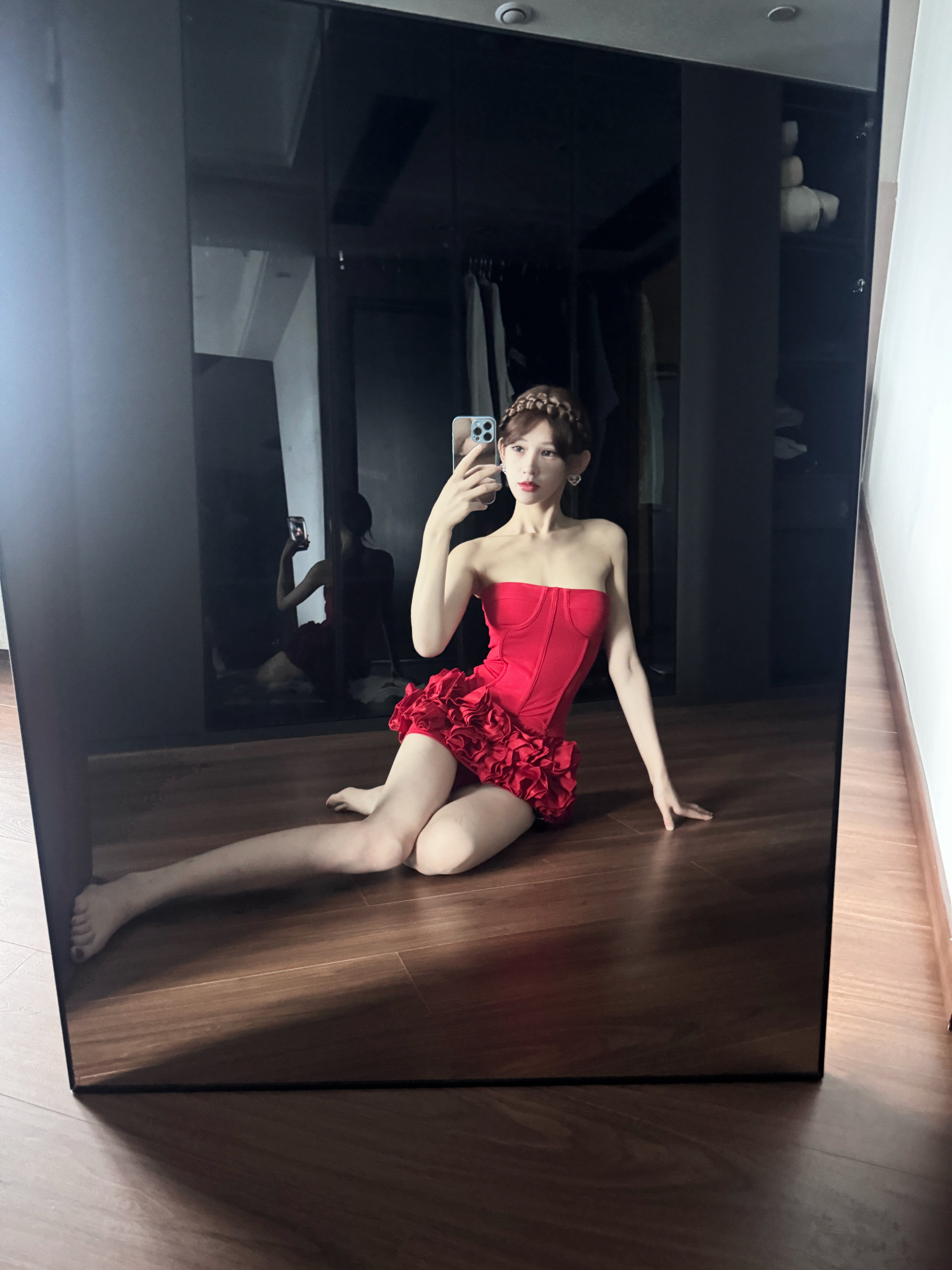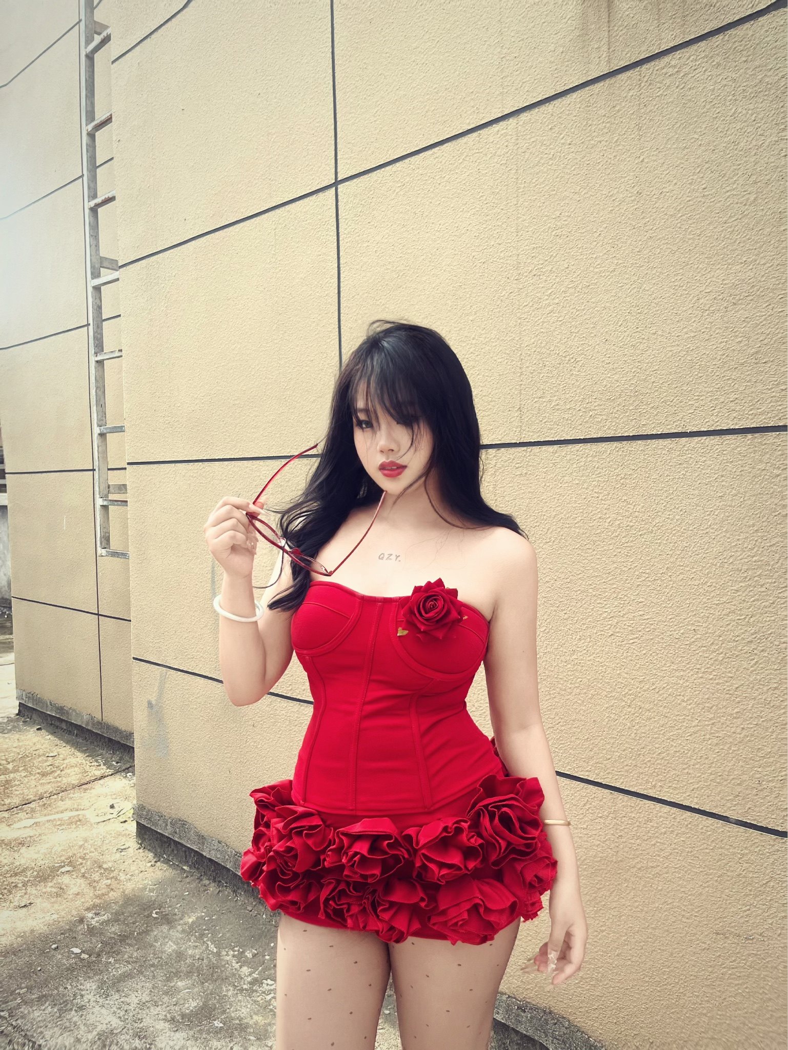 我的梦中情裙!!又纯又欲!实物颜色是很正的红色,上身直接白了一个度,整个人气色都好好,原本还担心驾驭不住这么明艳的颜色,结果穿上很意外。是个两件套来的,抹胸上衣设计把身材线条勾勒得超好看,不会往下滑的,安全感满满~腰间是有做鱼骨支撑的,显的腰特别细~裙摆的立体花朵超大,拍照很有氛围特别出片,面料也很好,摸起来柔软又有筋骨,贴身穿挺舒服的。生日聚会这套裙子都能完美hold住场面,很难不爱啊~