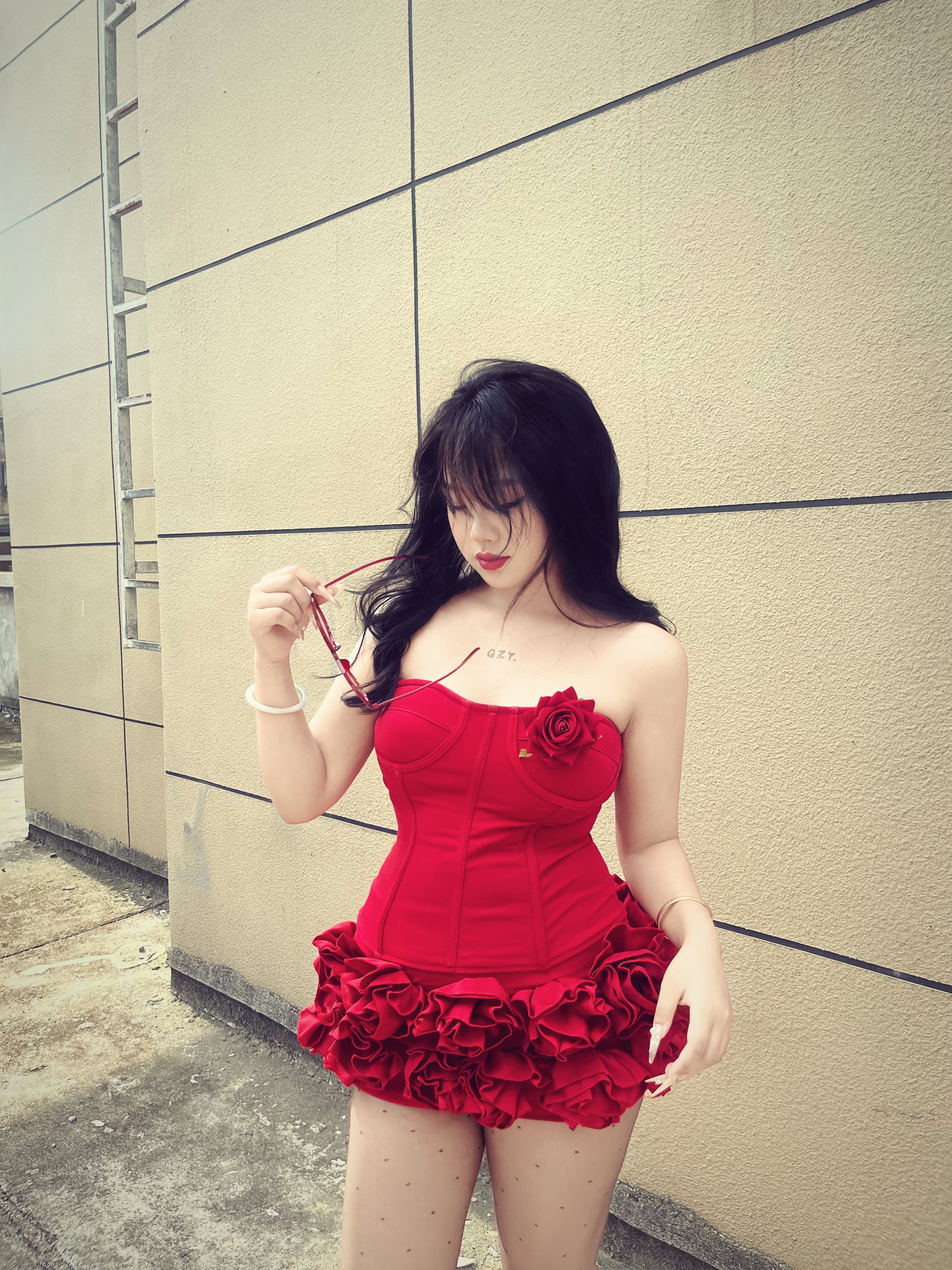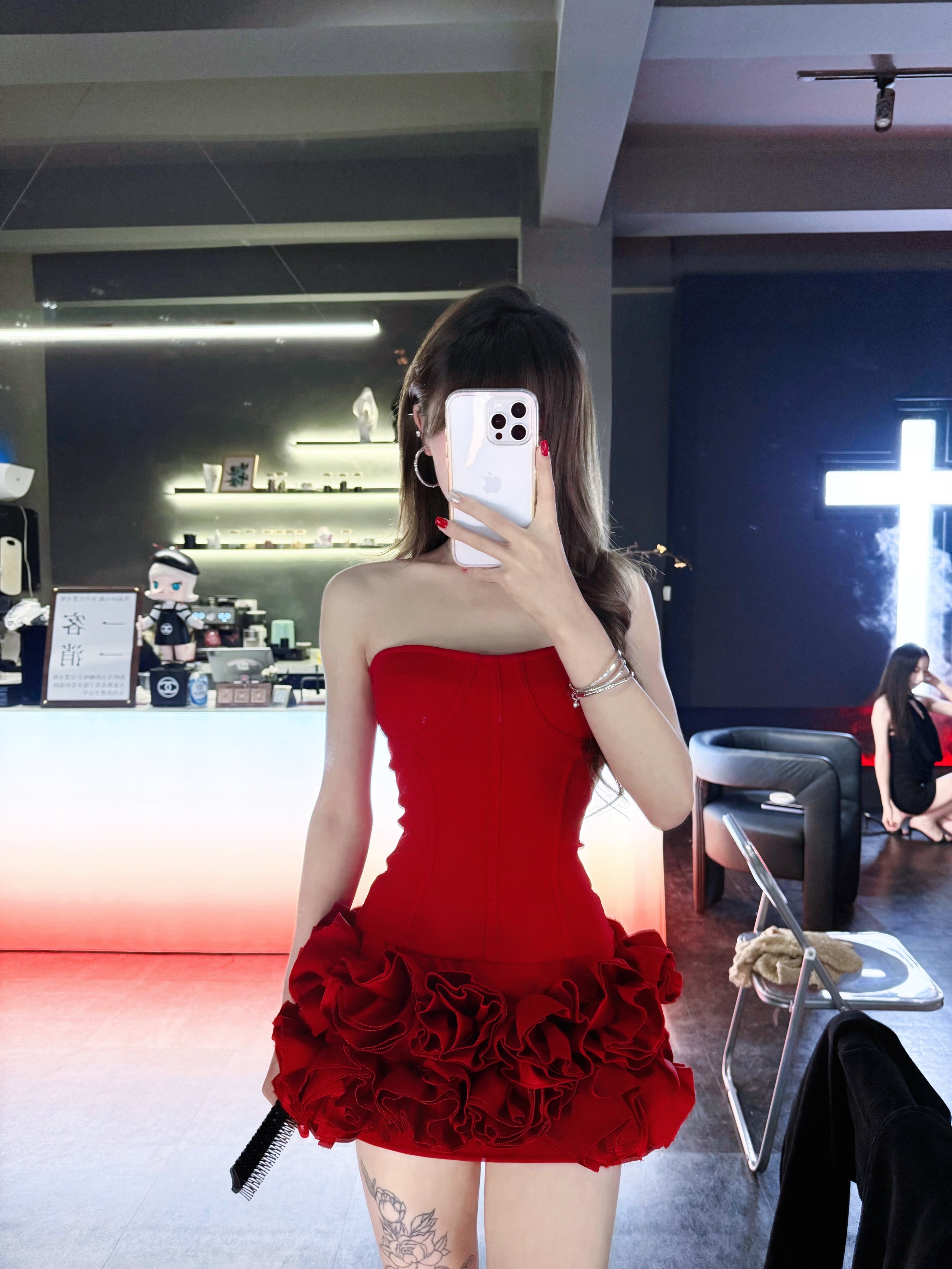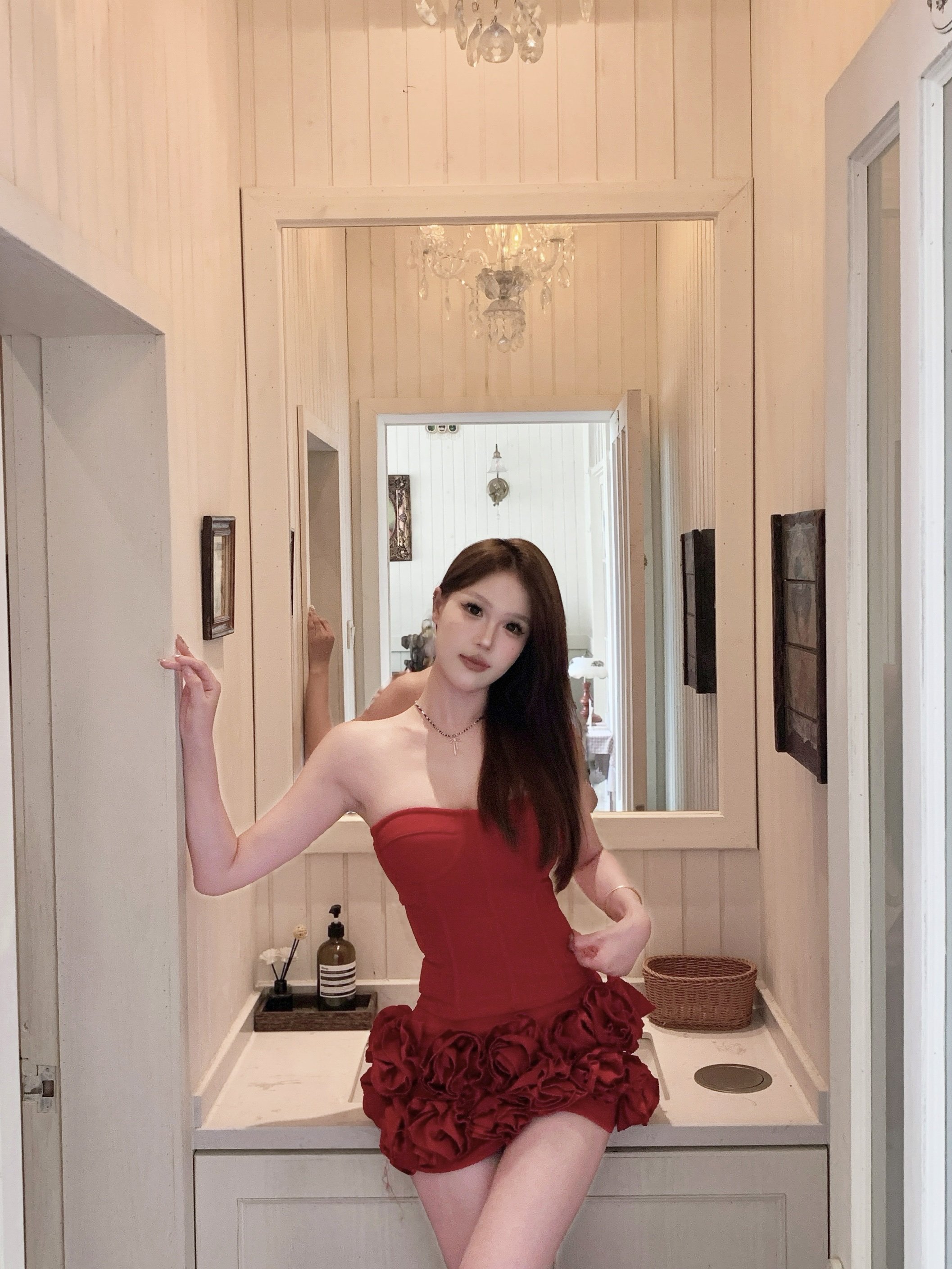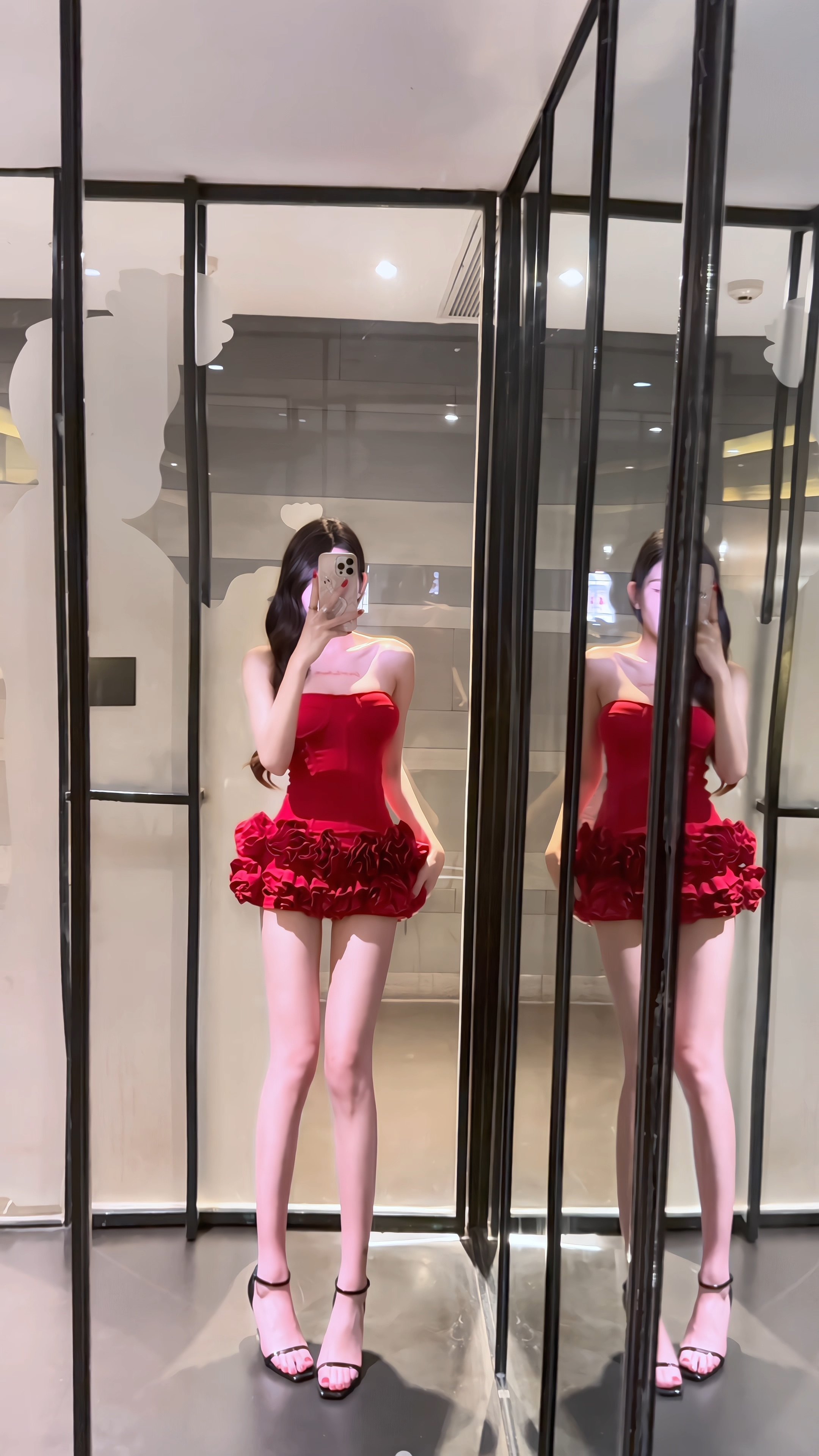 抹胸设计露出肩颈,侧边绑带增添性感,裙摆立体花朵装饰,精致又独特。对比普通红裙,它的花朵设计超吸睛,面料挺括有型,穿上秒变名媛。拍照时红裙 ,气场直接拉满,谁穿谁惊艳~