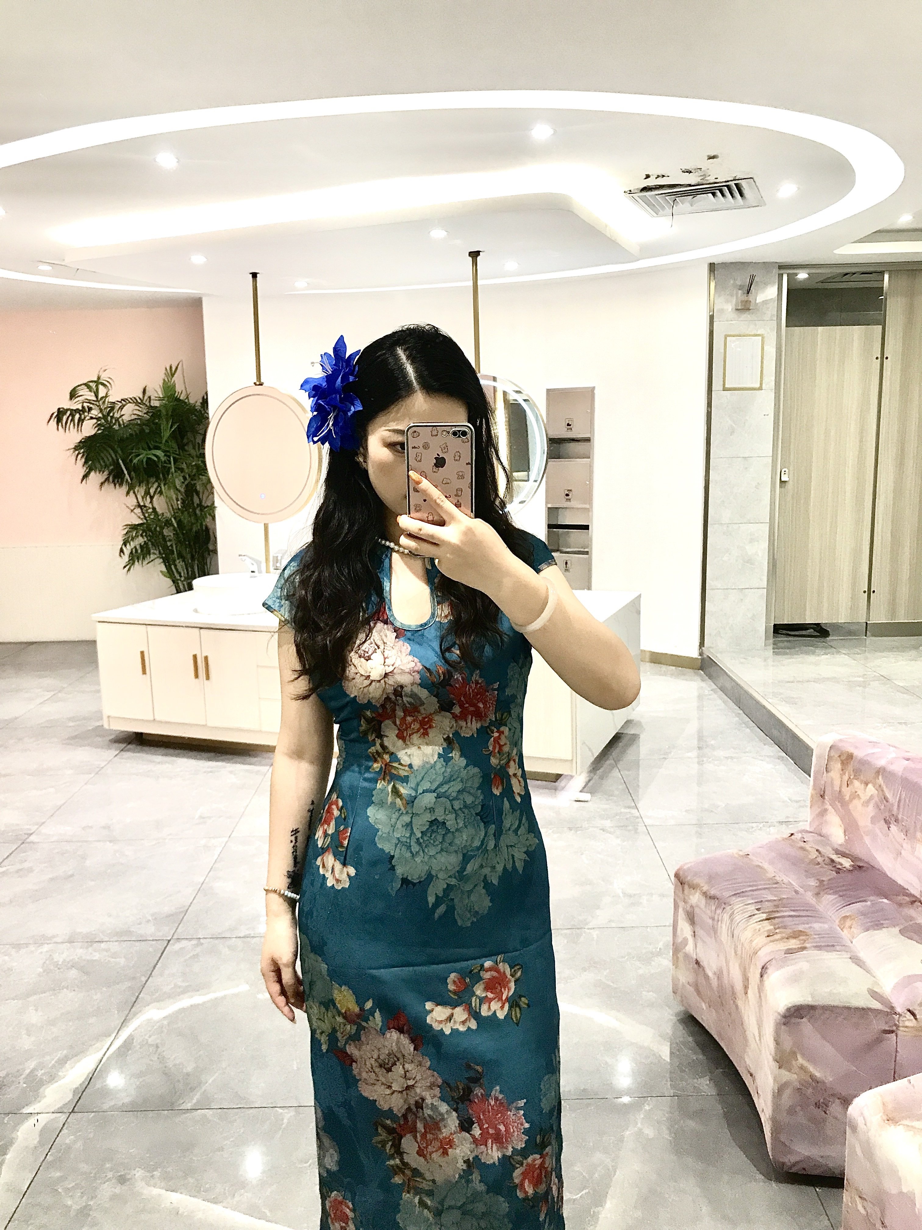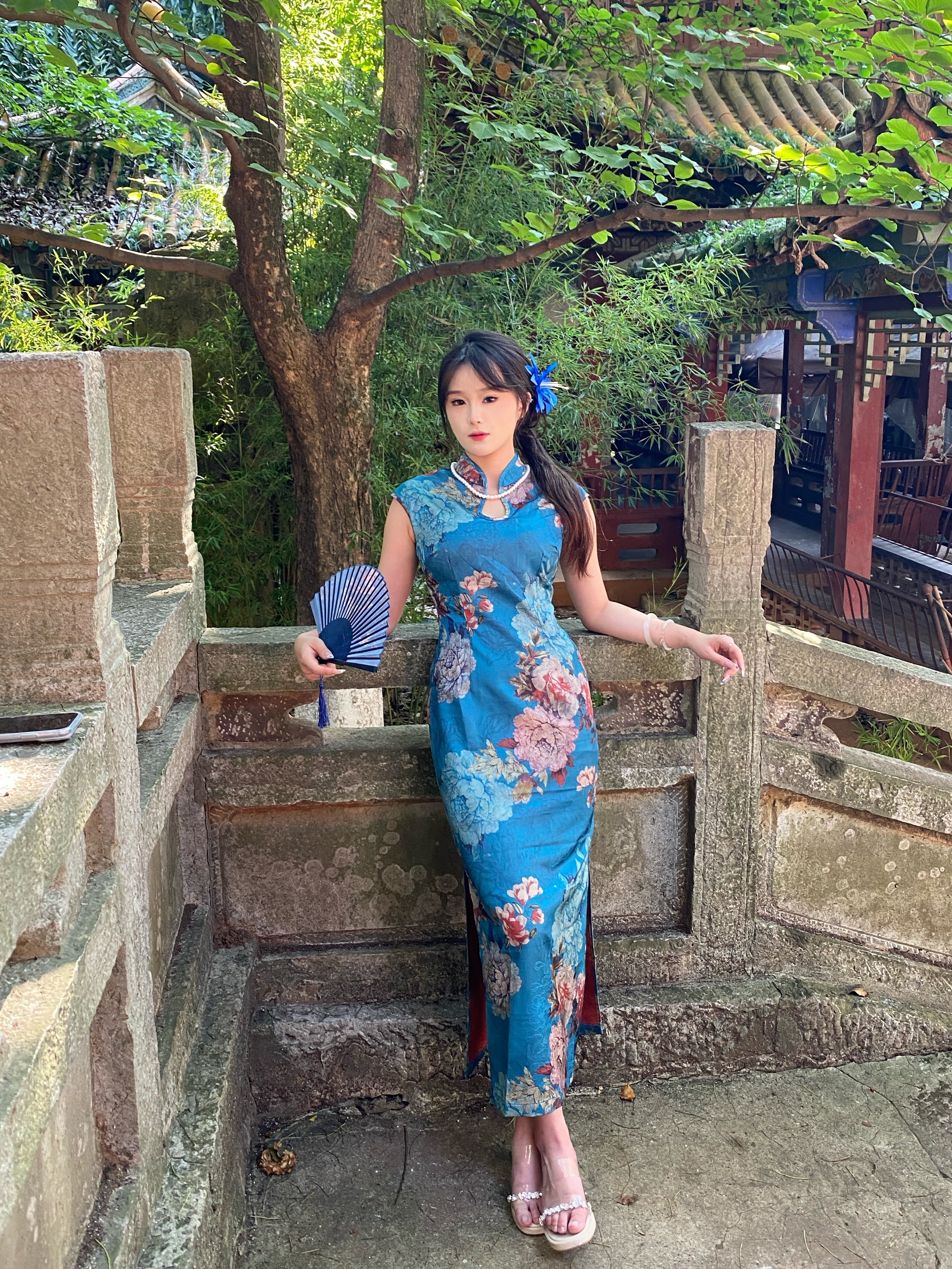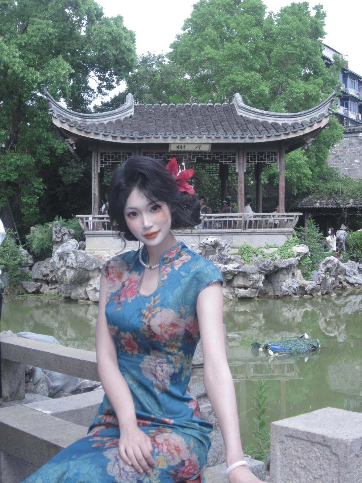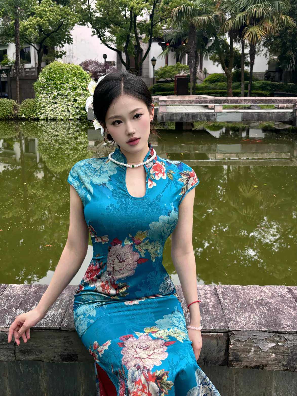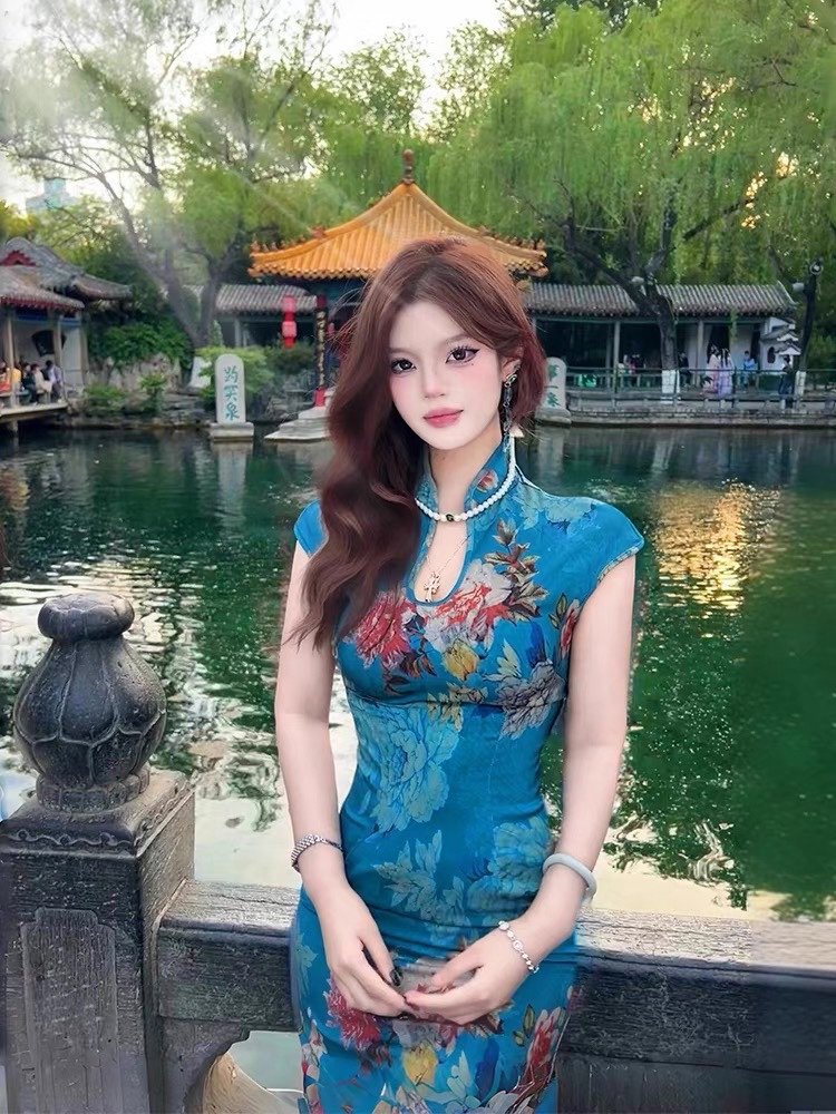 这旗袍超有韵味呀!蓝色底色衬得人很有气质,印花古典又雅致,修身款式把身材曲线勾勒得恰到好处,旗袍独特的领口和无袖设计