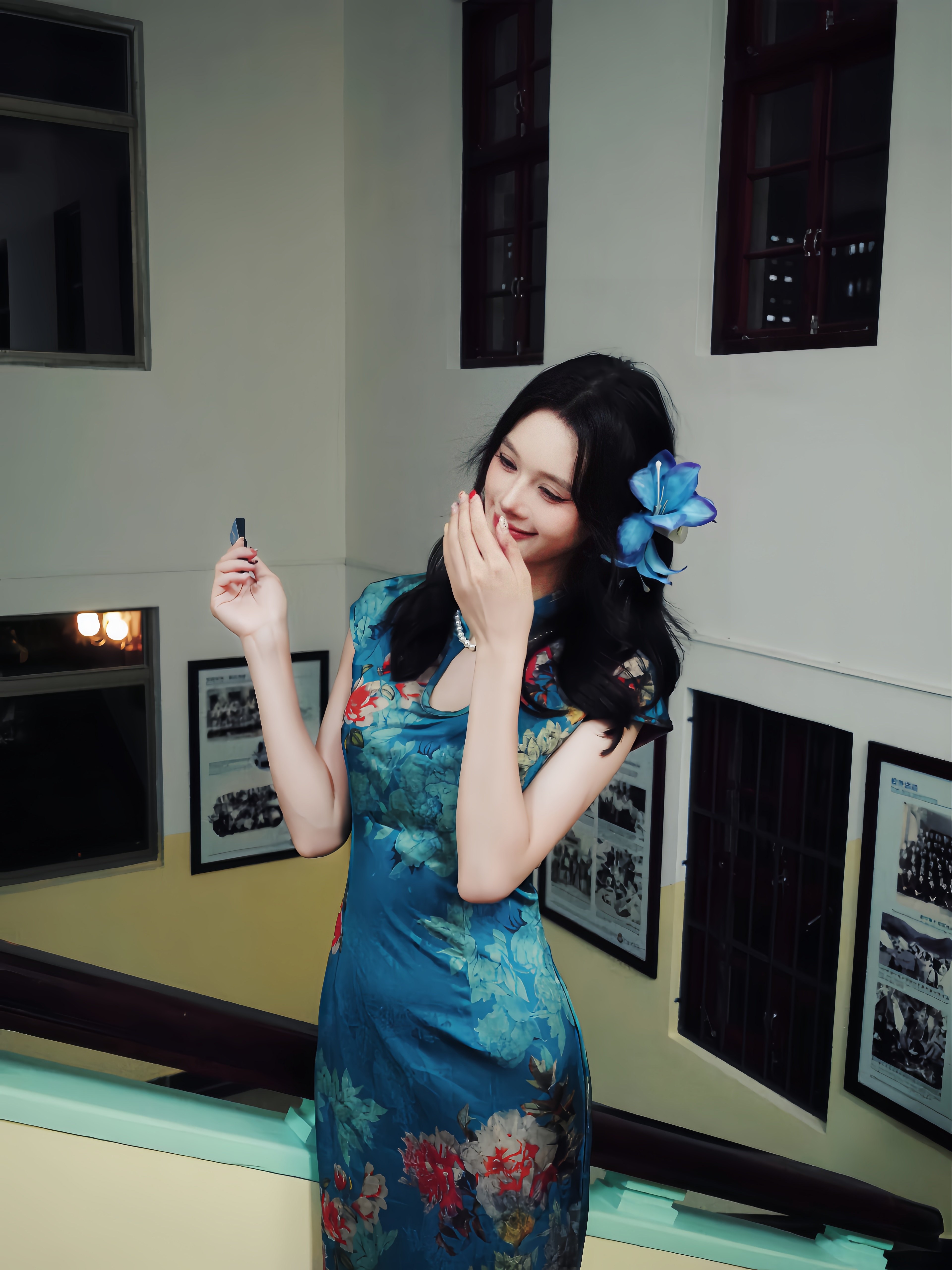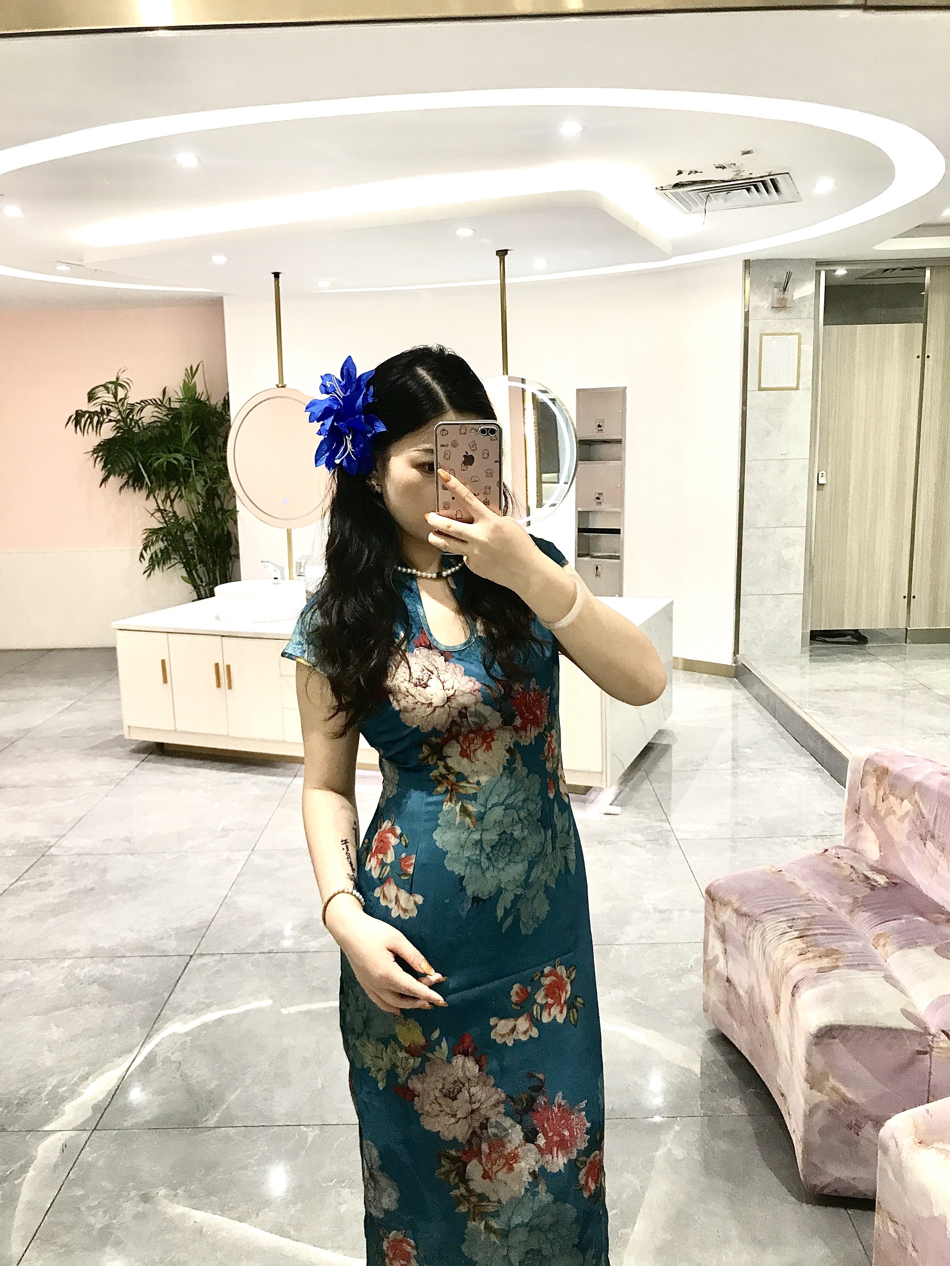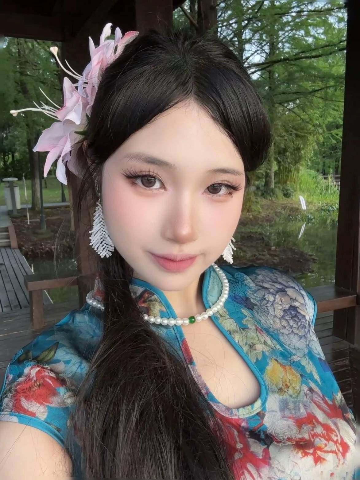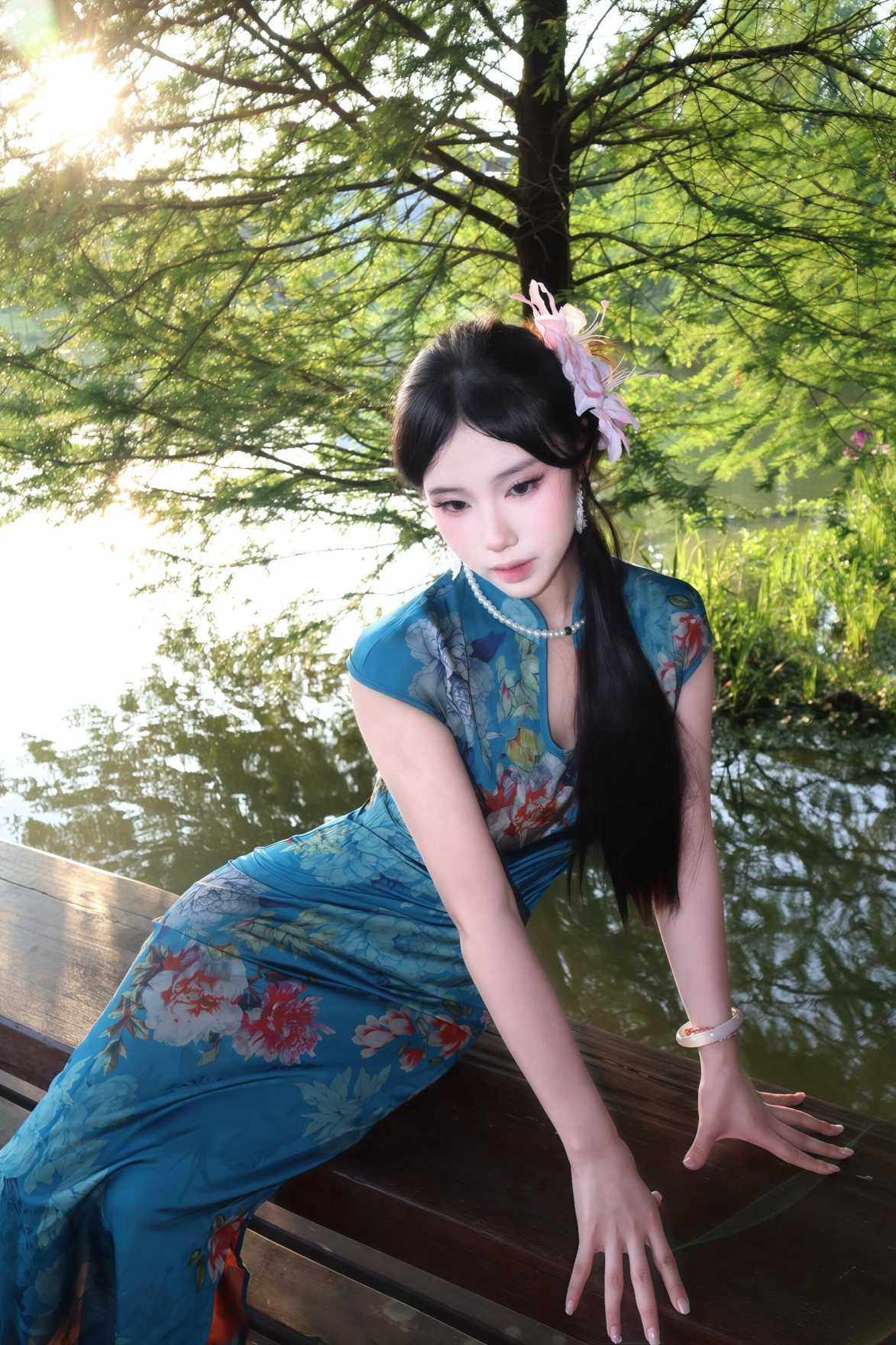 这旗袍超有韵味呀!蓝色底色衬得人很有气质,印花古典又雅致,修身款式把身材曲线勾勒得恰到好处,旗袍独特的领口和无袖设计