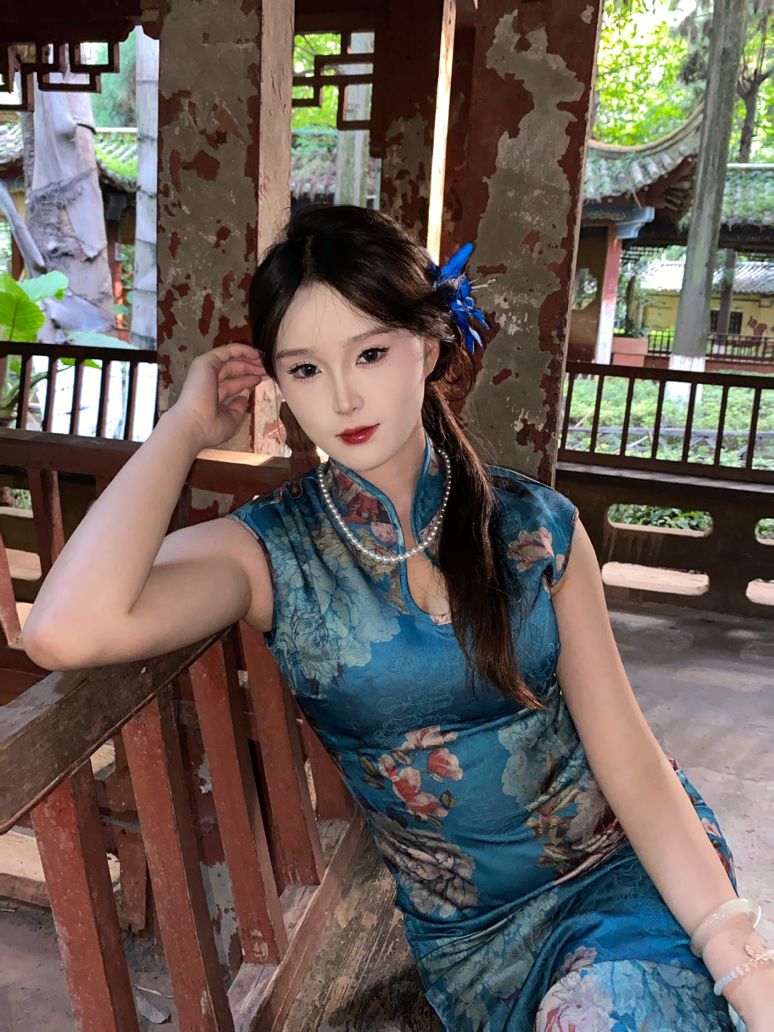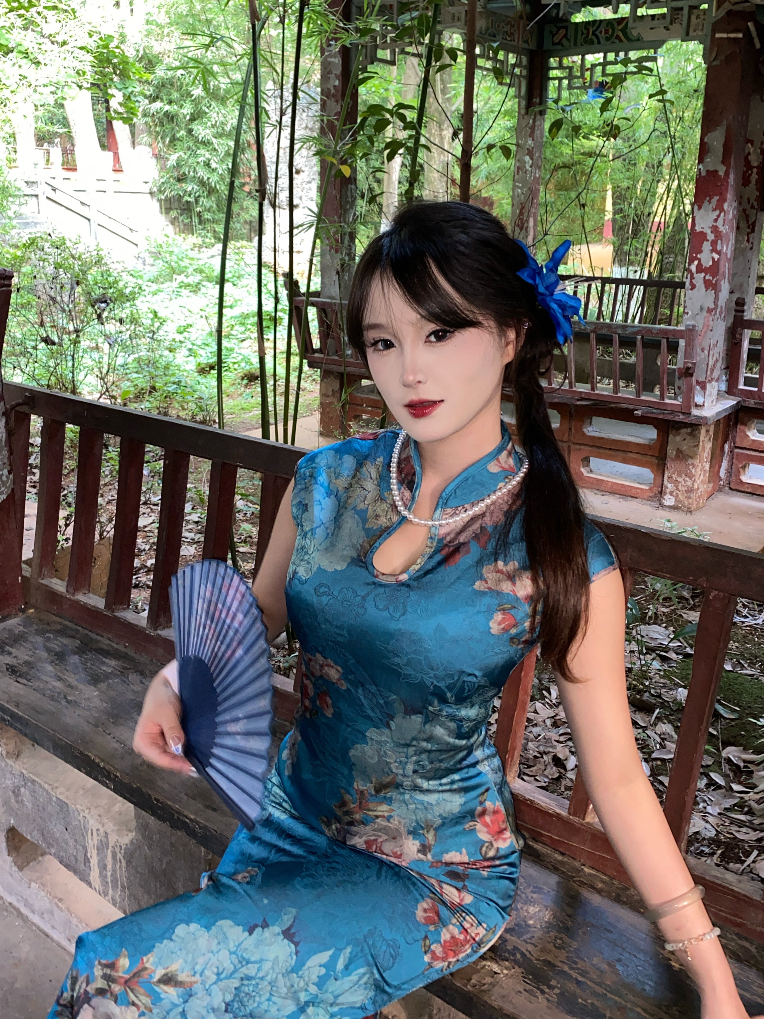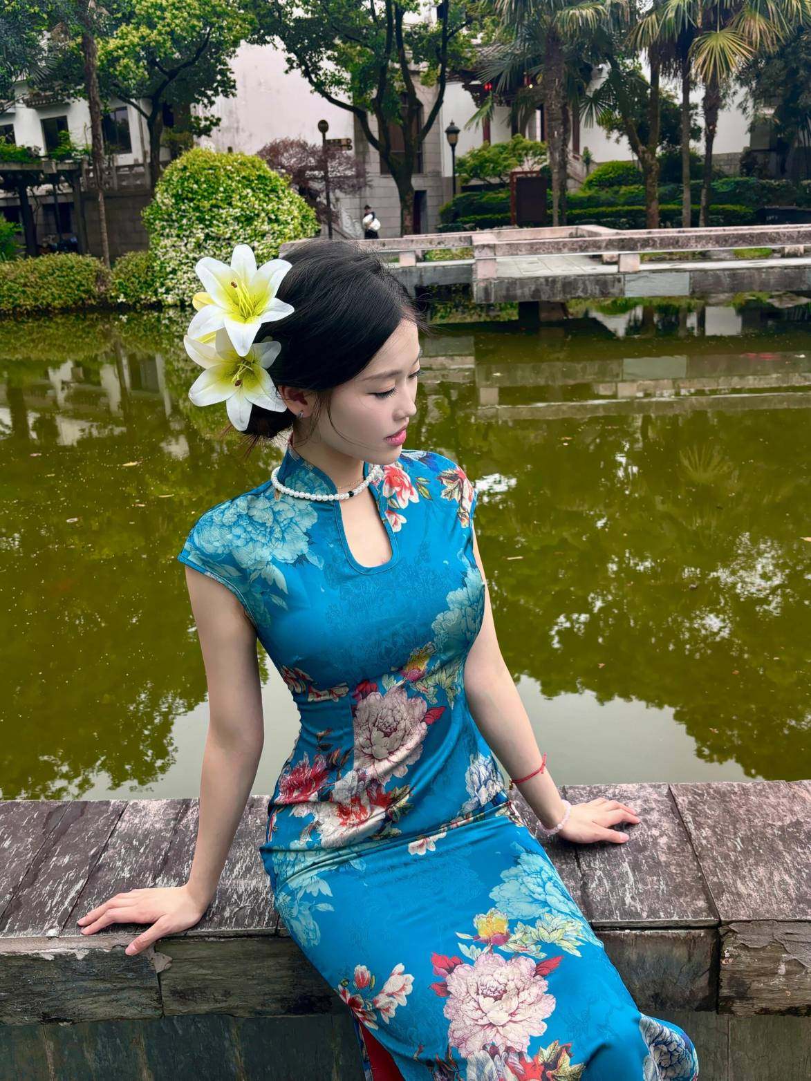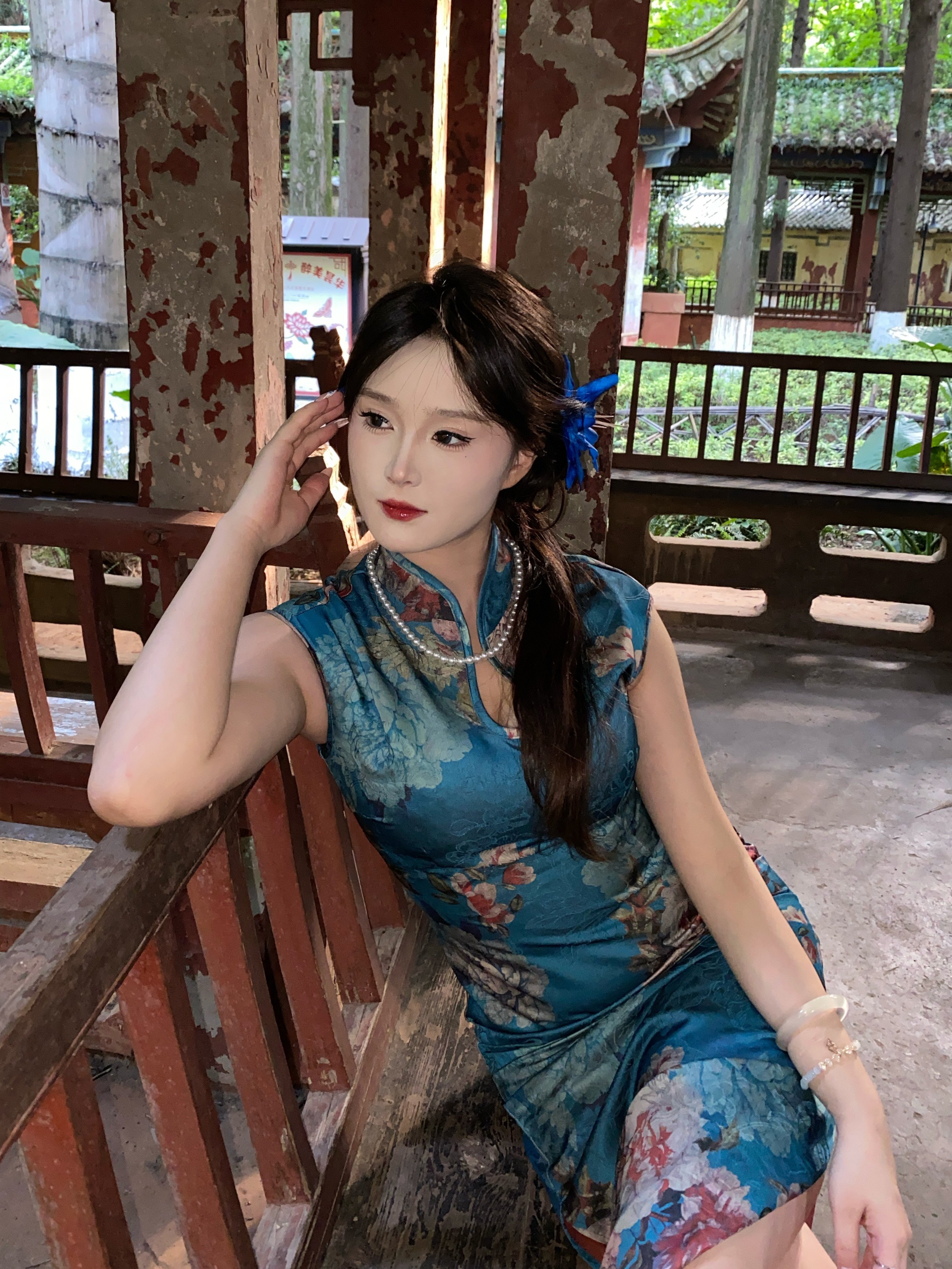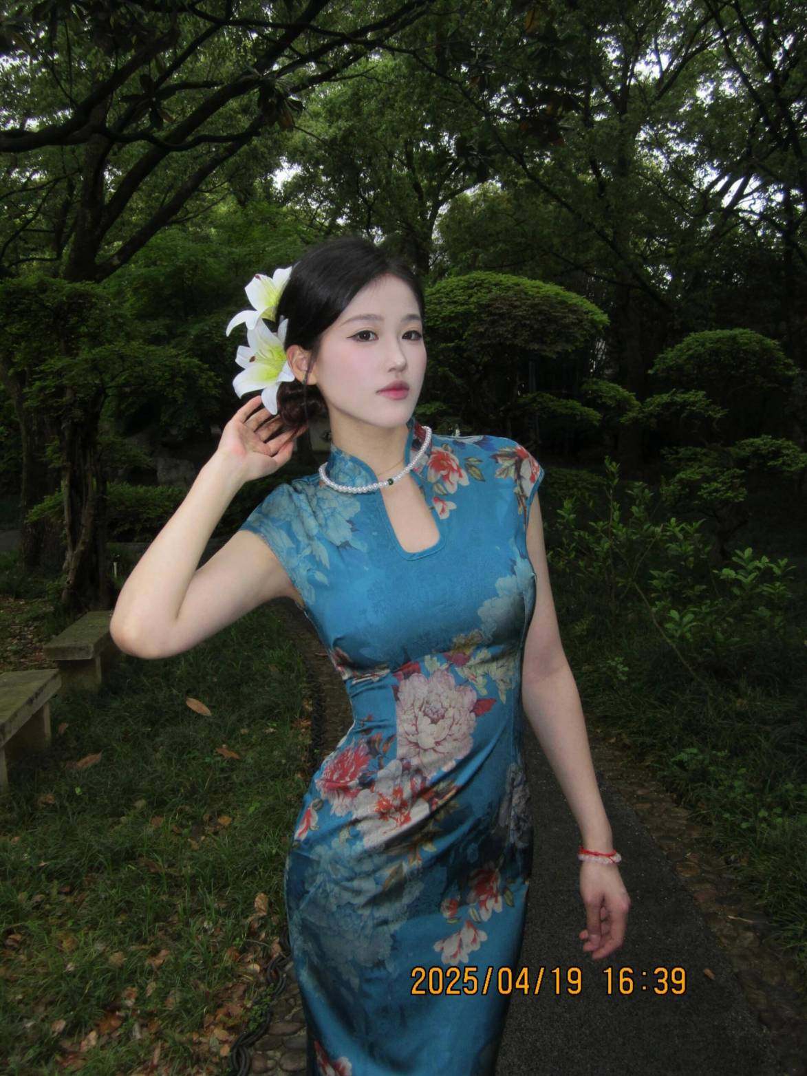 这旗袍超有韵味呀!蓝色底色衬得人很有气质,印花古典又雅致,修身款式把身材曲线勾勒得恰到好处,旗袍独特的领口和无袖设计