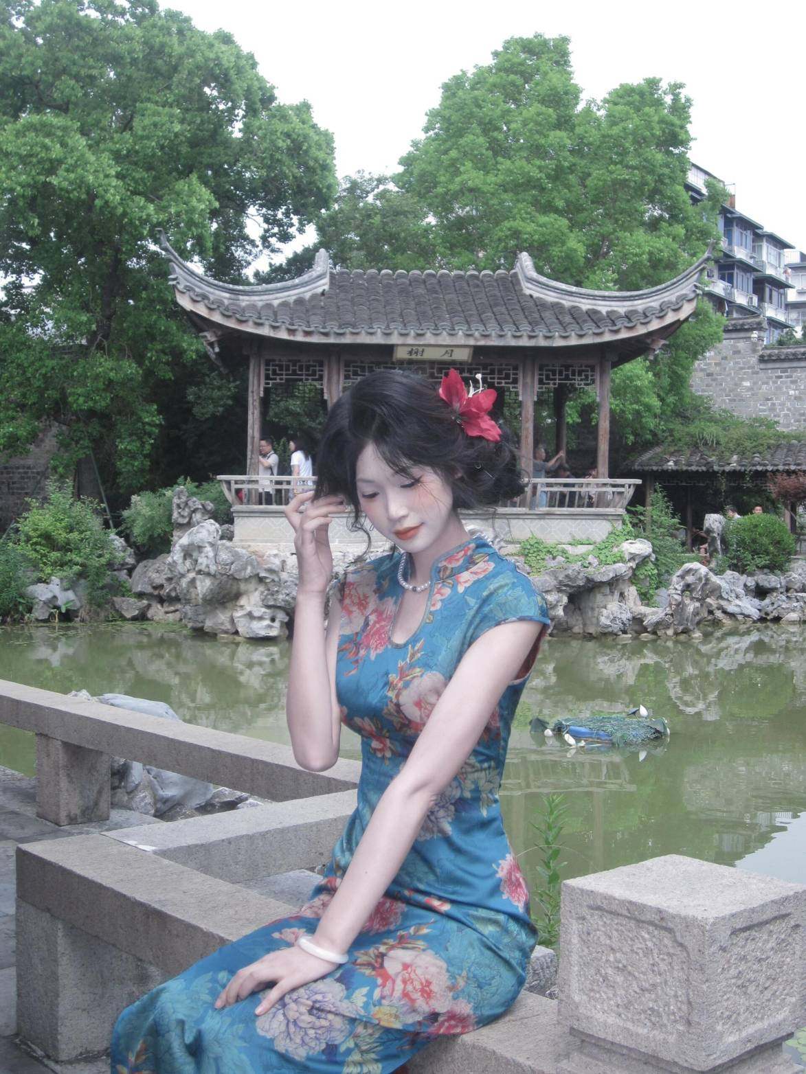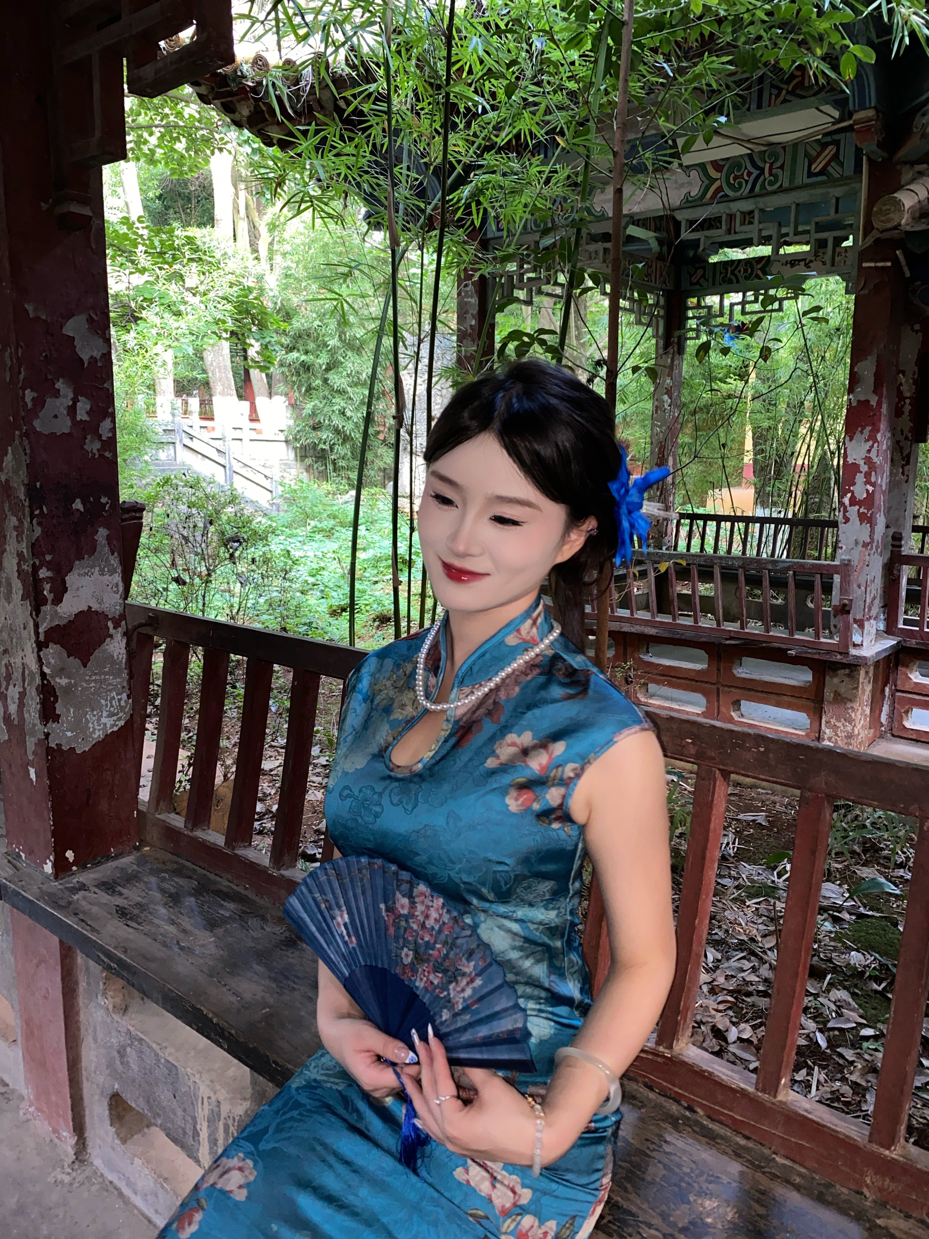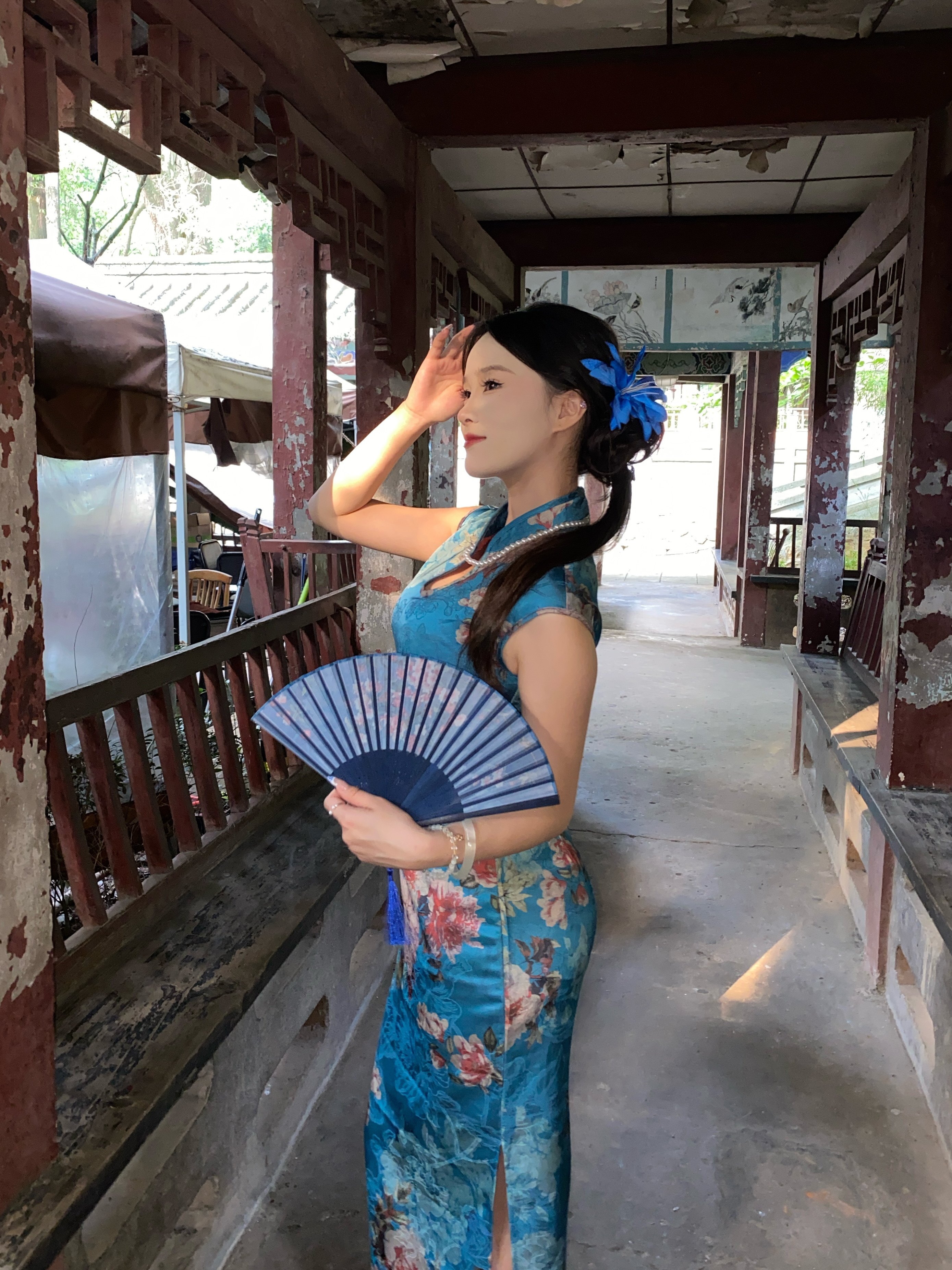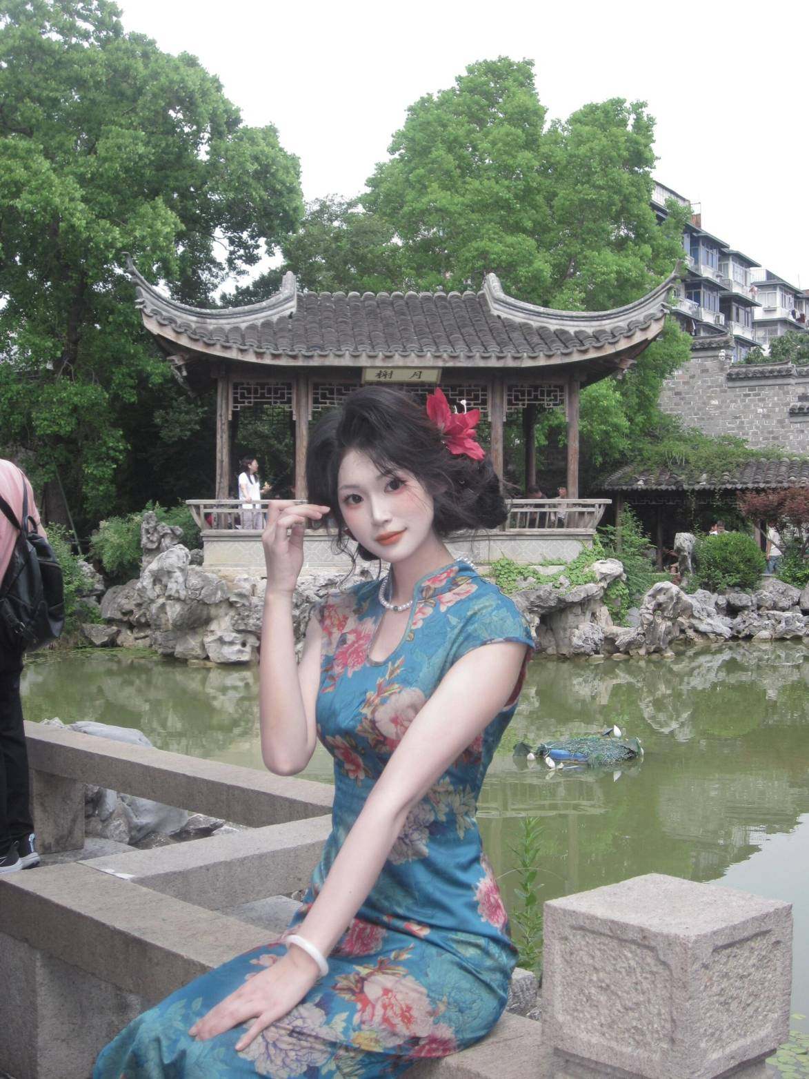 这旗袍超有韵味呀!蓝色底色衬得人很有气质,印花古典又雅致,修身款式把身材曲线勾勒得恰到好处,旗袍独特的领口和无袖设计