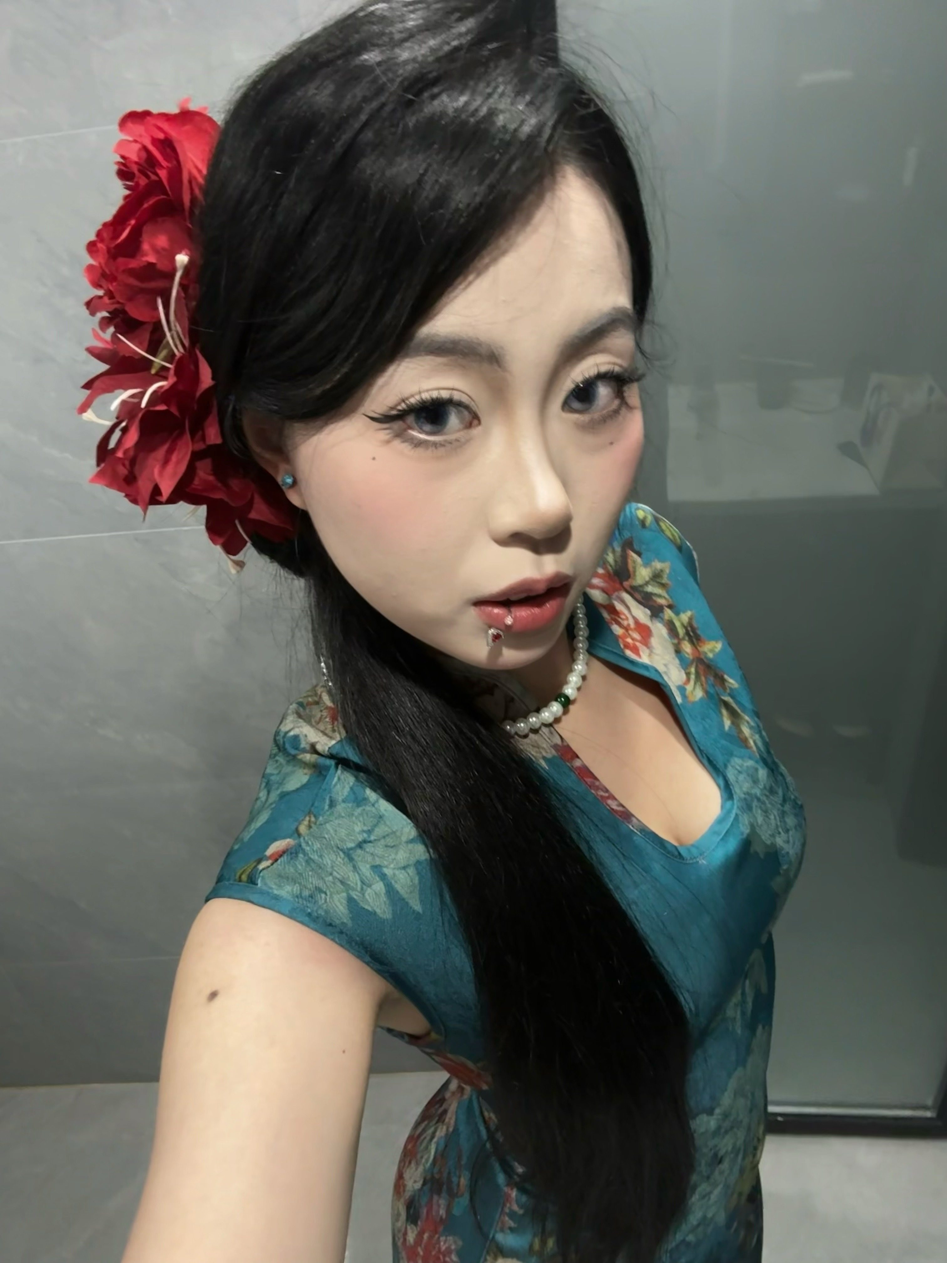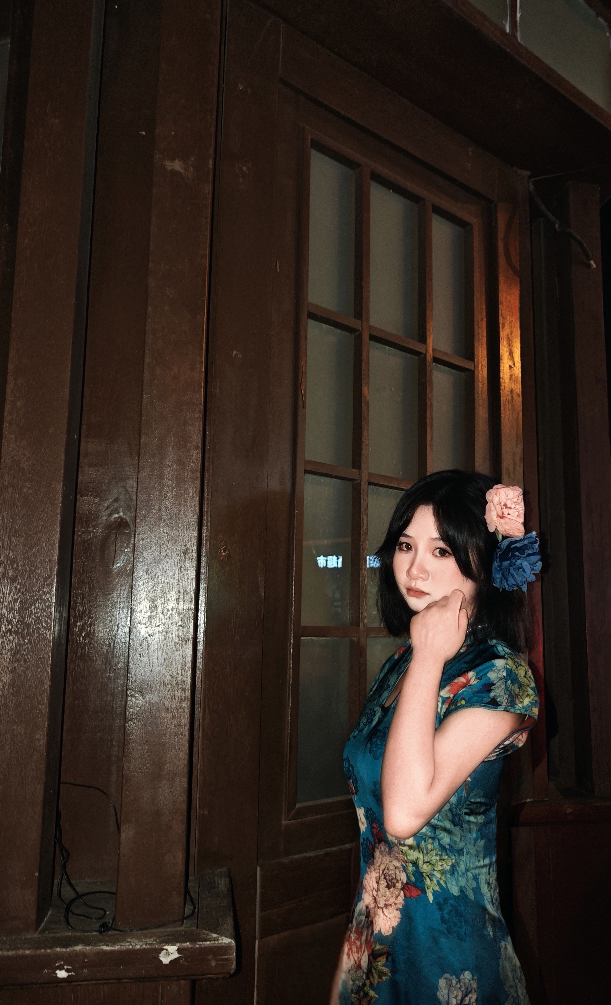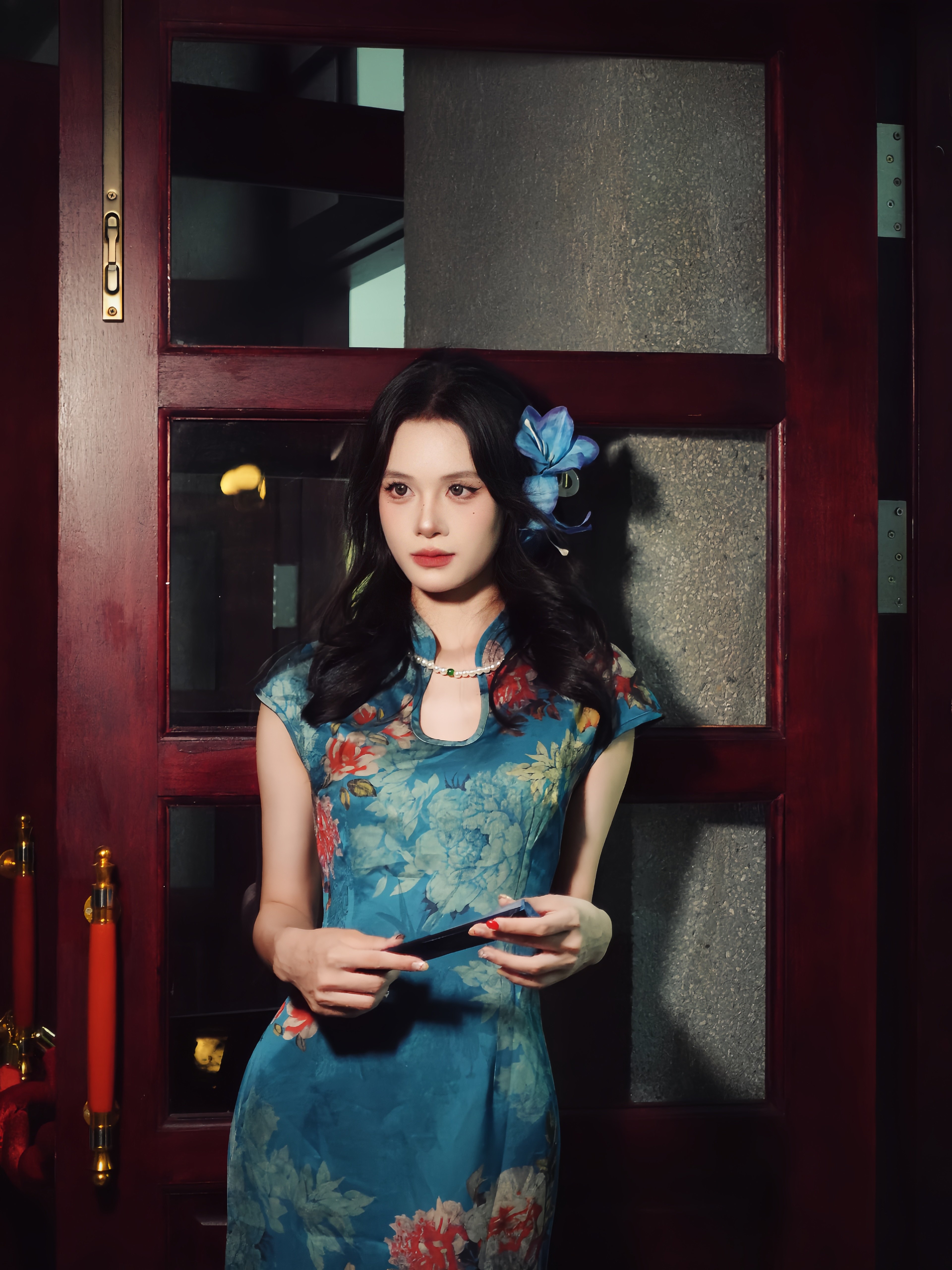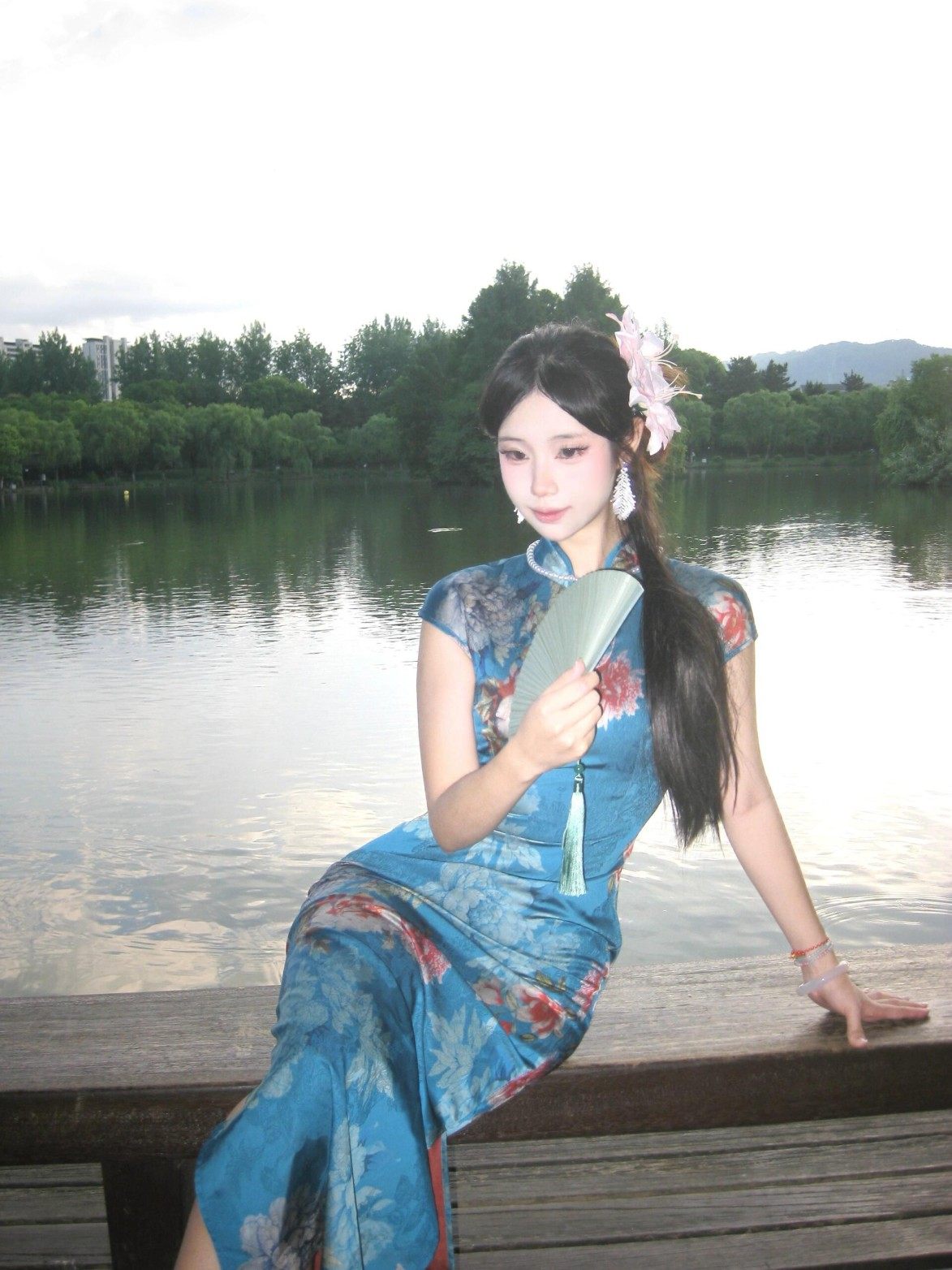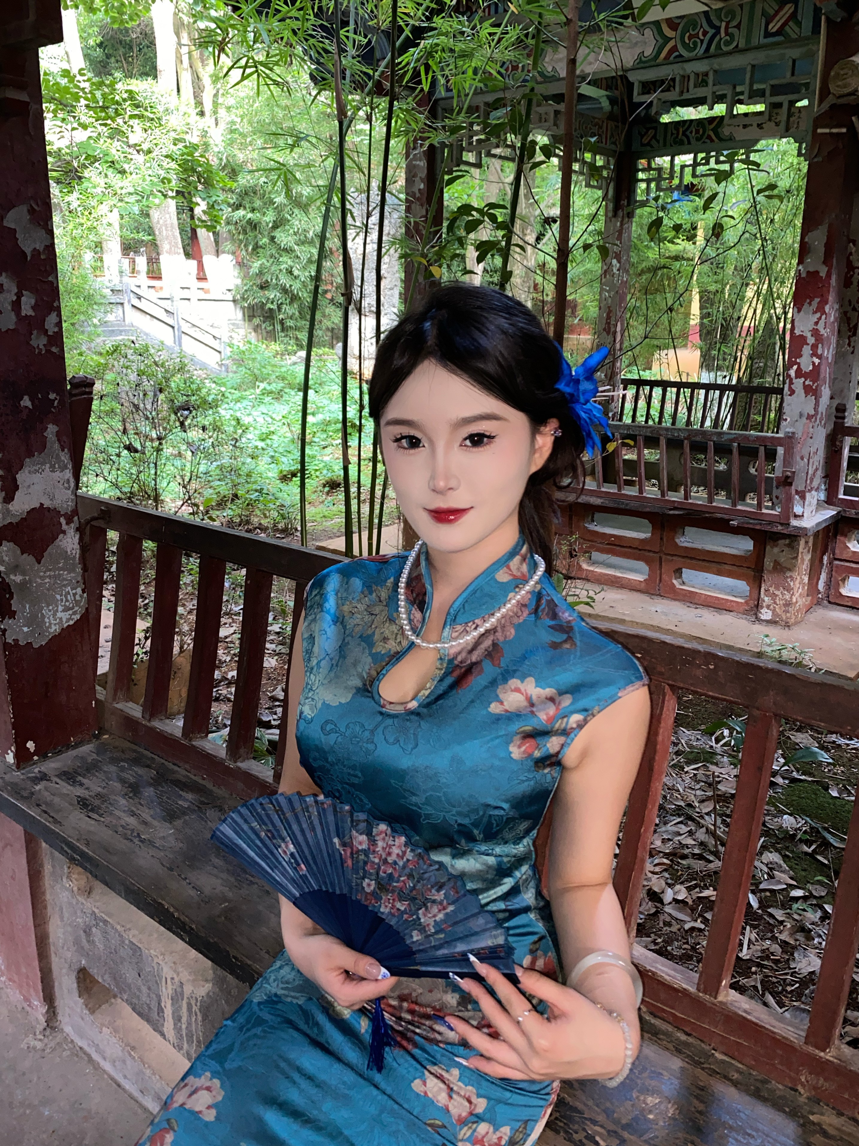 这旗袍超有韵味呀!蓝色底色衬得人很有气质,印花古典又雅致,修身款式把身材曲线勾勒得恰到好处,旗袍独特的领口和无袖设计