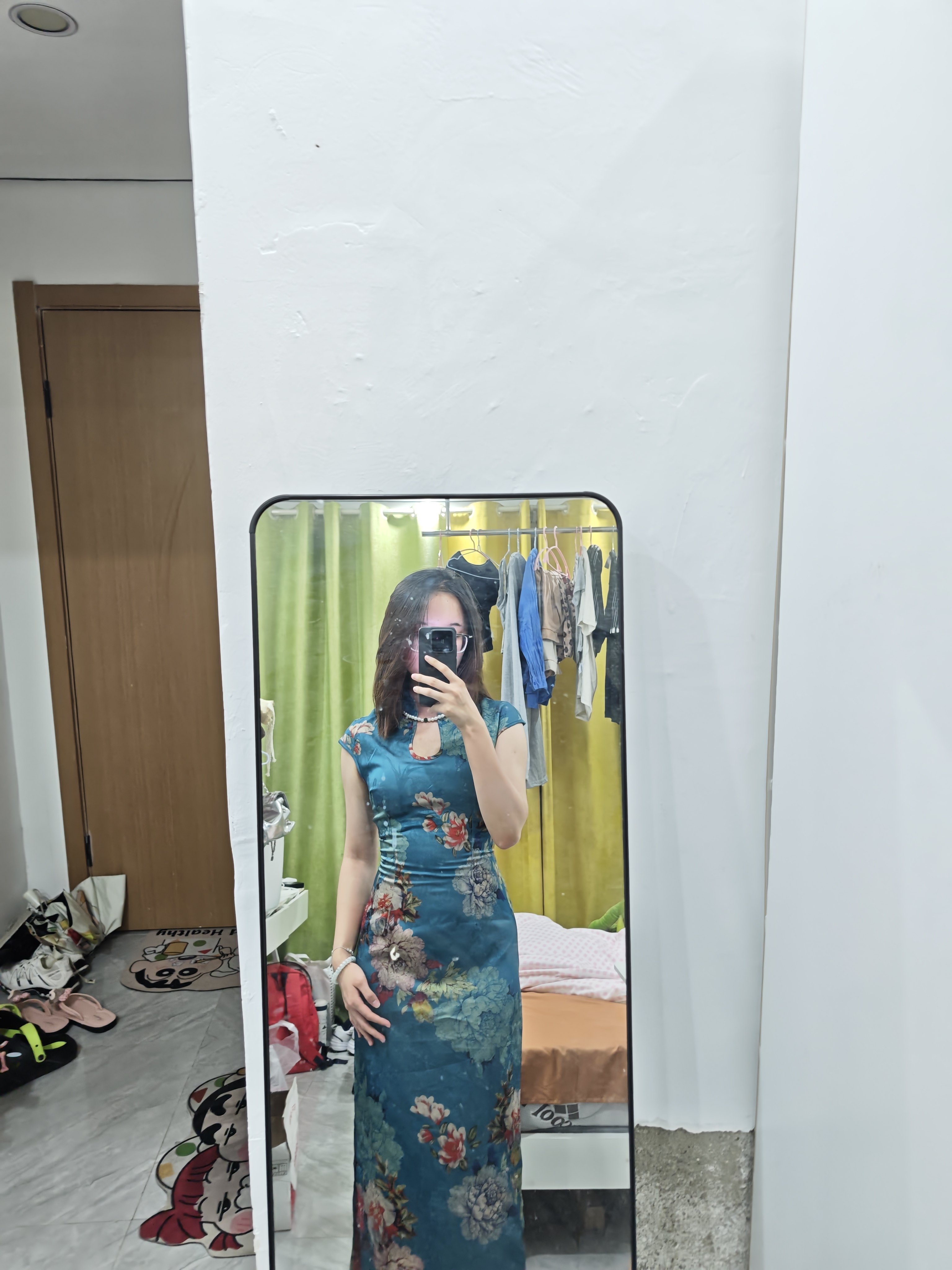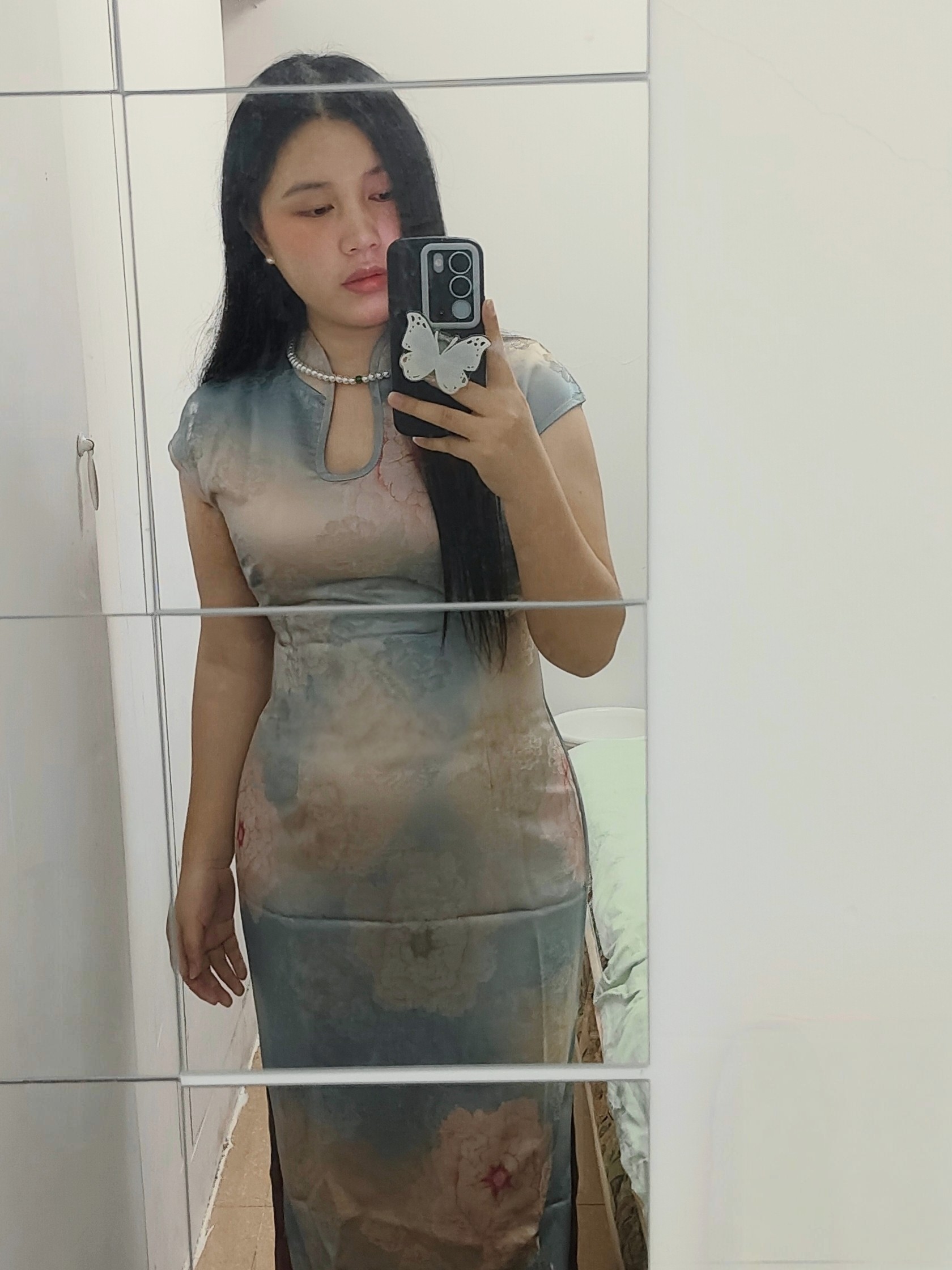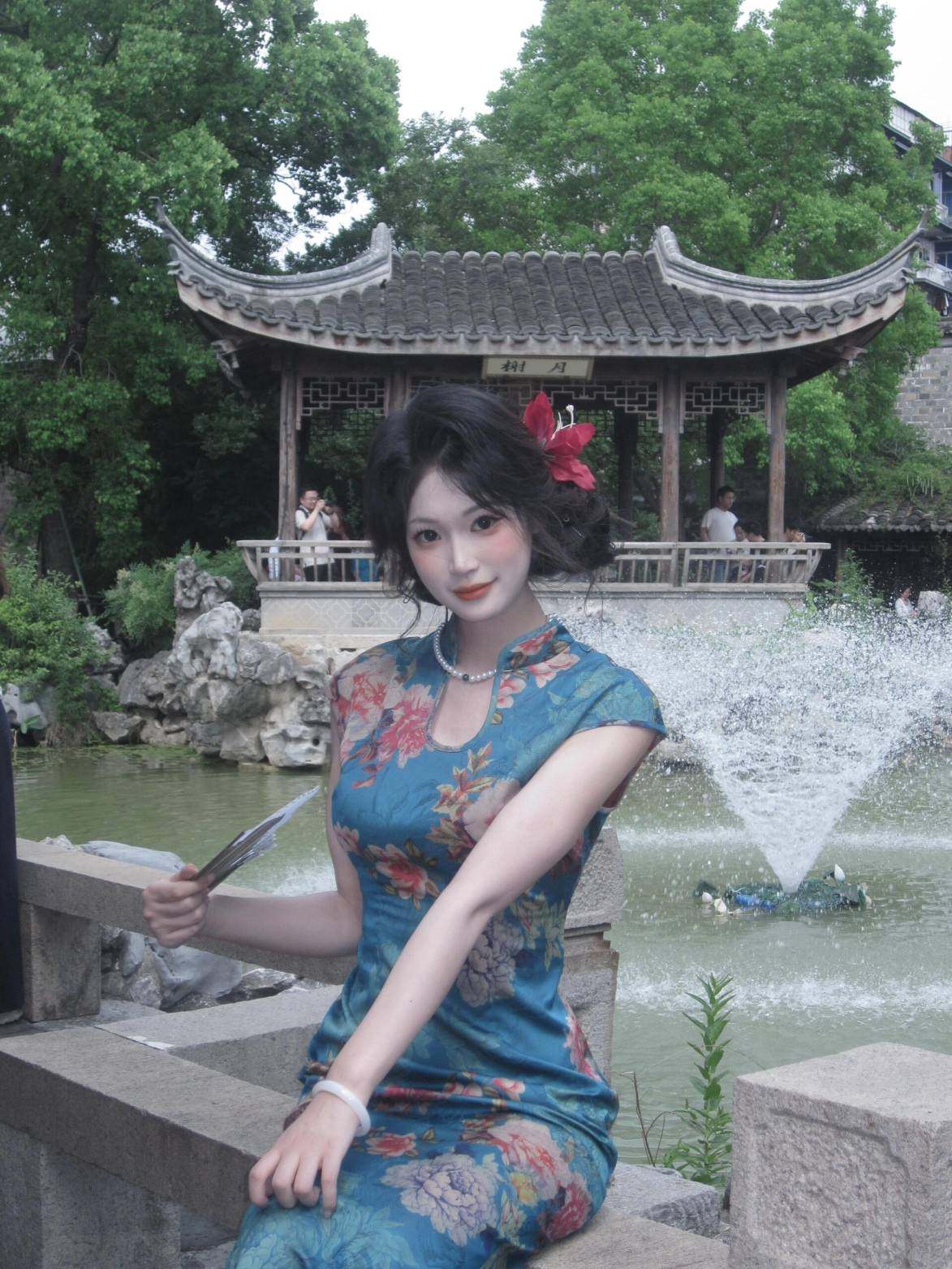 这件旗袍面料质感超绝!丝滑柔顺,亲肤又透气,我身高160/92斤,穿上S码刚刚,但还是一些余量的,一点也不紧绷,颜色也超显白,拍照老出片了!