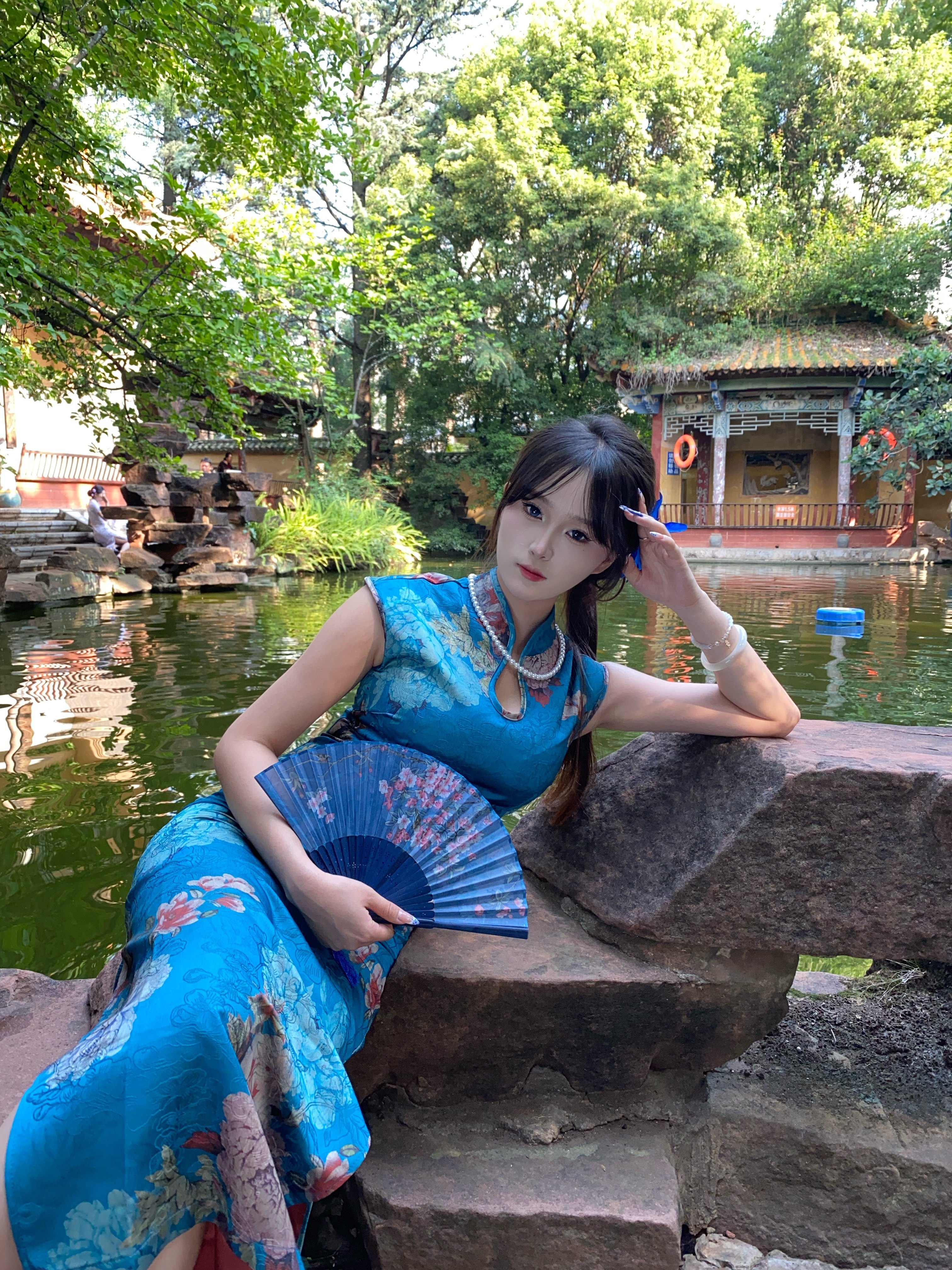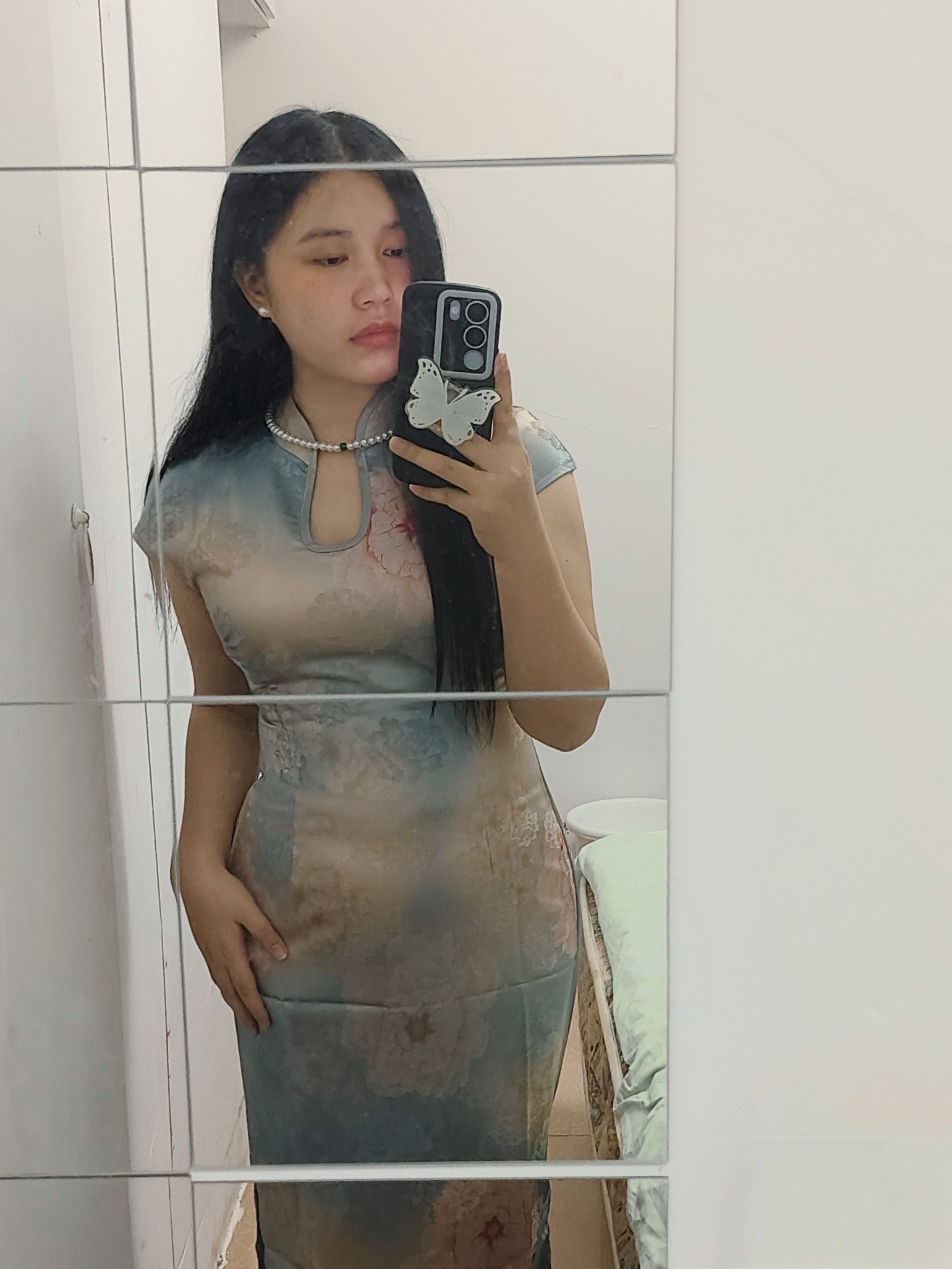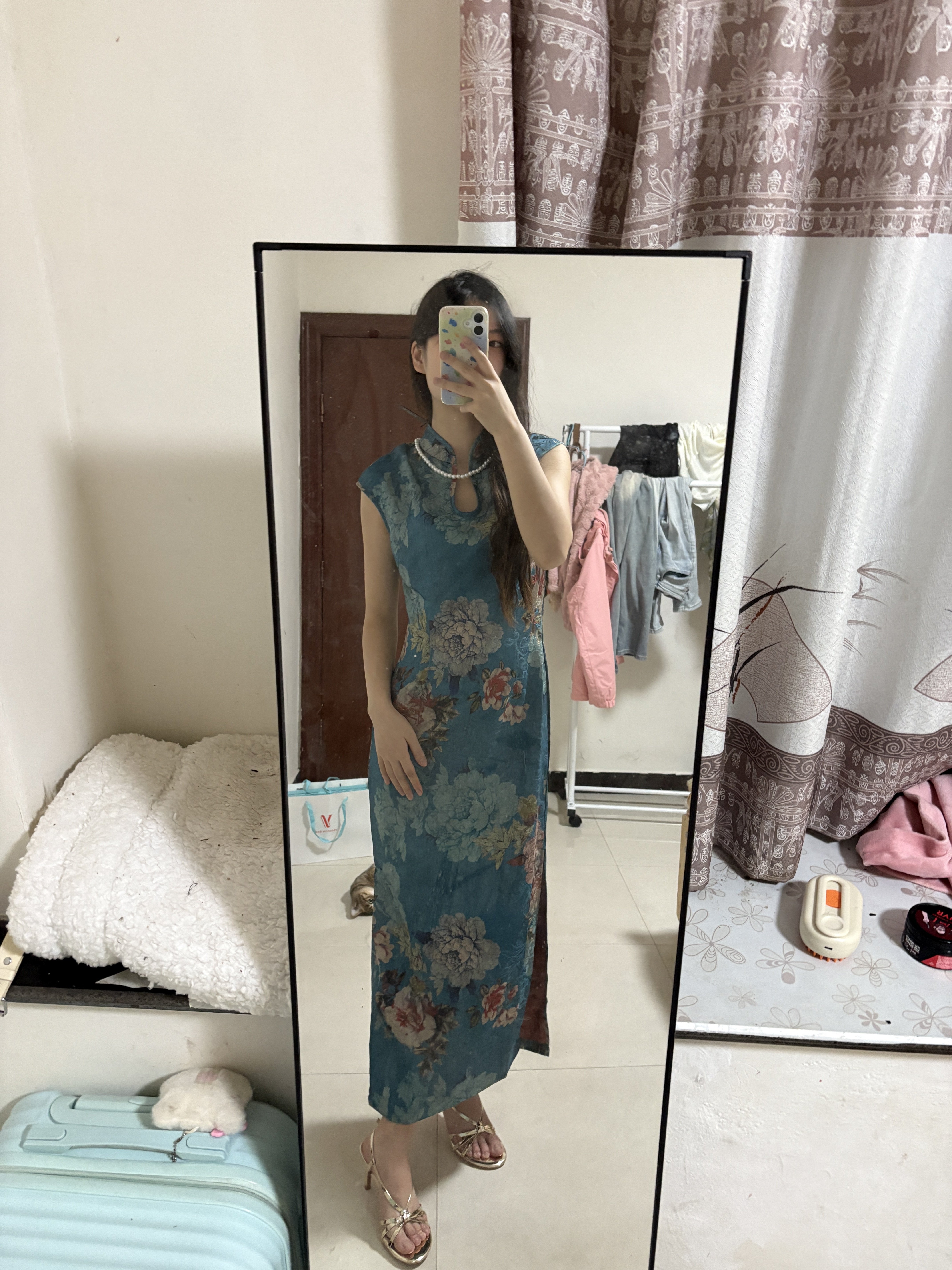 这件旗袍面料质感超绝!丝滑柔顺,亲肤又透气,我身高160/92斤,穿上S码刚刚,但还是一些余量的,一点也不紧绷,颜色也超显白,拍照老出片了!