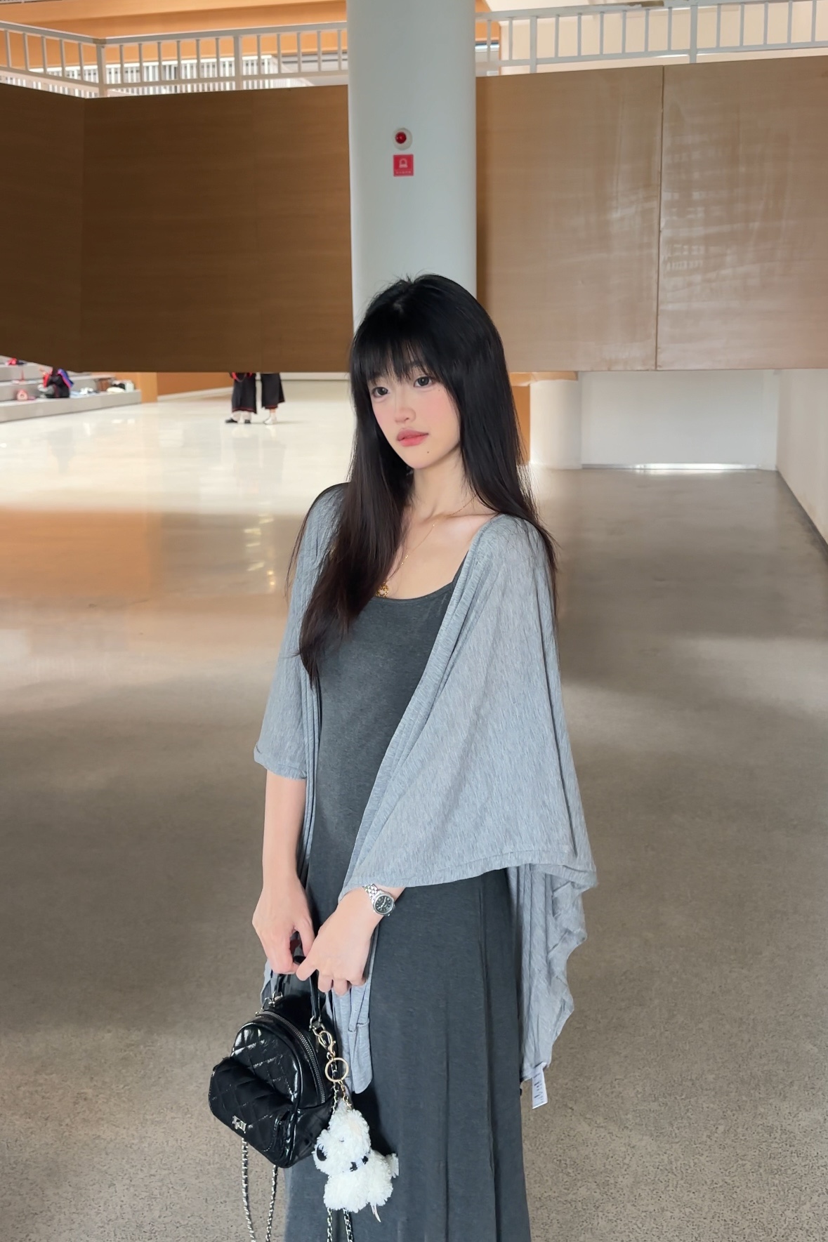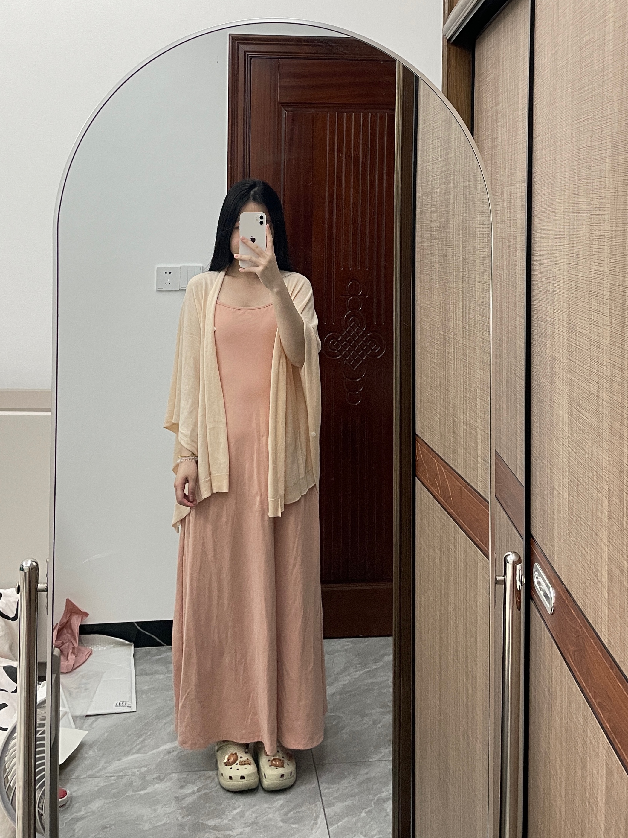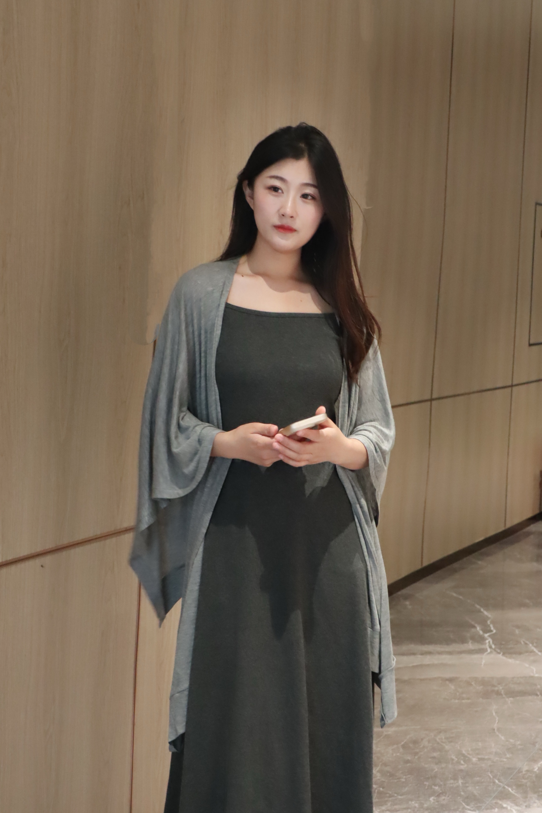 裙子非常喜欢,穿上很舒服,也不会很热,也不透,对于155的我来说可能还是微微有点长,如果能再短个5厘米就好啦,披肩是我自己搭的,店家的披肩有点太长啦,我感觉他家160穿可能很好看,对于我们小小个子希望再友好一些,嘻嘻