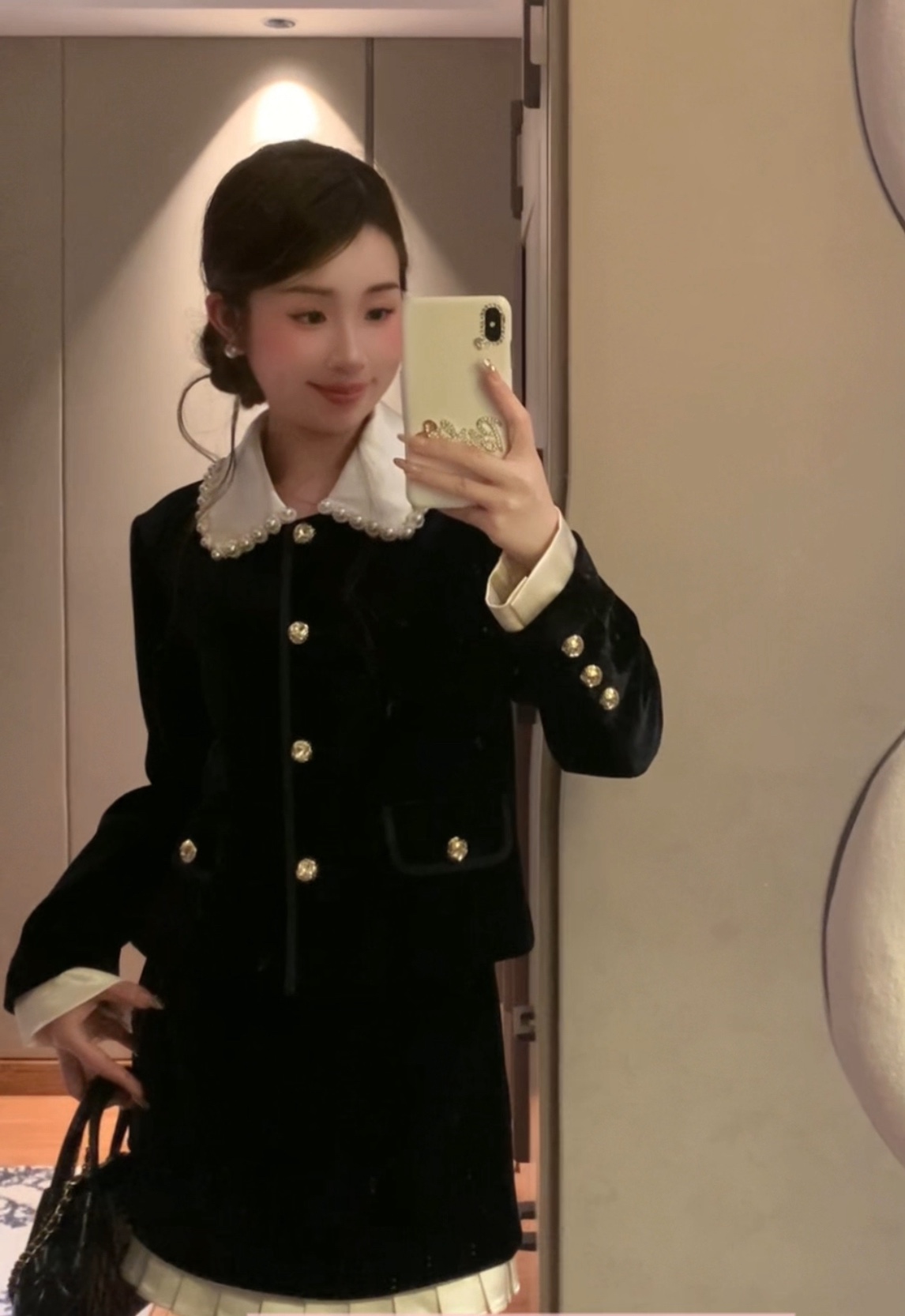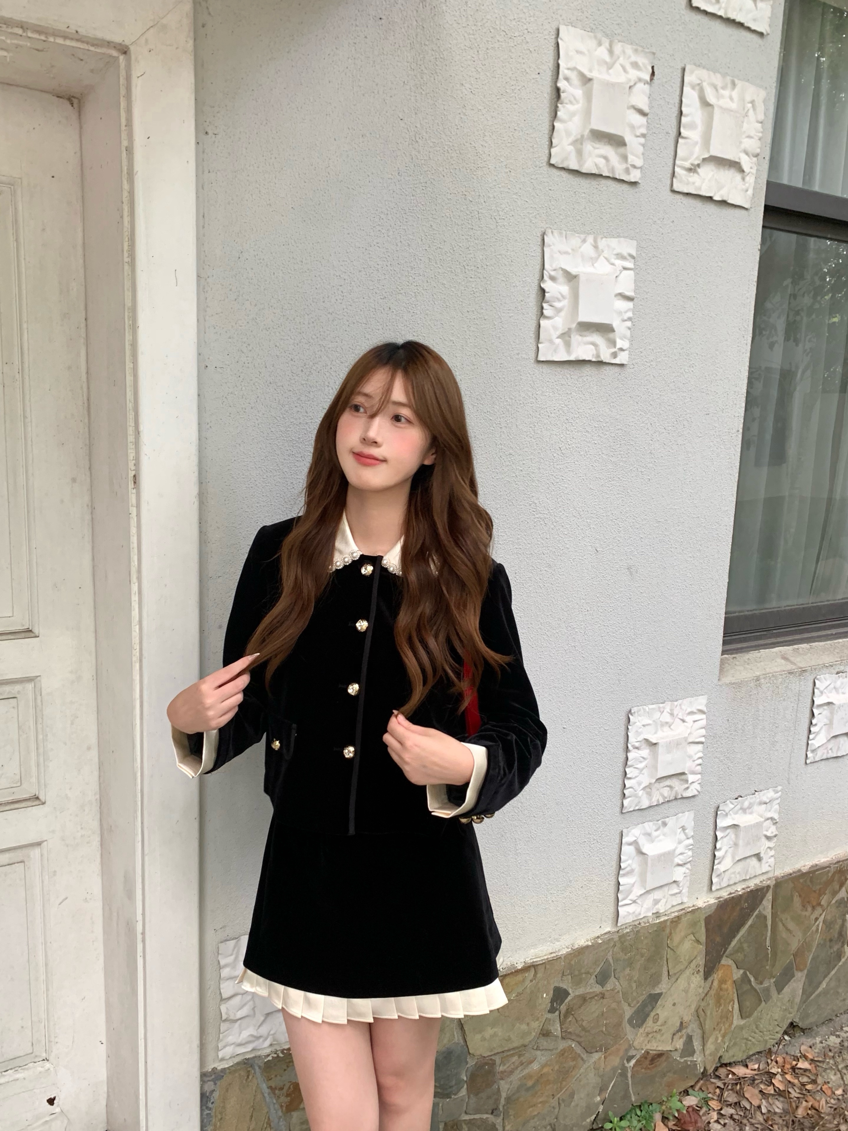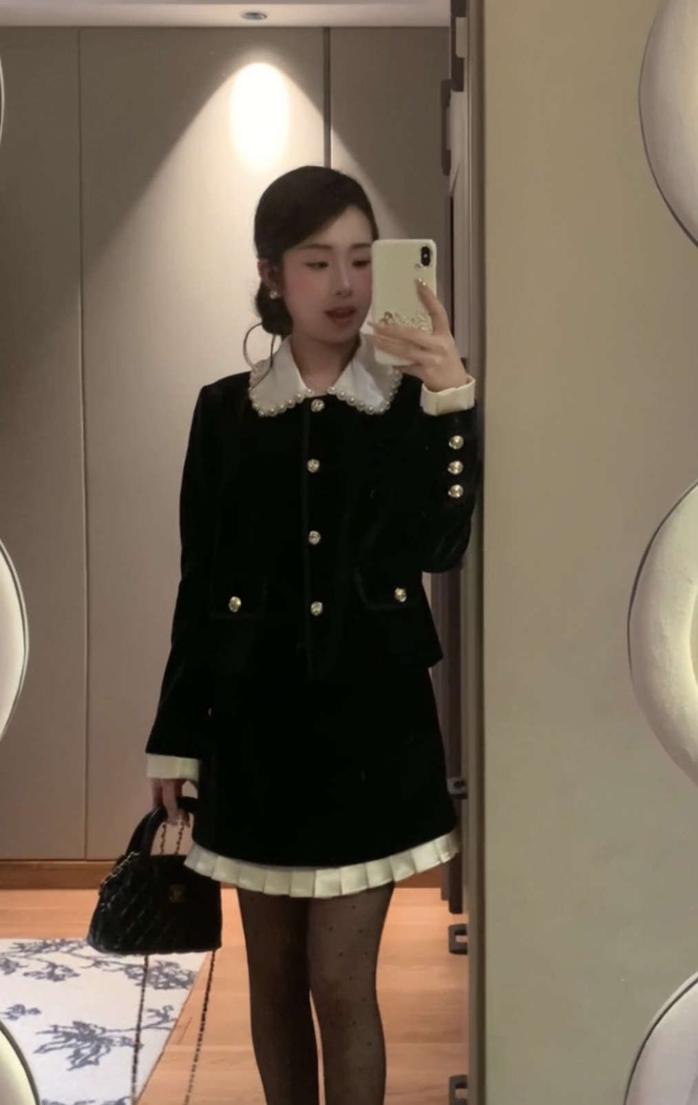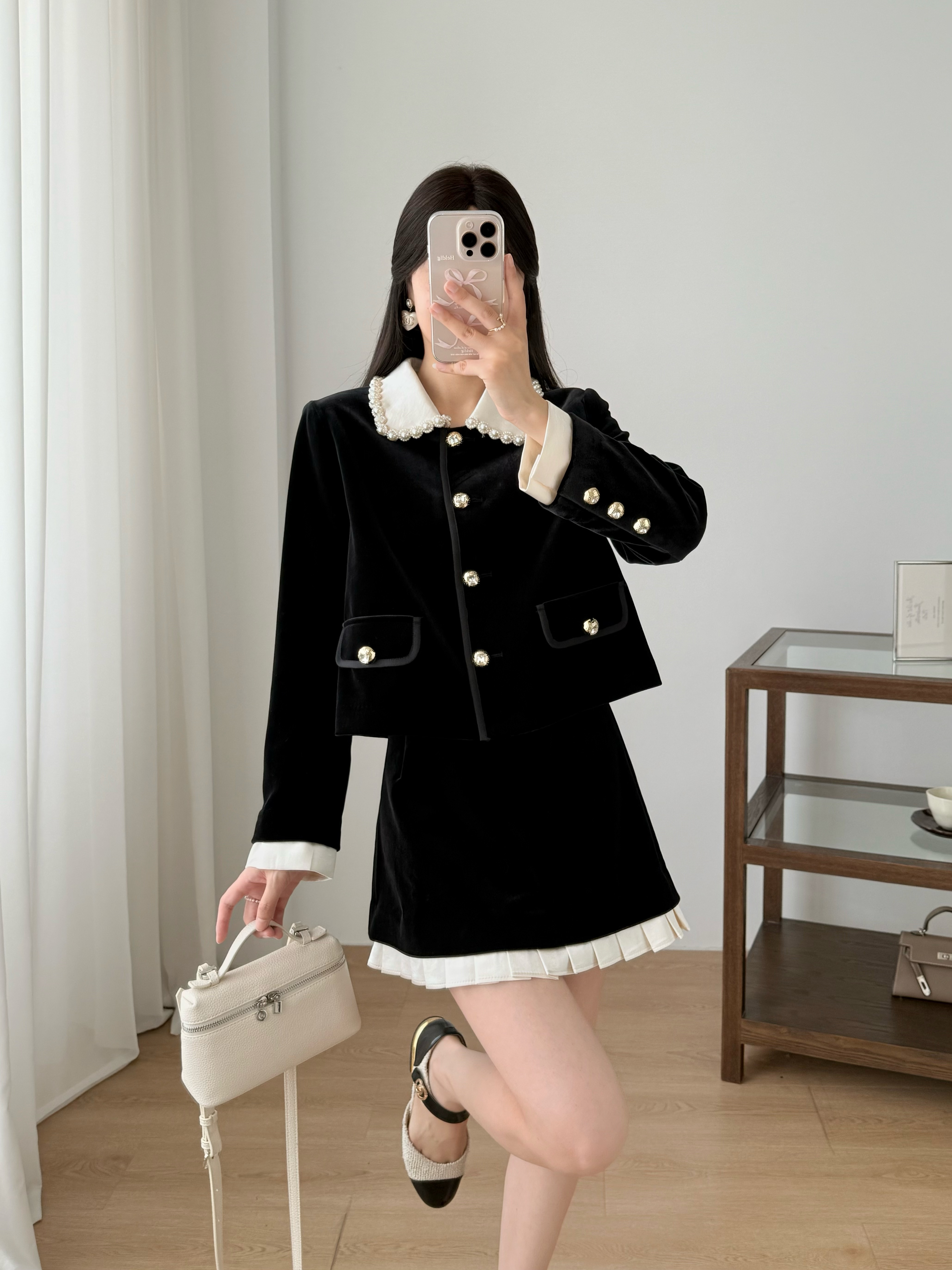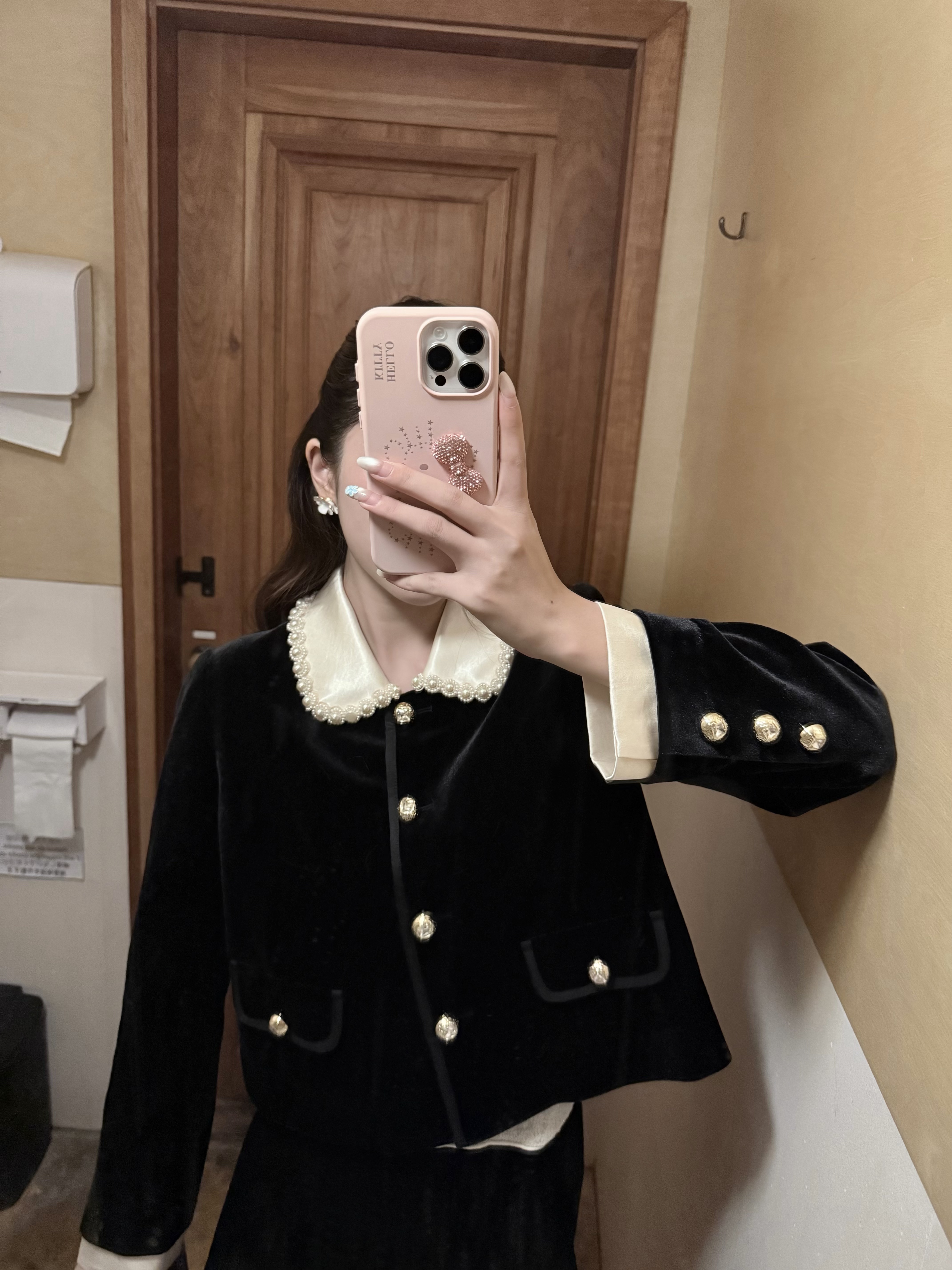 做工超级精致的一套呀,黑丝绒面料看着很高级,尤其是上面的珍珠和钻扣都太好看了