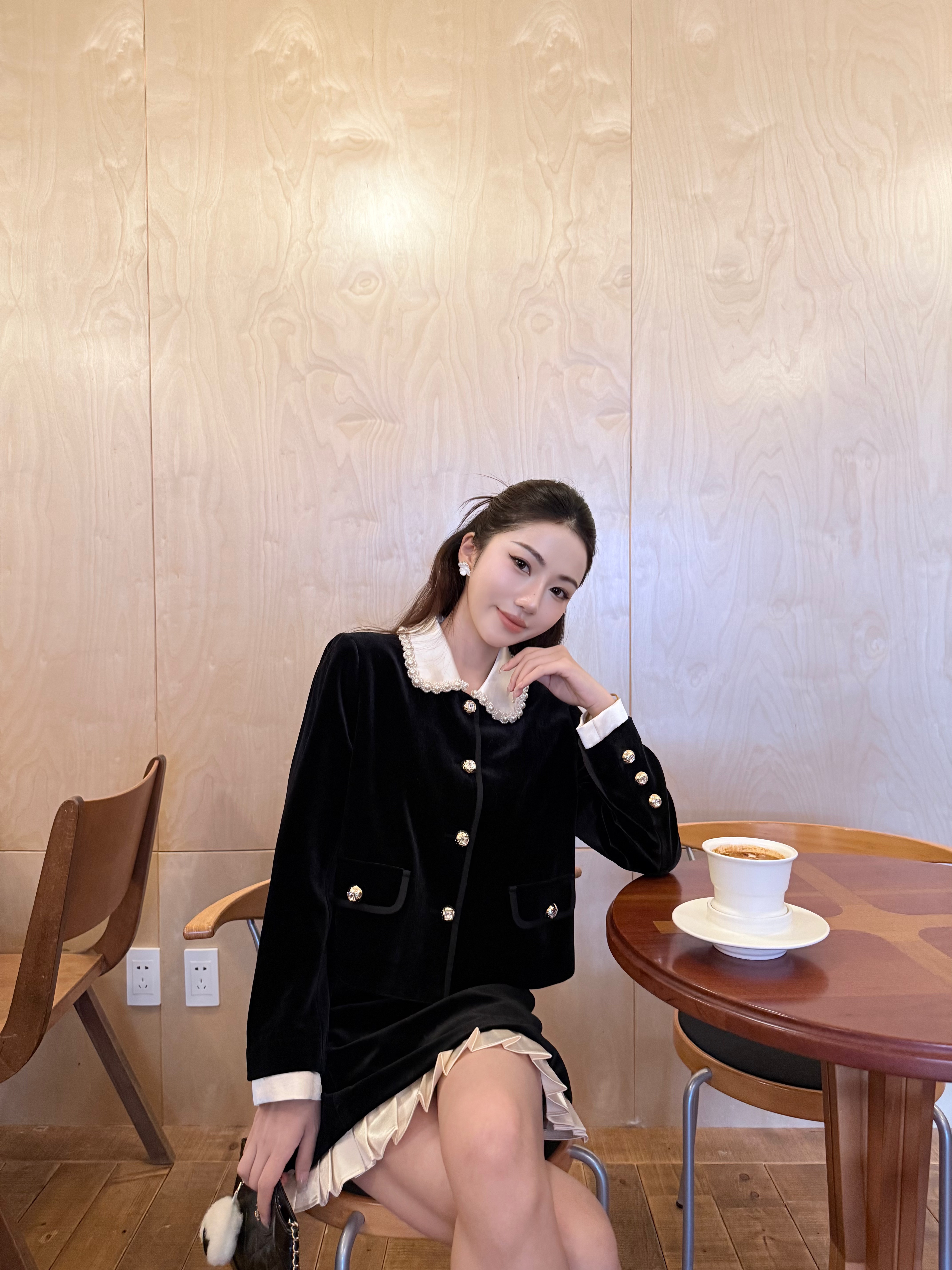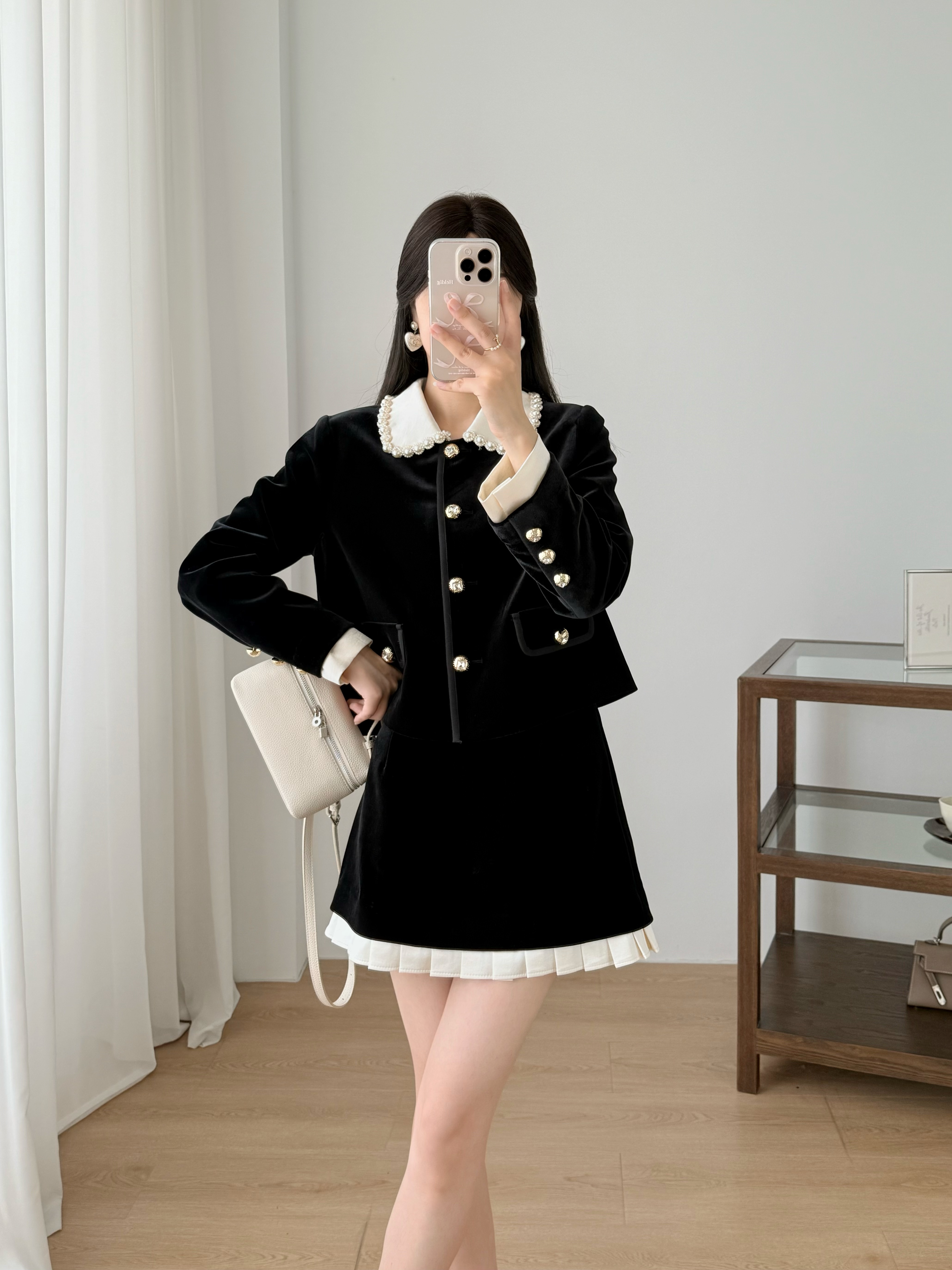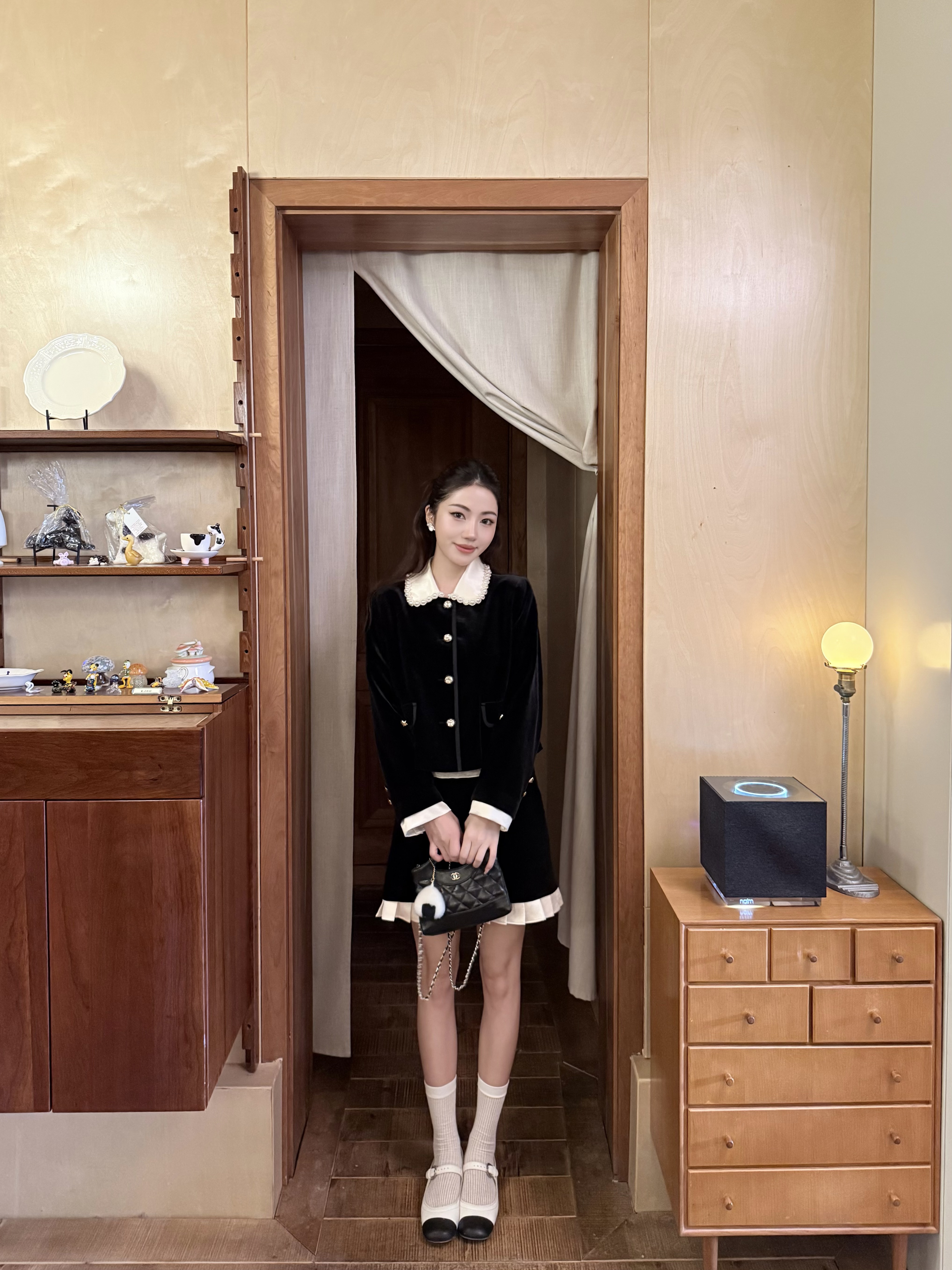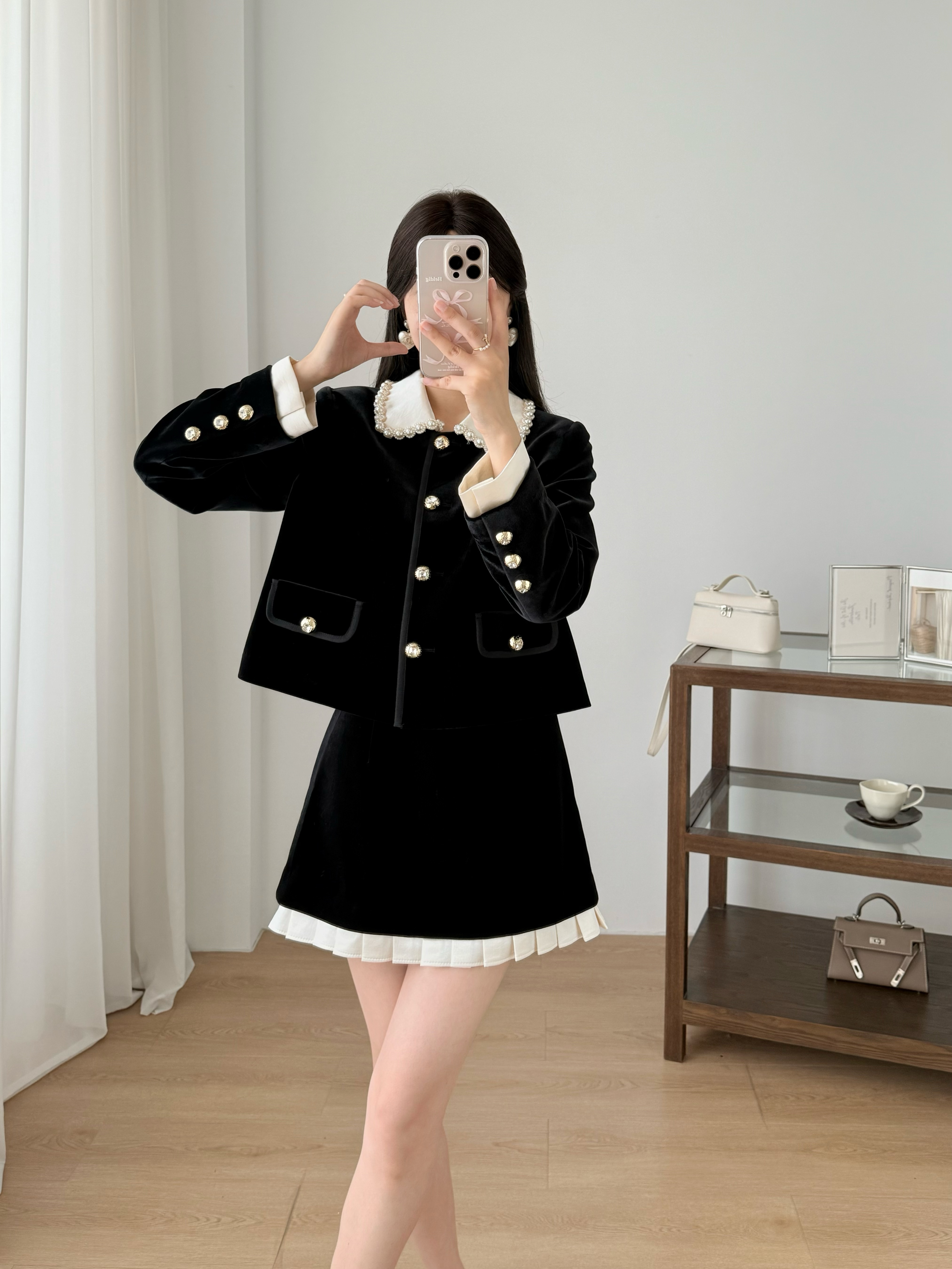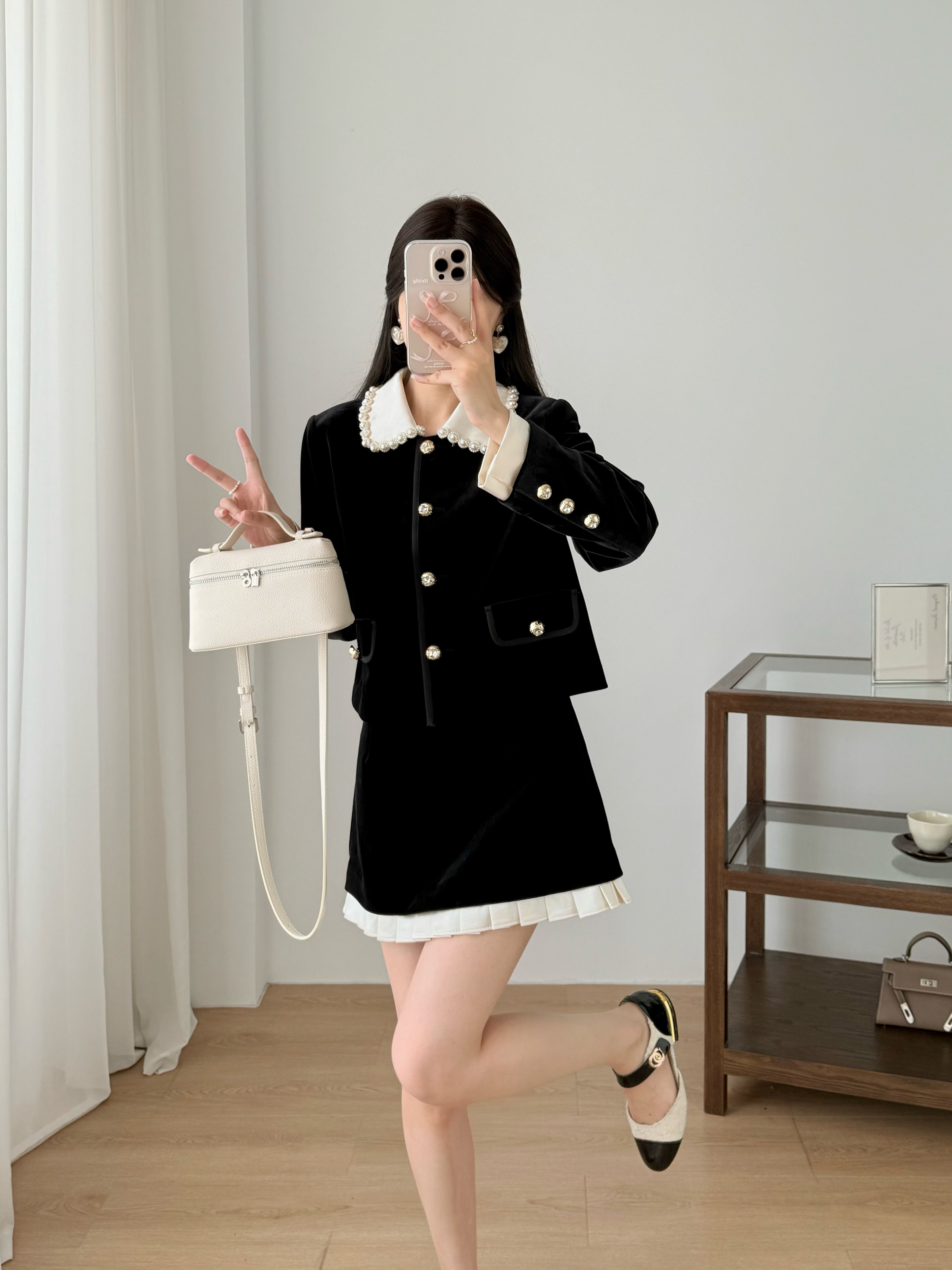 做工超级精致的一套呀,黑丝绒面料看着很高级,尤其是上面的珍珠和钻扣都太好看了