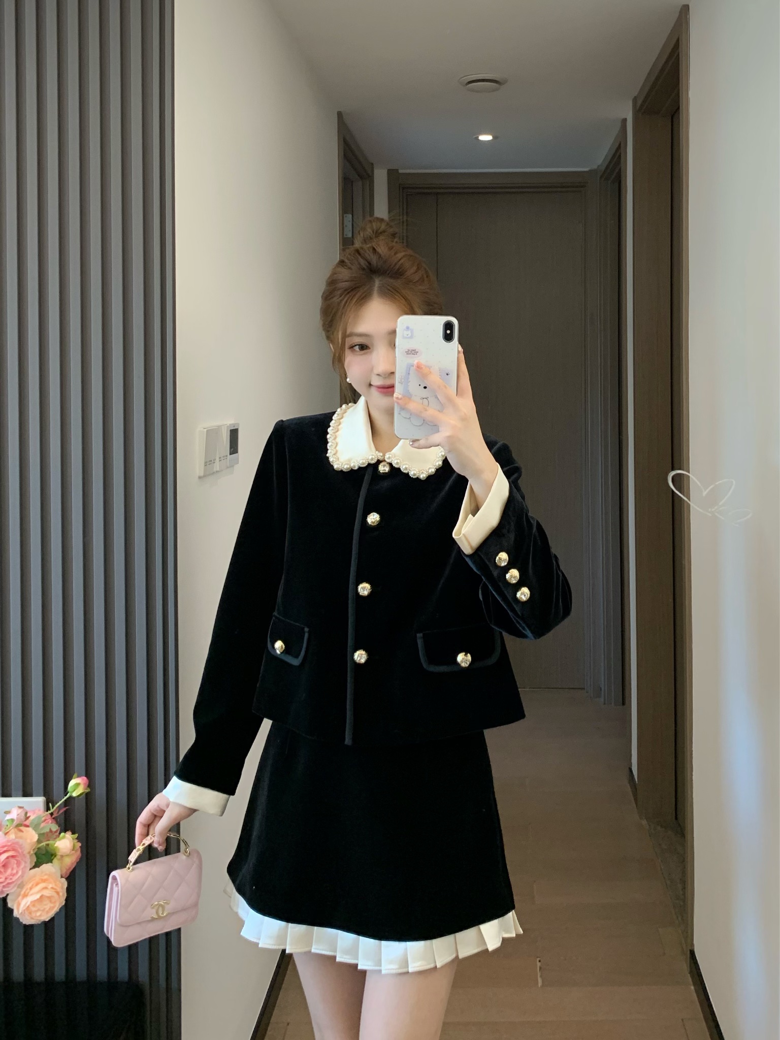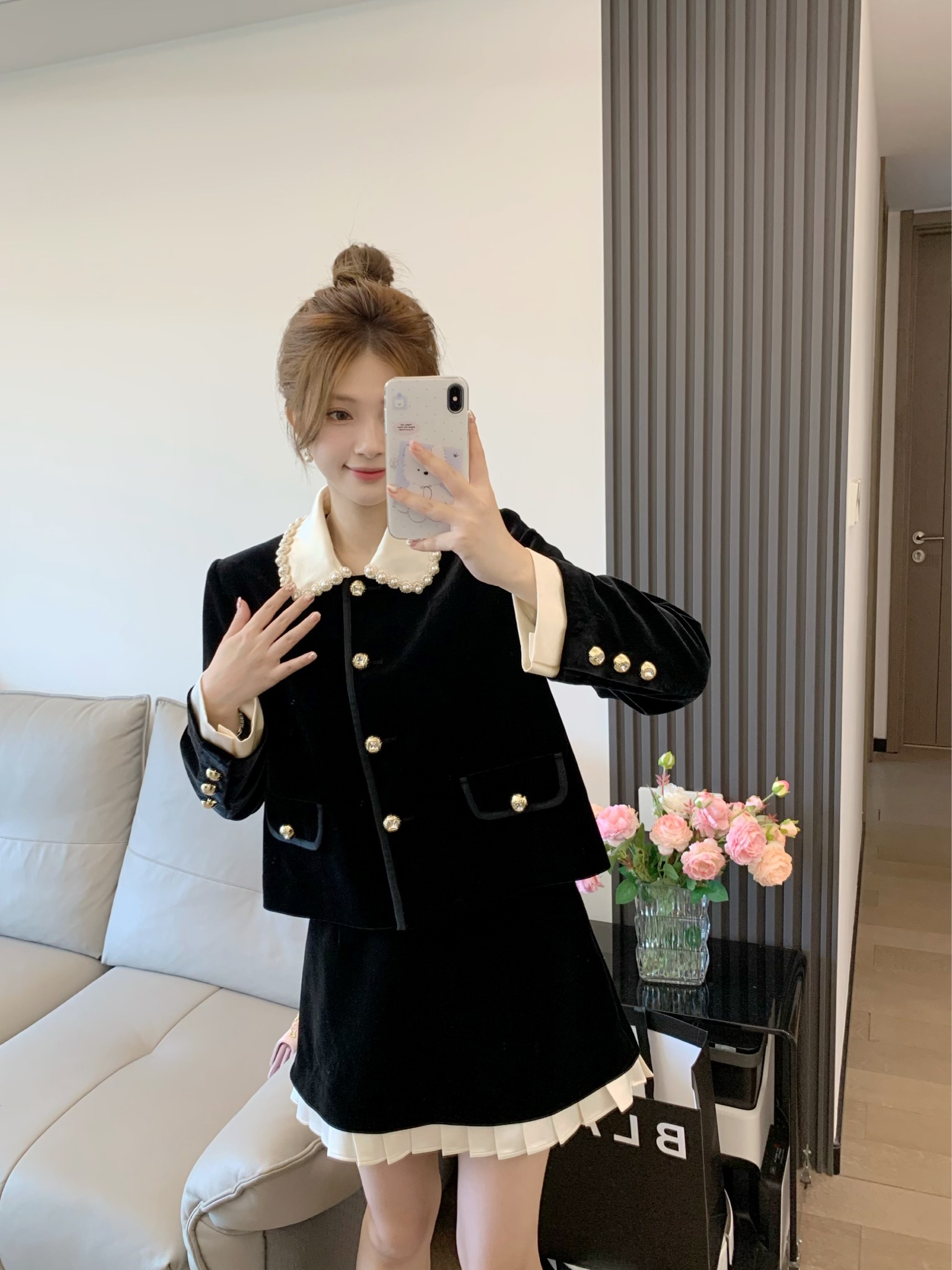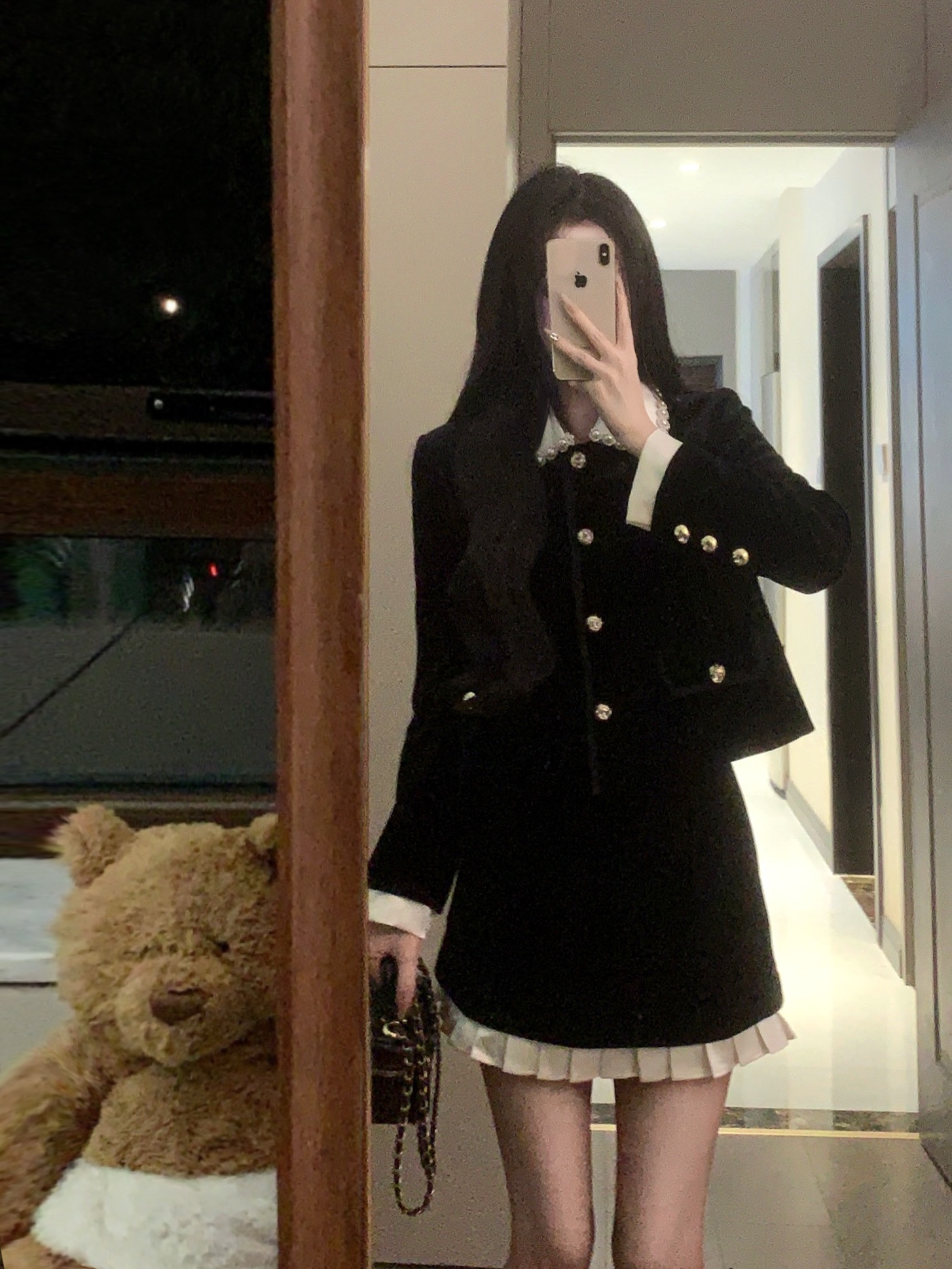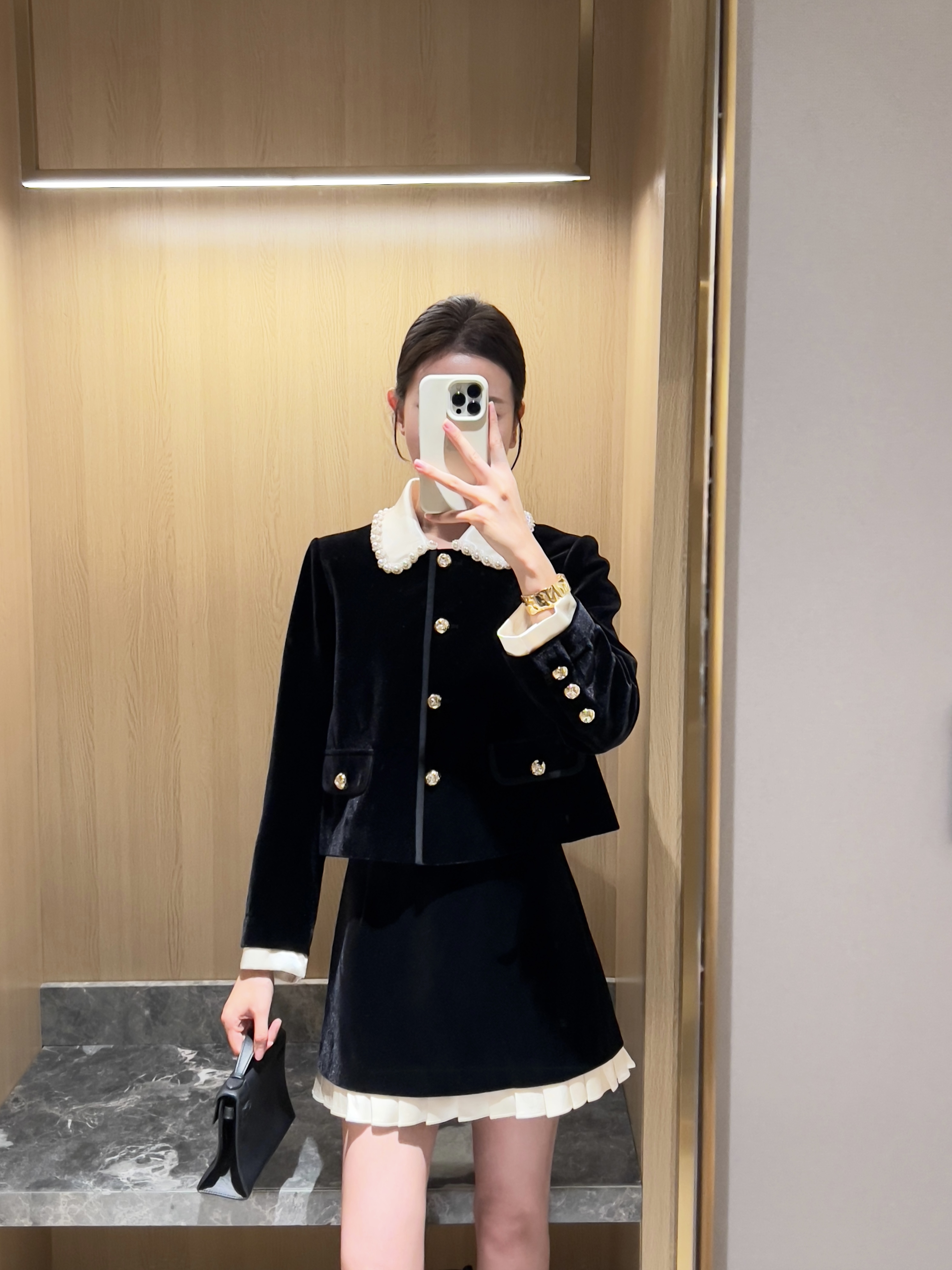 做工超级精致的一套呀,黑丝绒面料看着很高级,尤其是上面的珍珠和钻扣都太好看了