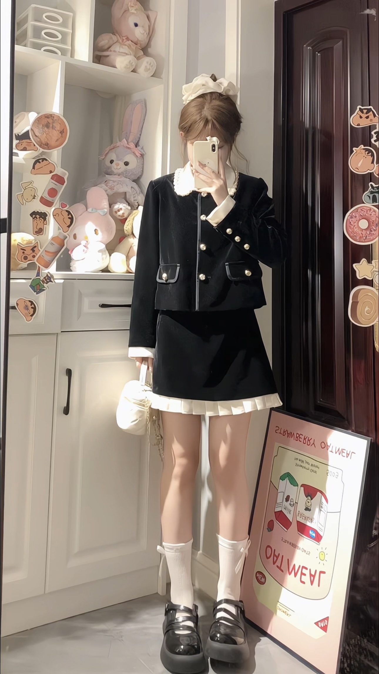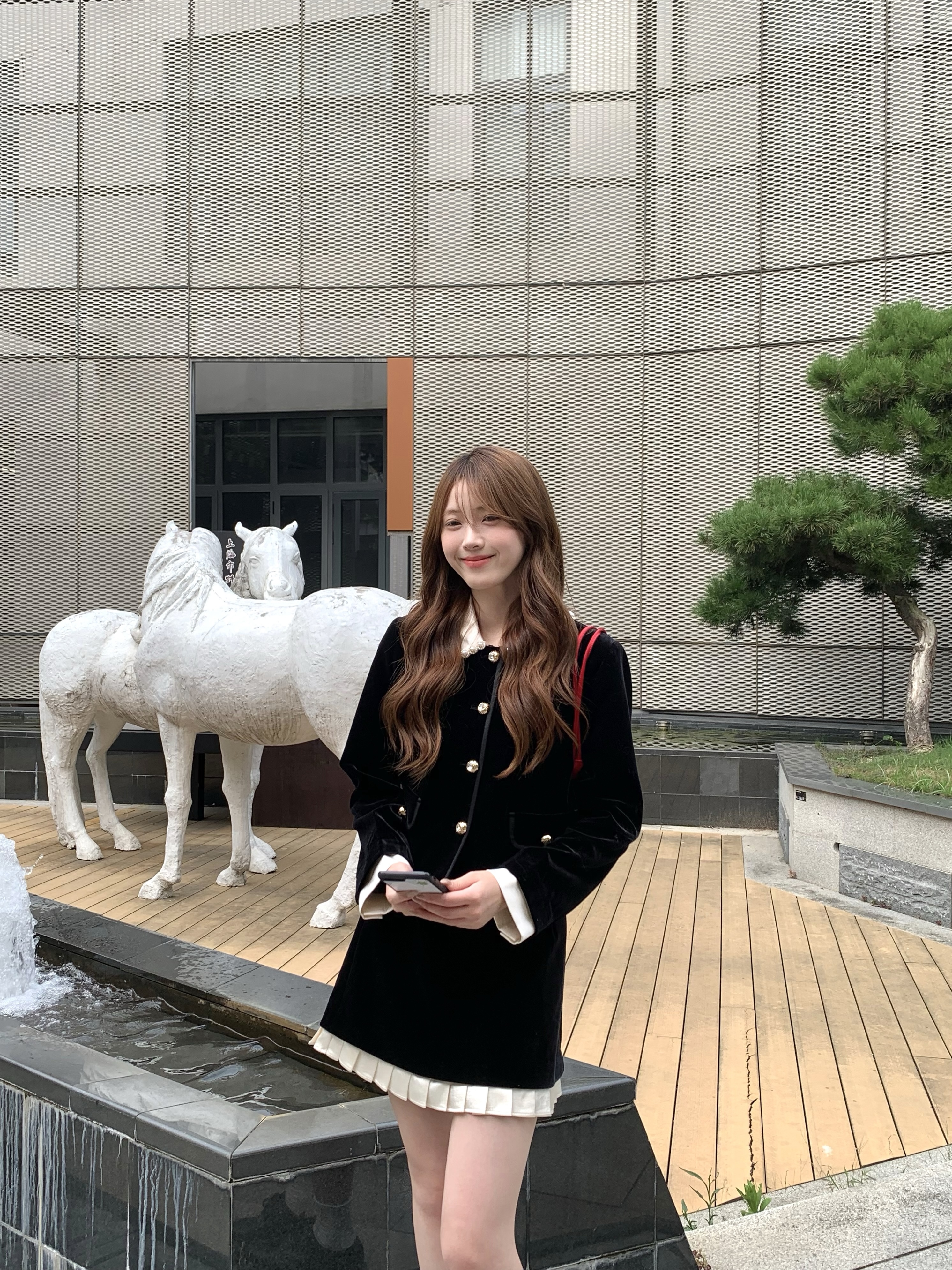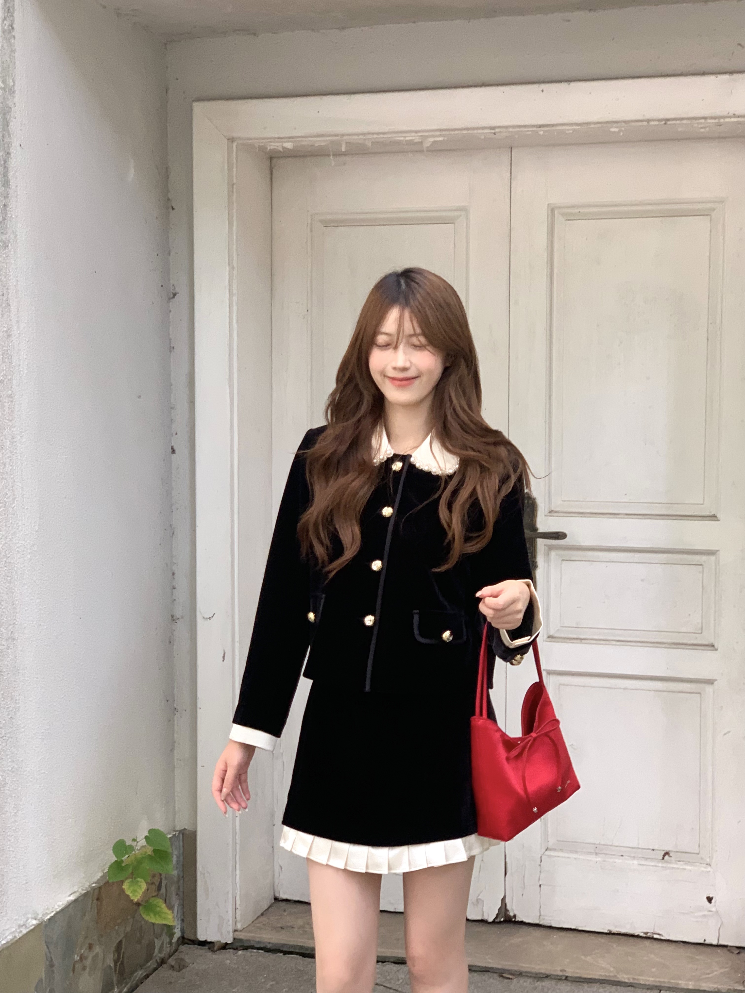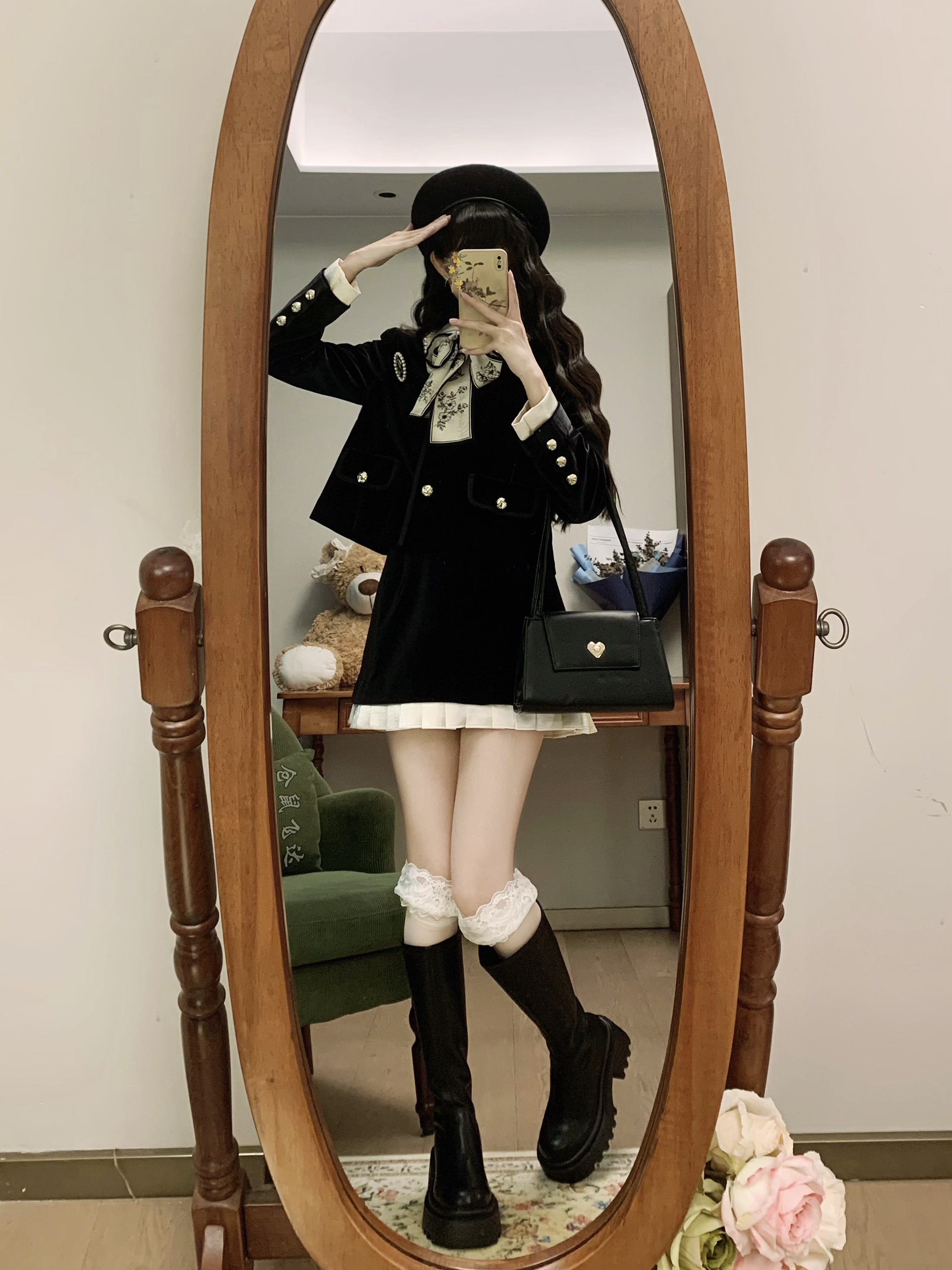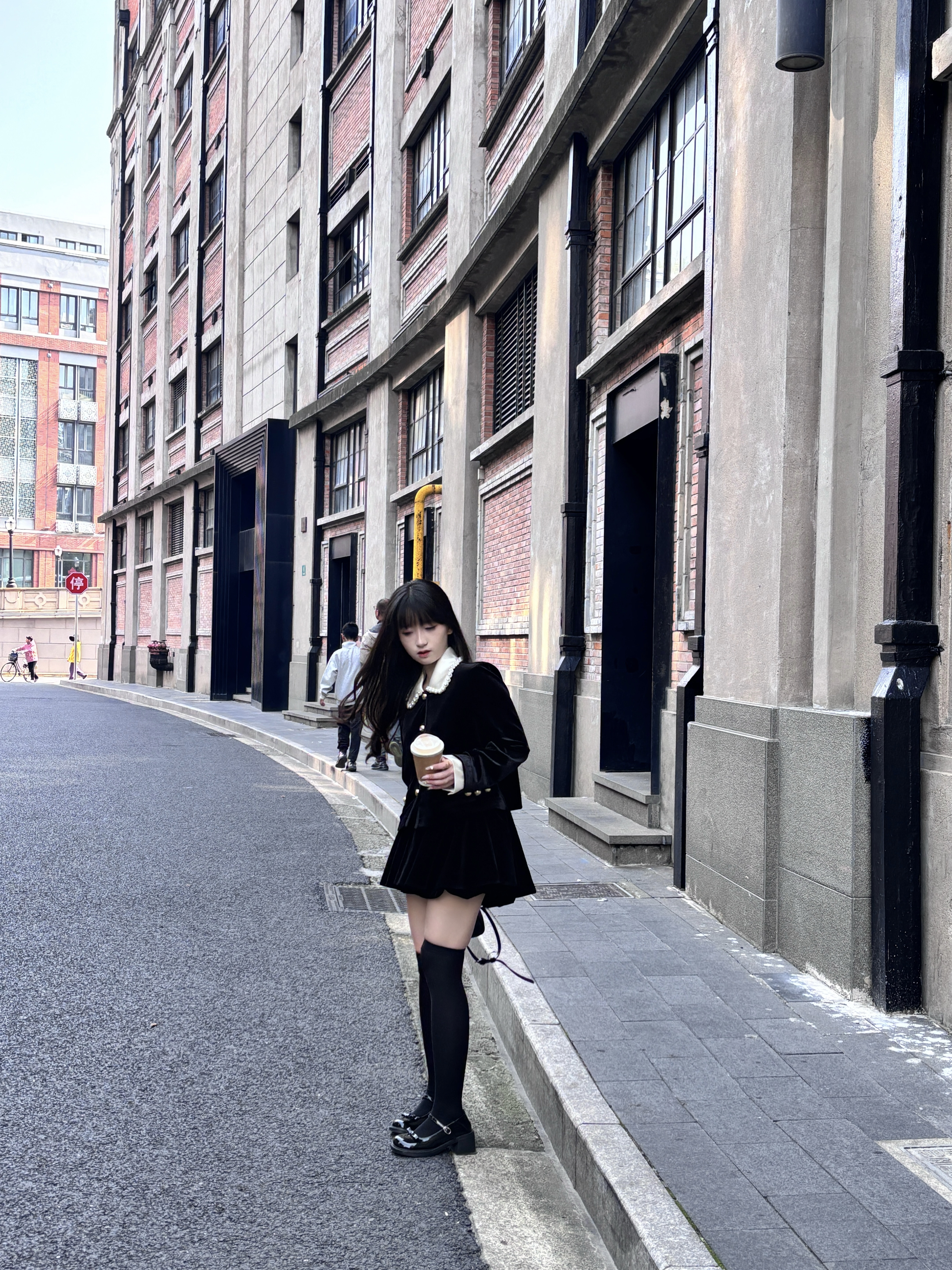 做工超级精致的一套呀,黑丝绒面料看着很高级,尤其是上面的珍珠和钻扣都太好看了