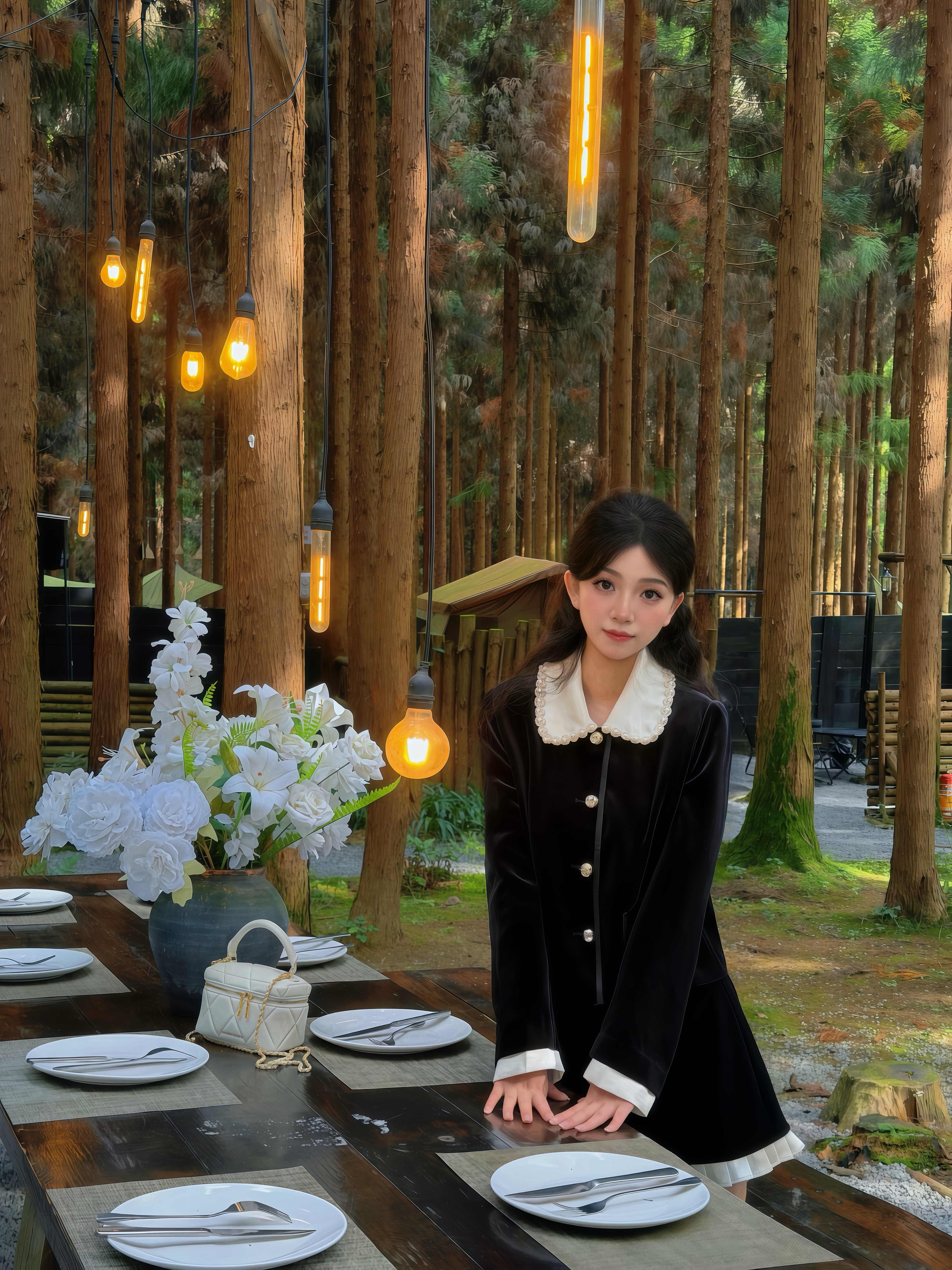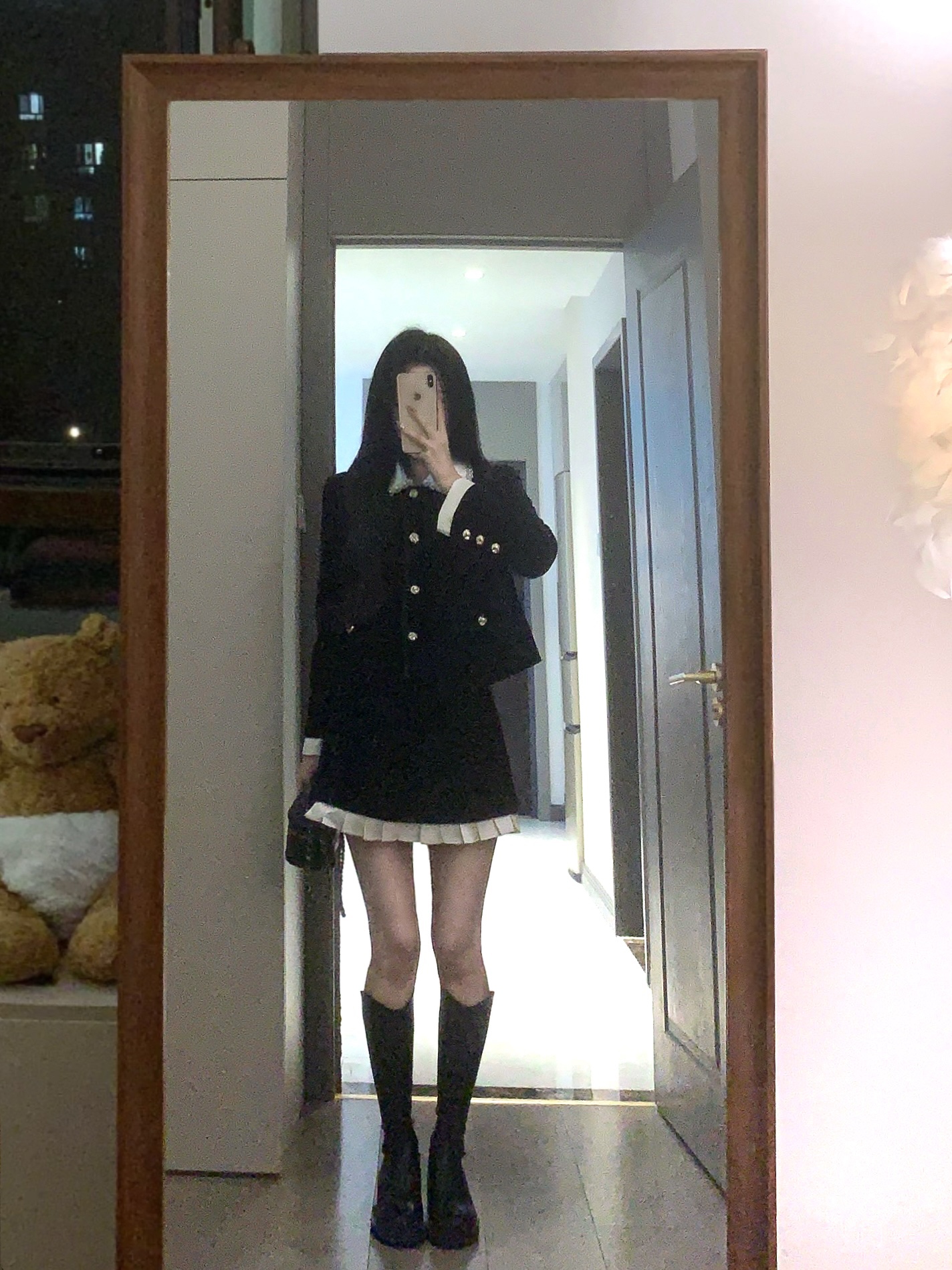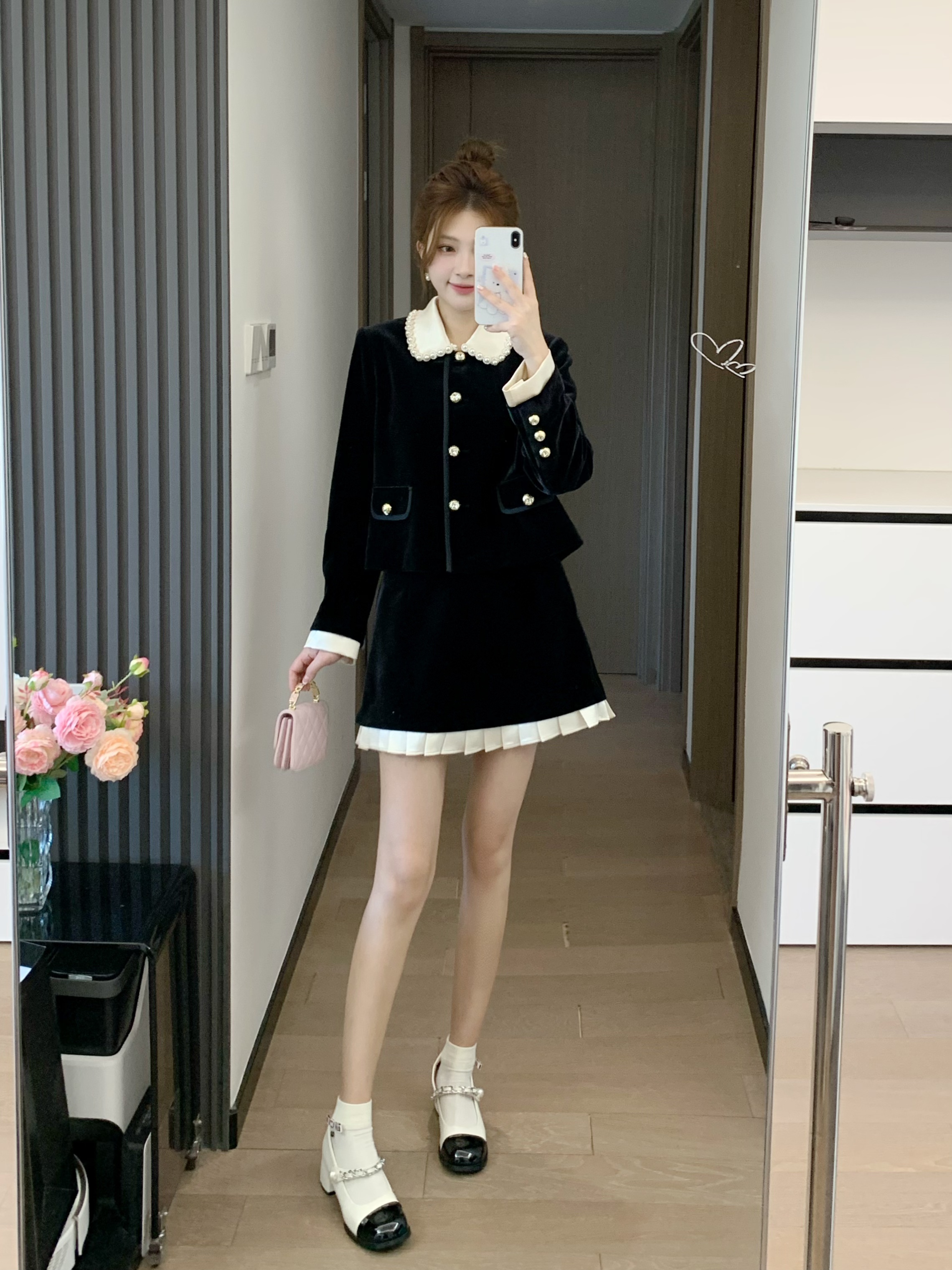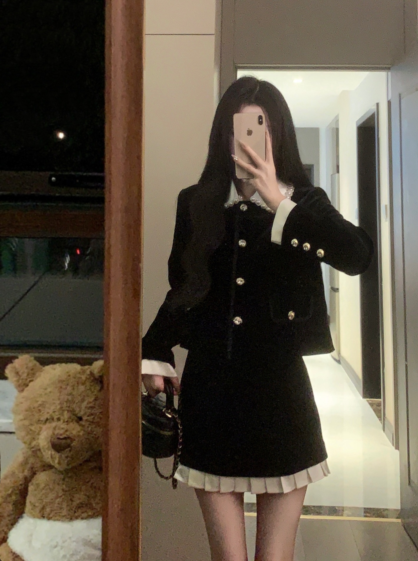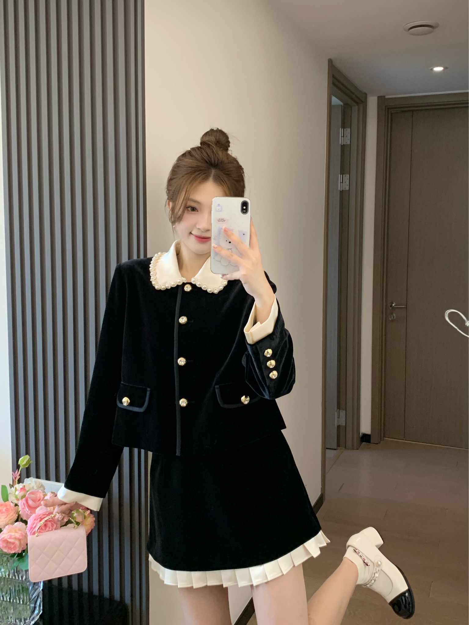 做工超级精致的一套呀,黑丝绒面料看着很高级,尤其是上面的珍珠和钻扣都太好看了