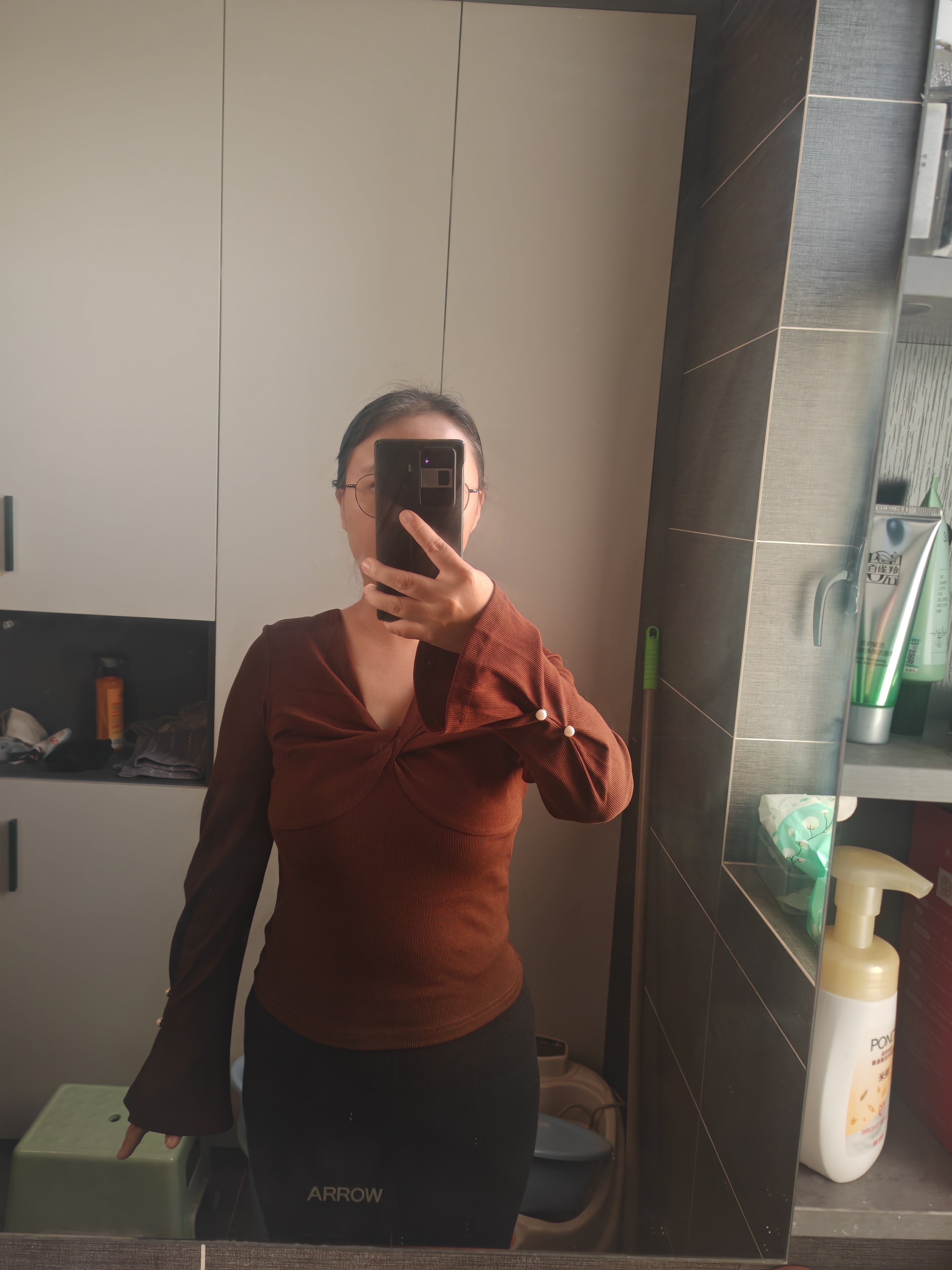 颜色浓郁很好看,就是不适合胖人,肉肉全出来了,打底穿还可以,袖子有设计感,就是领口太低了,棕色还好黑色特别低