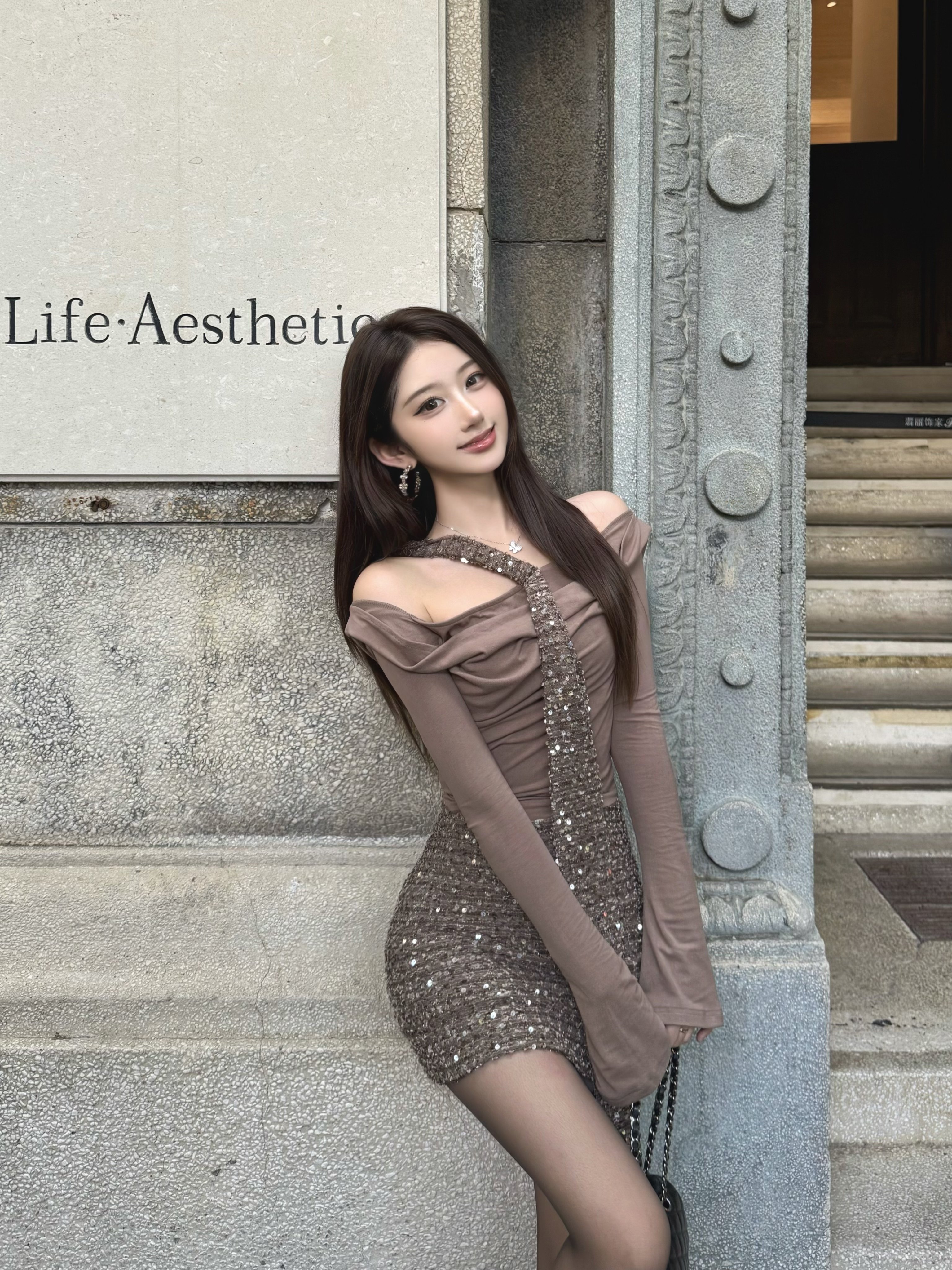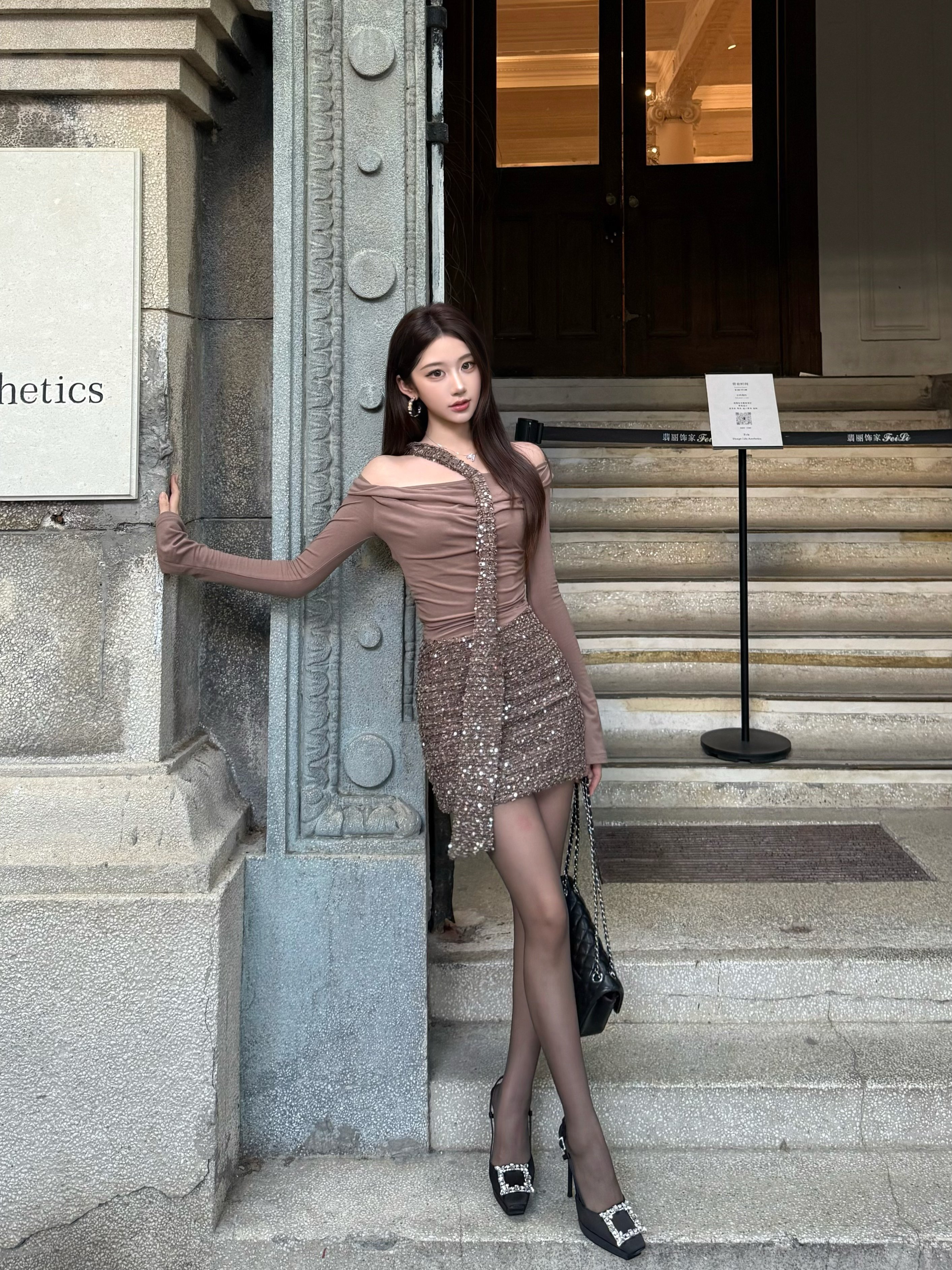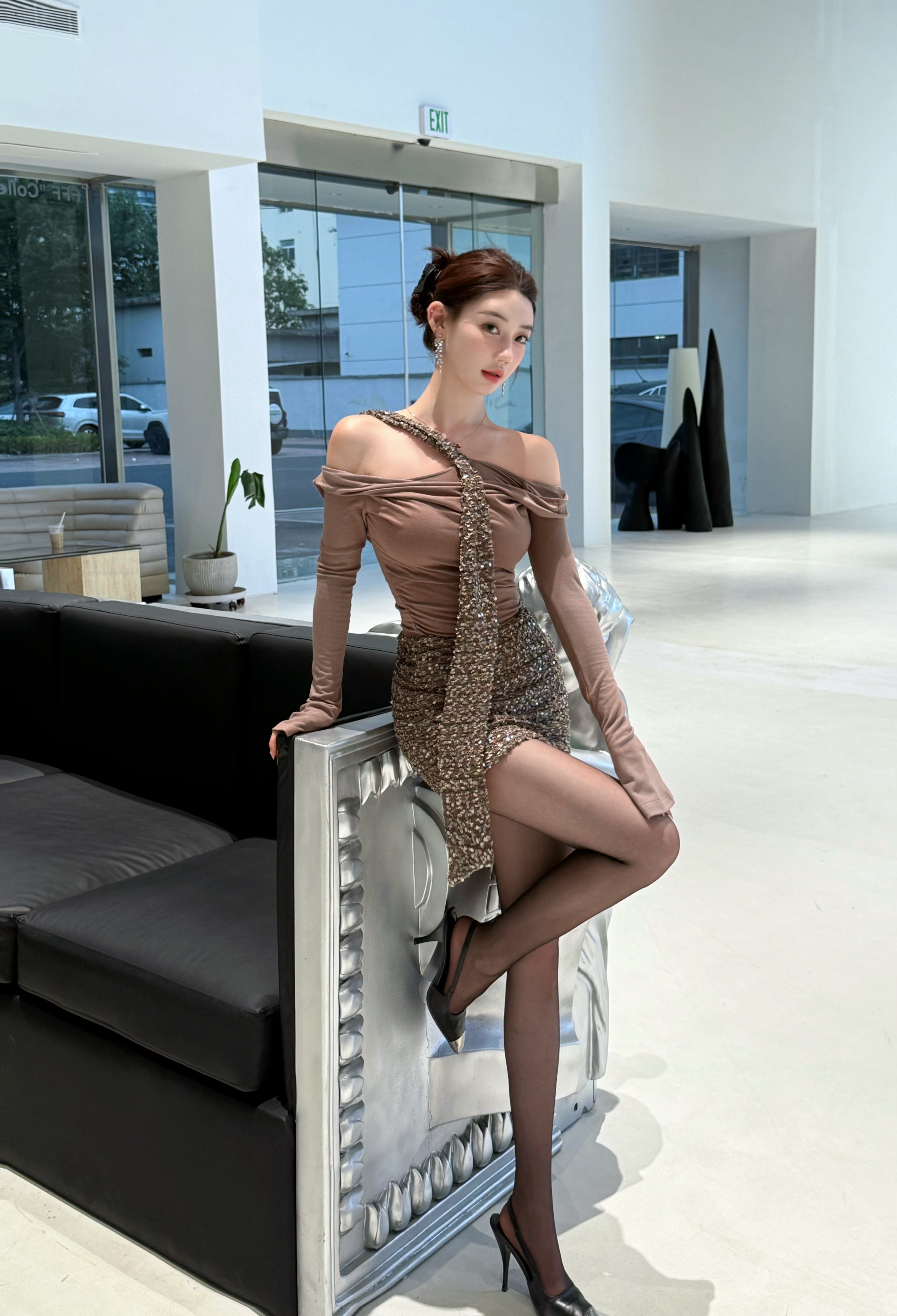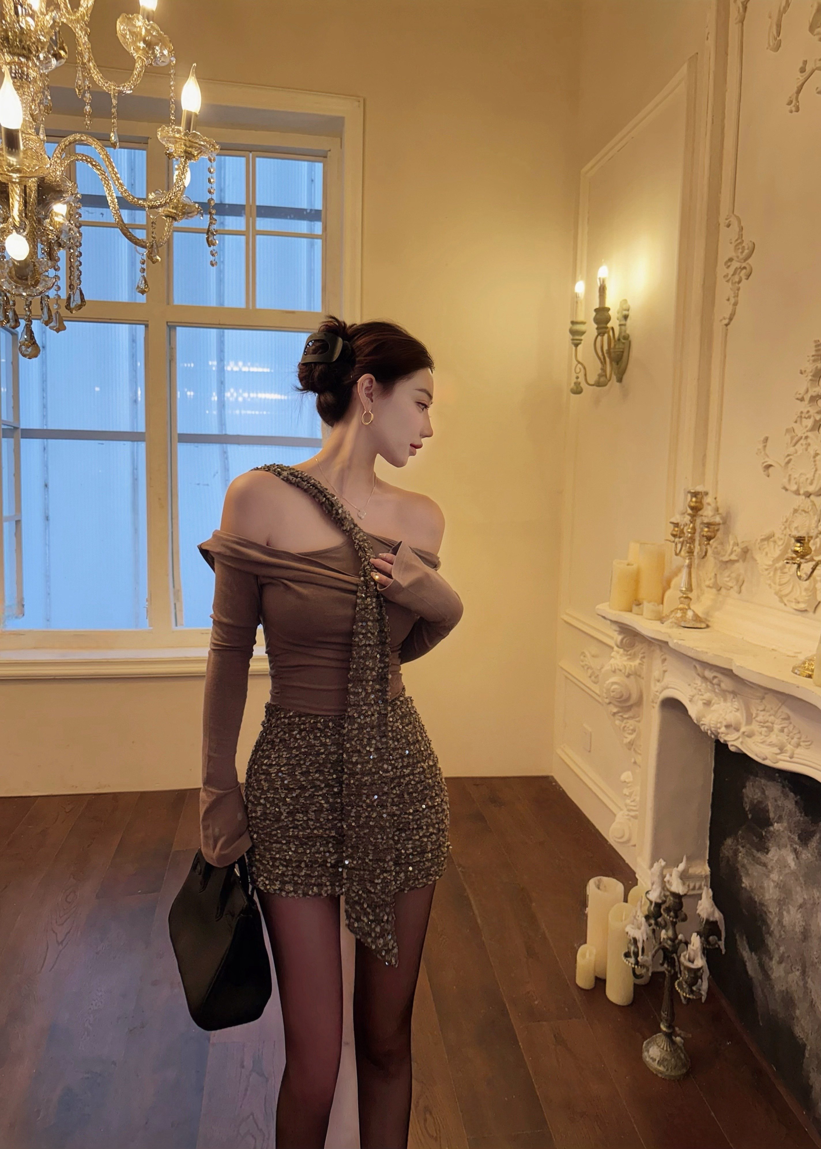 CYNR 原创老钱风连衣裙太绝了!亮片拼接自带贵气光泽,荡领 + 扭结飘带 + 一字肩设计,性感又雅致。修身包臀版型勾勒窈窕曲线,细节满满显质感。日常约会、轻社交场合都适配,轻松拿捏不费力的高贵氛围感,是提升格调的吸睛单品~