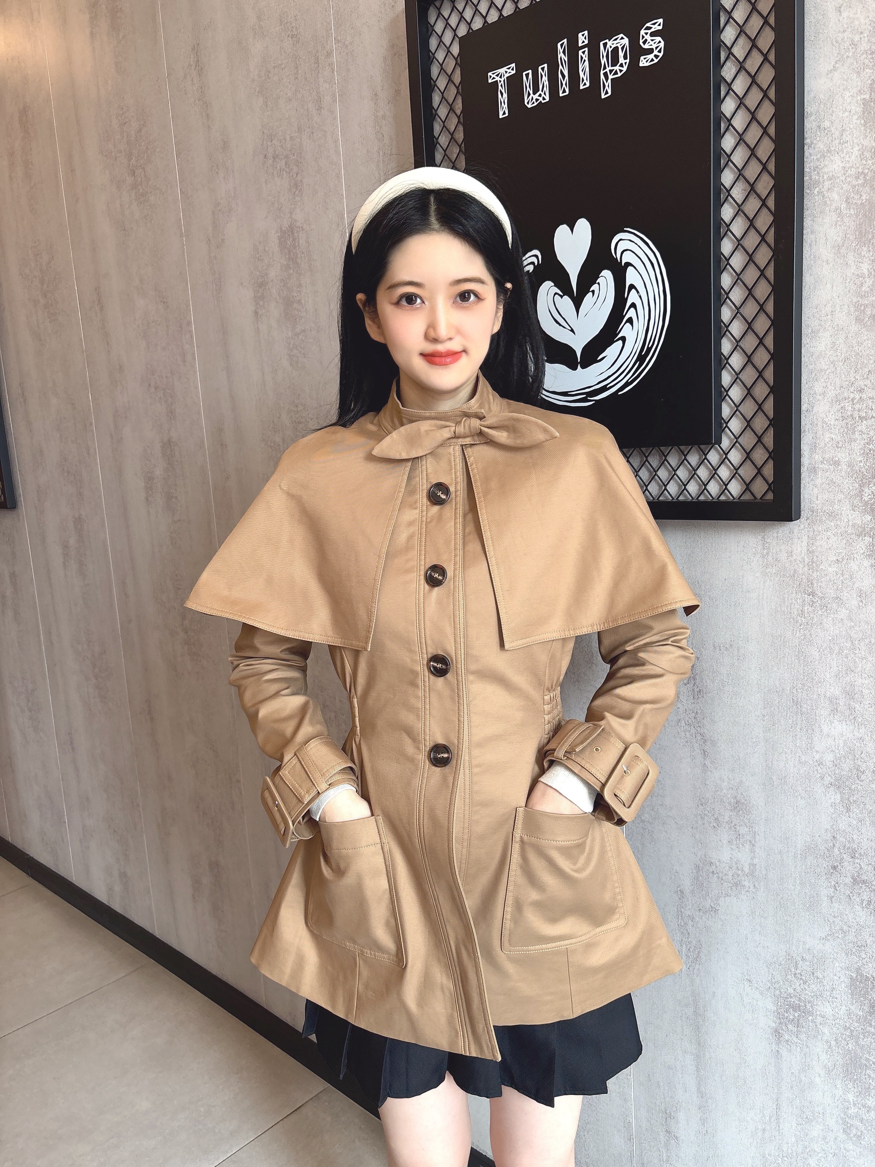 卡其色风衣面料厚实挺括,斗篷版型太显瘦了,完全不挑身材~领口和袖口的纽扣设计很有质感