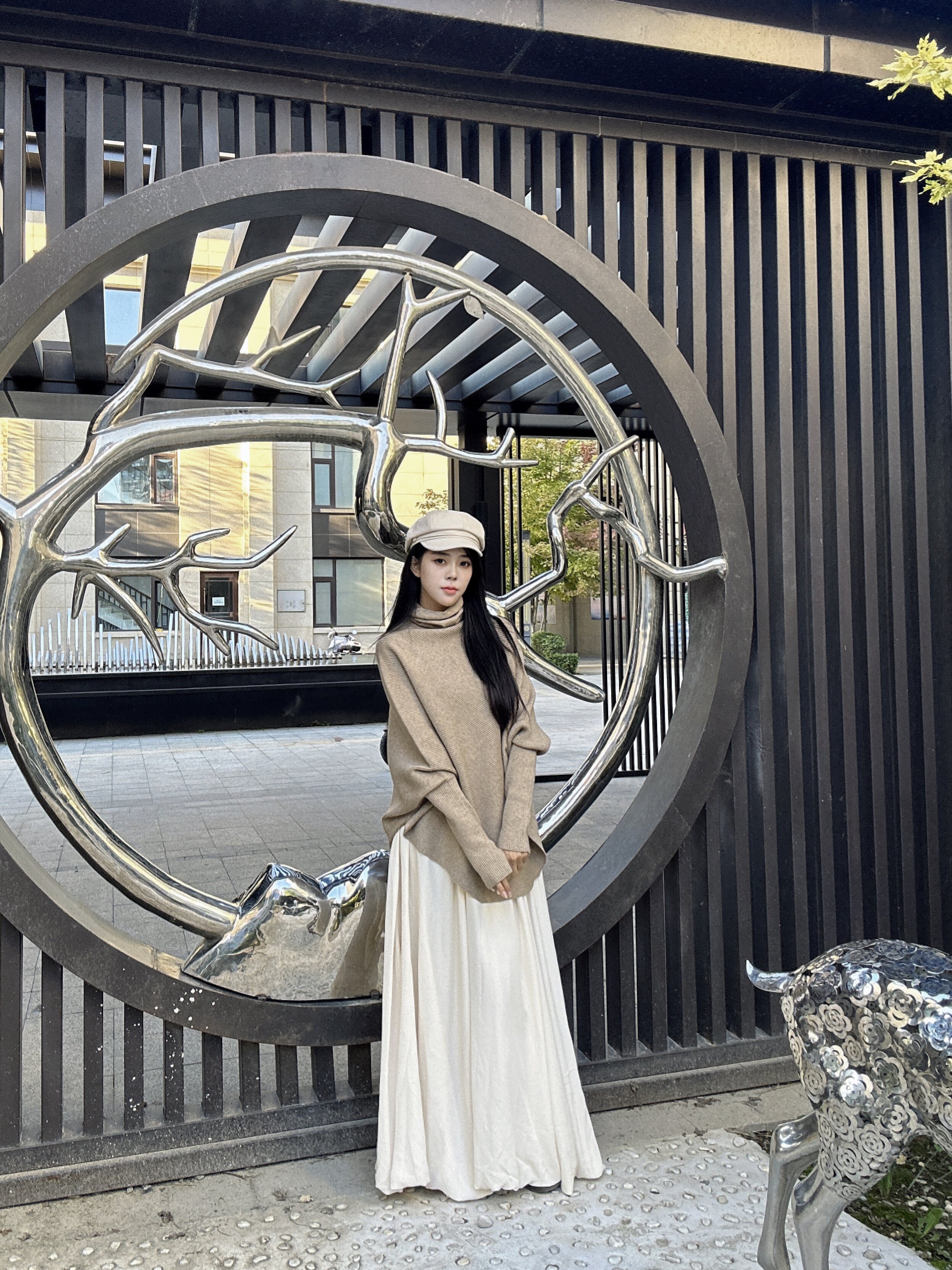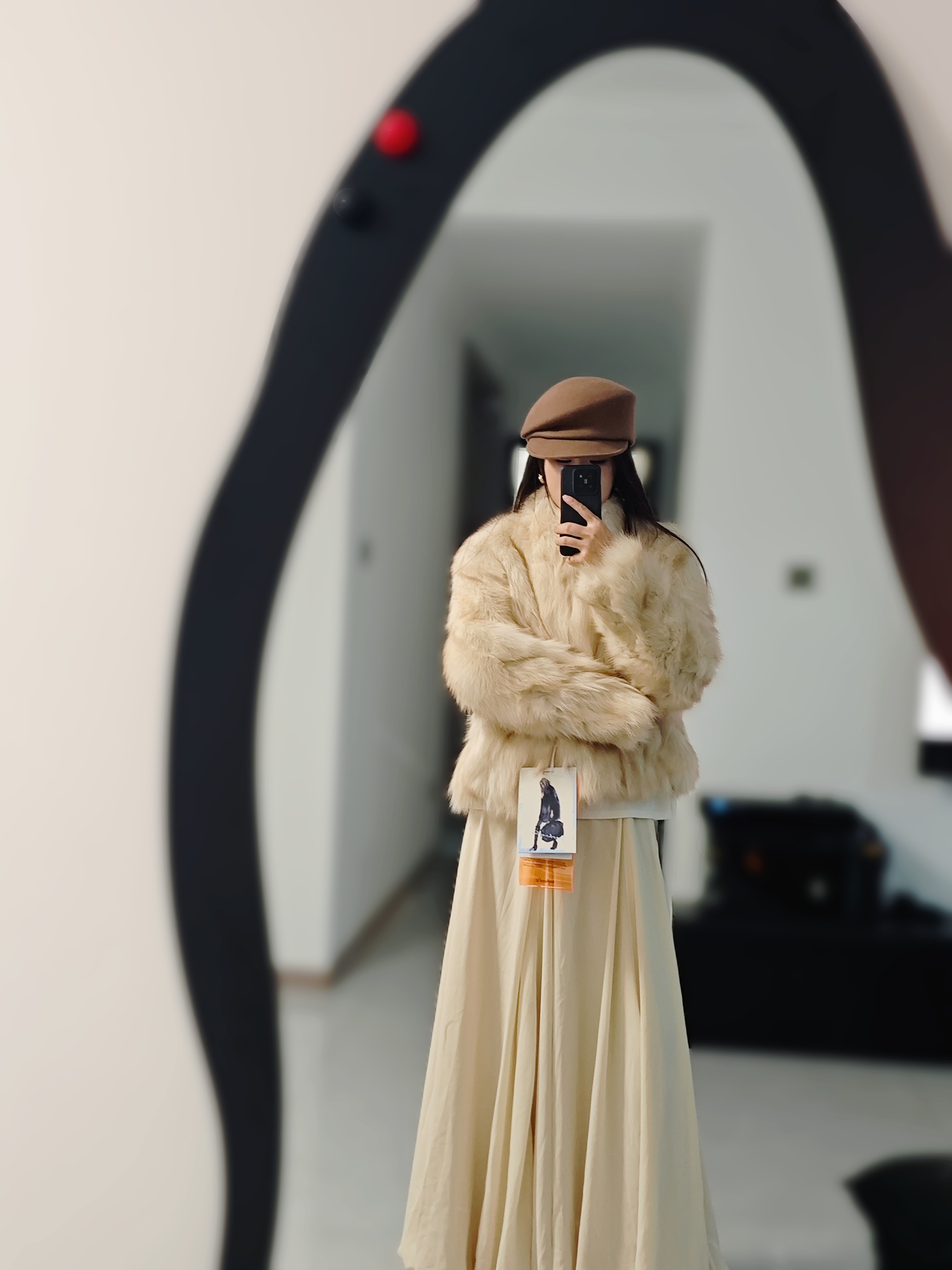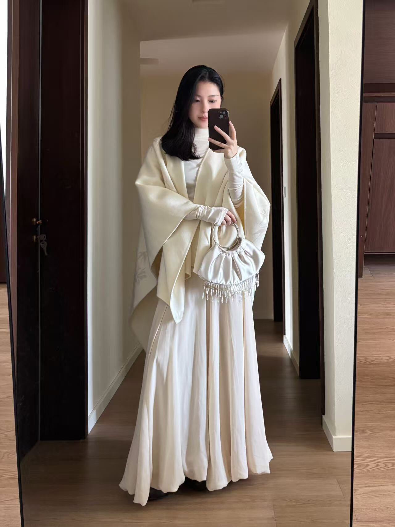这条米白色半身裙真的太戳我了!颜色是那种很温柔的米白,不是惨白,带着点暖意,显得整个人气质都柔和起来了。面料垂坠感很好,摸起来软软糯糯的,秋冬穿保暖又舒服。