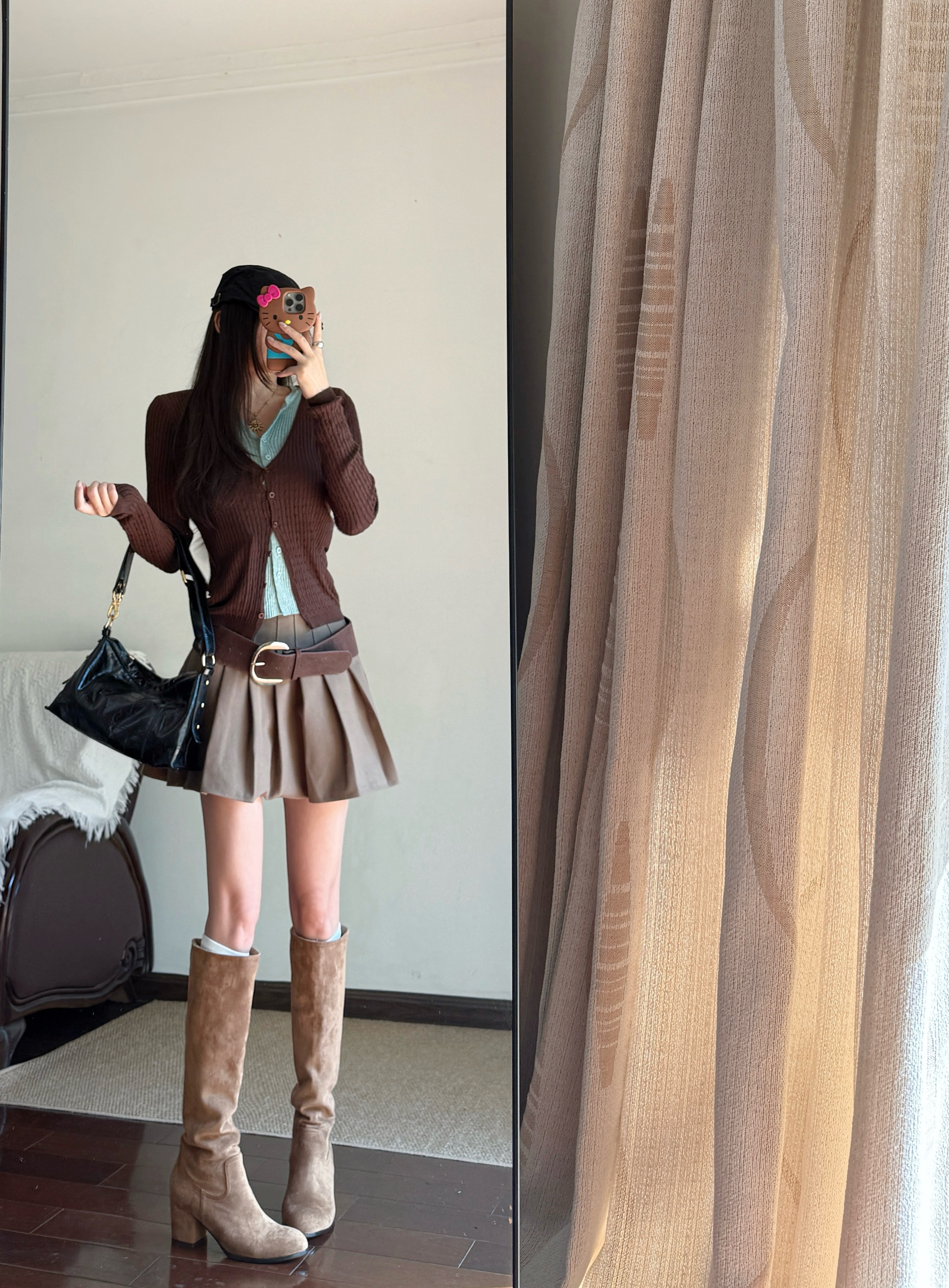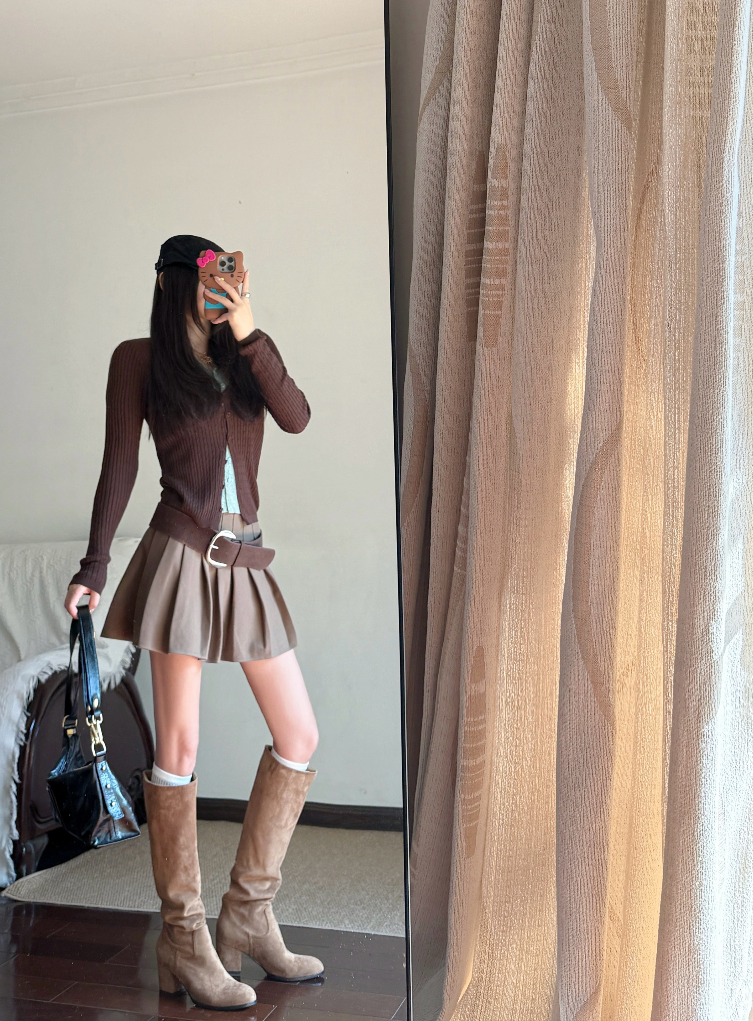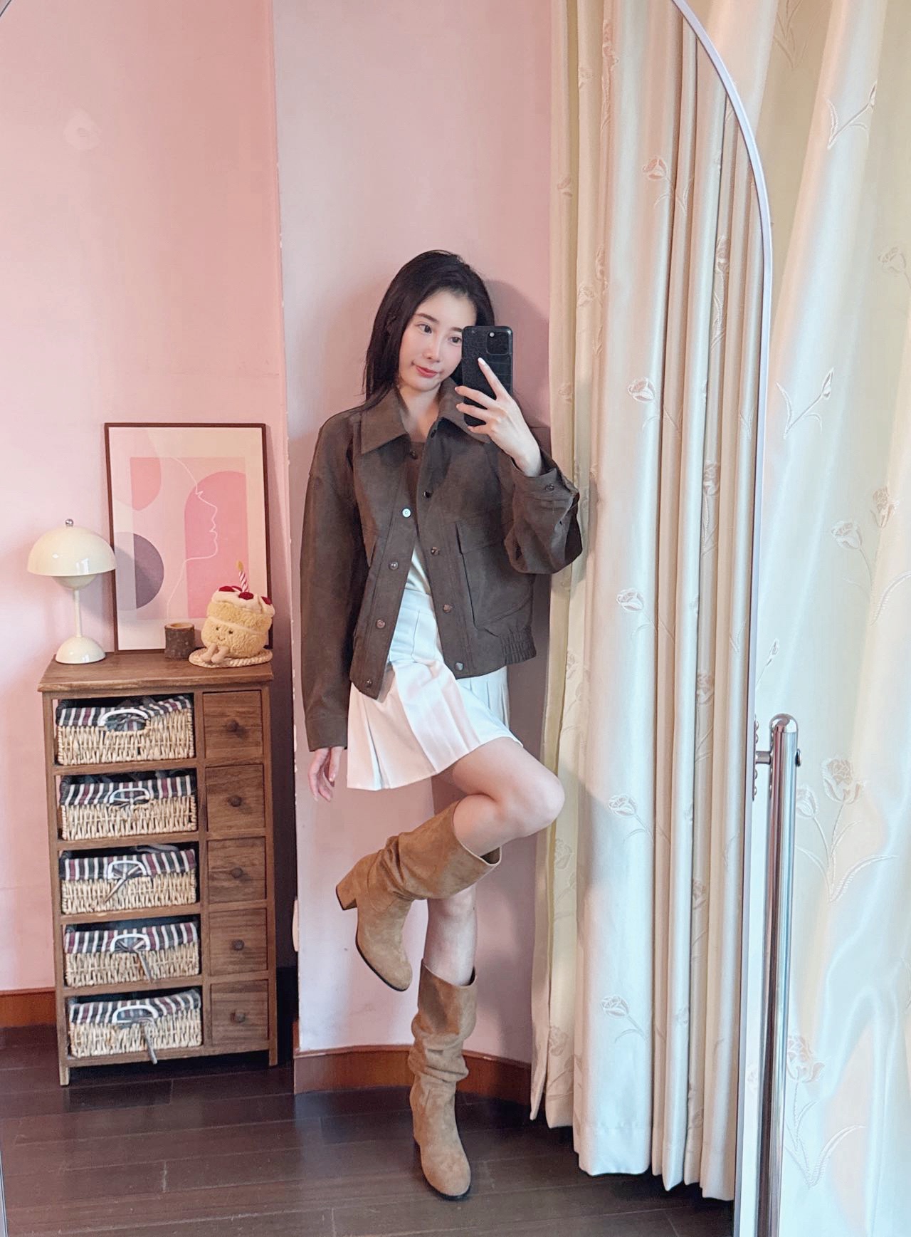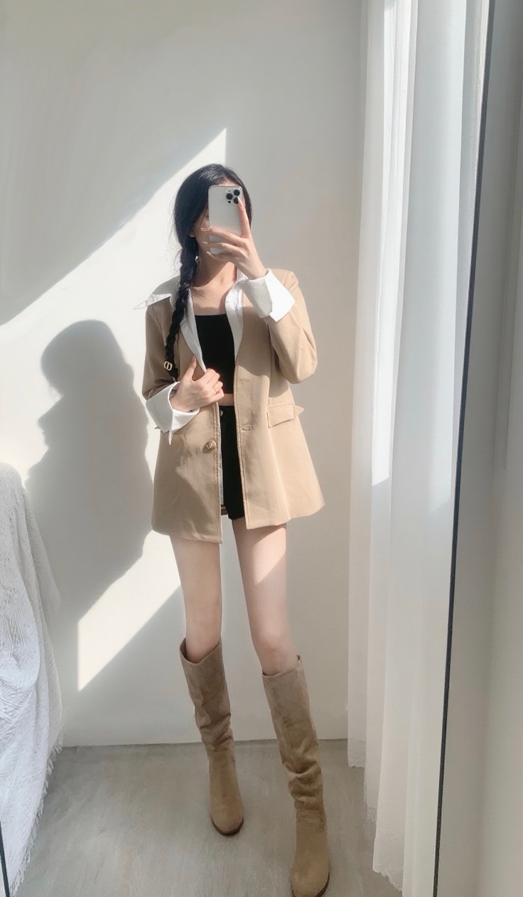 温柔又洋气的卡其色,很好配衣服,靴筒不是紧腿的,所以穿上是有点堆堆的感觉,自然又好看,真的好显腿长。我的脚比较瘦,客服建议拍小一码刚刚好。
