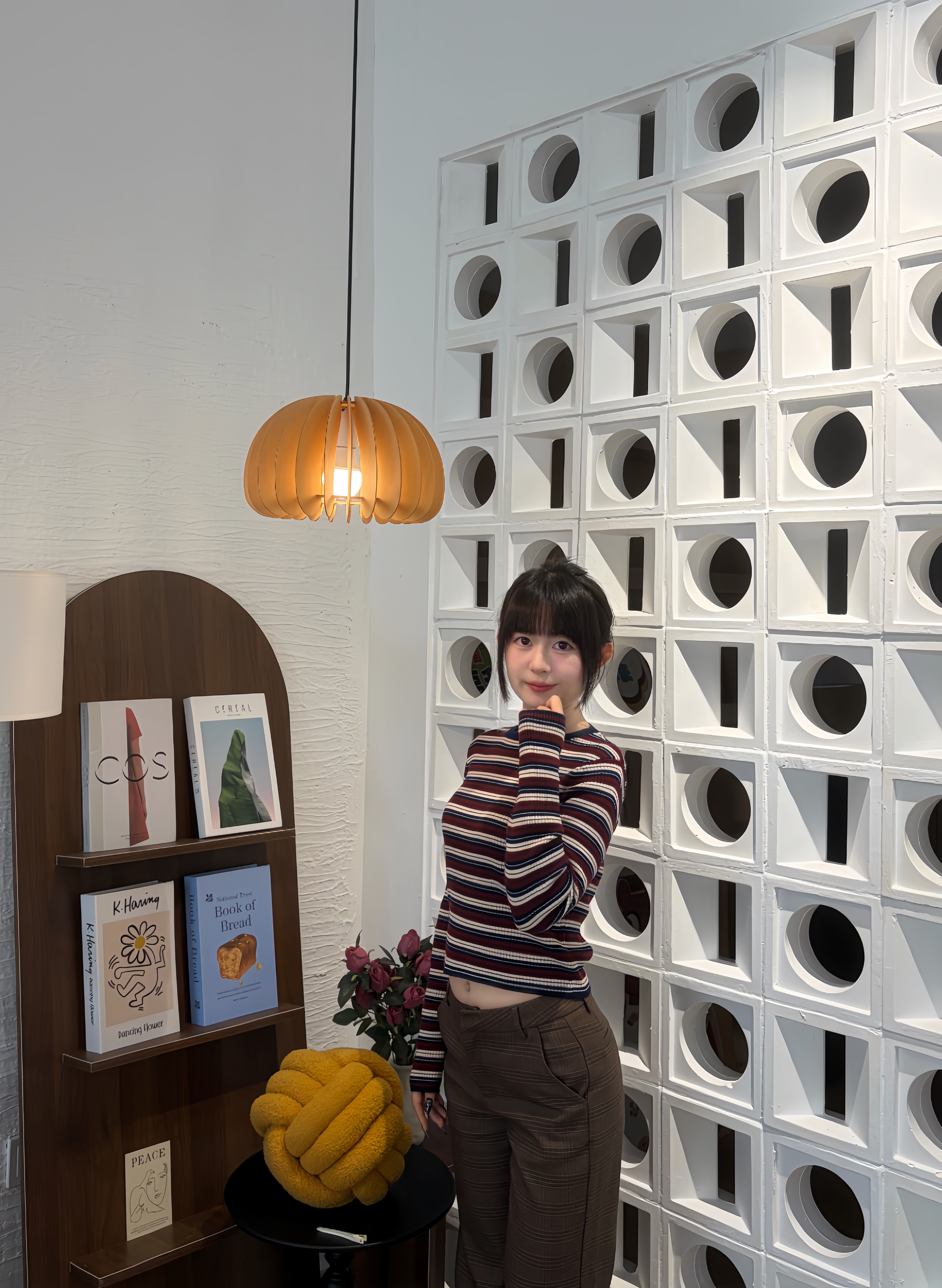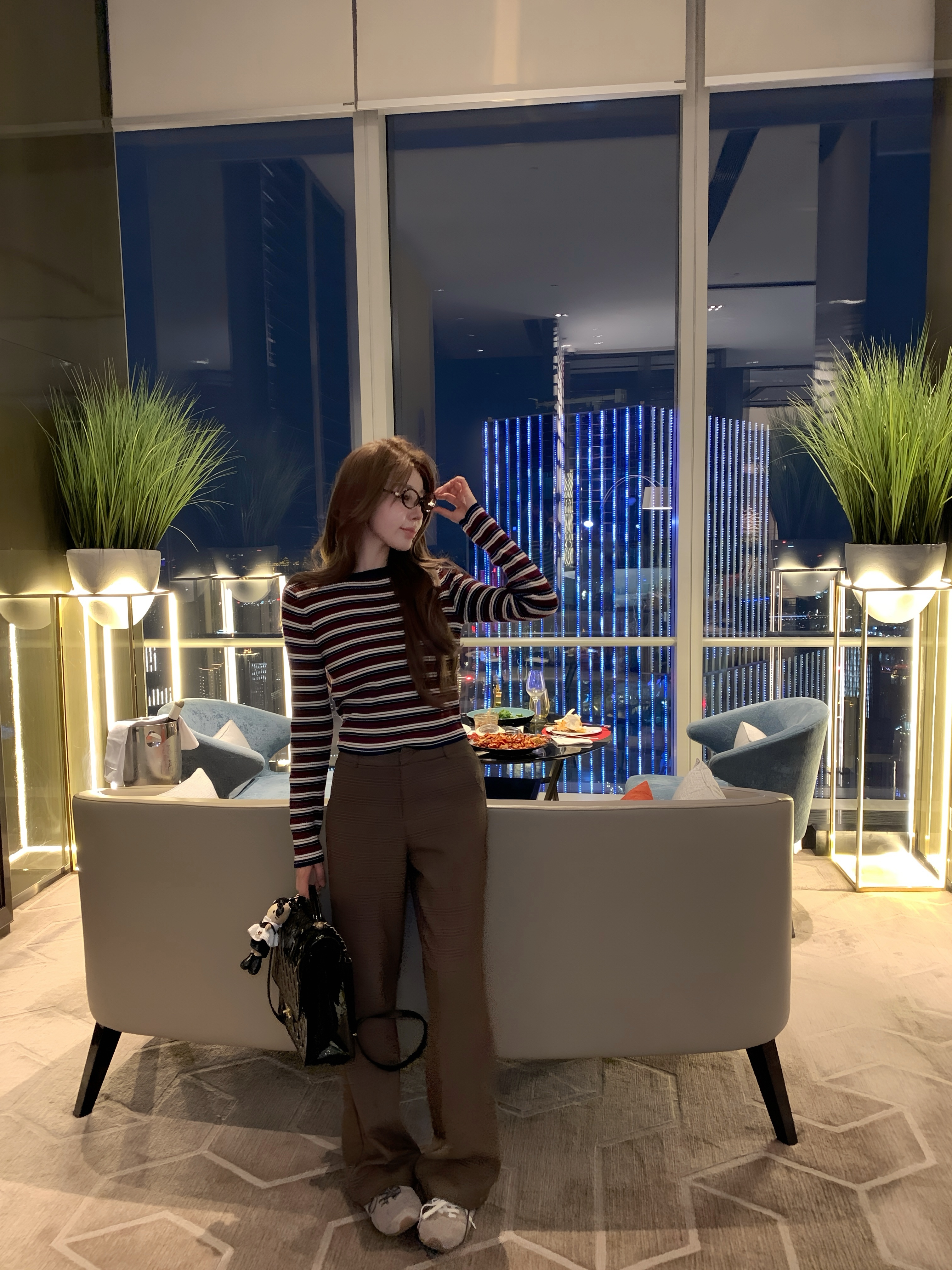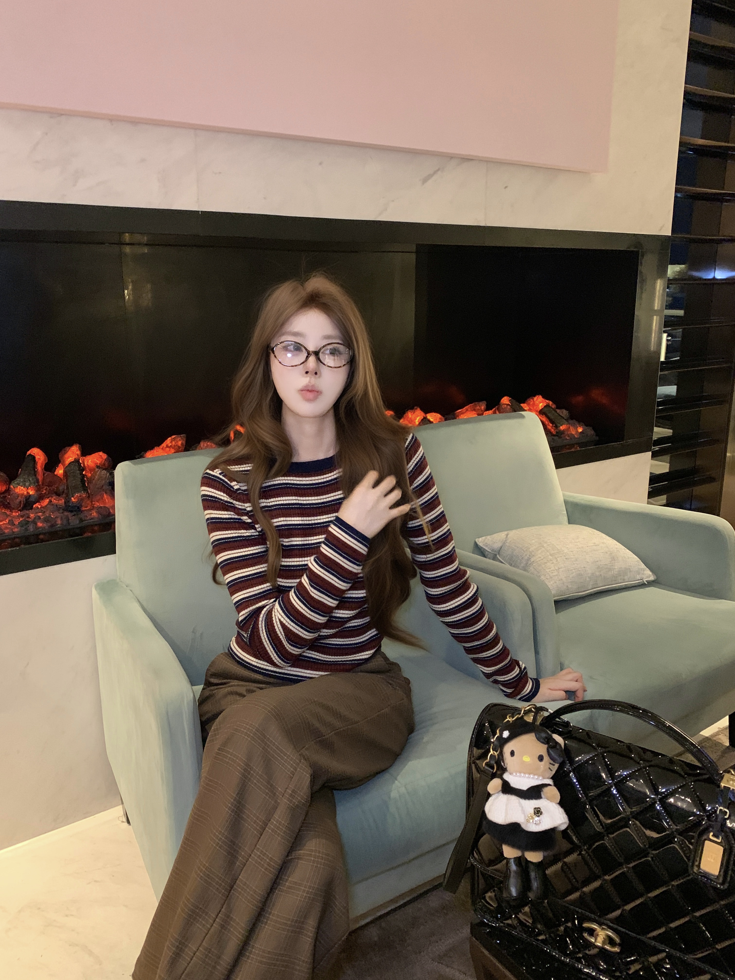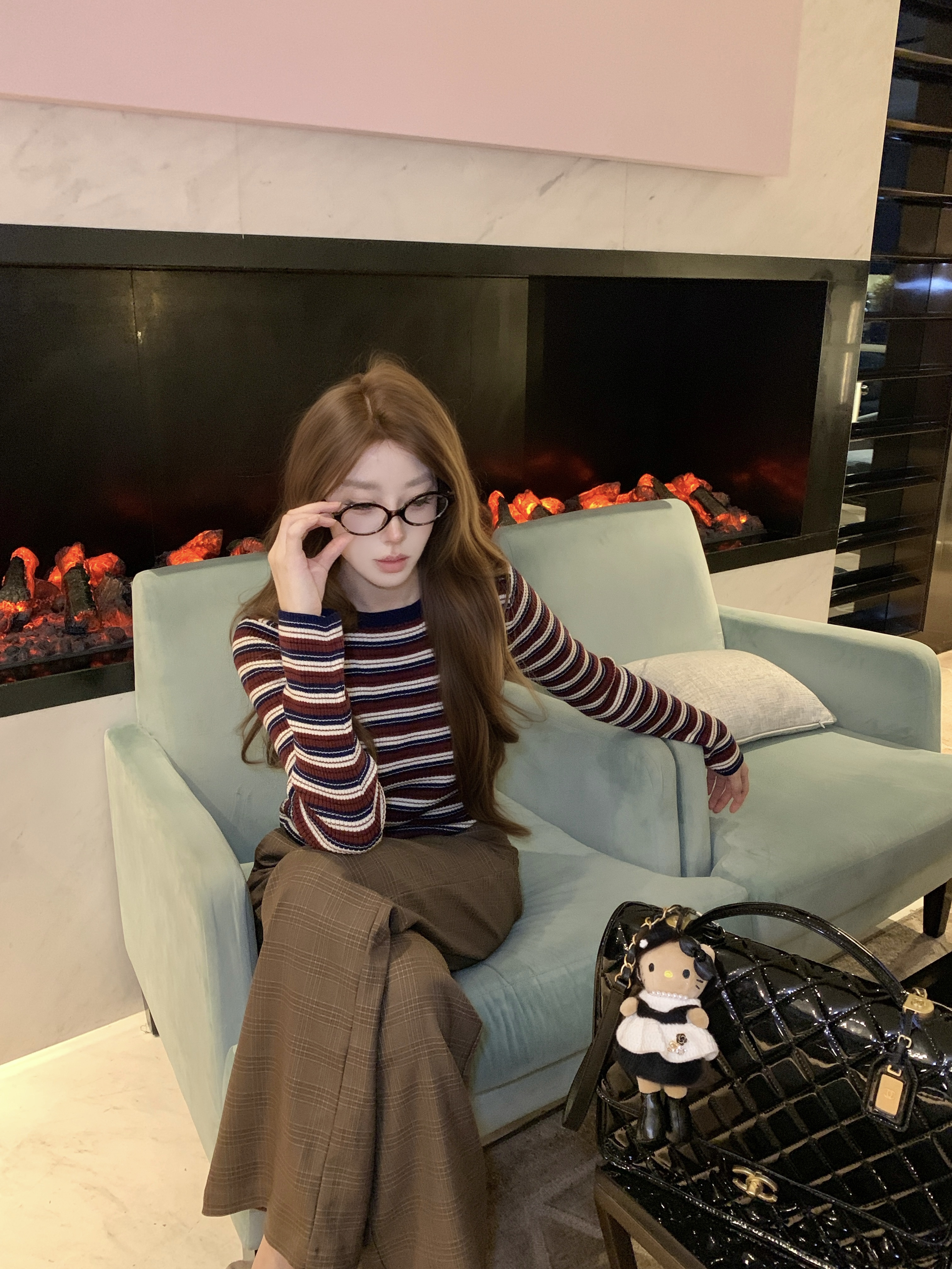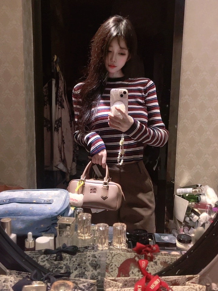 今年很流行的条纹小针织,长度大概在肚脐附近,领口较高,搭配深色系或棕色裤子外套都OK。
