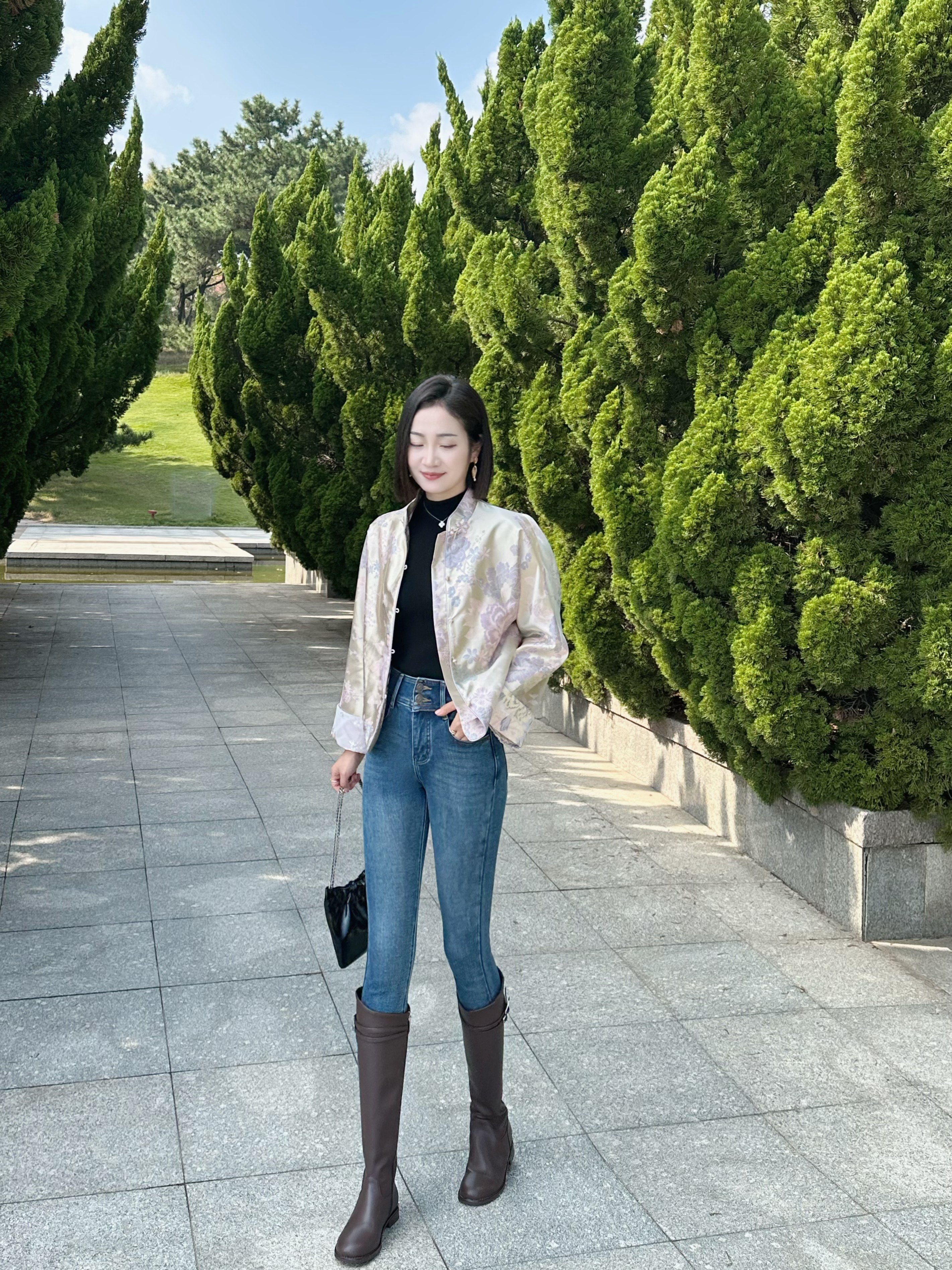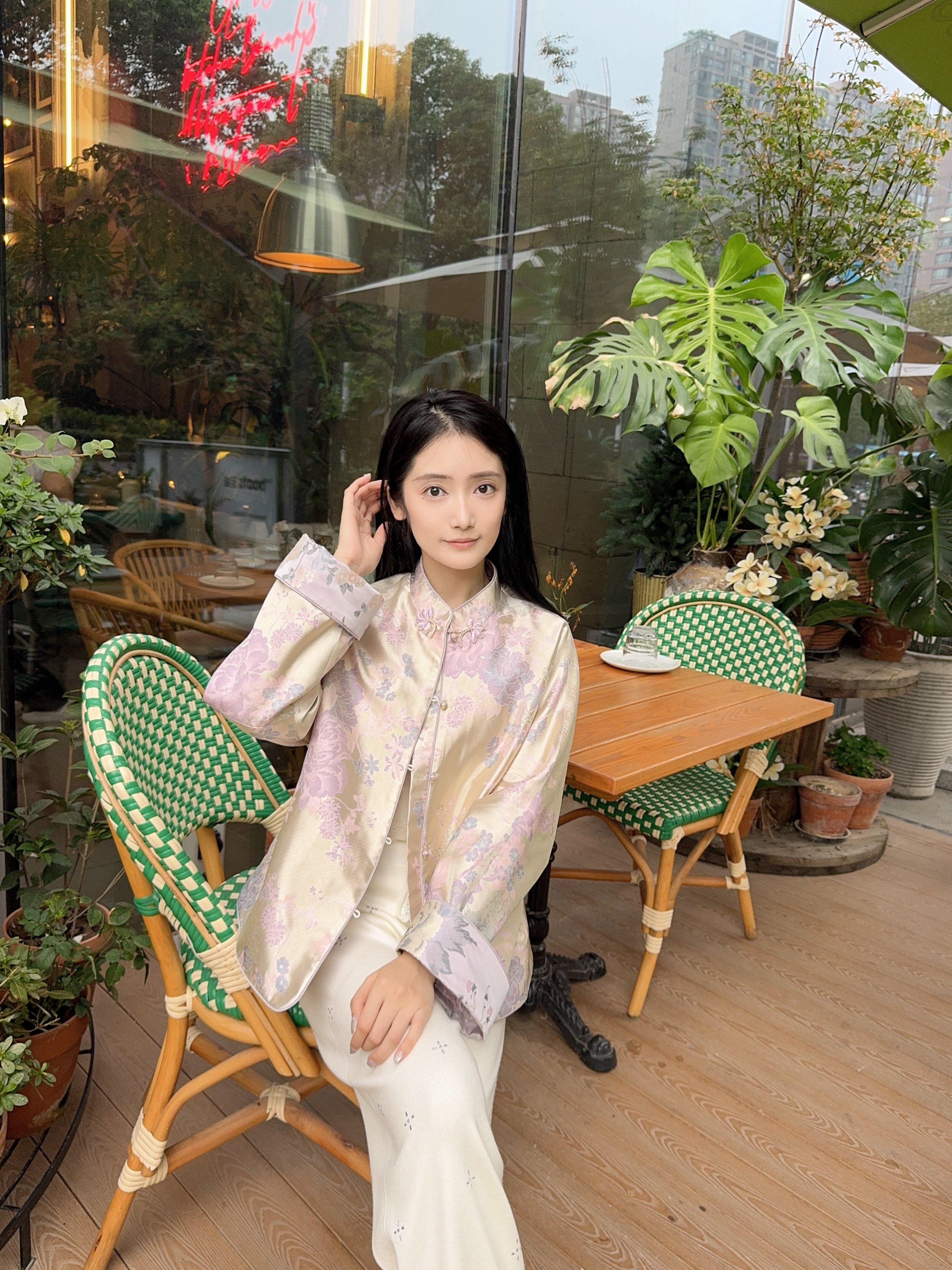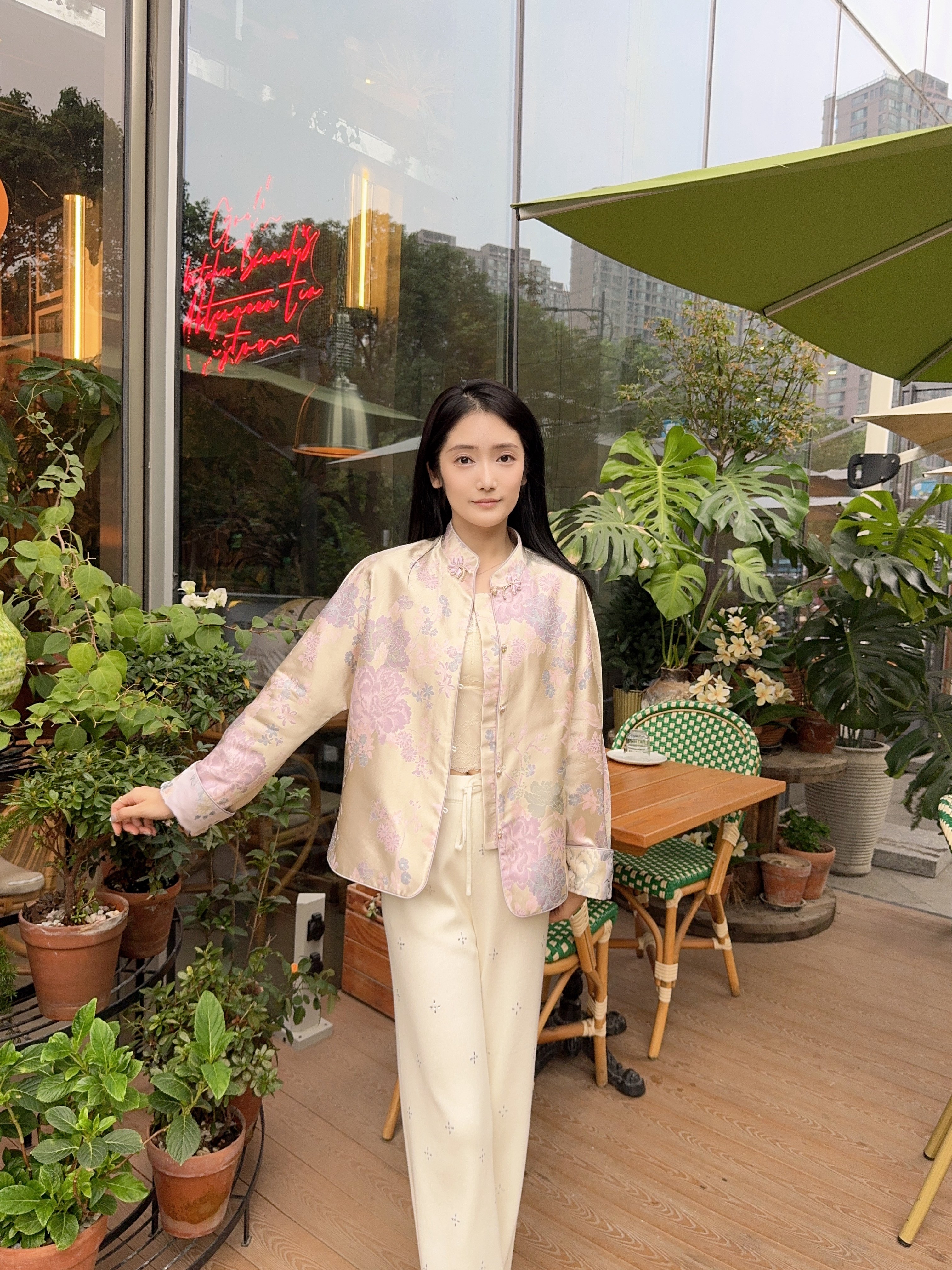 搭配建议:虽然是国风,但是日常穿搭配牛仔裤也可以通勤,也适合周末出去玩。 面料材质:面料不容易皱,质感还是很好的,一看就很贵气。 款式设计:版型宽松,里面穿厚点这天出去刚好合适