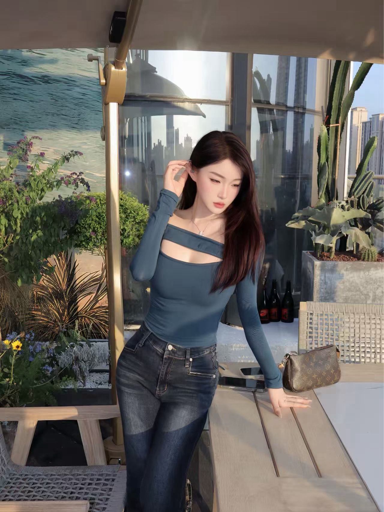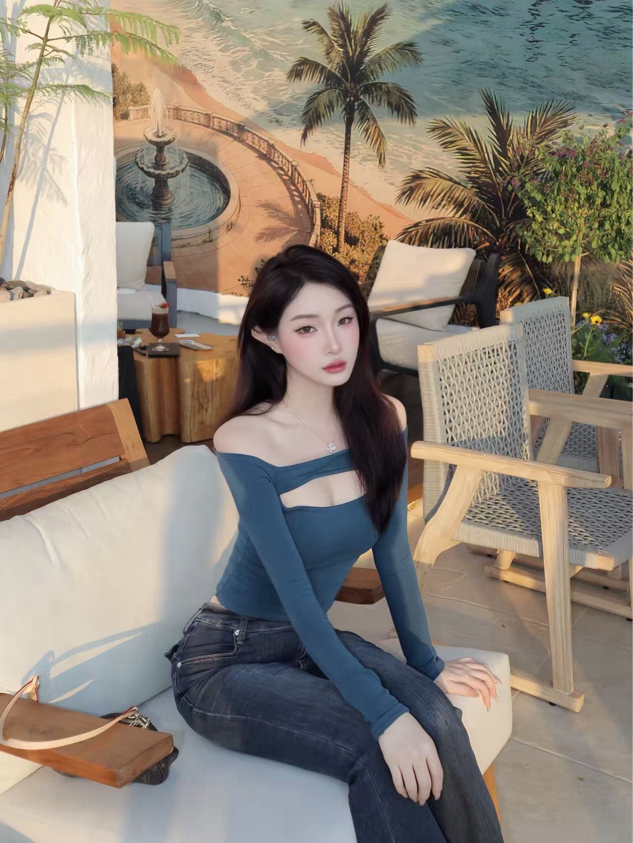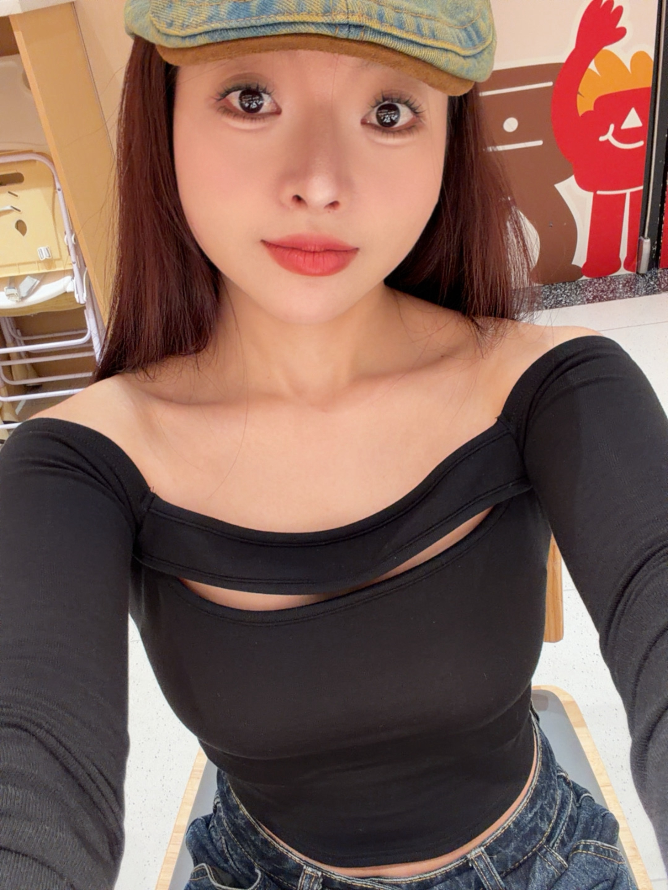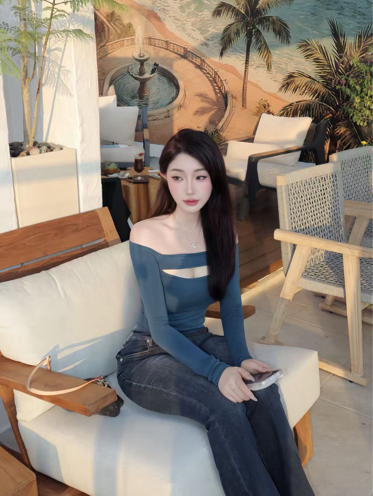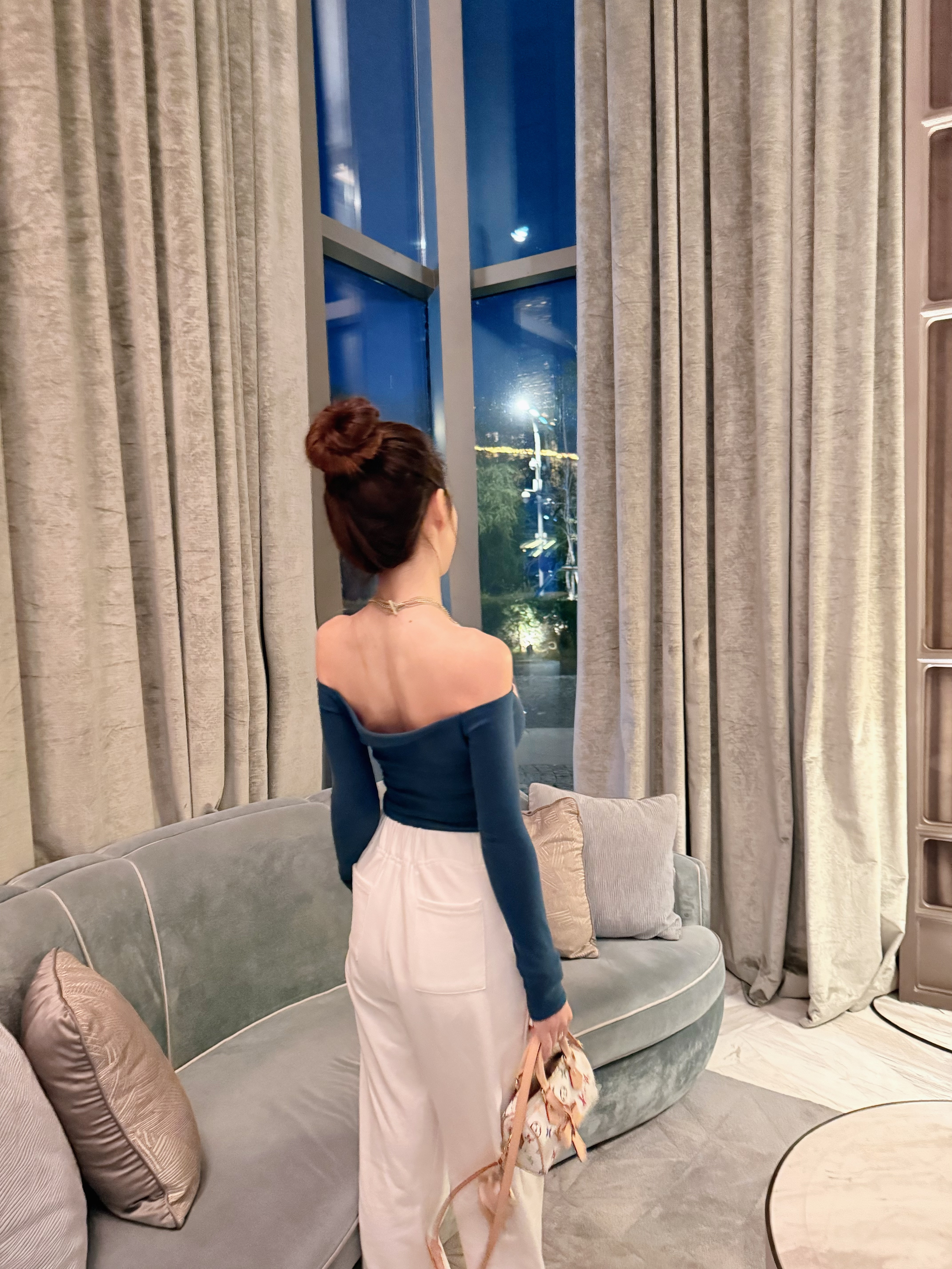 很显白的一件湖蓝色一字肩,搭配条牛仔裤都绝绝子!!