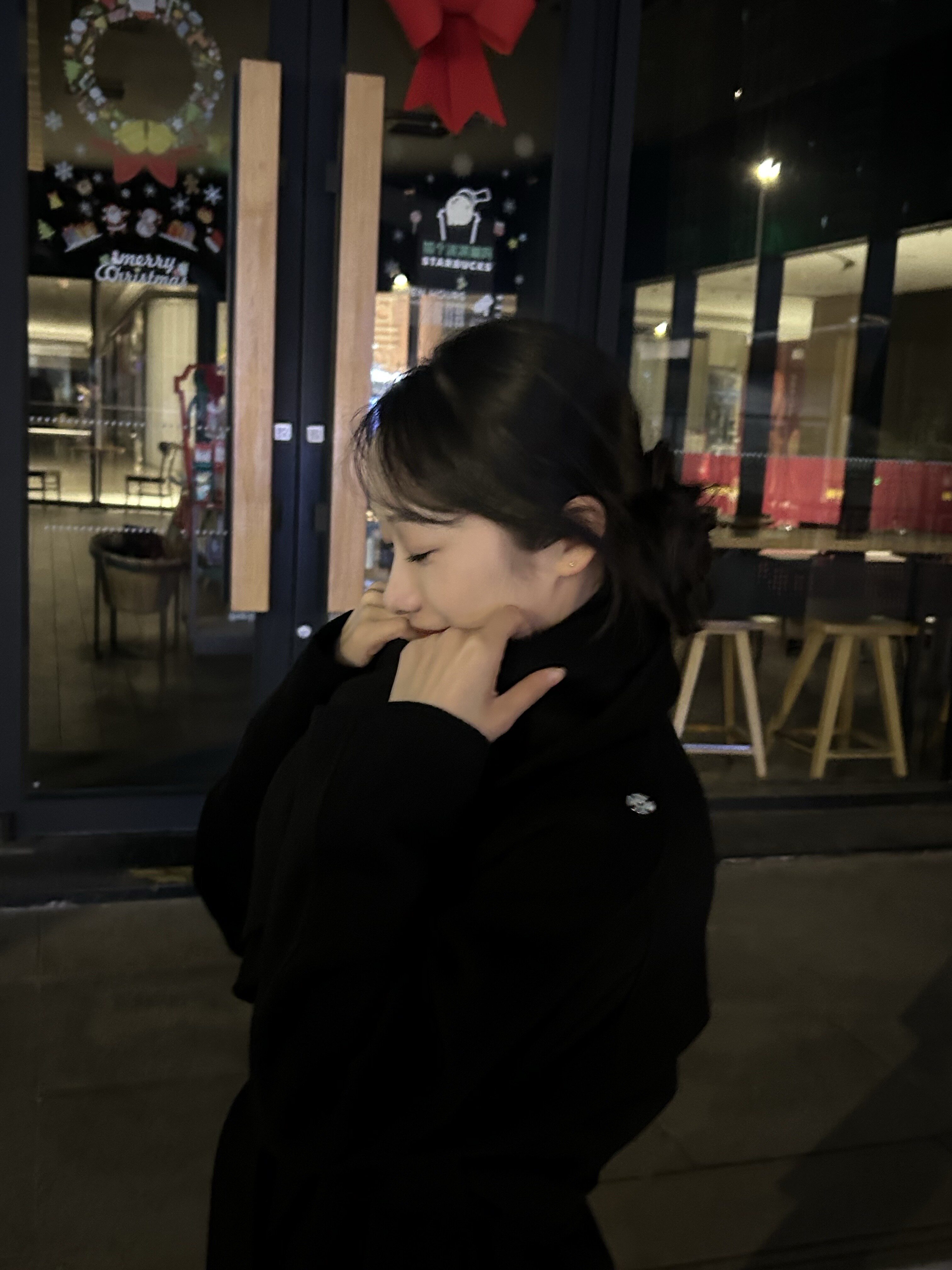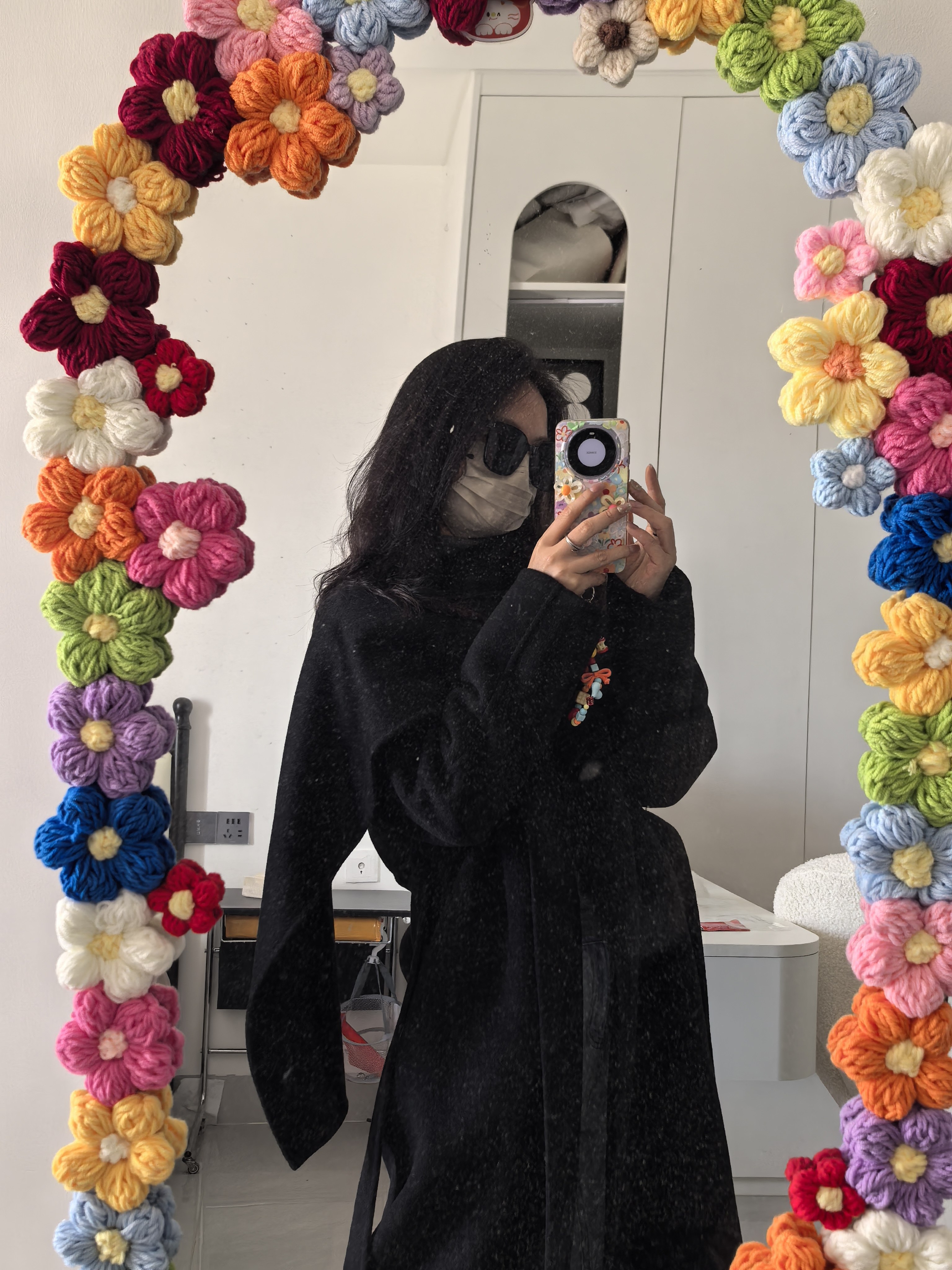 第一次穿黑色大衣 效果还可以 质量也还好 天气冷 衣服穿着有点薄了 里面可以多穿点