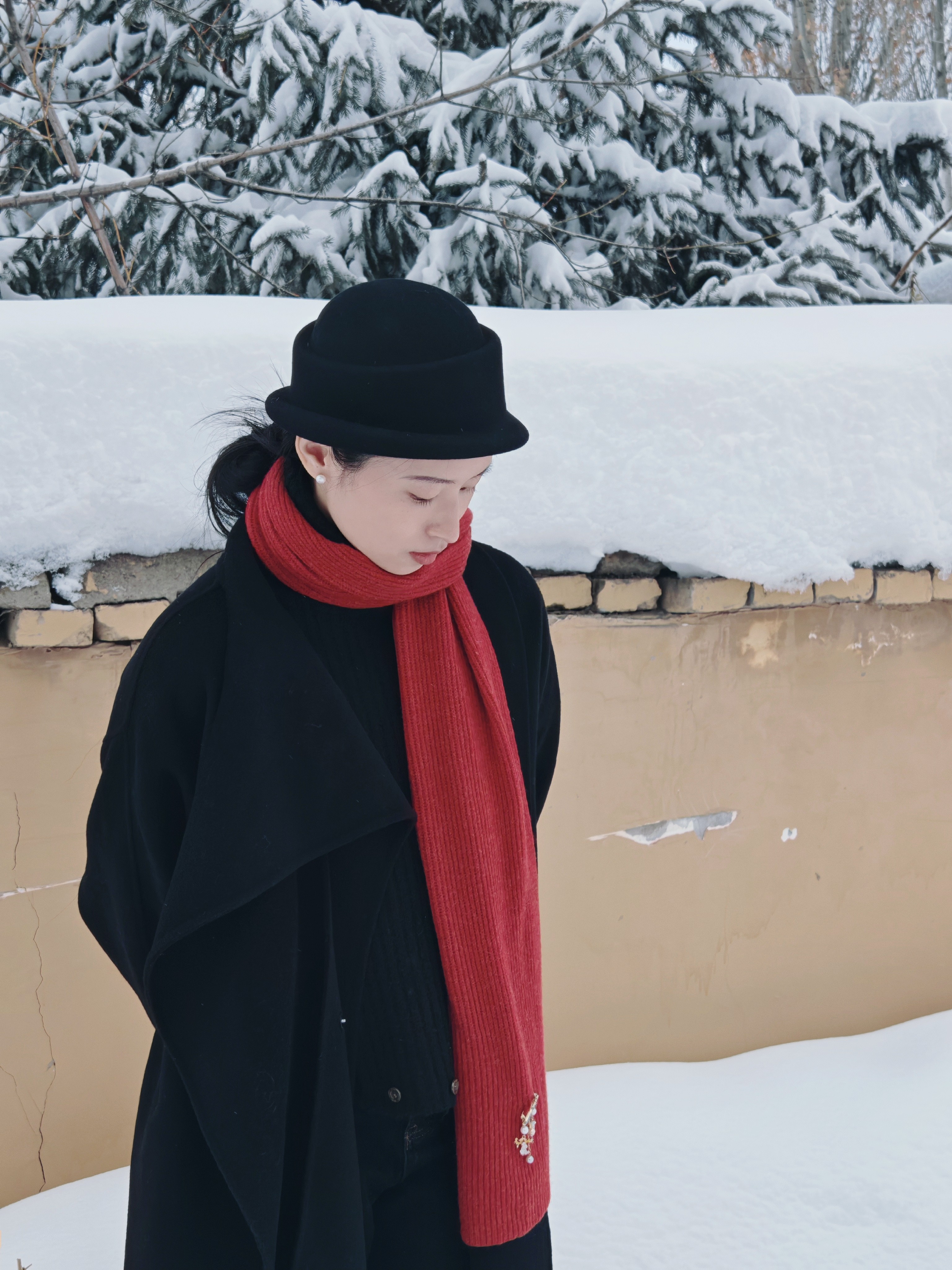 围巾的颜色与大衣形成和谐的搭配——在经典的黑色大衣上,围巾可能是同色系的低调优雅,也可能是撞色的惊喜点缀。无论哪种,都能让你在人群中脱颖而出。