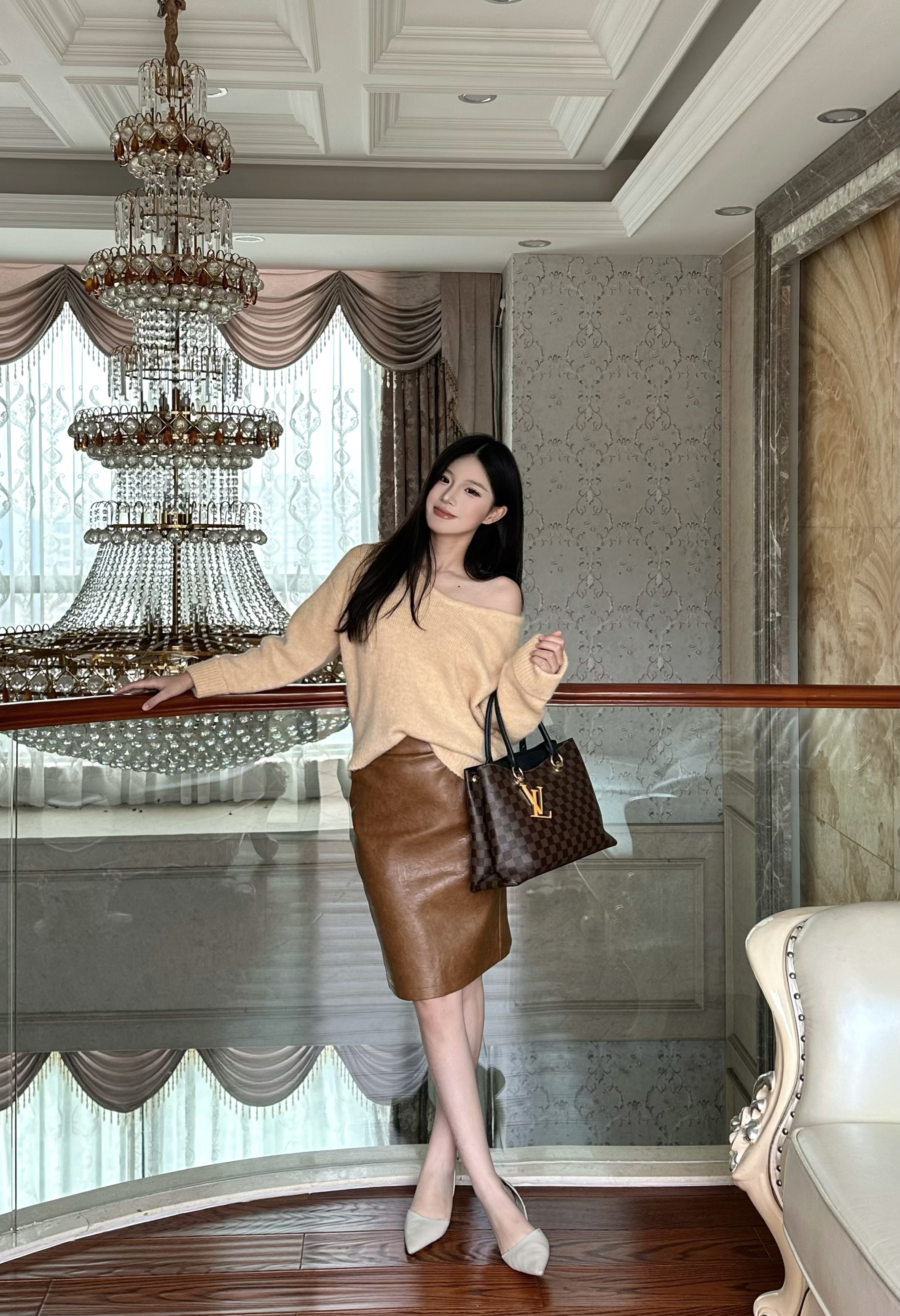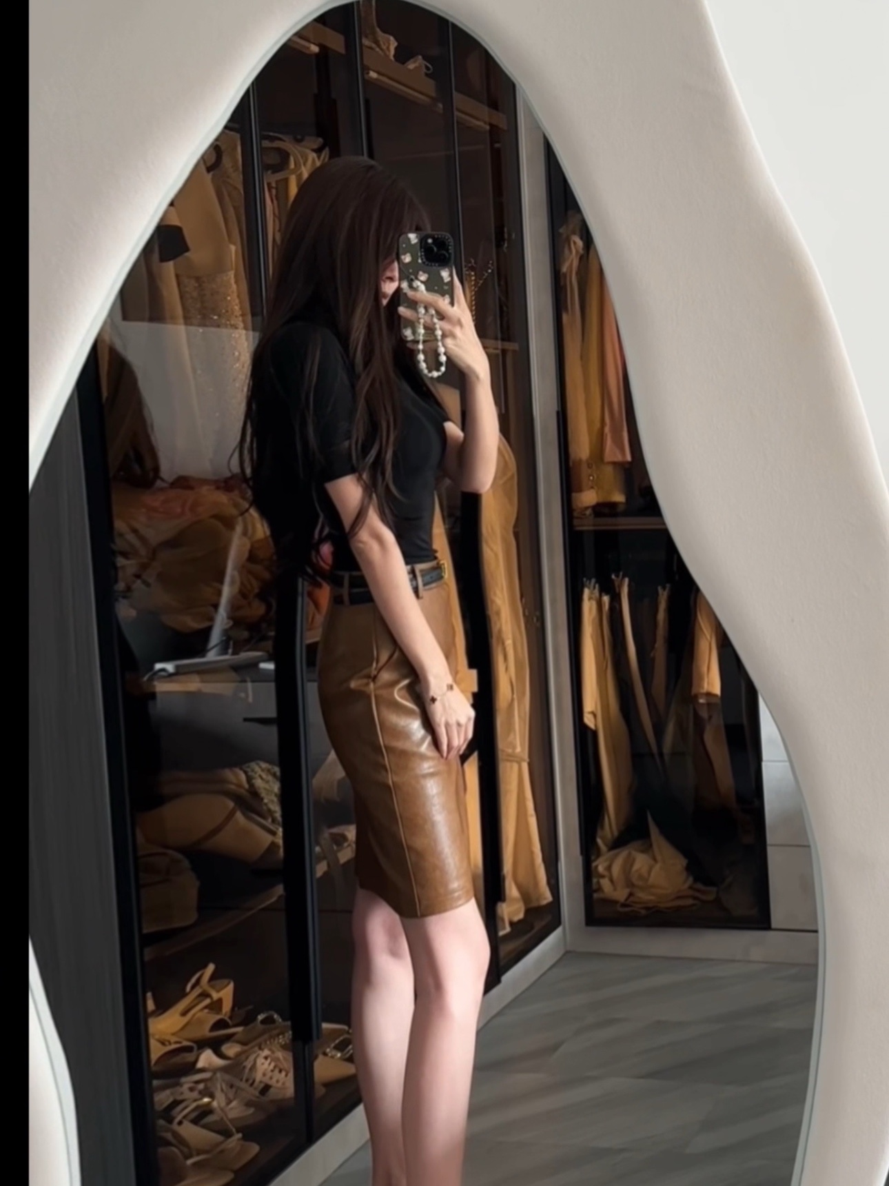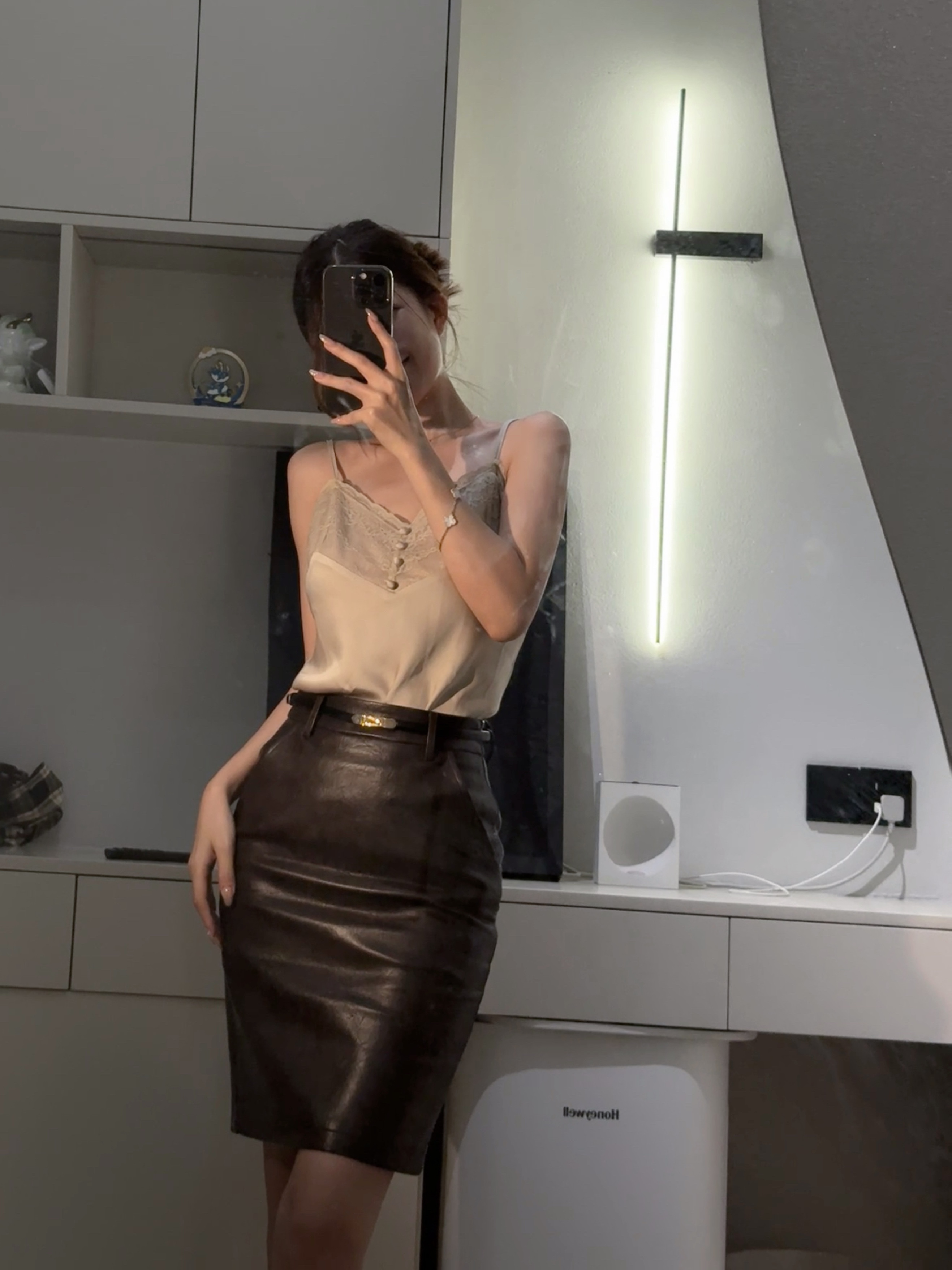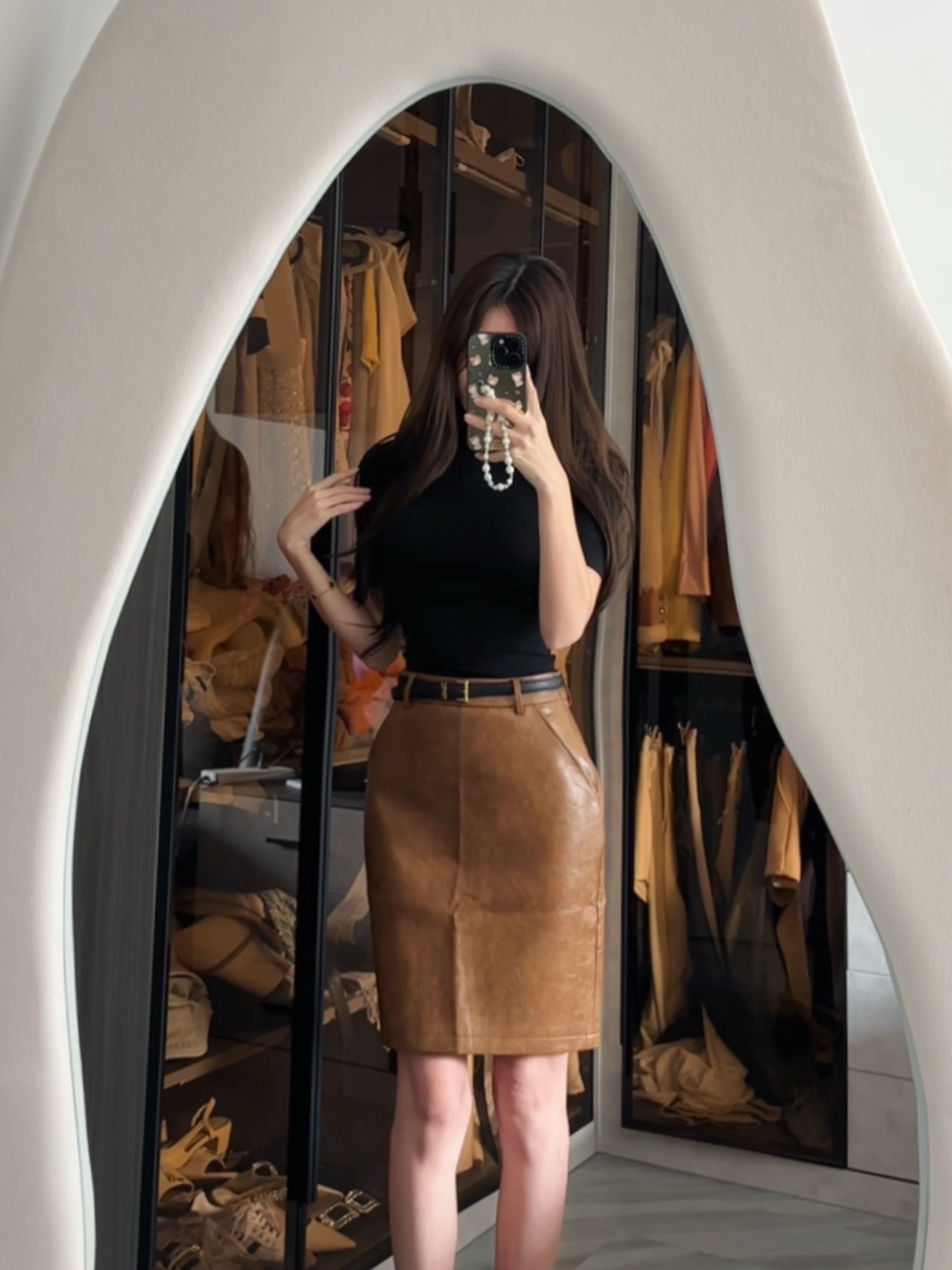 皮裙质感高级,包臀版型超A,后开叉设计小性感,一套搭配姐感味十足!