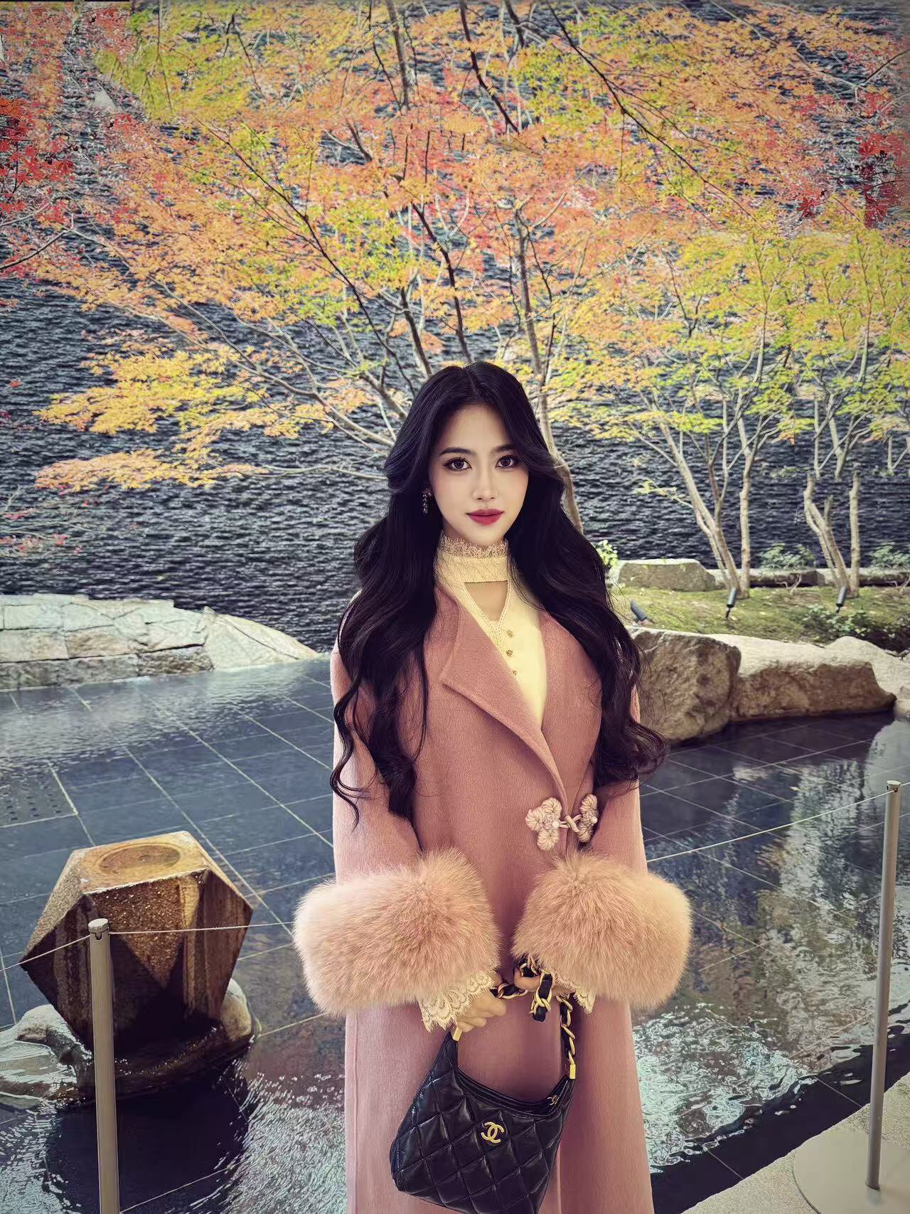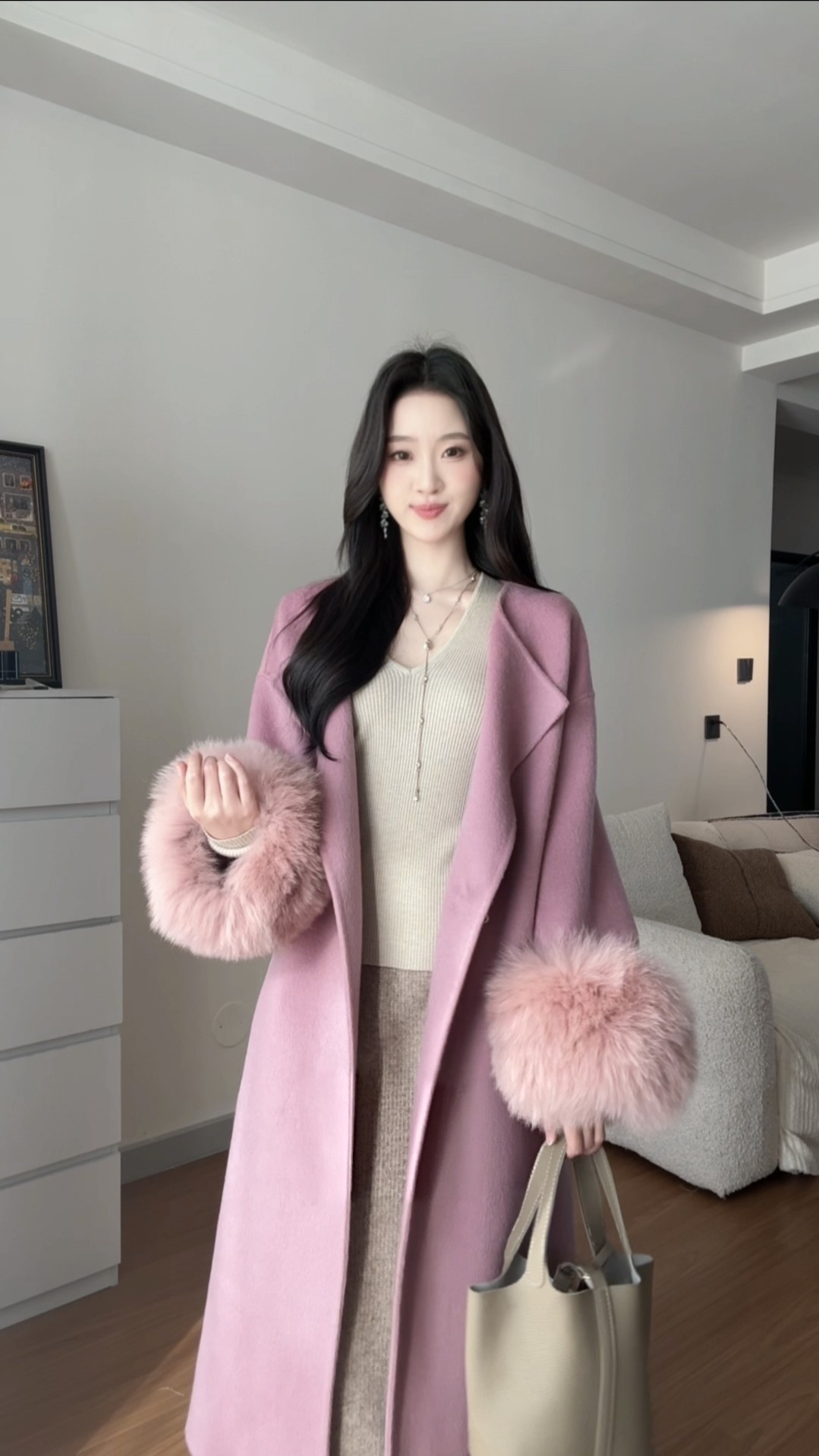 SYA 奚小西紫色骆驼绒双面呢大衣女,小个子长款外套自带高级感!甄选骆驼绒面料柔软保暖,双面呢工艺质感满分,手工盘扣点缀尽显国风韵味。狐狸毛装饰增添贵气,长款版型对小个子友好,拉长身形不显压。紫色调独特吸睛,秋冬搭配毛衣、长裙都超有范儿,通勤约会穿都体面,妥妥的气质穿搭利器!