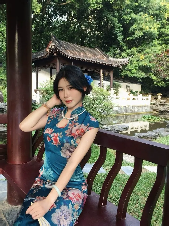 Mimo dk新中式国风水滴领短袖提花性感改良旗袍气质连衣裙 蓝佳人